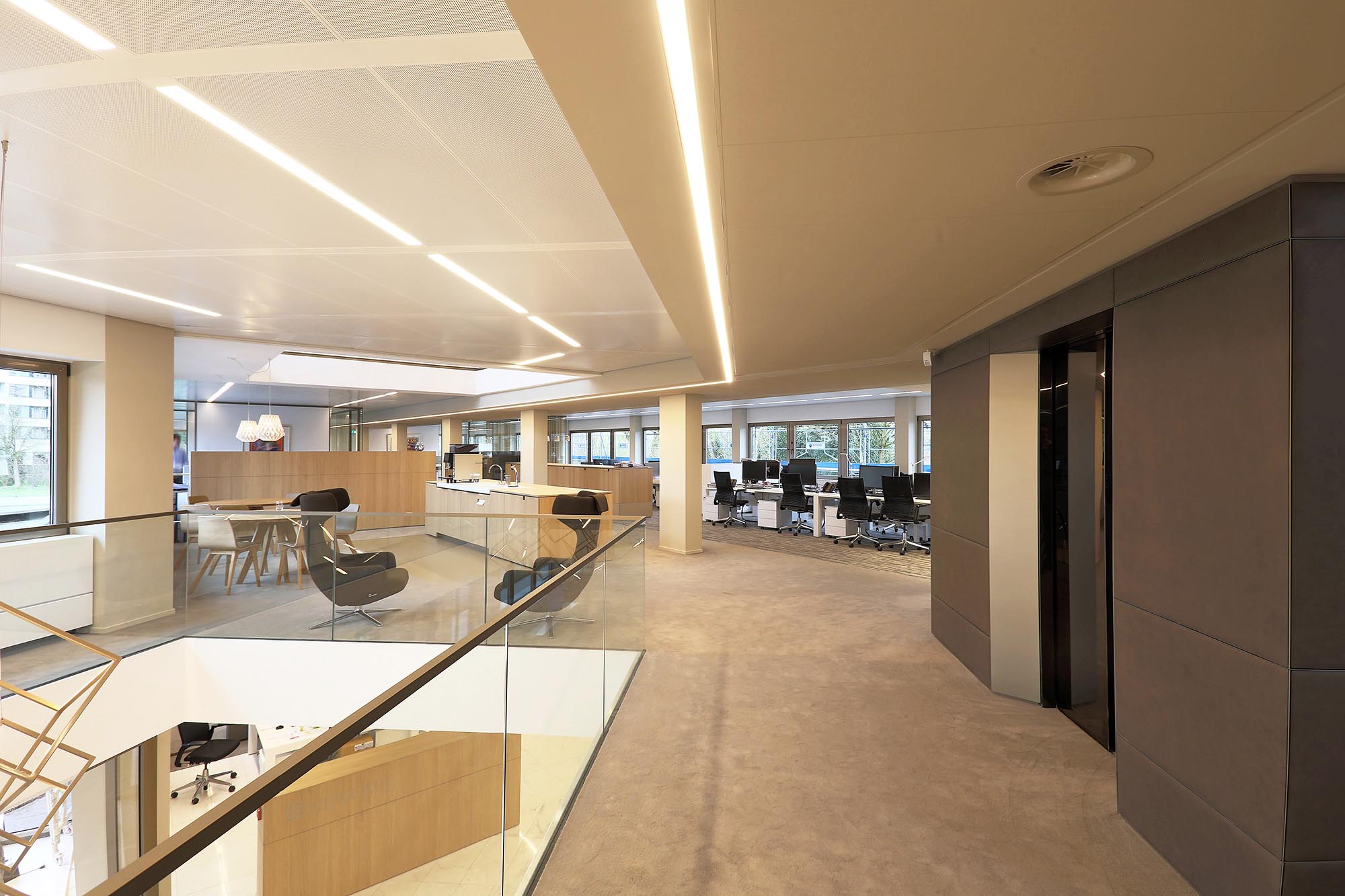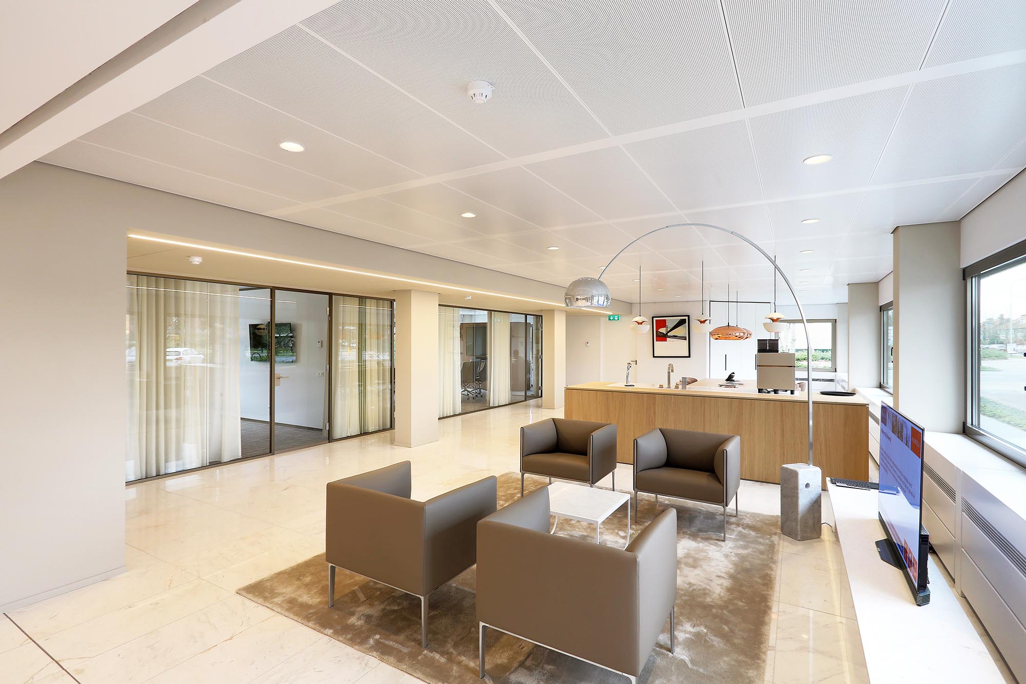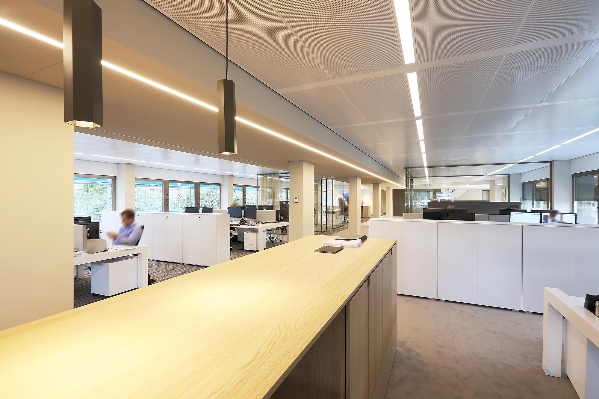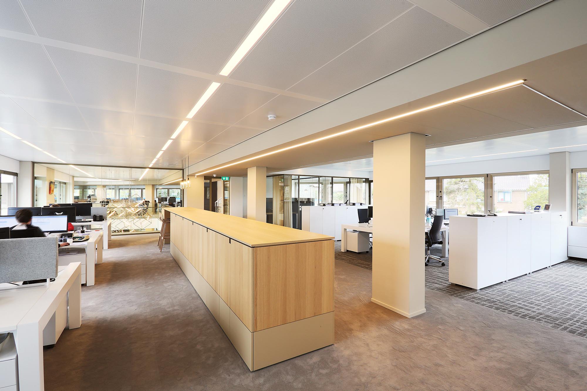 Midden door het pand zijn koven gemaakt met plafondpanelen type Ecophon Focus Ds. Een modulair akoestisch plafond met een strakke kantafwerking. Het heeft een verdekt ophangsysteem en afgeschuinde randen met een smalle groef tussen elk paneel. Dit verlaagde plafond zonder zichtbare draagconstructie is makkelijk te demonteren en volledig recyclebaar.