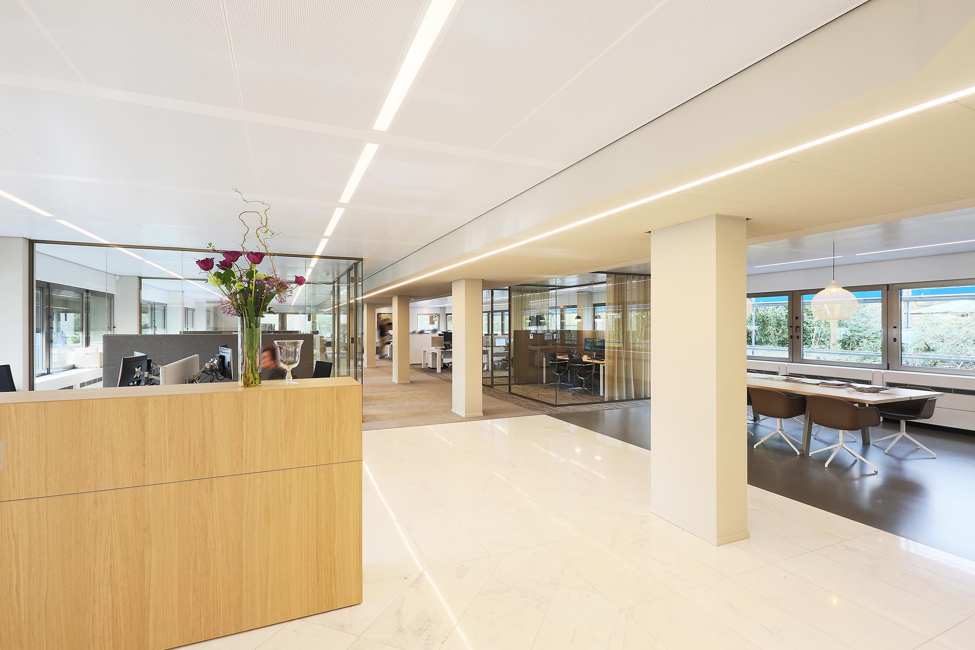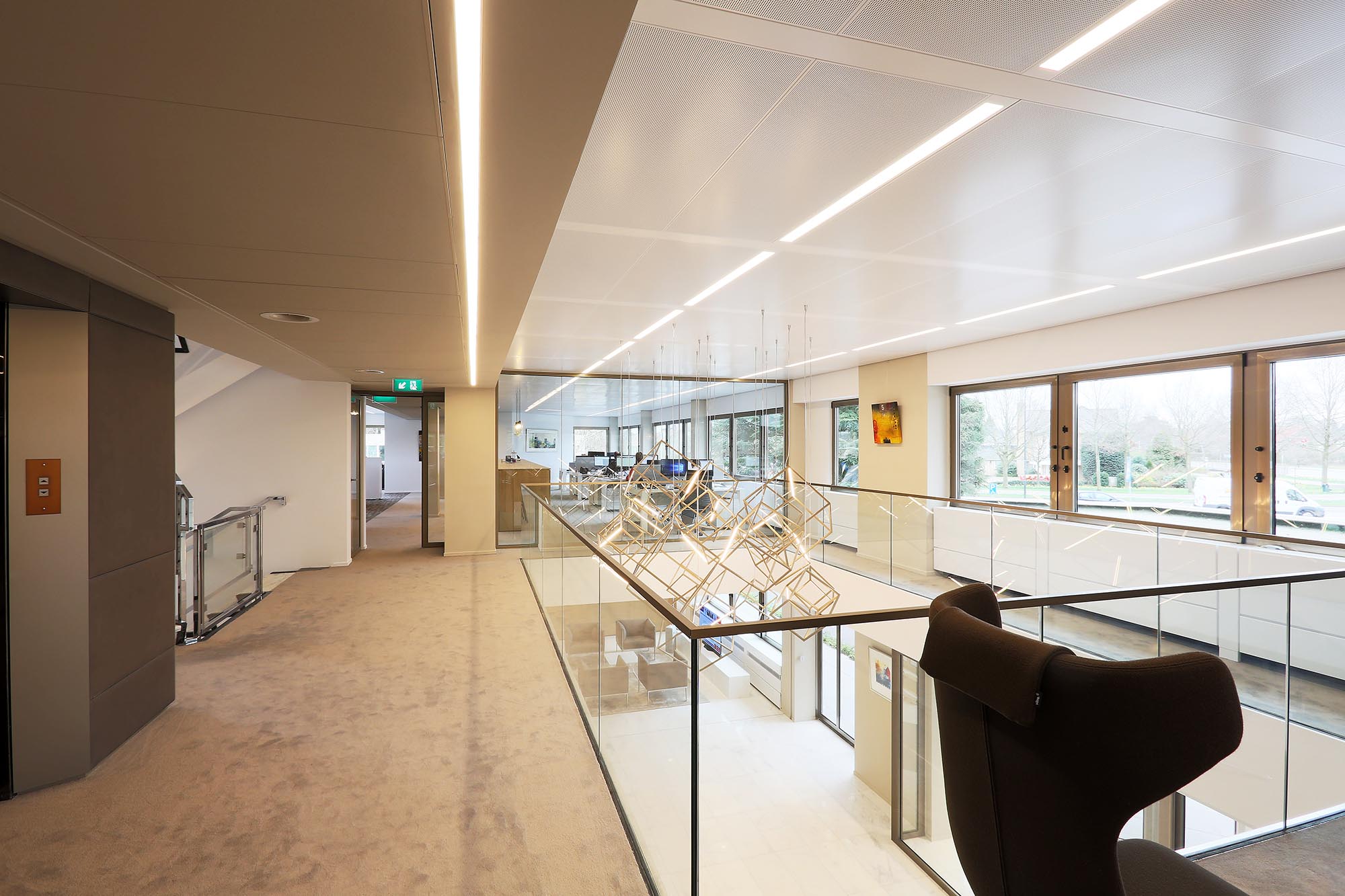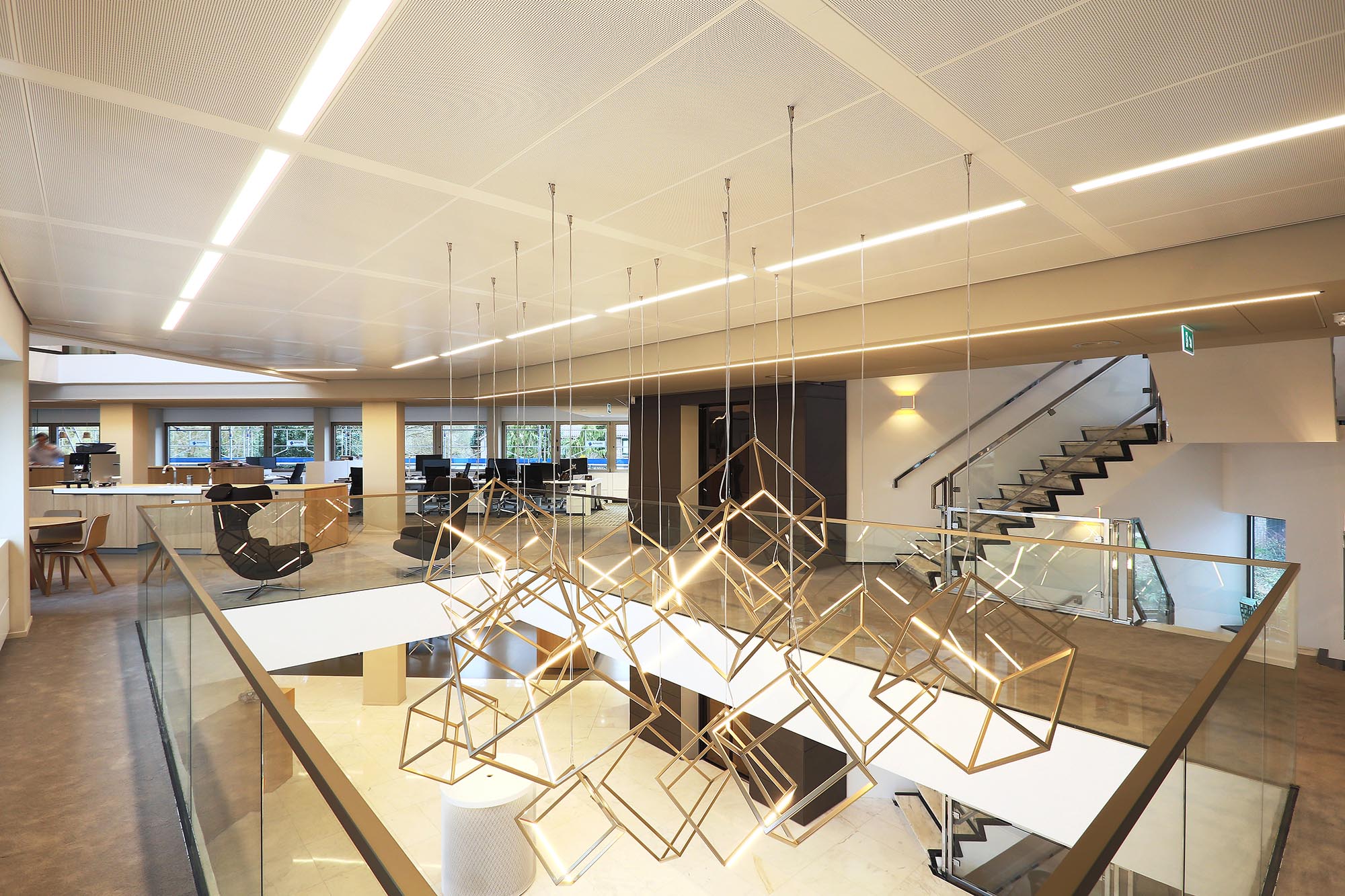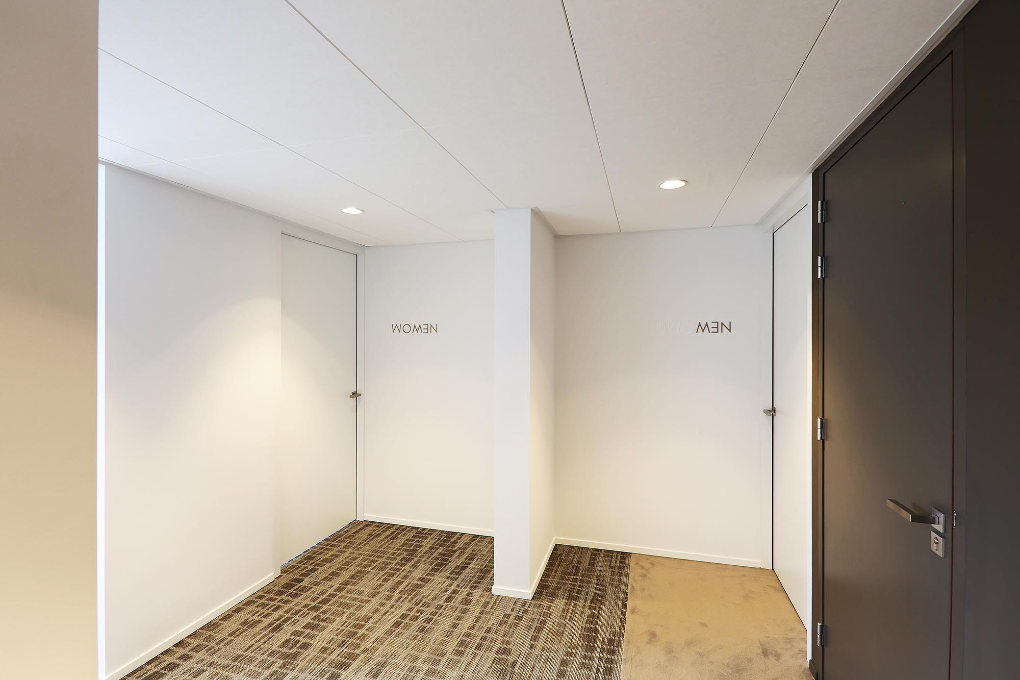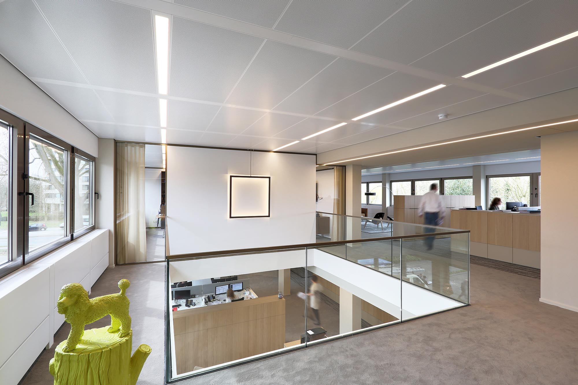 Midden door het pand zijn koven gemaakt met plafondpanelen type Ecophon Focus Ds. Een modulair akoestisch plafond met een strakke kantafwerking. Het heeft een verdekt ophangsysteem en afgeschuinde randen met een smalle groef tussen elk paneel. Dit verlaagde plafond zonder zichtbare draagconstructie is makkelijk te demonteren en volledig recyclebaar.