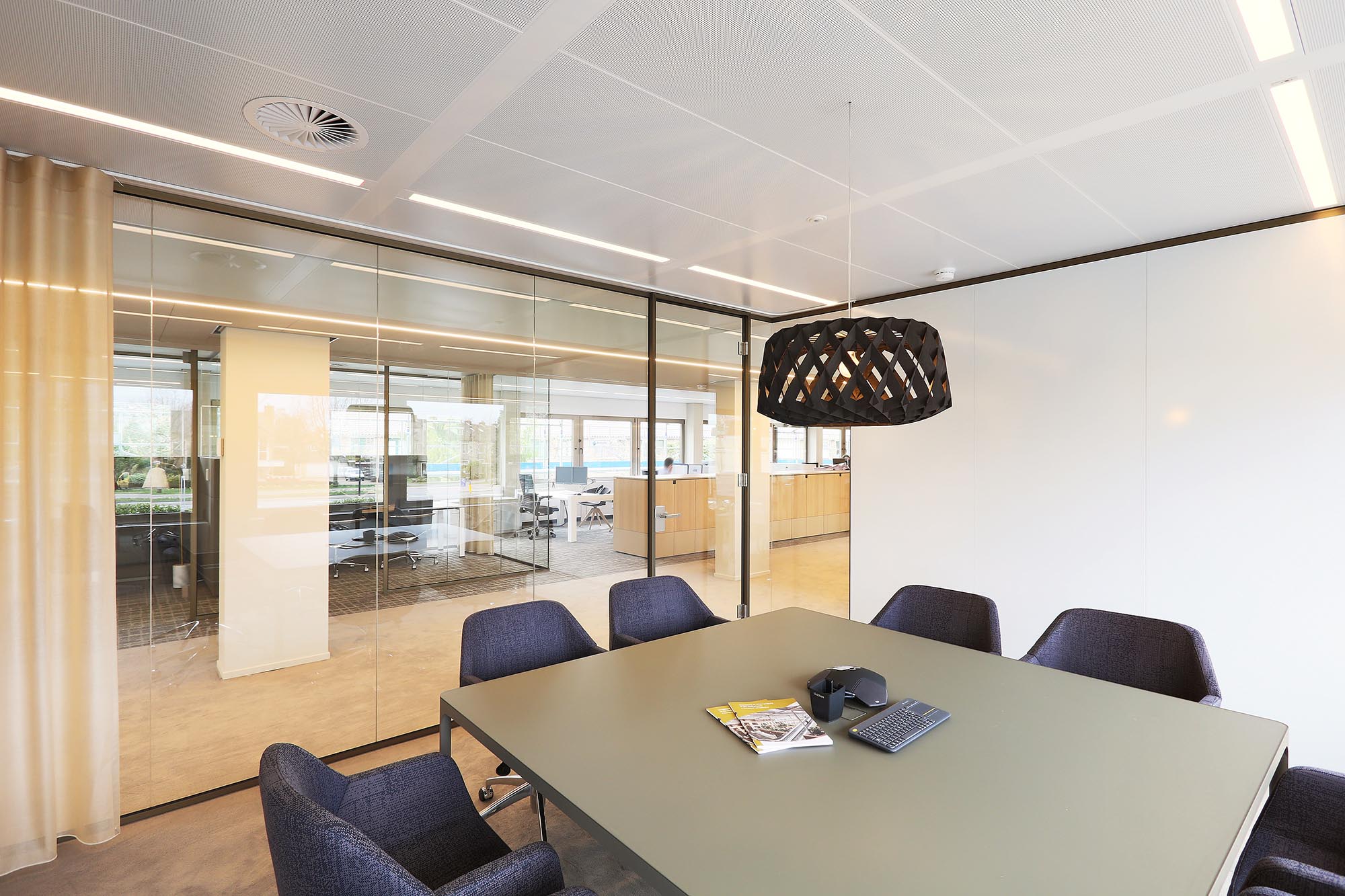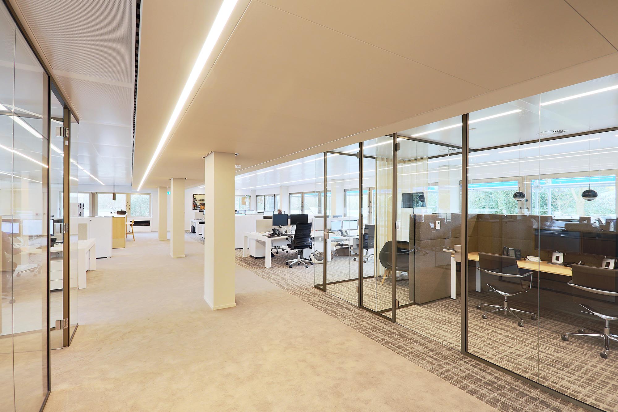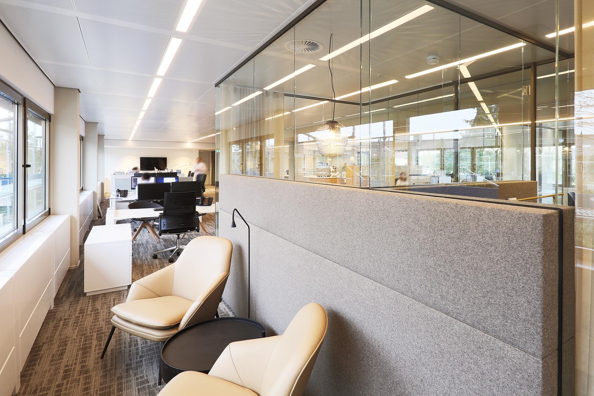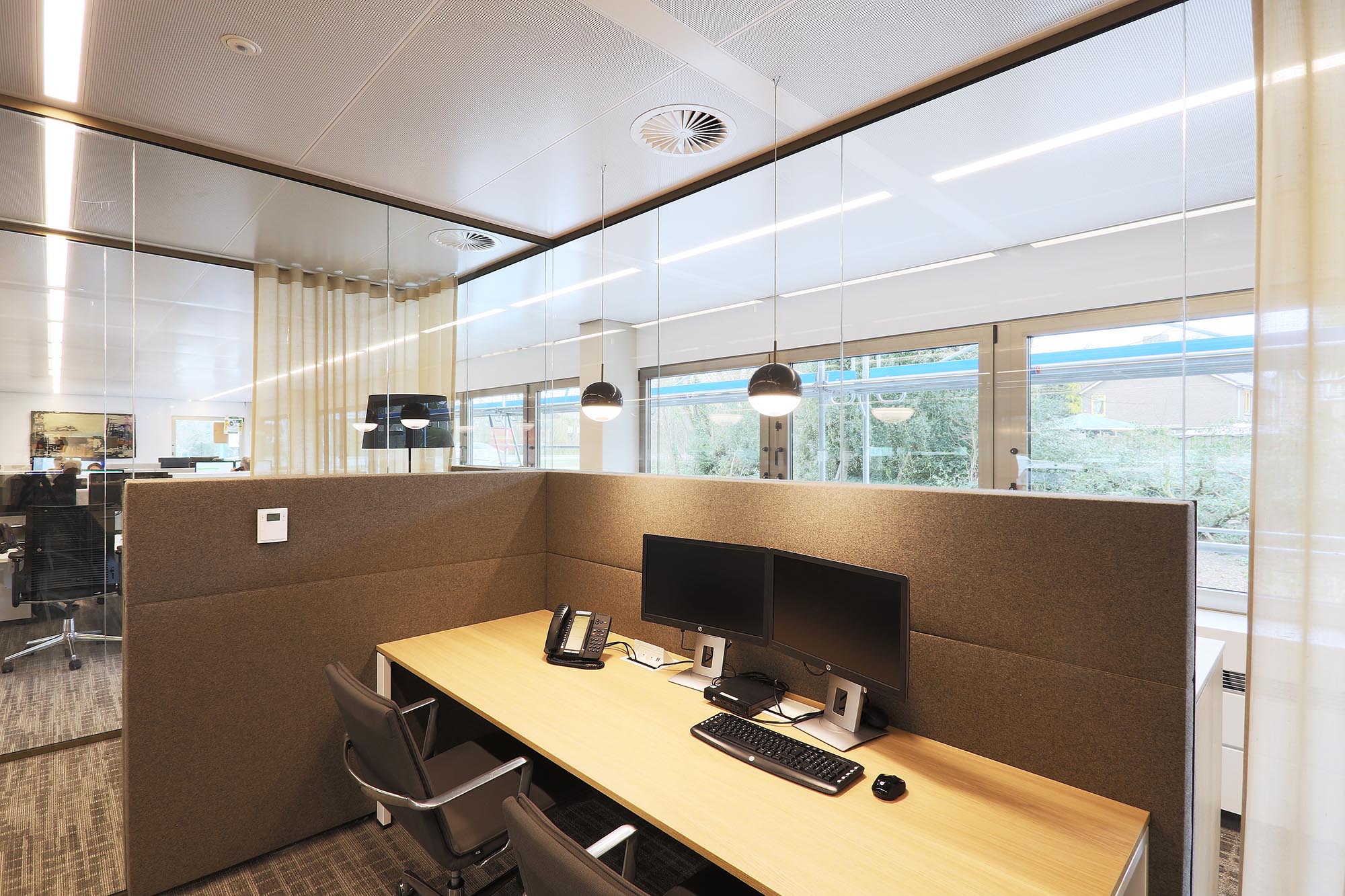 Het kantoor is ingericht als open kantoortuin met vele mogelijkheden om geconcentreerd te kunnen werken of in privacy te kunnen vergaderen. Om de akoestiek verder te optimaliseren, is akoestische wandbekleding toegepast in onze glaswanden.