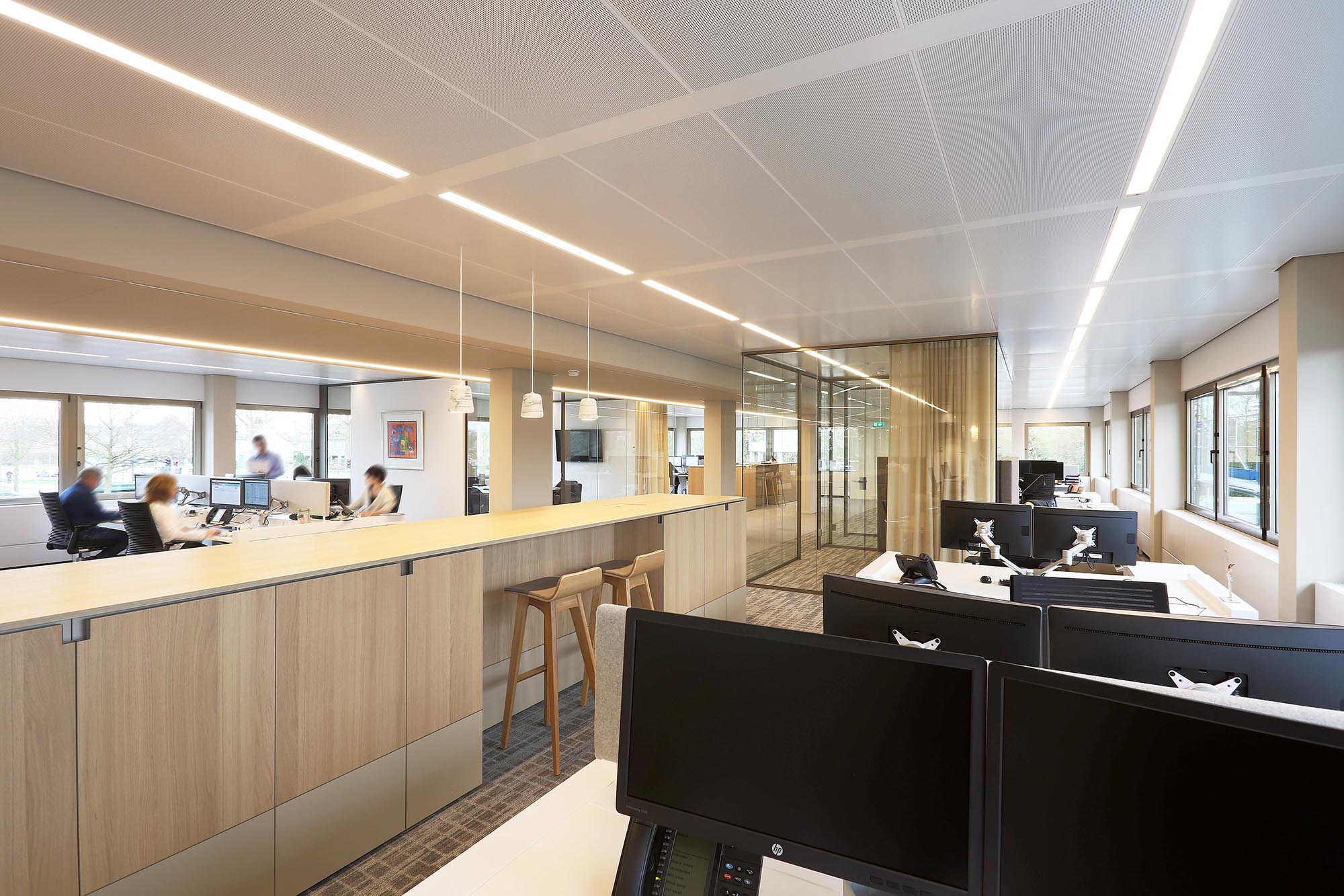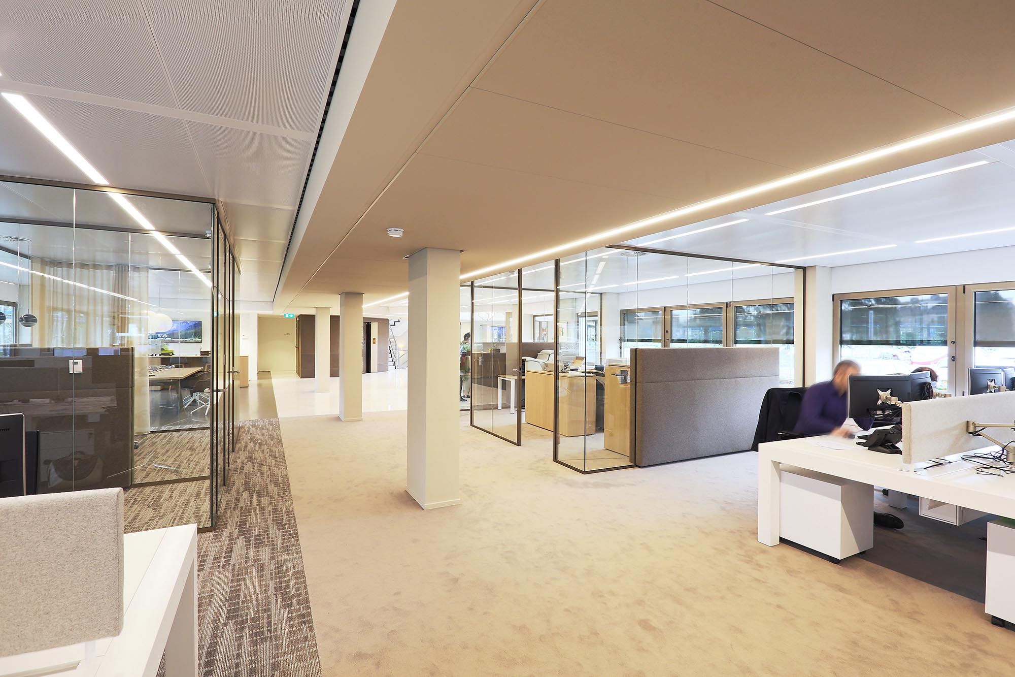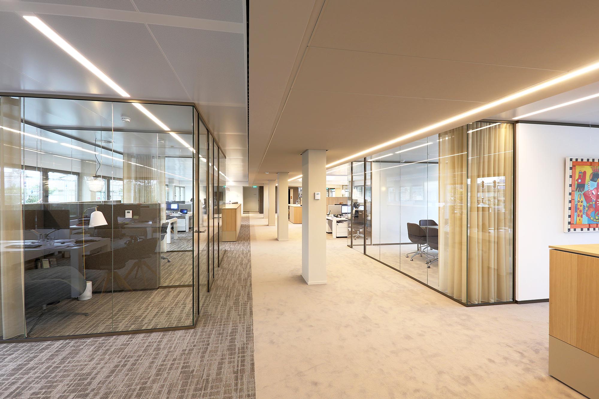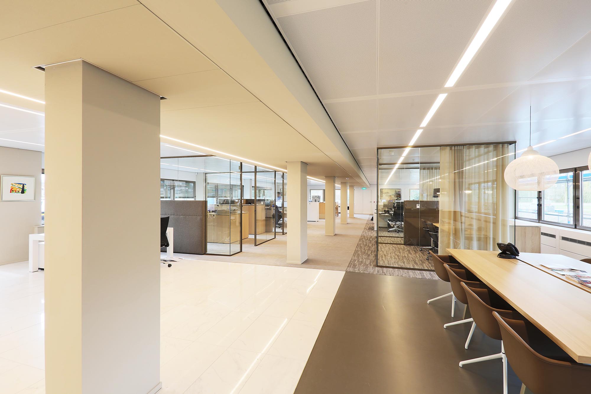Het kantoor is ingericht als open kantoortuin met vele mogelijkheden om geconcentreerd te kunnen werken of in privacy te kunnen vergaderen. Om de akoestiek verder te optimaliseren, is akoestische wandbekleding toegepast in onze glaswanden.