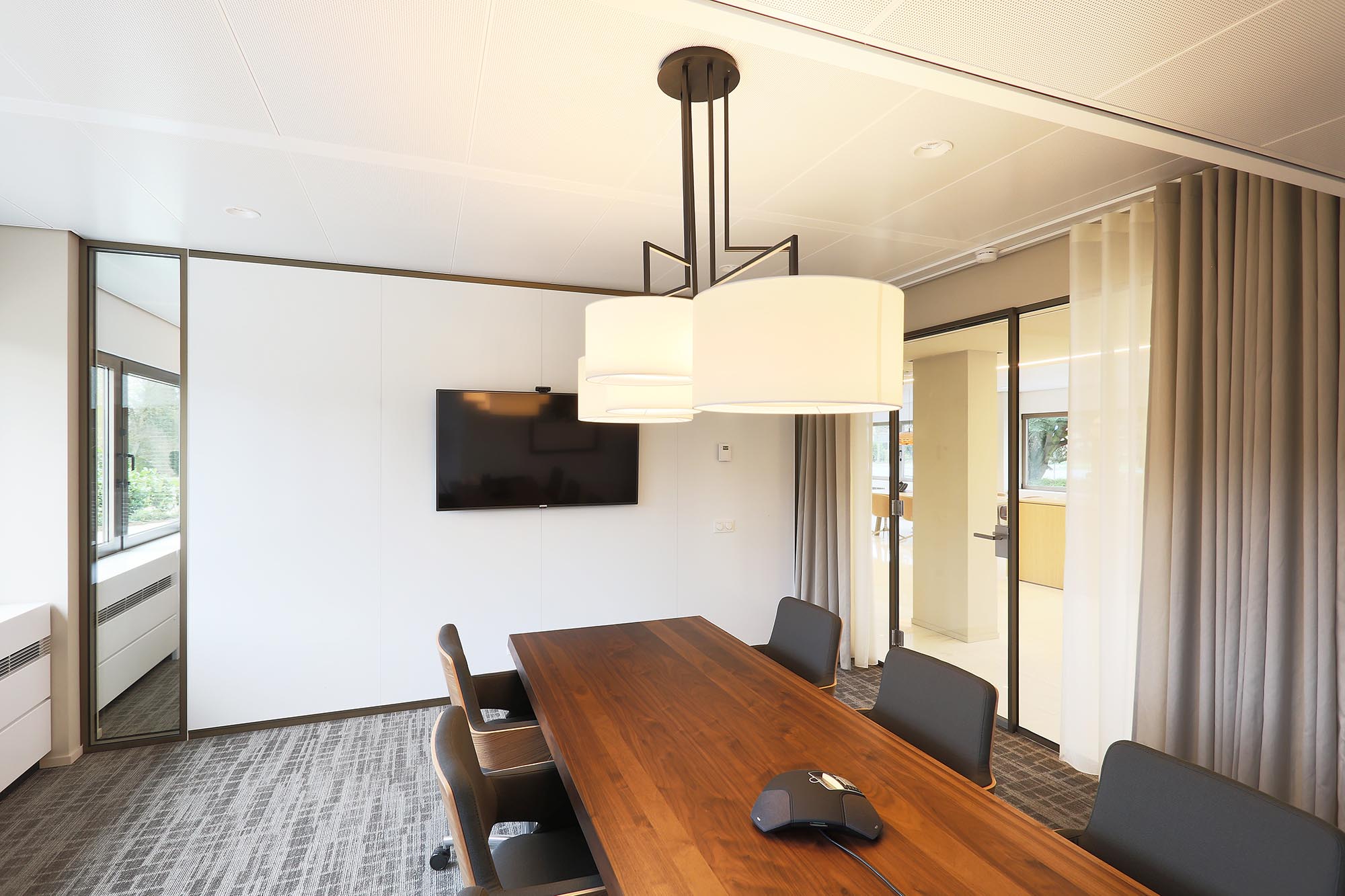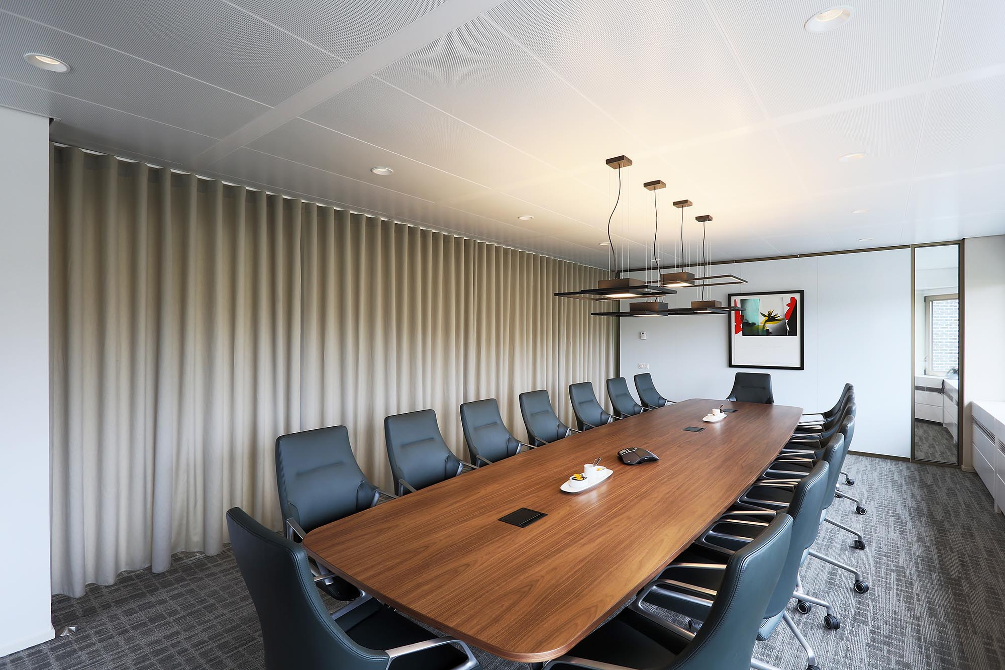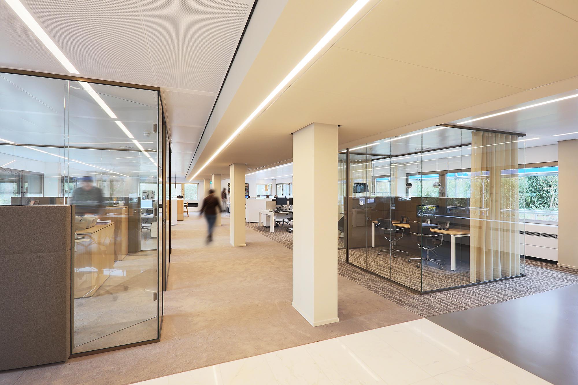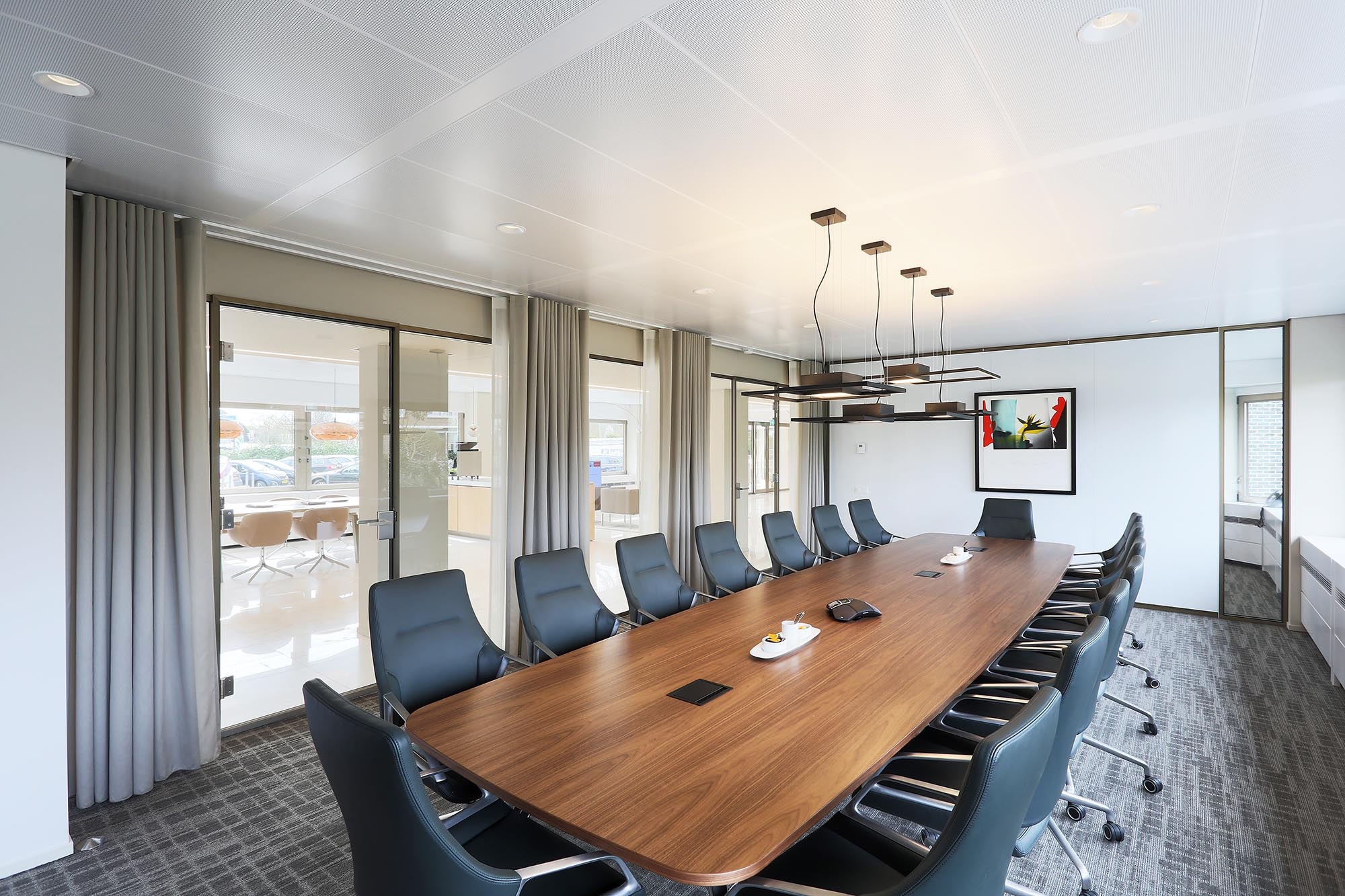 Het kantoor is ingericht als open kantoortuin met vele mogelijkheden om geconcentreerd te kunnen werken of in privacy te kunnen vergaderen. Om de akoestiek verder te optimaliseren, is akoestische wandbekleding toegepast in onze glaswanden.