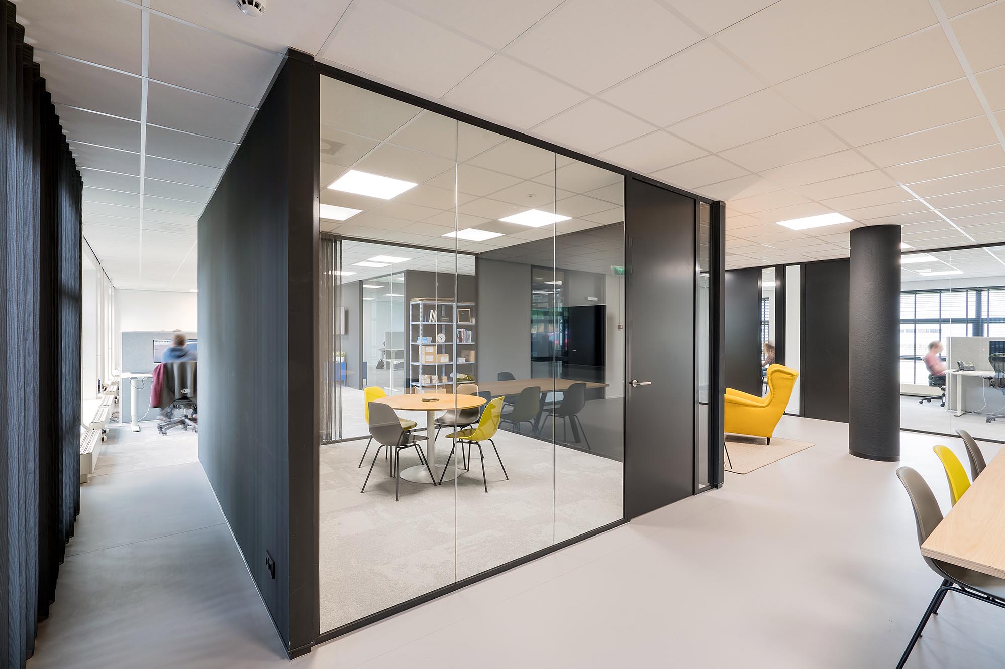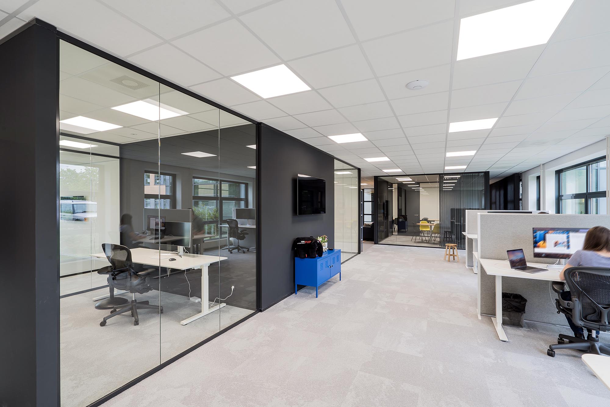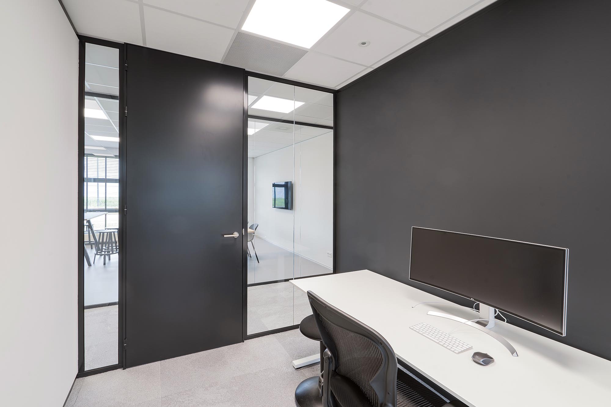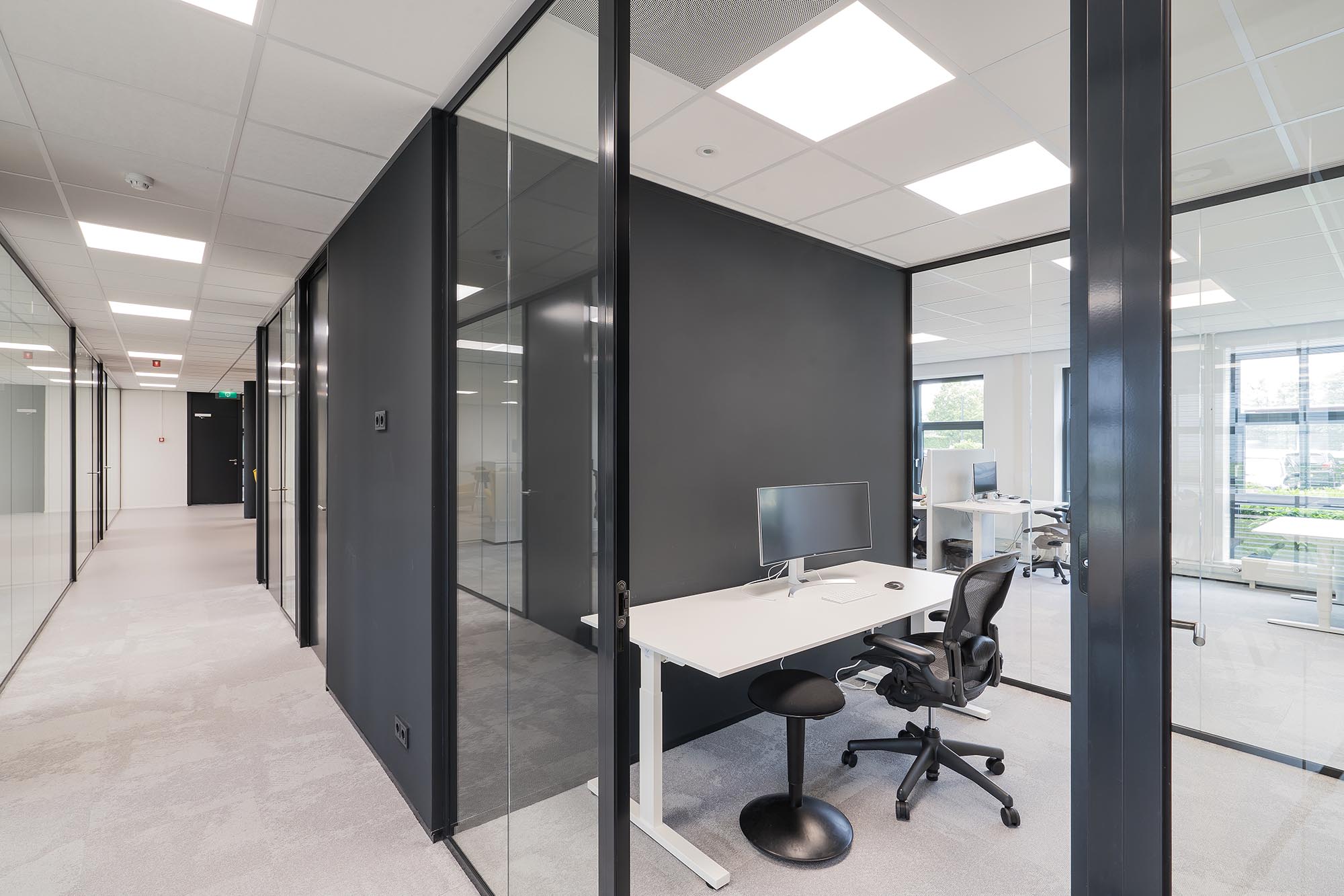 Een licht interieur met donkere accenten. Door de glaswanden wordt er optimaal gebruik gemaakt van het bestaande licht. De tussenwanden zijn als gesloten variant uitgevoerd. Met glaswanden met een geluidsisolatiewaarde van Rw=38dB wordt de privacy en rust op de werkvloer gewaarborgd.