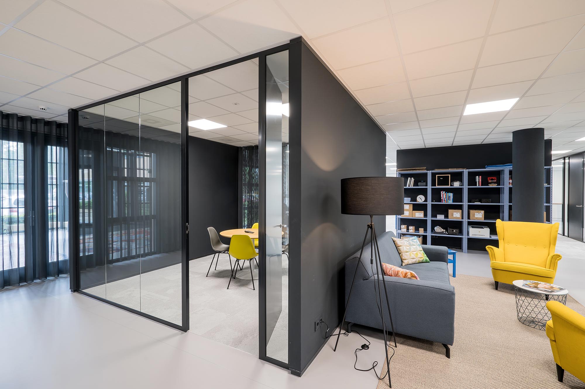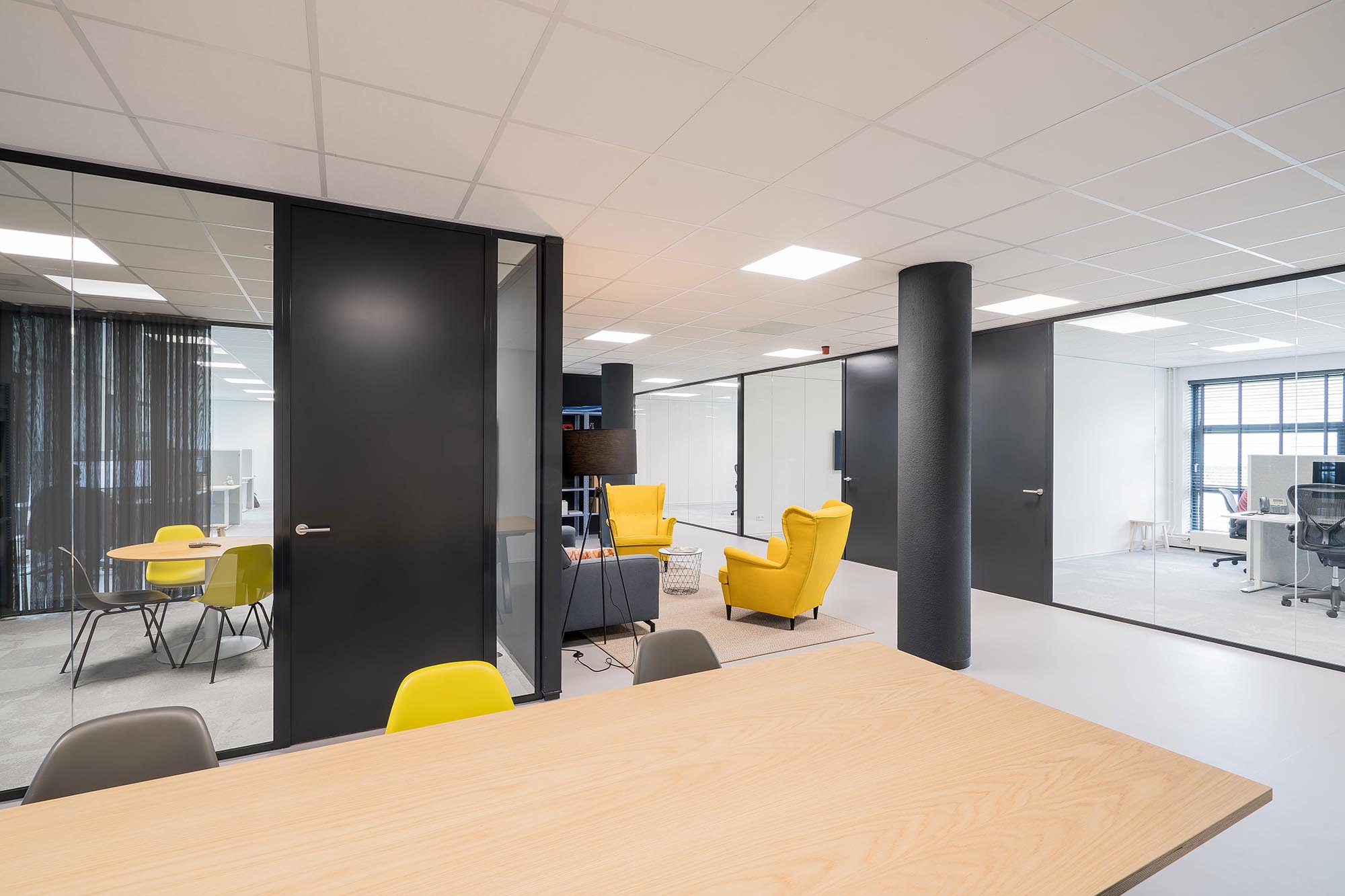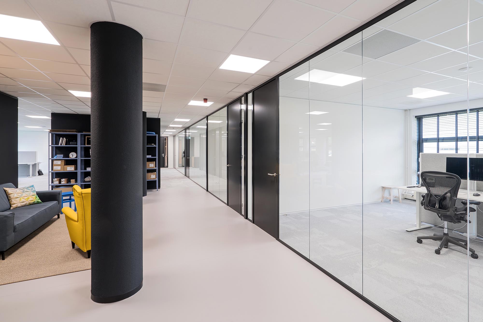 Een licht interieur met donkere accenten. Door de glaswanden wordt er optimaal gebruik gemaakt van het bestaande licht. De tussenwanden zijn als gesloten variant uitgevoerd. Met glaswanden met een geluidsisolatiewaarde van Rw=38dB wordt de privacy en rust op de werkvloer gewaarborgd.