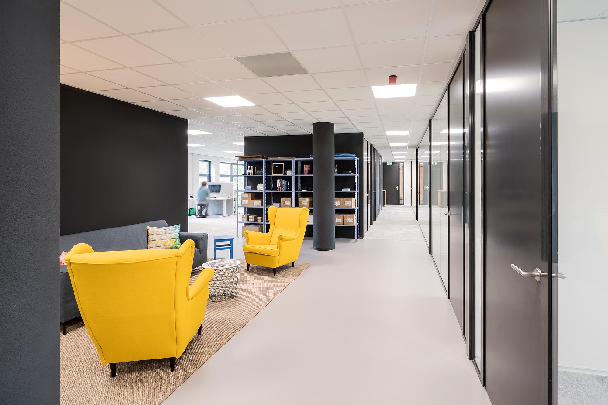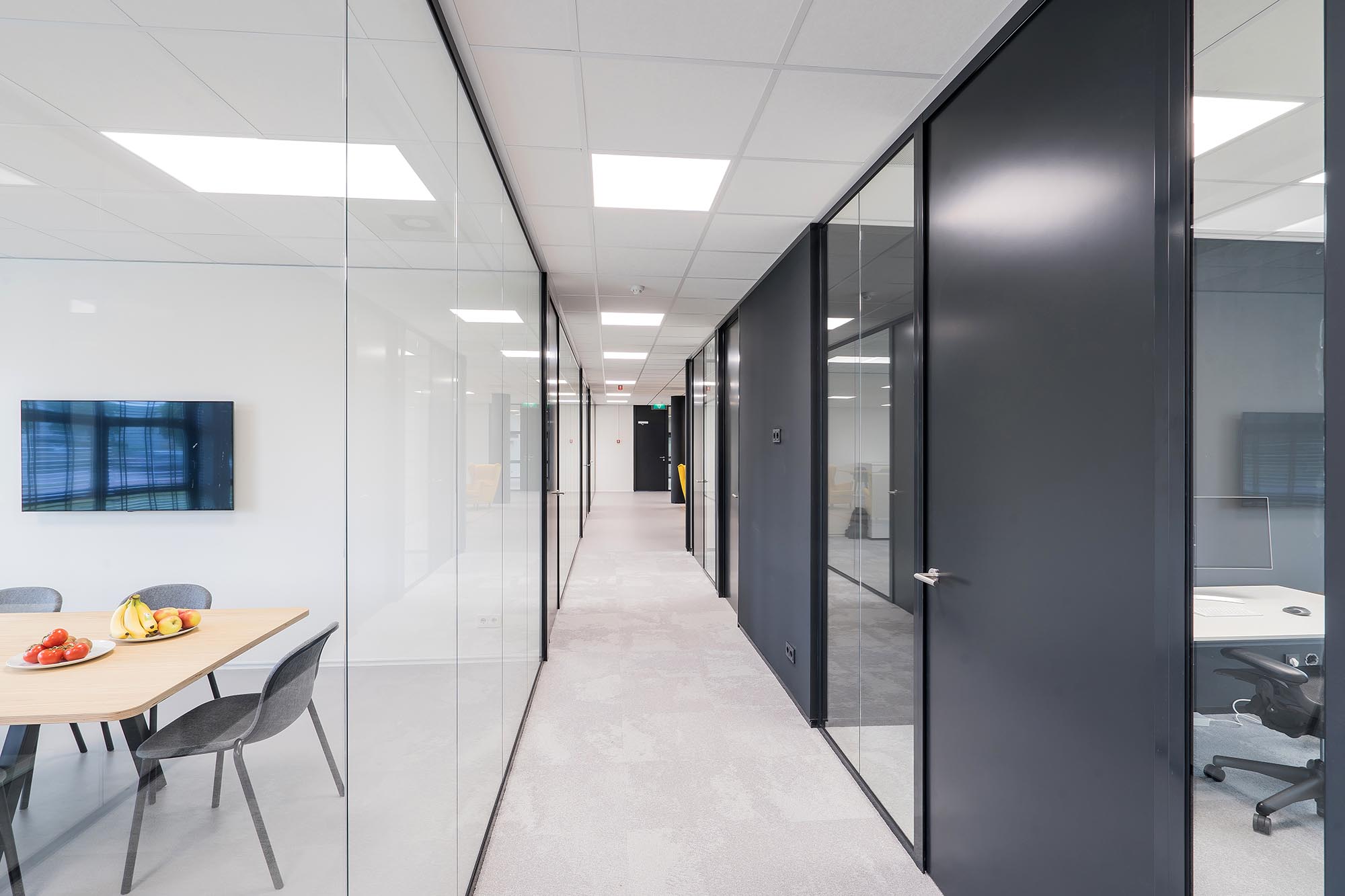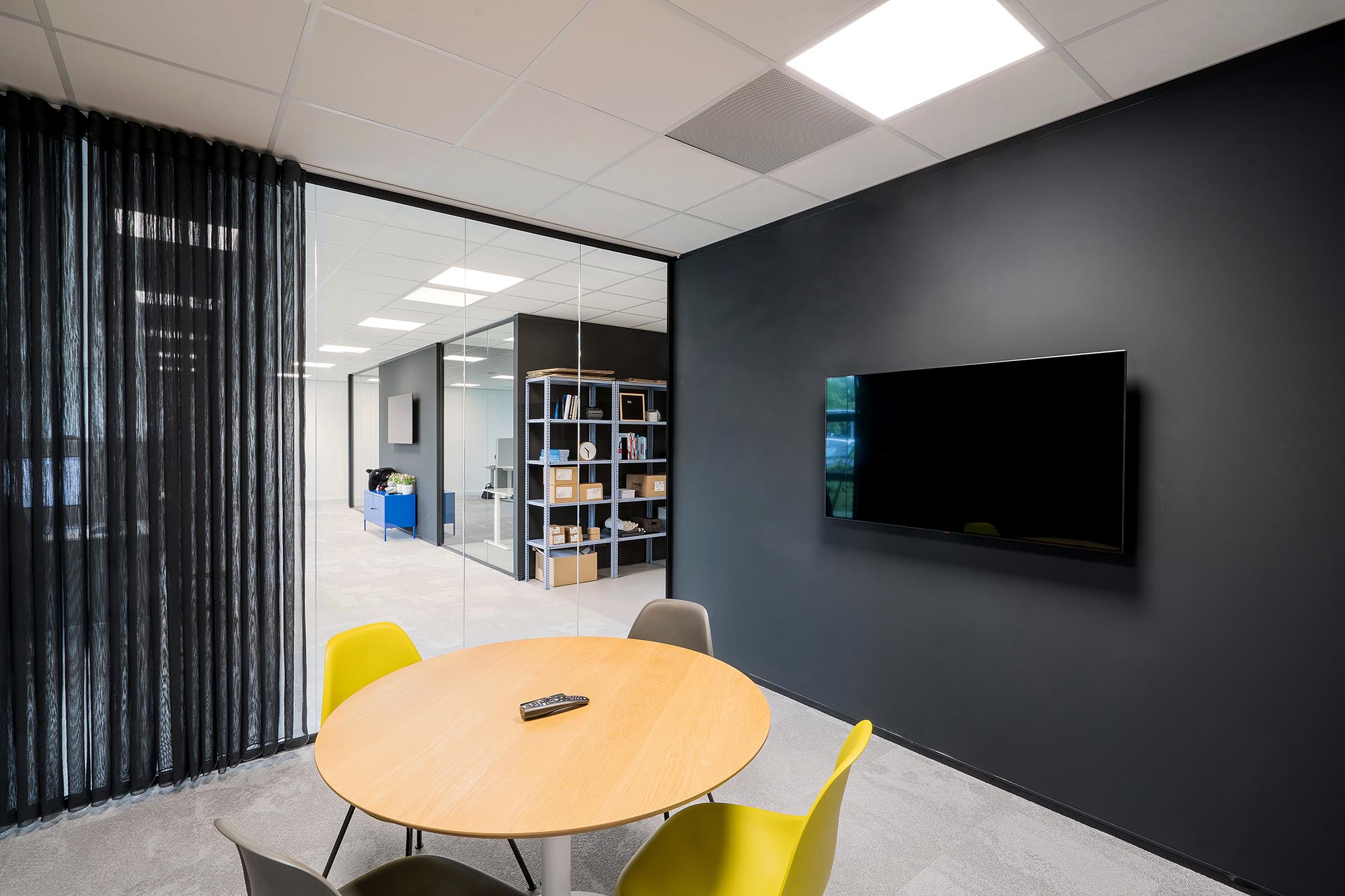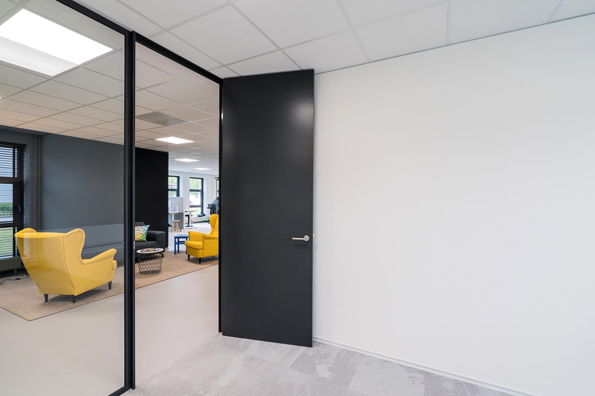 Een licht interieur met donkere accenten. Door de glaswanden wordt er optimaal gebruik gemaakt van het bestaande licht. De tussenwanden zijn als gesloten variant uitgevoerd. Met glaswanden met een geluidsisolatiewaarde van Rw=38dB wordt de privacy en rust op de werkvloer gewaarborgd.