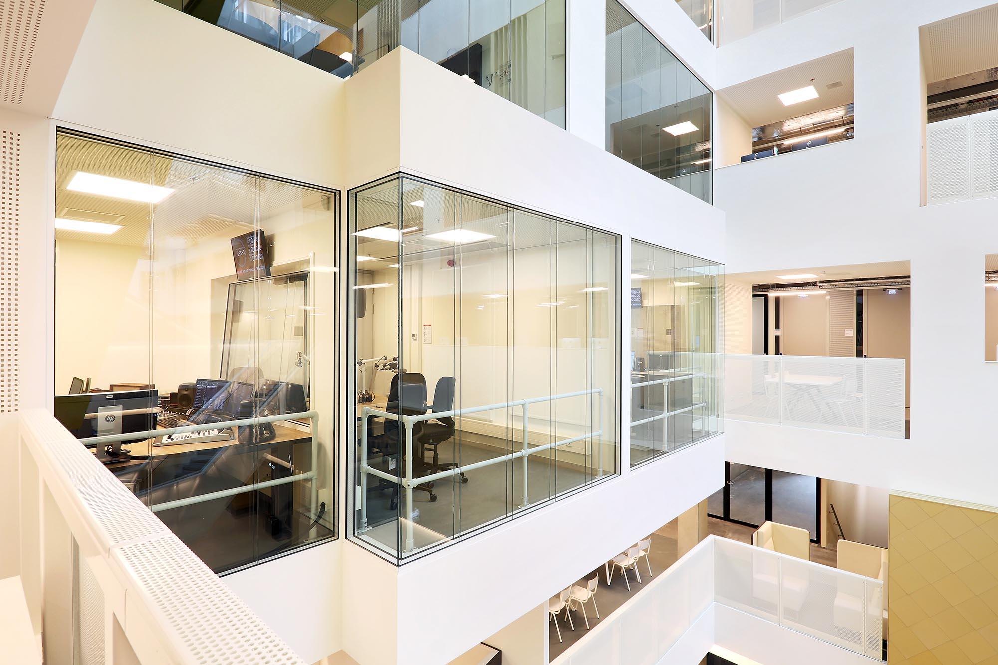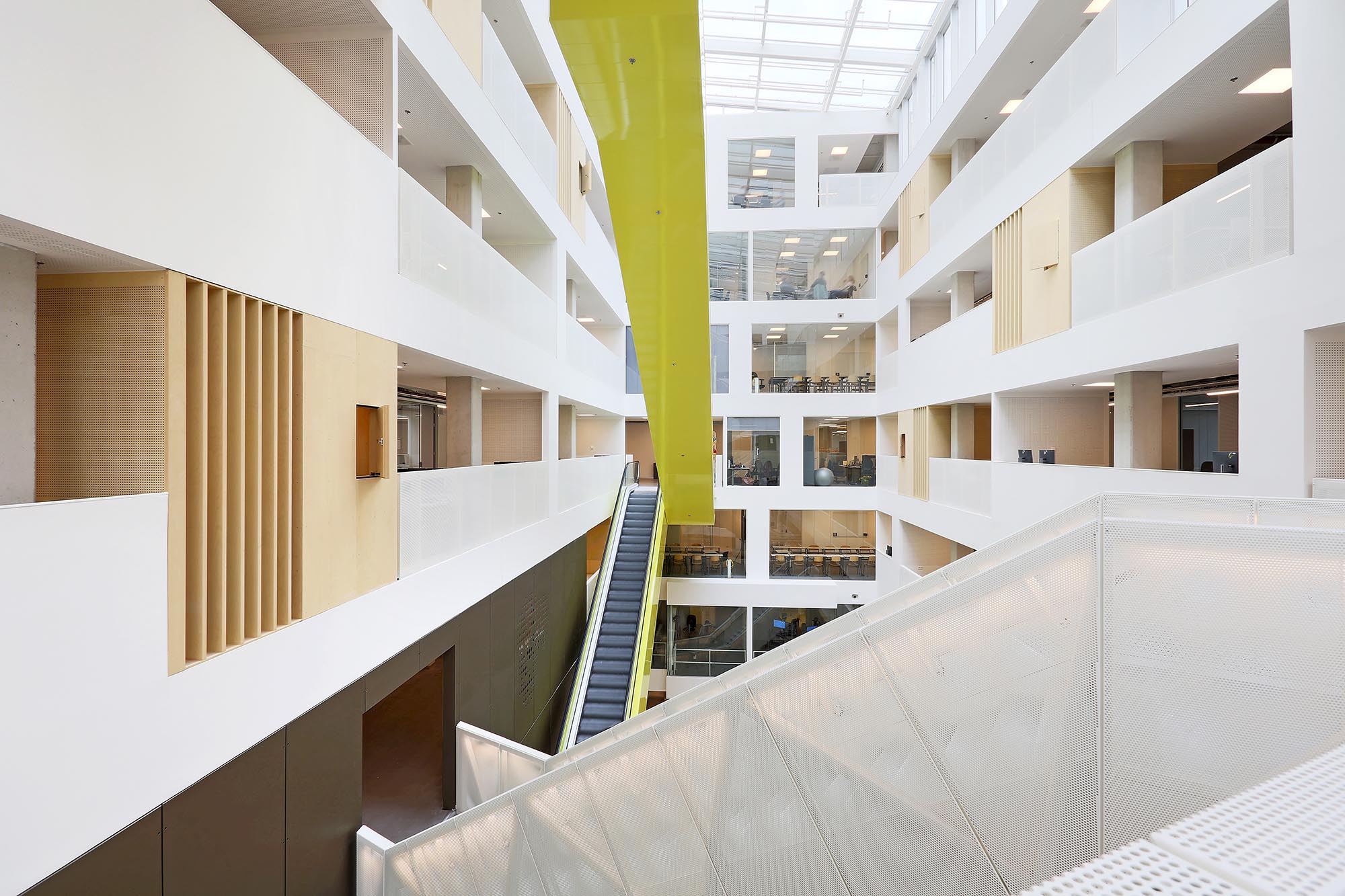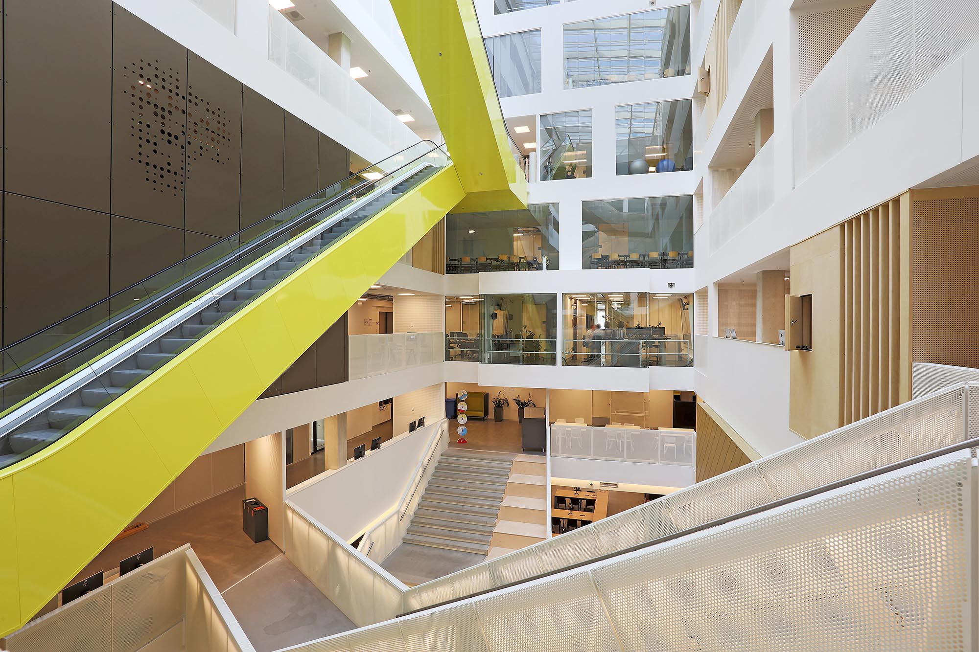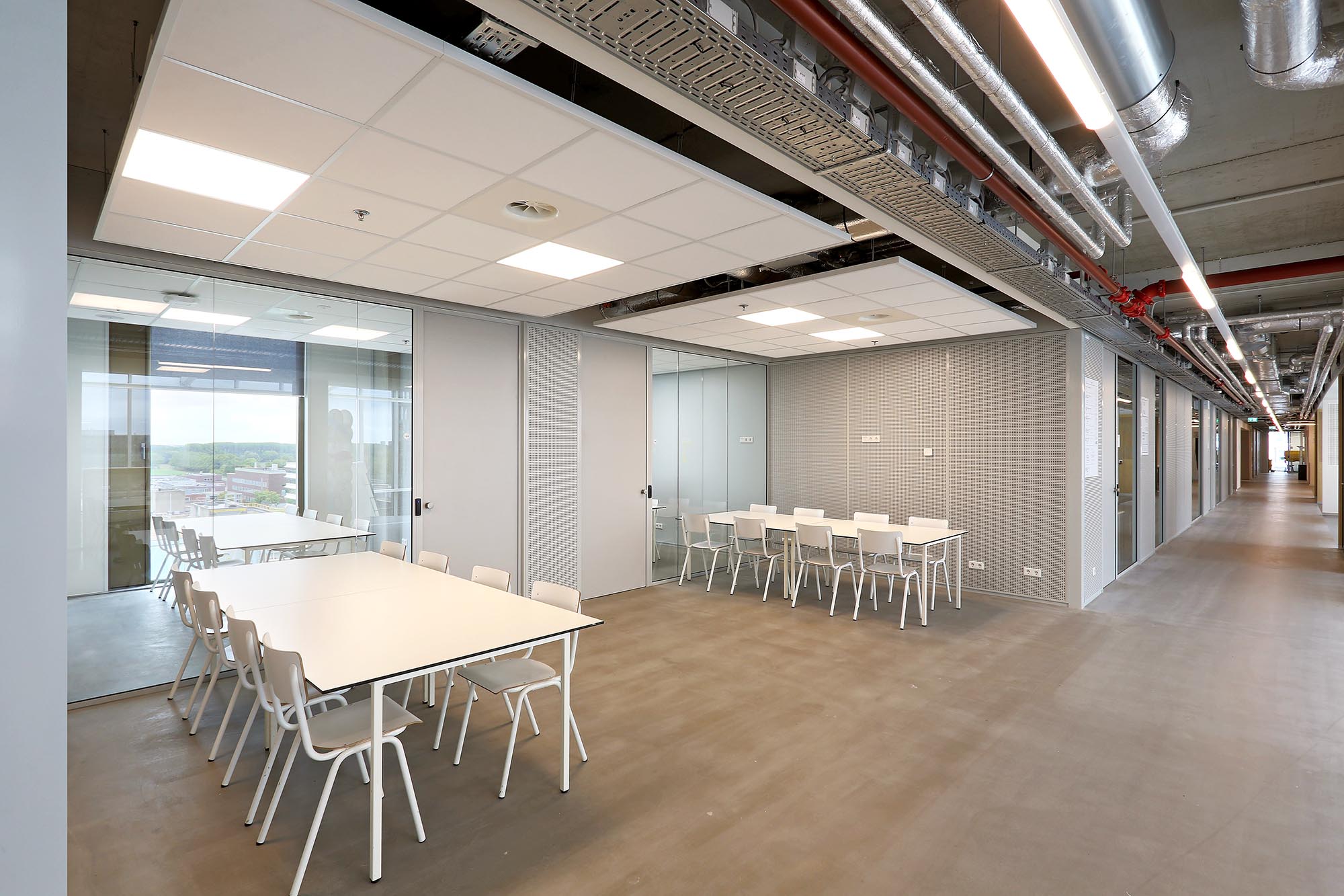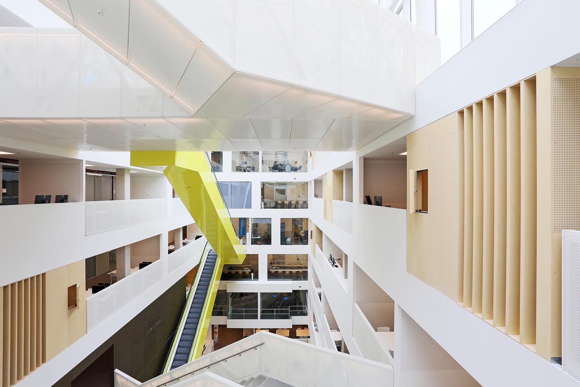 Met meer dan 11.000 studenten en bijna 1000 medewerkers die gebruik maken van de nieuwbouw, stelt dit hoge eisen aan de toe te passen materialen op het gebied van geluidsisolatie en akoestiek. Door de combinatie van geluidsisolerende glazen HGS wanden en geperforeerde akoestische wanden in het atrium en de gangen, is zowel transparantie als een prettig akoestisch klimaat gecreëerd. De concentratiewerkplekken op de gangen zijn maatwerkoplossingen, waarbij de gebruiker ongestoord kan werken in drukke verkeersruimten.