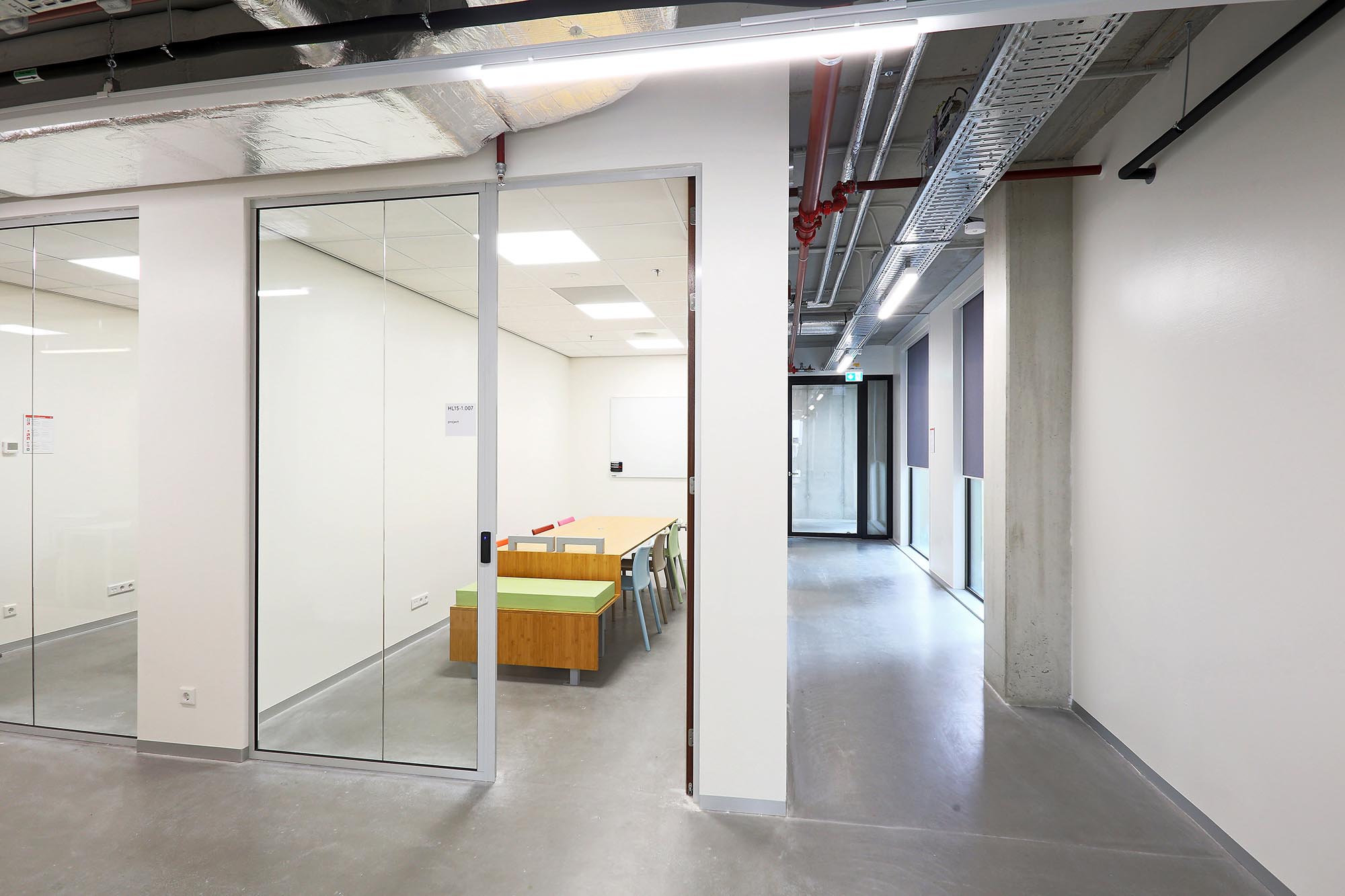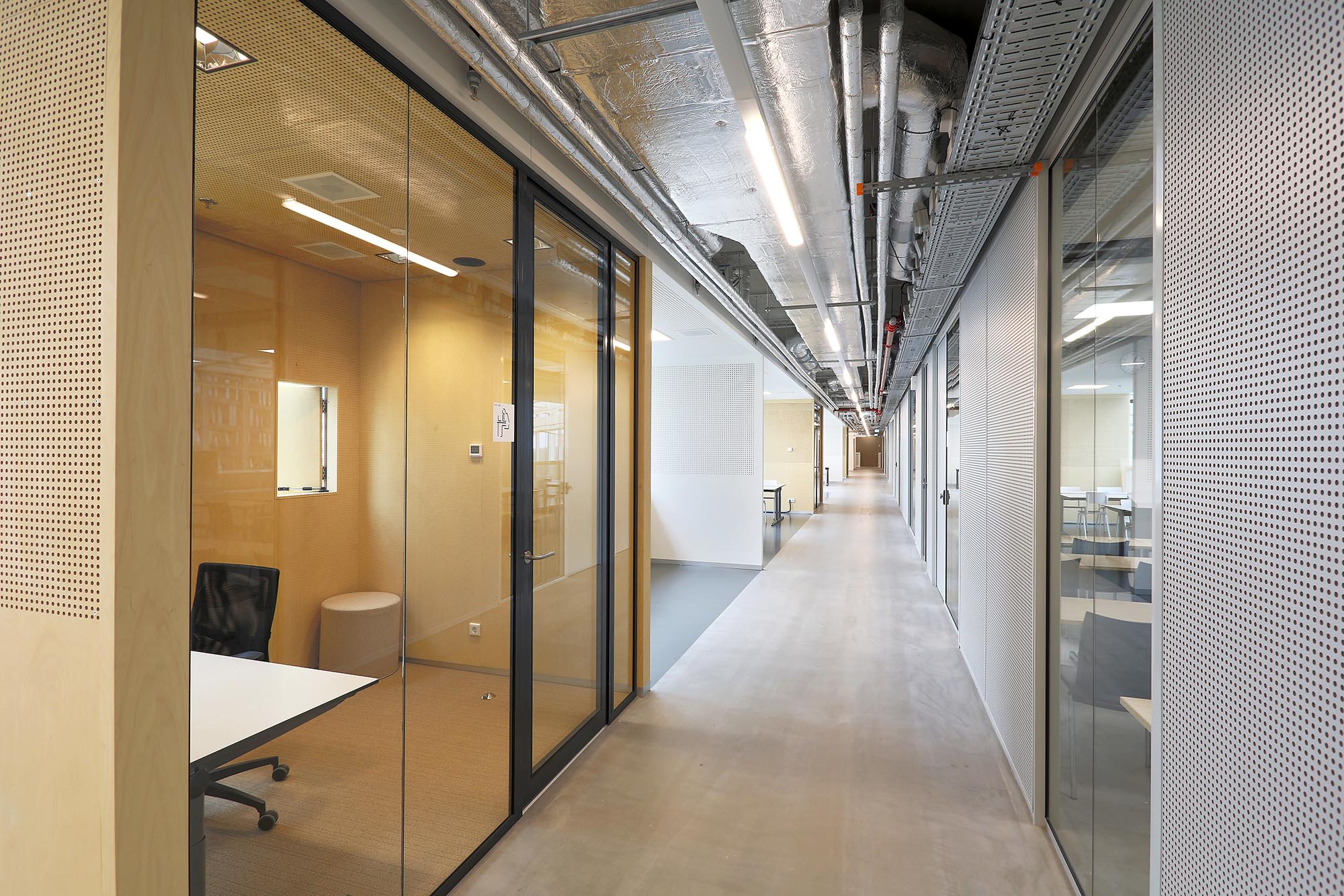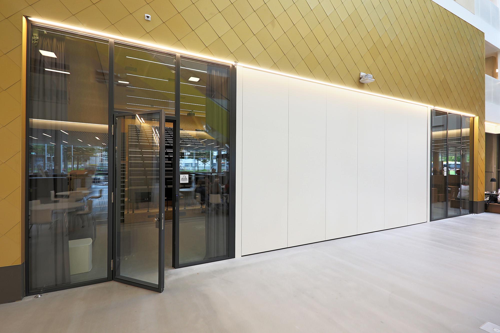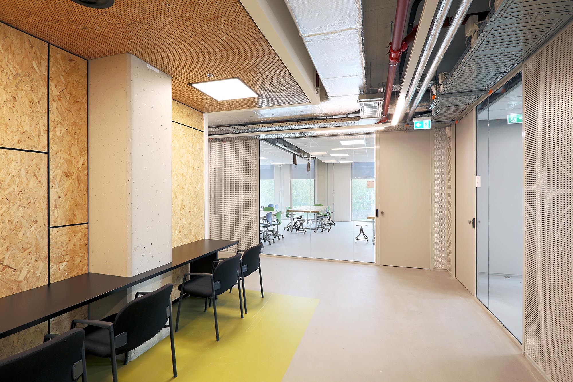 Met meer dan 11.000 studenten en bijna 1000 medewerkers die gebruik maken van de nieuwbouw, stelt dit hoge eisen aan de toe te passen materialen op het gebied van geluidsisolatie en akoestiek. Door de combinatie van geluidsisolerende glazen HGS wanden en geperforeerde akoestische wanden in het atrium en de gangen, is zowel transparantie als een prettig akoestisch klimaat gecreëerd. De concentratiewerkplekken op de gangen zijn maatwerkoplossingen, waarbij de gebruiker ongestoord kan werken in drukke verkeersruimten.