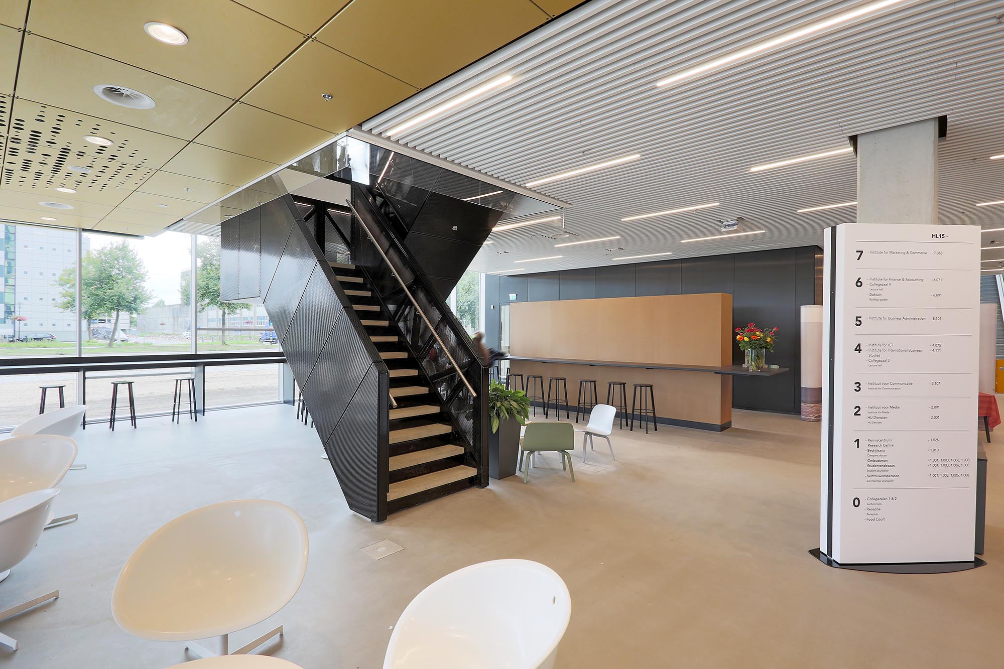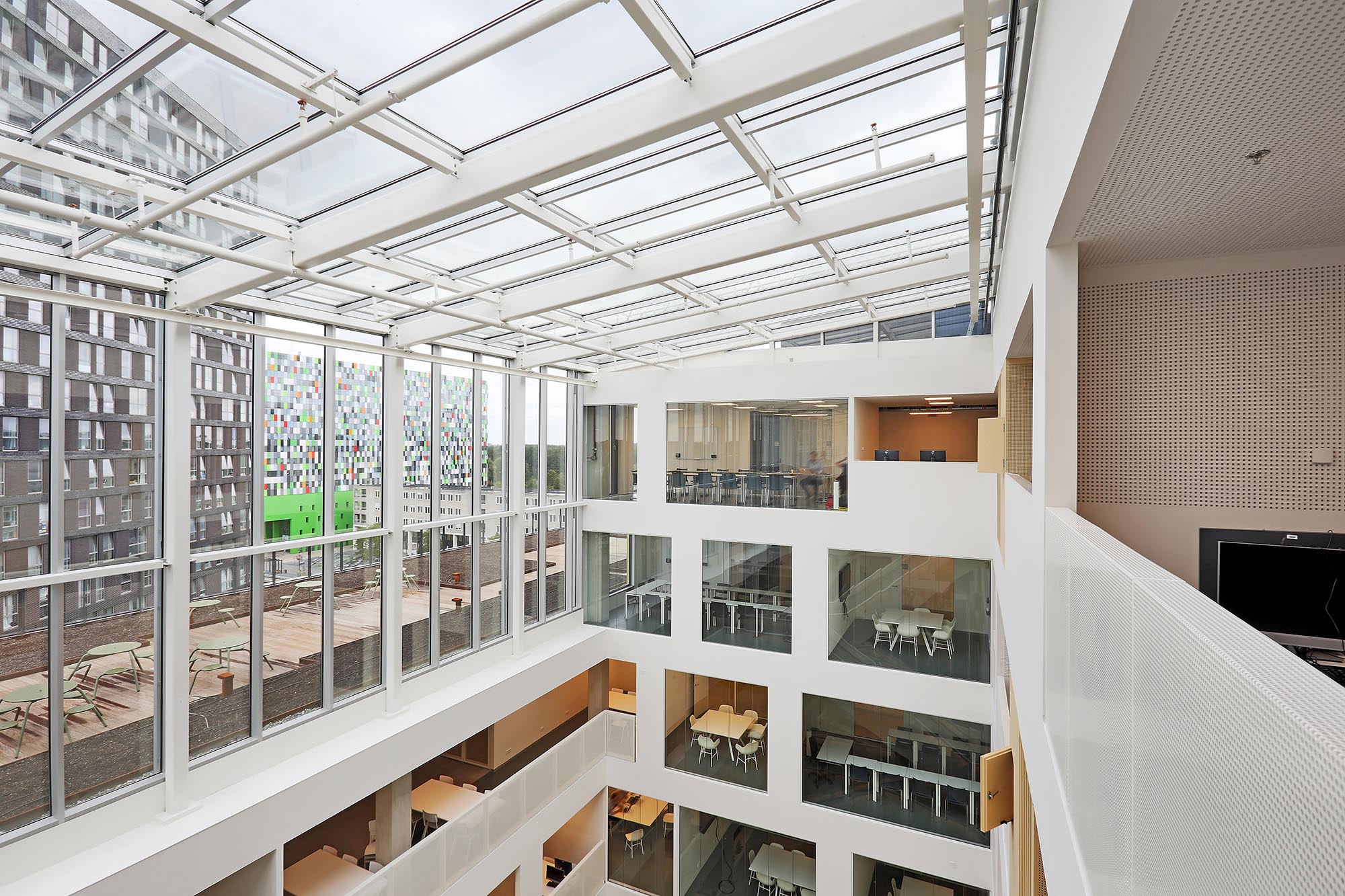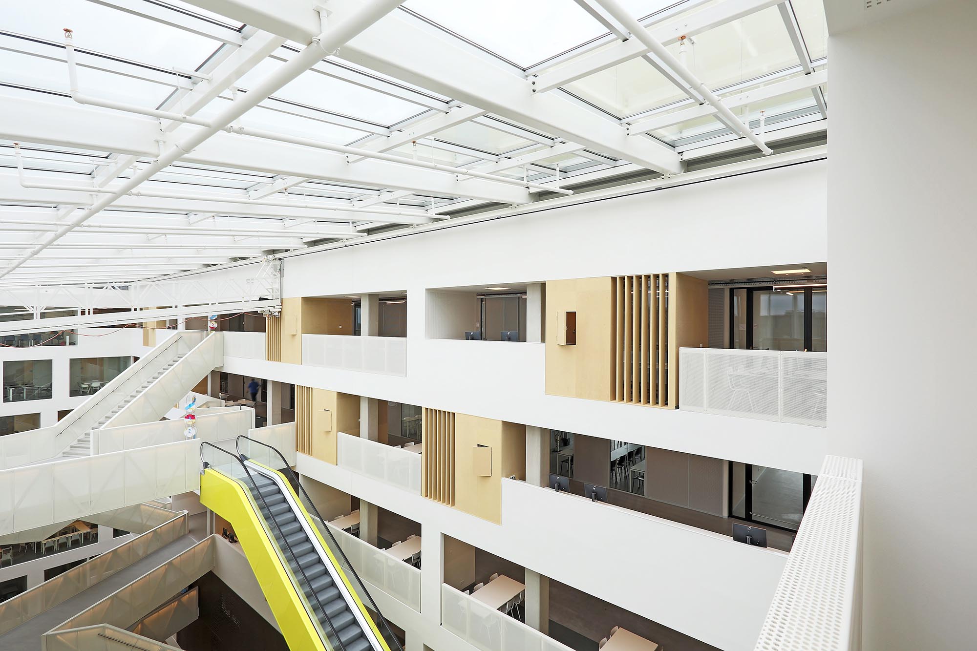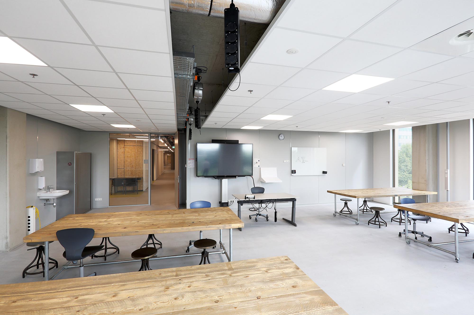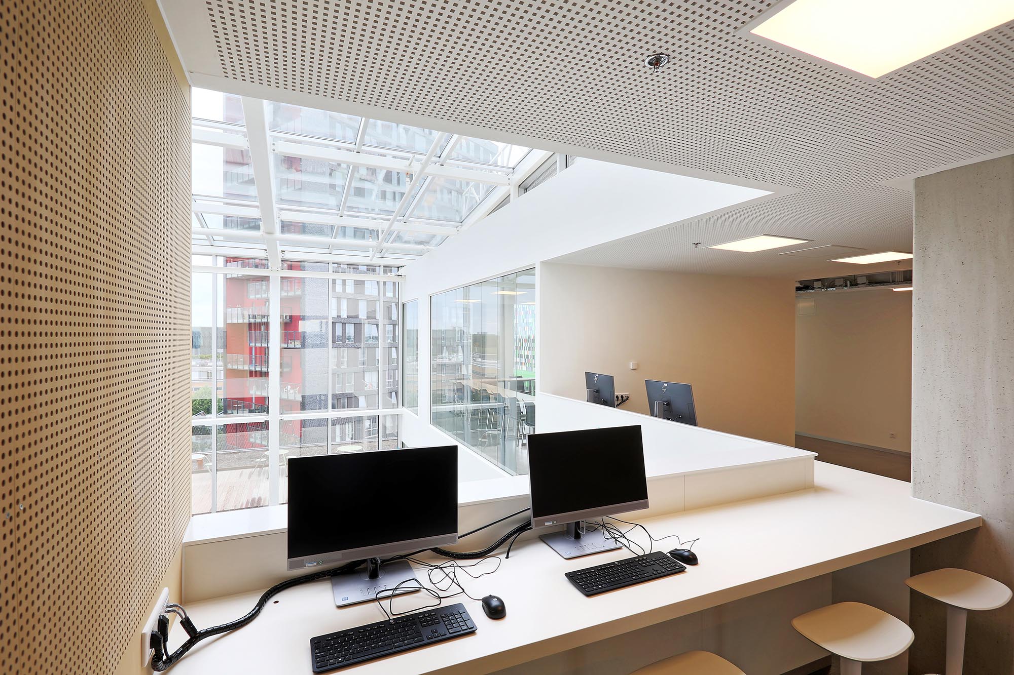 Met meer dan 11.000 studenten en bijna 1000 medewerkers die gebruik maken van de nieuwbouw, stelt dit hoge eisen aan de toe te passen materialen op het gebied van geluidsisolatie en akoestiek. Door de combinatie van geluidsisolerende glazen HGS wanden en geperforeerde akoestische wanden in het atrium en de gangen, is zowel transparantie als een prettig akoestisch klimaat gecreëerd. De concentratiewerkplekken op de gangen zijn maatwerkoplossingen, waarbij de gebruiker ongestoord kan werken in drukke verkeersruimten.