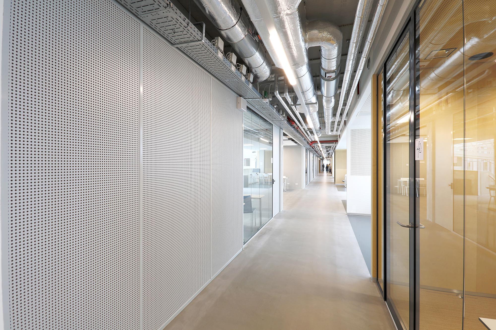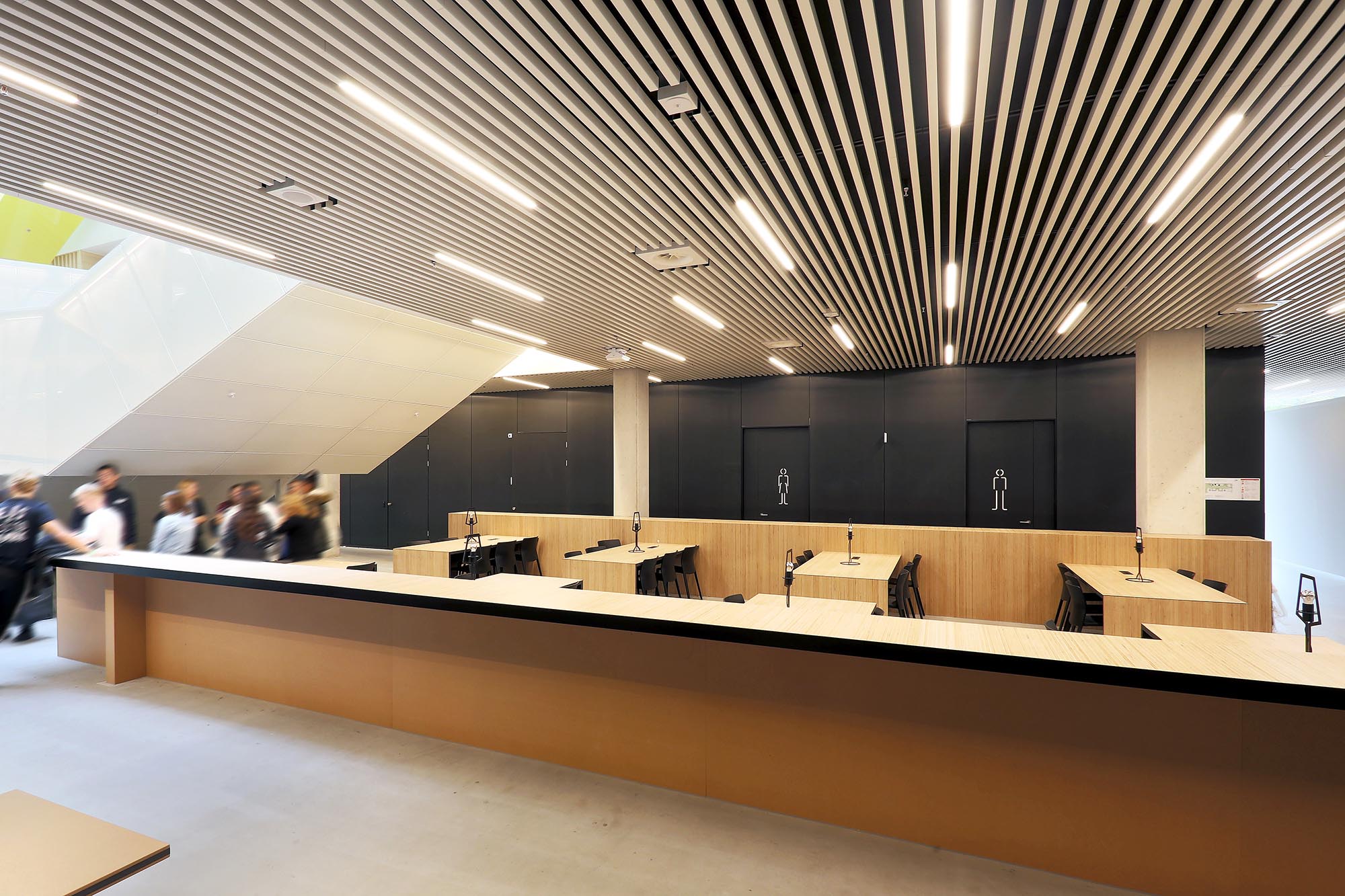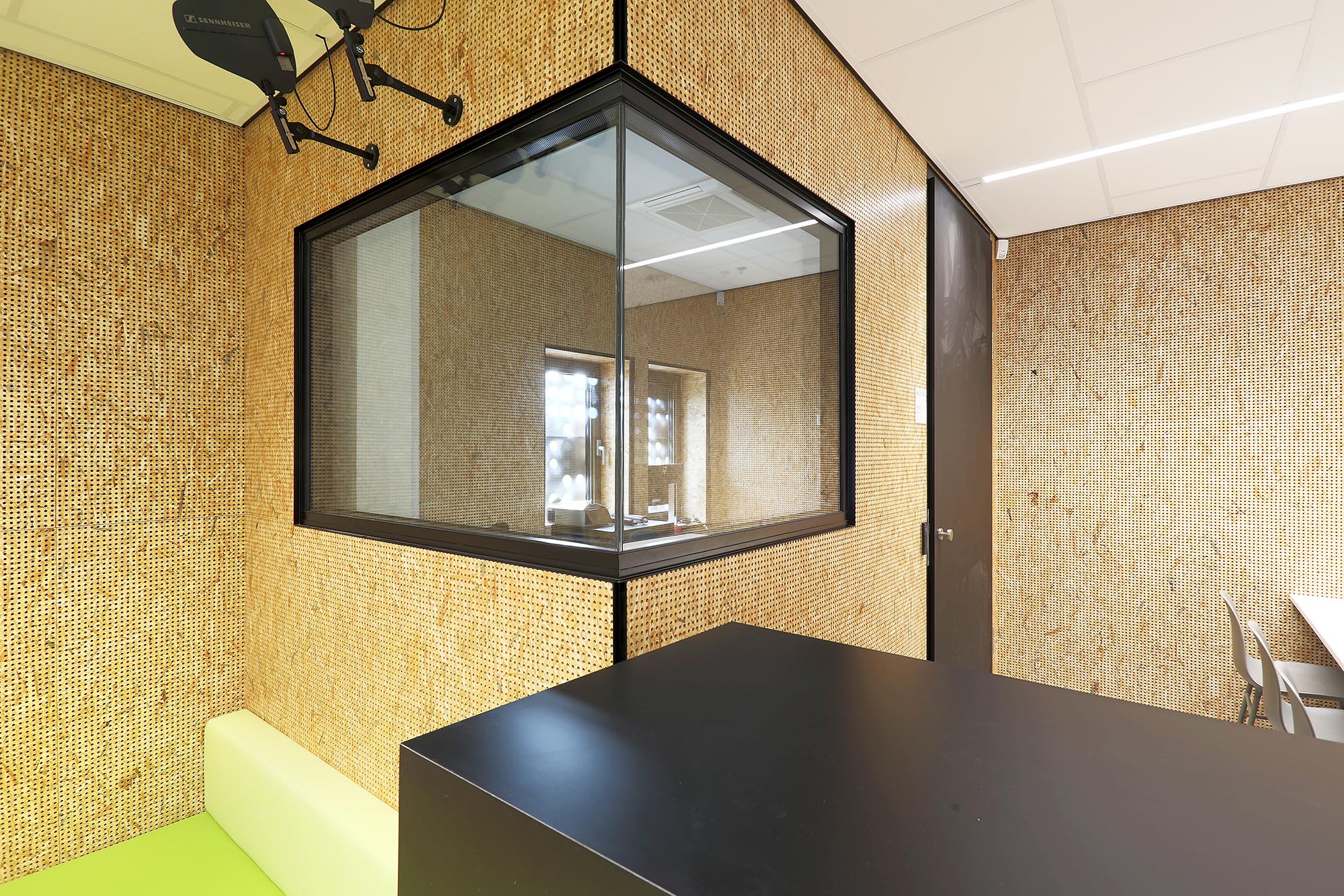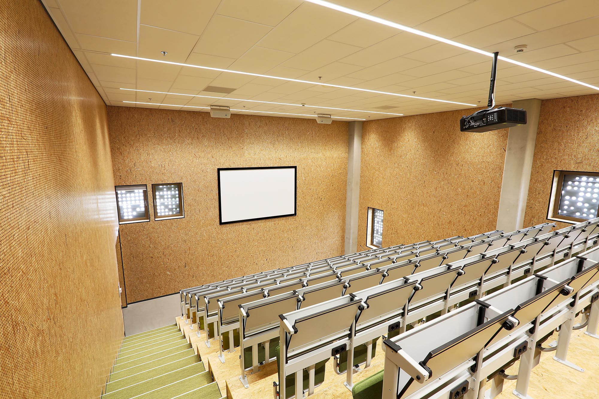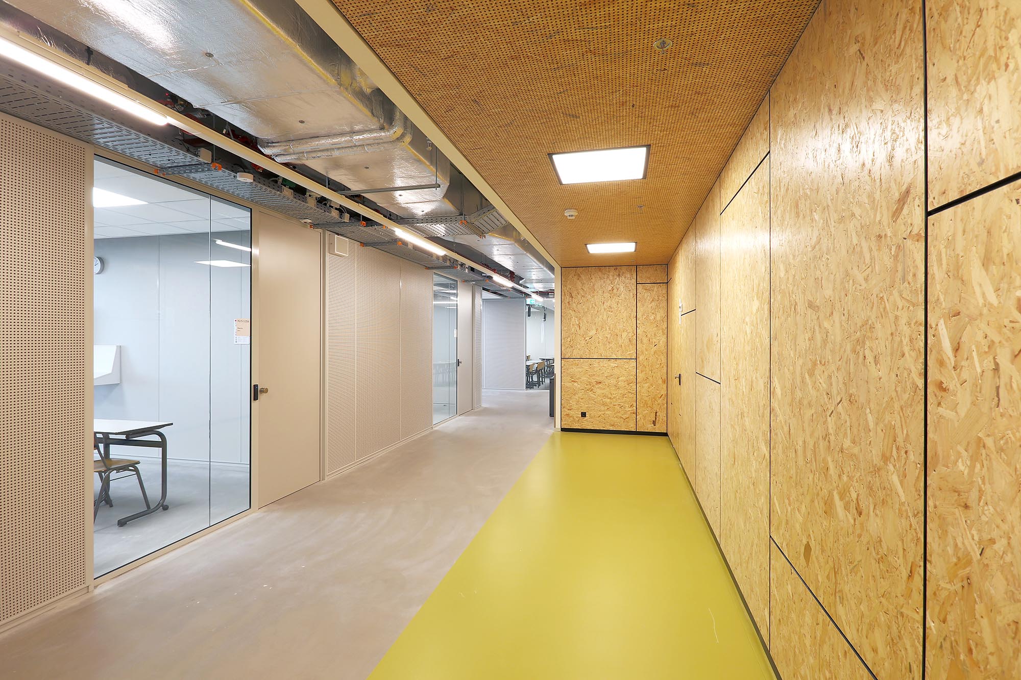 Met meer dan 11.000 studenten en bijna 1000 medewerkers die gebruik maken van de nieuwbouw, stelt dit hoge eisen aan de toe te passen materialen op het gebied van geluidsisolatie en akoestiek. Door de combinatie van geluidsisolerende glazen HGS wanden en geperforeerde akoestische wanden in het atrium en de gangen, is zowel transparantie als een prettig akoestisch klimaat gecreëerd. De concentratiewerkplekken op de gangen zijn maatwerkoplossingen, waarbij de gebruiker ongestoord kan werken in drukke verkeersruimten.