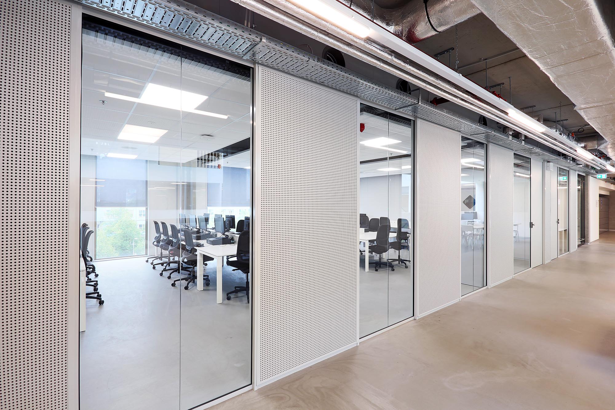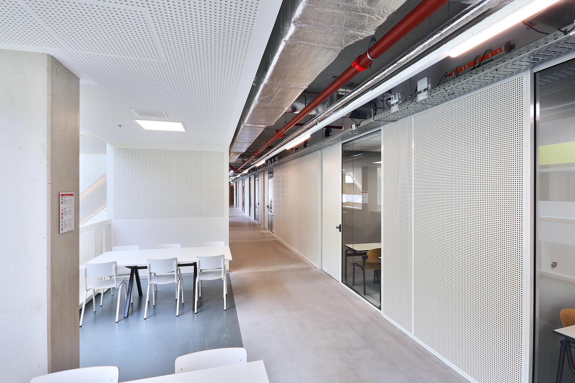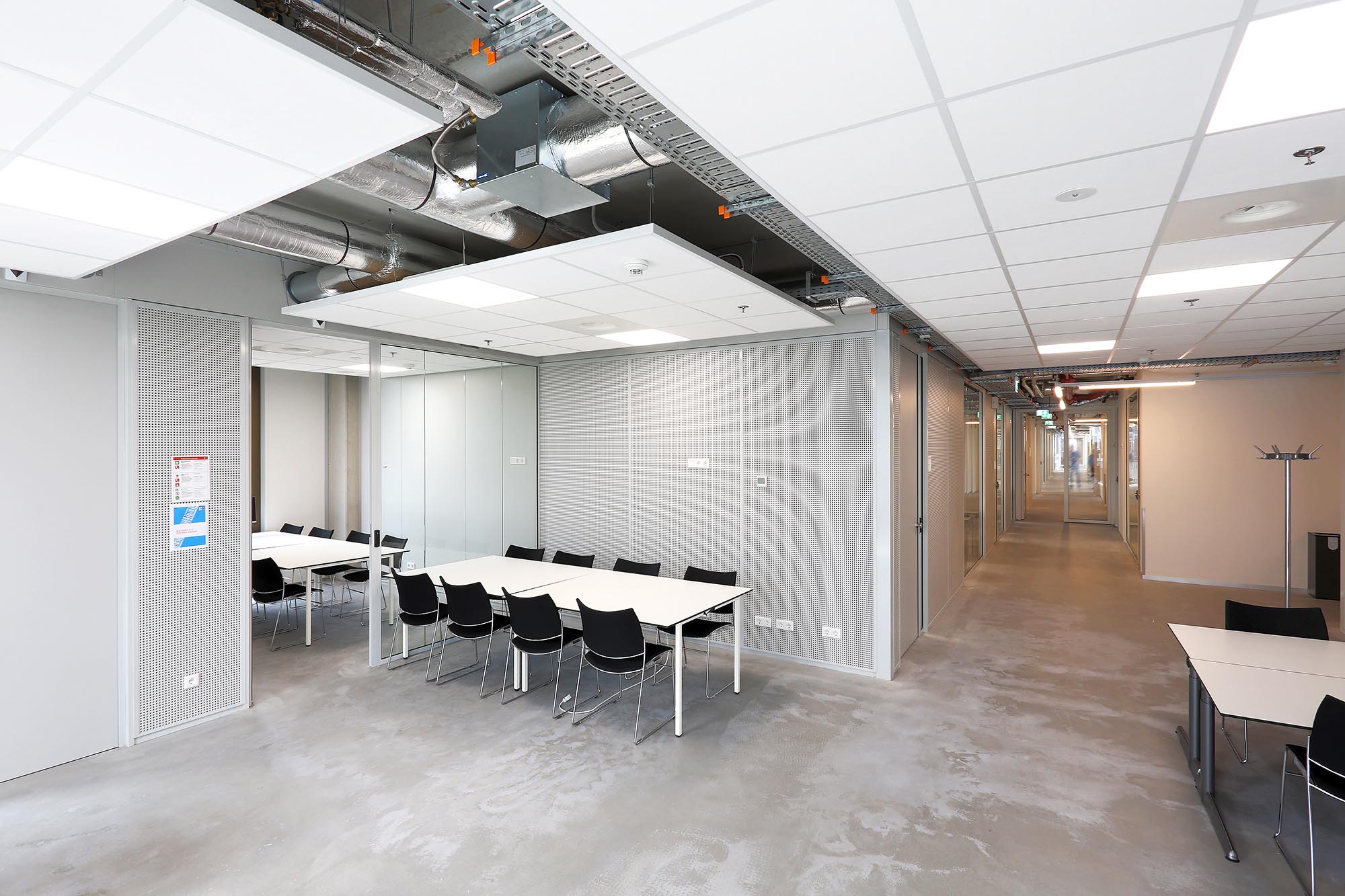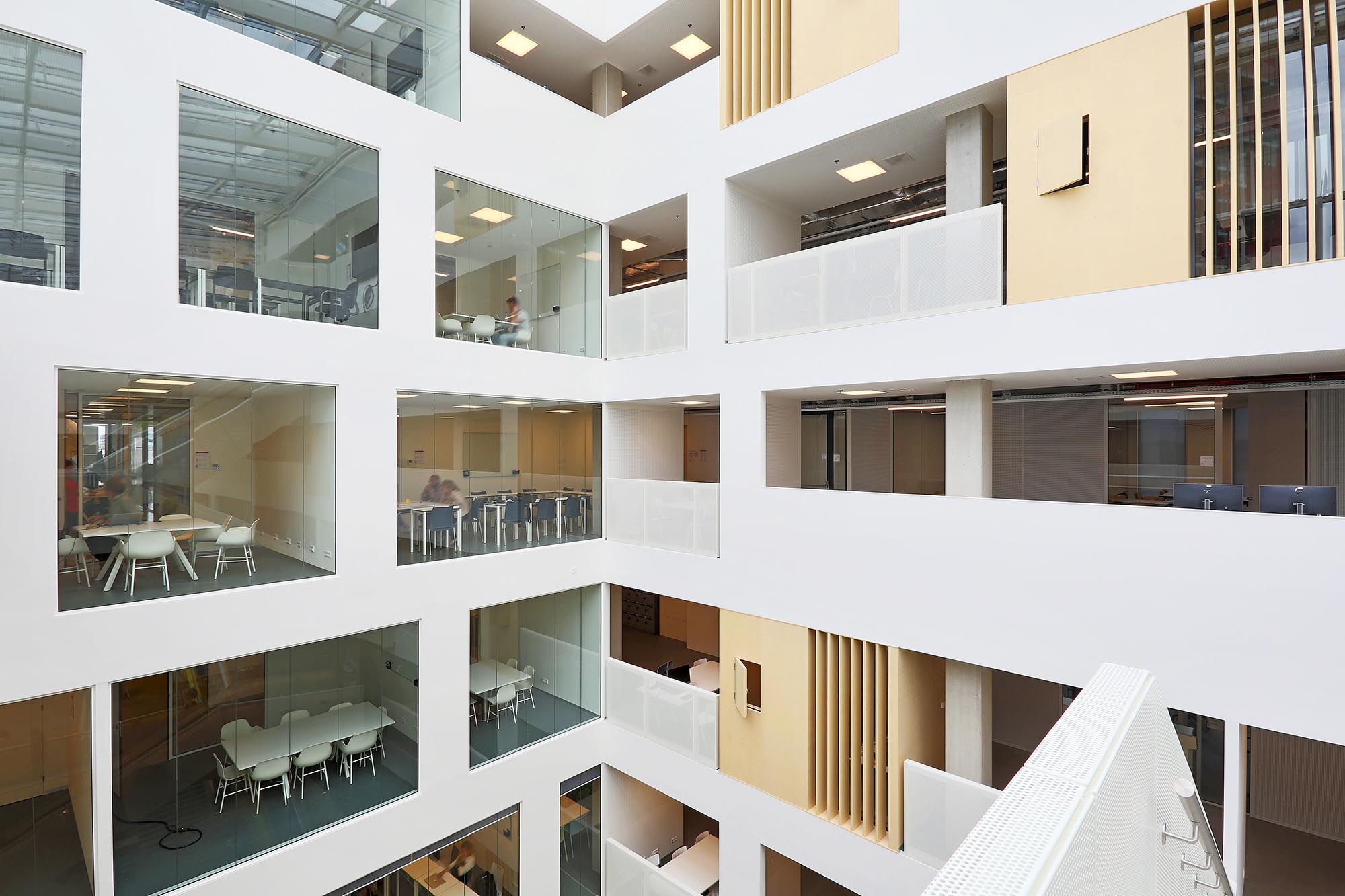 Met meer dan 11.000 studenten en bijna 1000 medewerkers die gebruik maken van de nieuwbouw, stelt dit hoge eisen aan de toe te passen materialen op het gebied van geluidsisolatie en akoestiek. Door de combinatie van geluidsisolerende glazen HGS wanden en geperforeerde akoestische wanden in het atrium en de gangen, is zowel transparantie als een prettig akoestisch klimaat gecreëerd. De concentratiewerkplekken op de gangen zijn maatwerkoplossingen, waarbij de gebruiker ongestoord kan werken in drukke verkeersruimten.