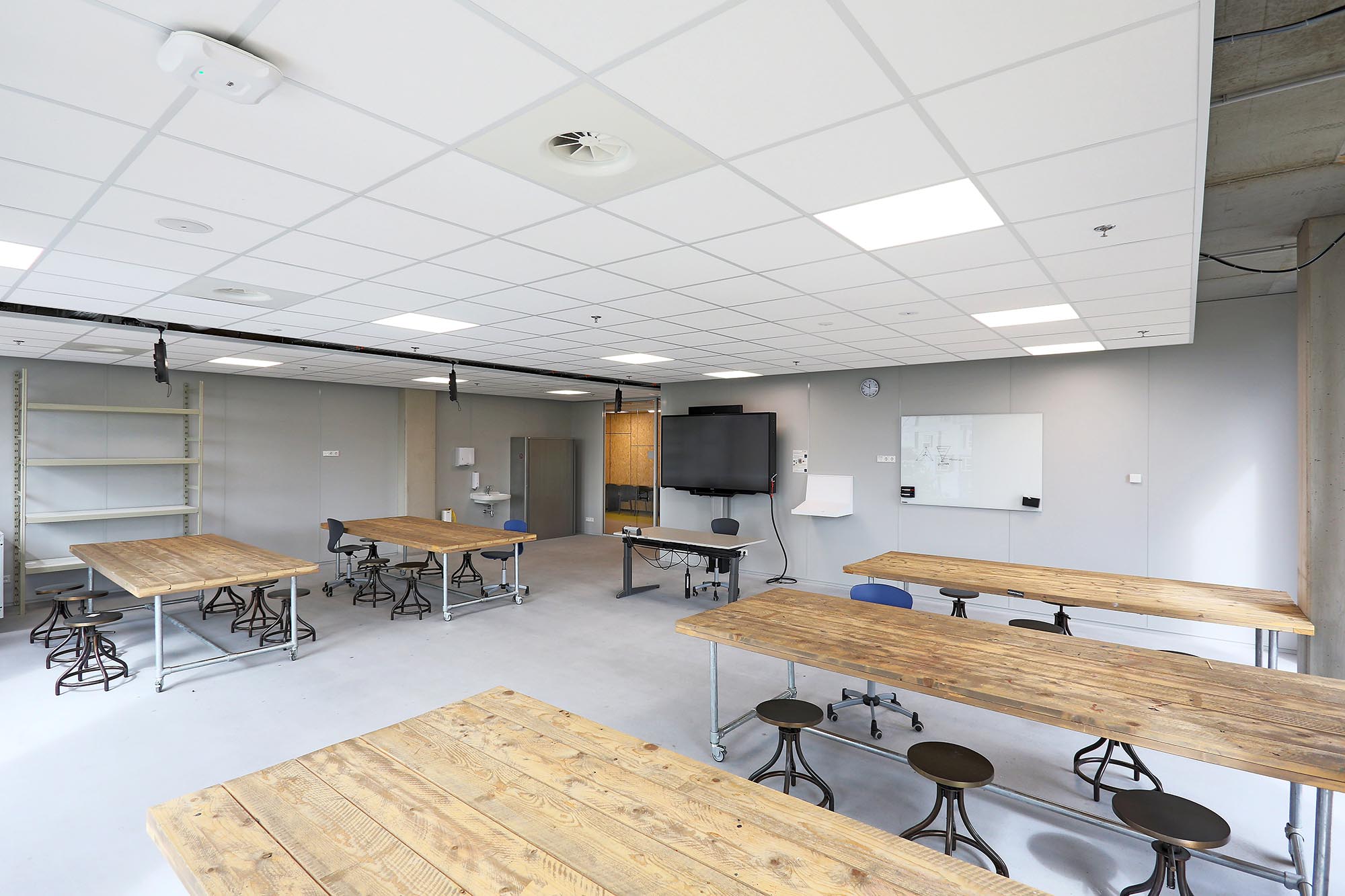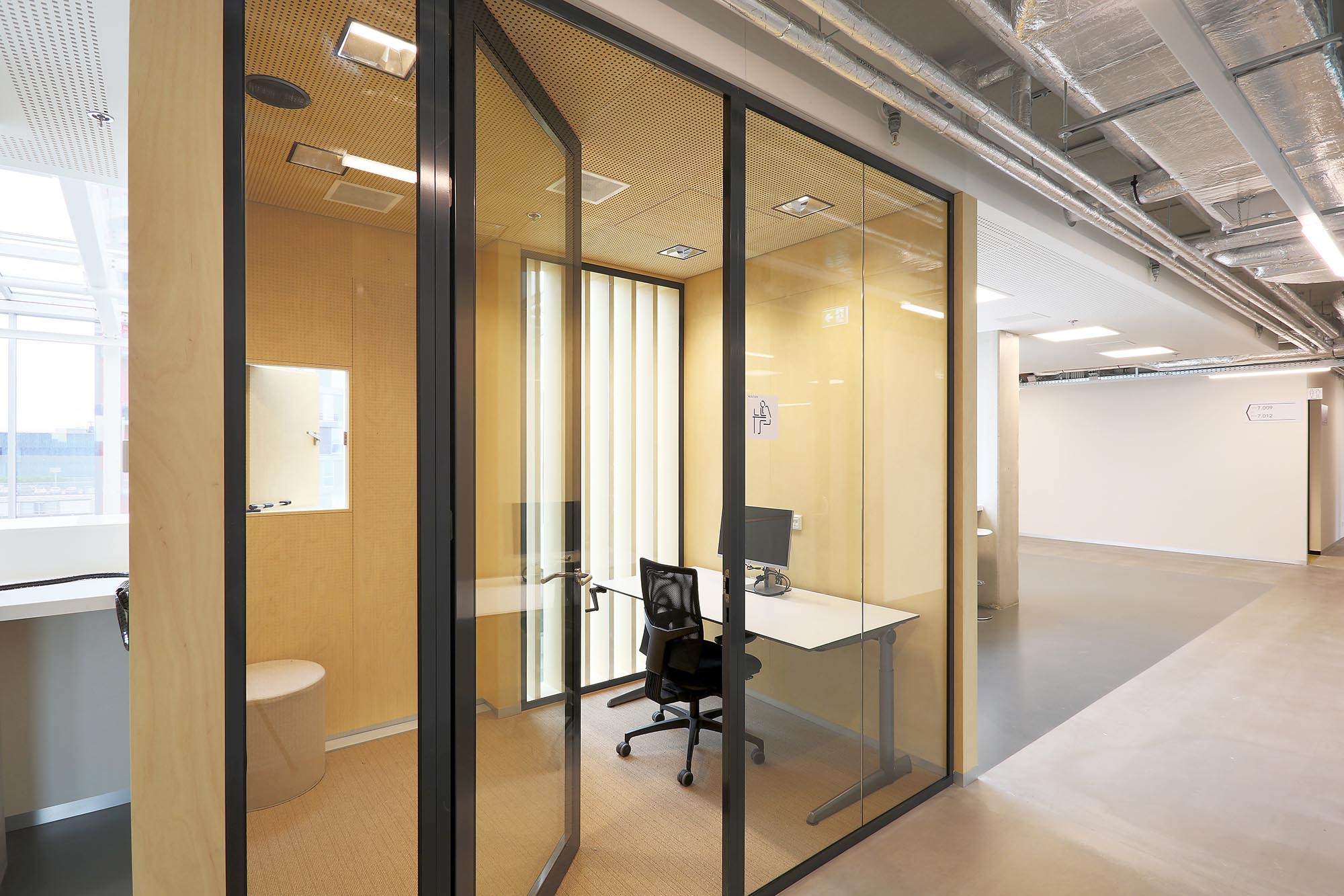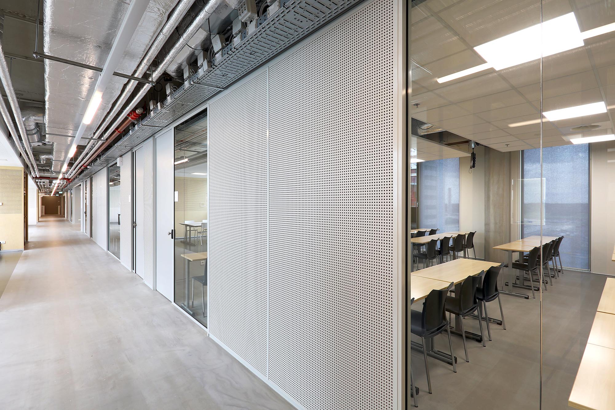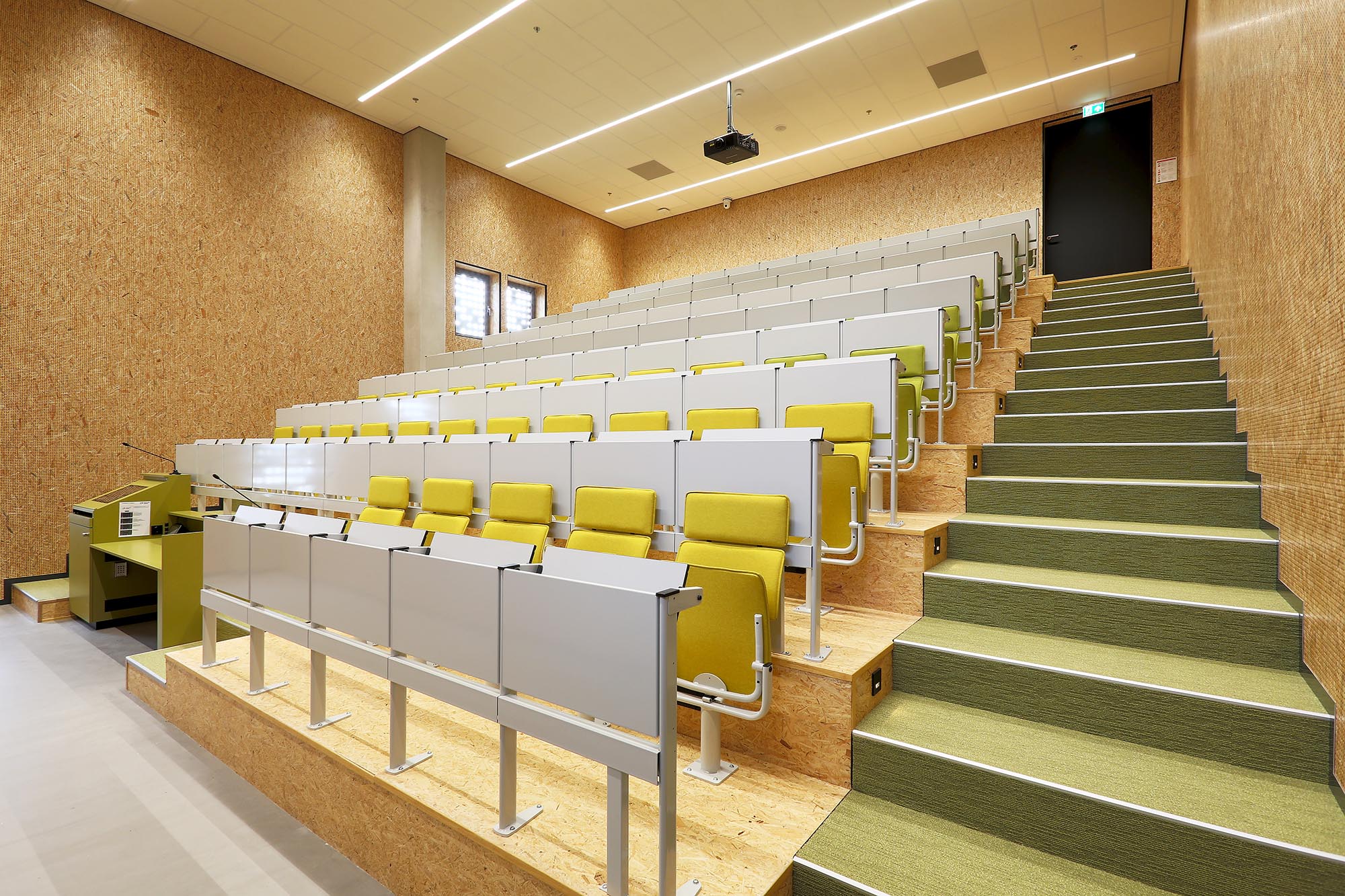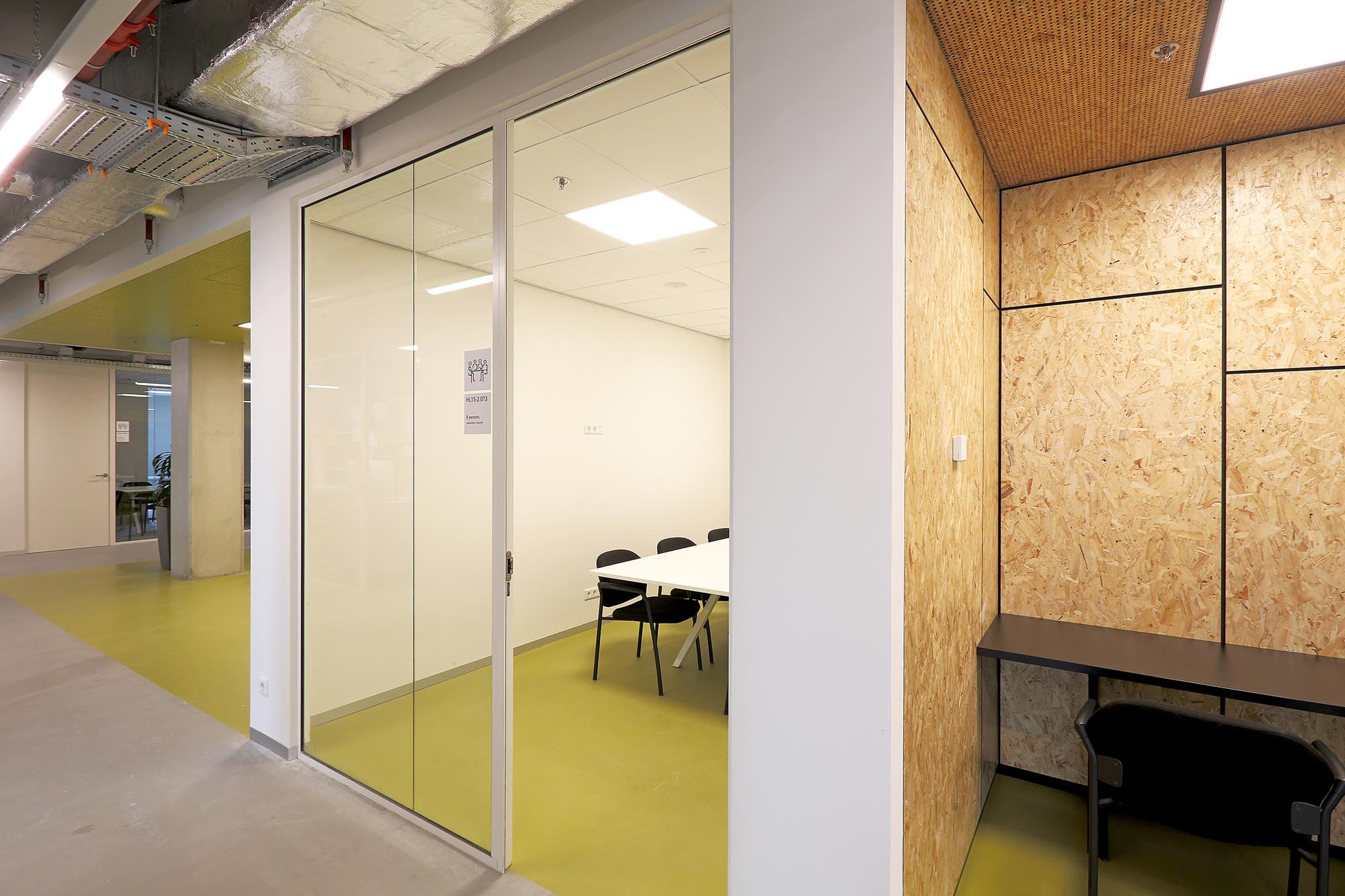 Met meer dan 11.000 studenten en bijna 1000 medewerkers die gebruik maken van de nieuwbouw, stelt dit hoge eisen aan de toe te passen materialen op het gebied van geluidsisolatie en akoestiek. Door de combinatie van geluidsisolerende glazen HGS wanden en geperforeerde akoestische wanden in het atrium en de gangen, is zowel transparantie als een prettig akoestisch klimaat gecreëerd. De concentratiewerkplekken op de gangen zijn maatwerkoplossingen, waarbij de gebruiker ongestoord kan werken in drukke verkeersruimten.
