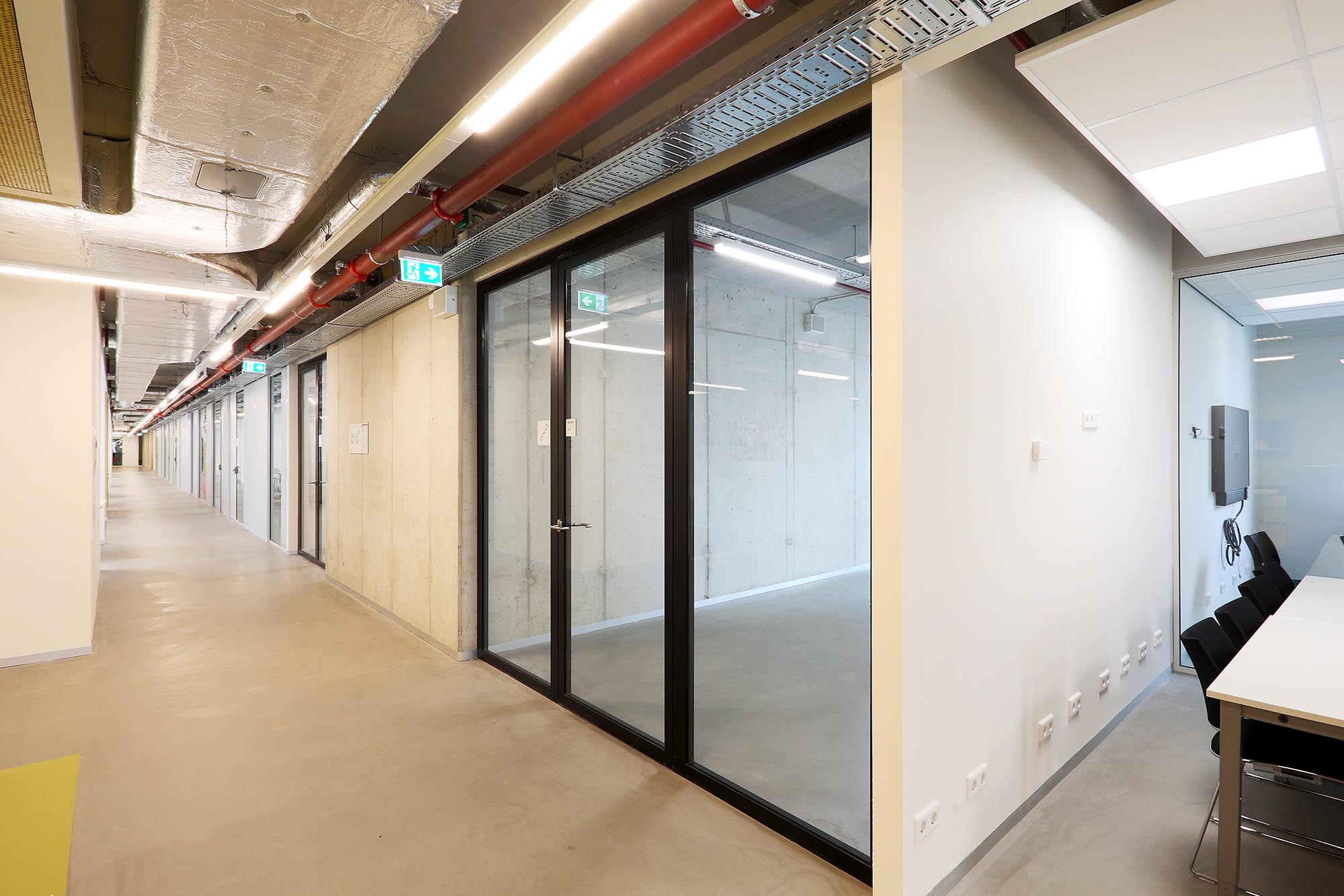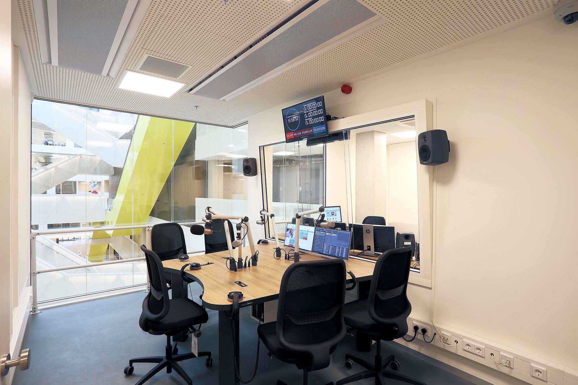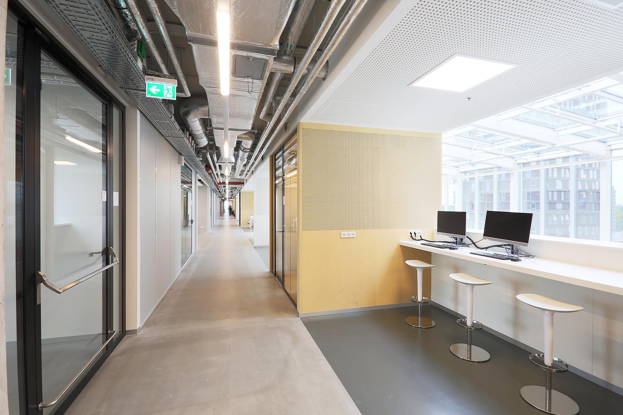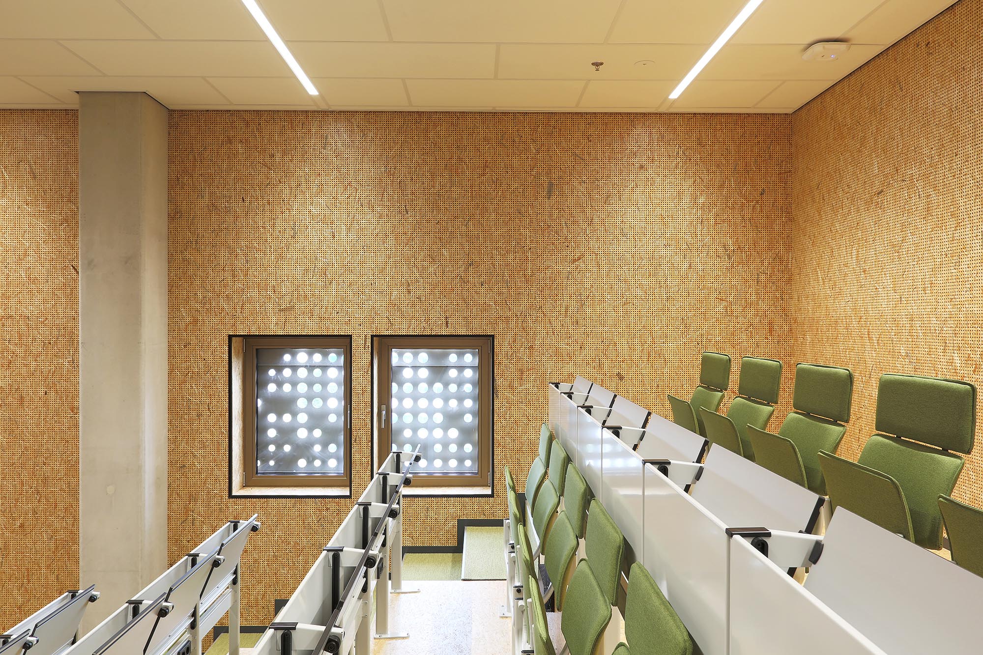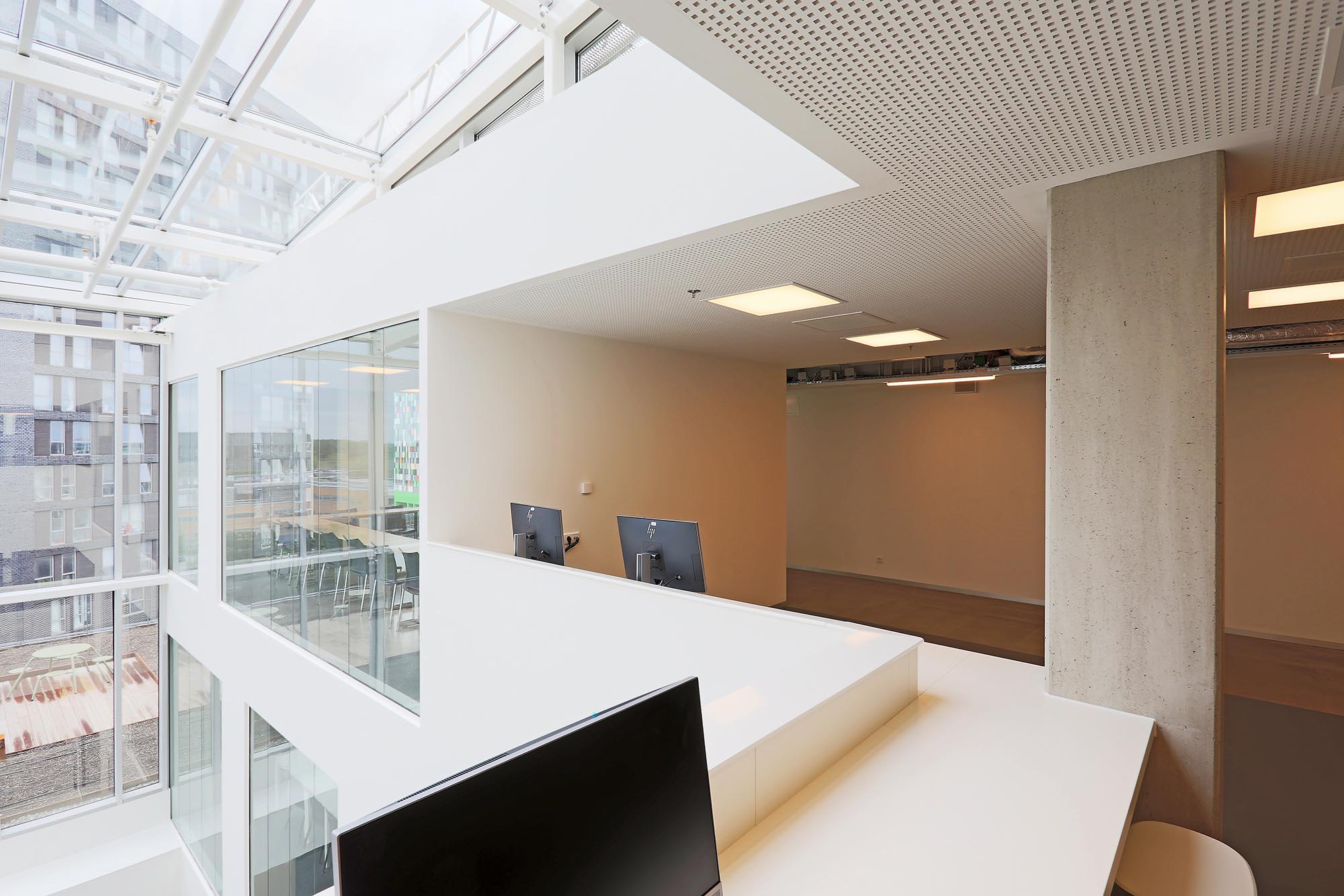 Met meer dan 11.000 studenten en bijna 1000 medewerkers die gebruik maken van de nieuwbouw, stelt dit hoge eisen aan de toe te passen materialen op het gebied van geluidsisolatie en akoestiek. Door de combinatie van geluidsisolerende glazen HGS wanden en geperforeerde akoestische wanden in het atrium en de gangen, is zowel transparantie als een prettig akoestisch klimaat gecreëerd. De concentratiewerkplekken op de gangen zijn maatwerkoplossingen, waarbij de gebruiker ongestoord kan werken in drukke verkeersruimten.