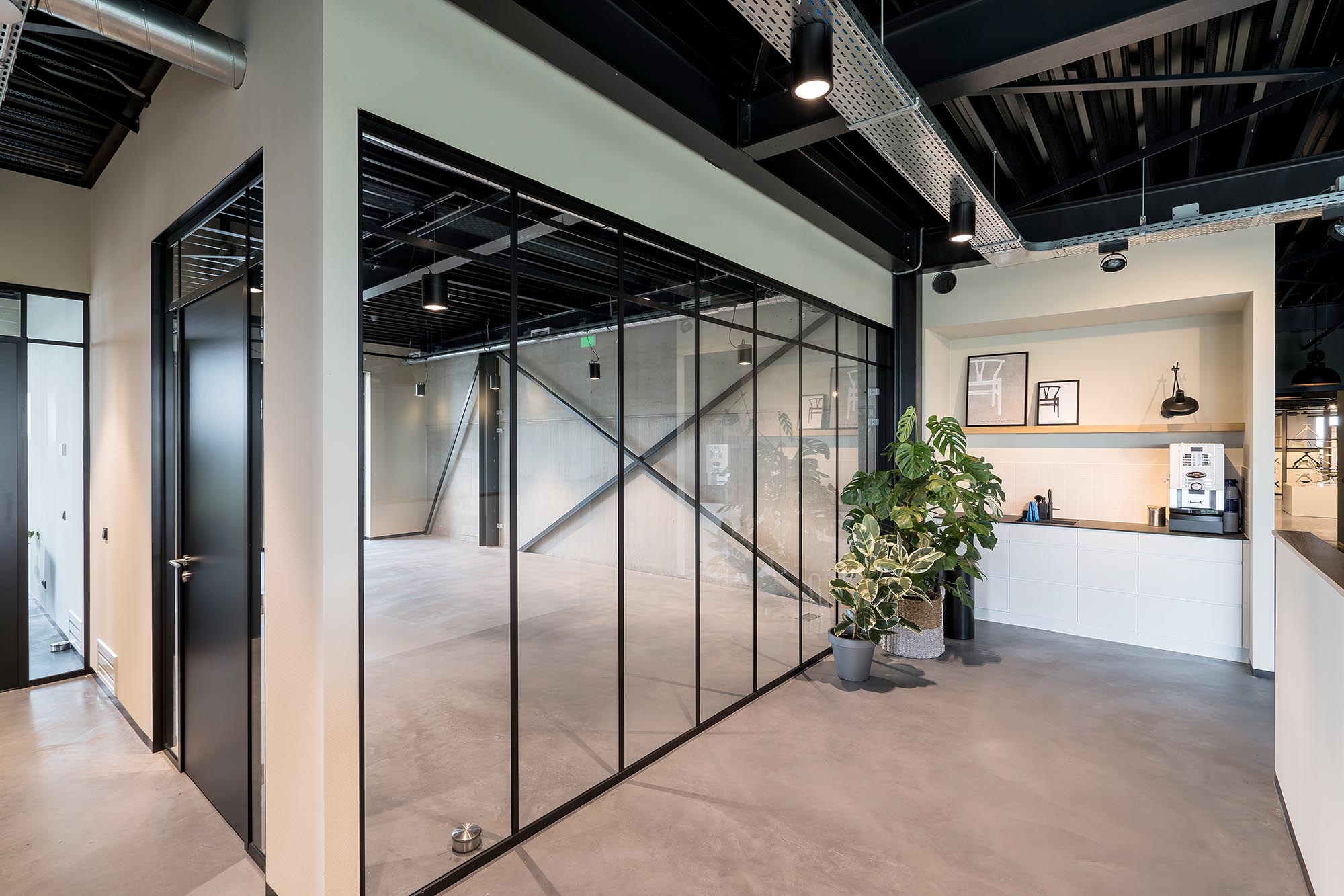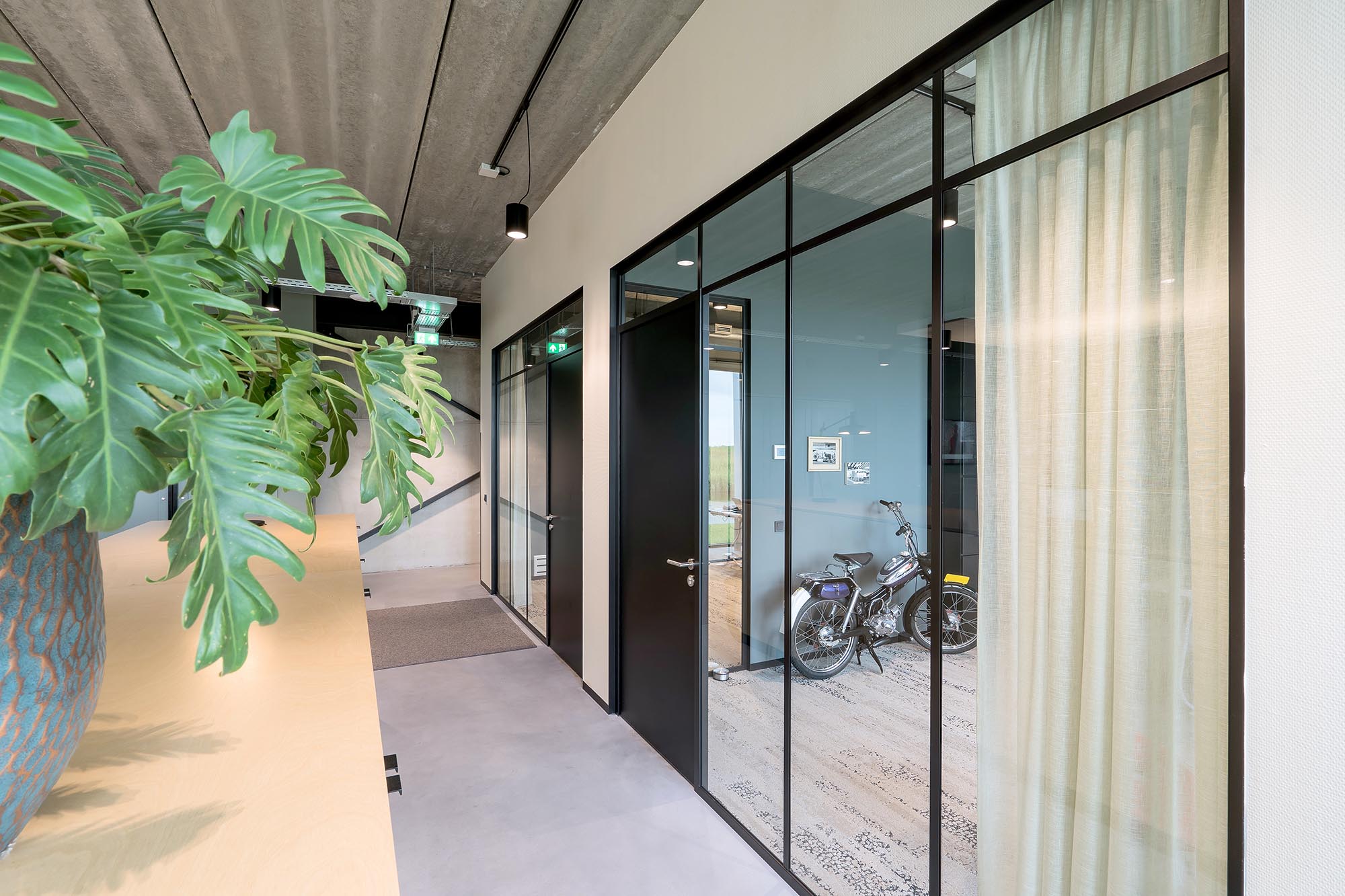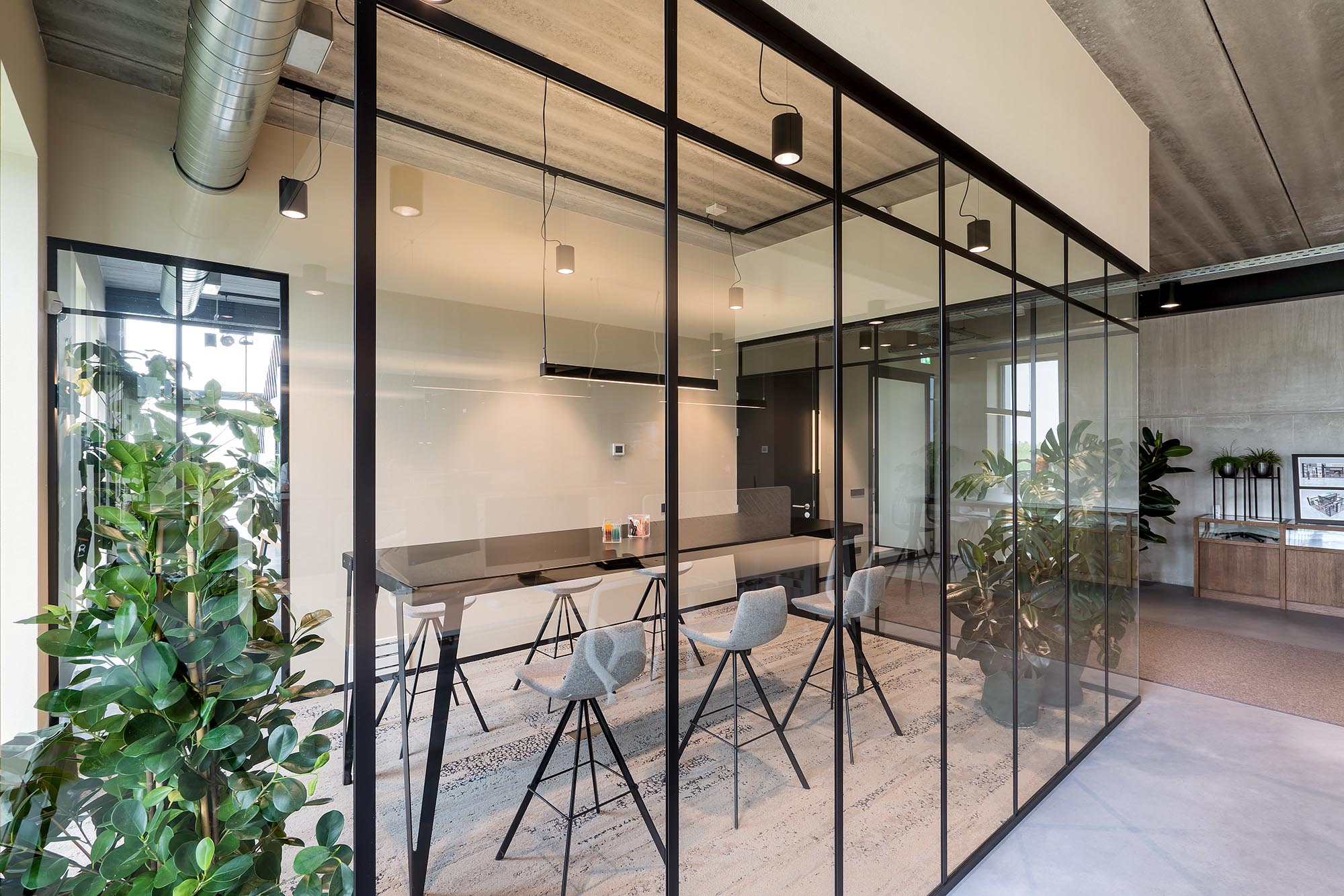 Naar ontwerp van Marjolein Bangma is er een mooie balans gevonden in toegepaste materialen, kleurgebruik en indeling. Er is gekozen voor onze Classic Frame systeemwand om de industriële look van het kantoor te realiseren. De Classic Frame is gebaseerd op het jaren ’20 stoeltjesprofiel. Bij dit kantoor is de Classic Frame ECO variant toegepast.