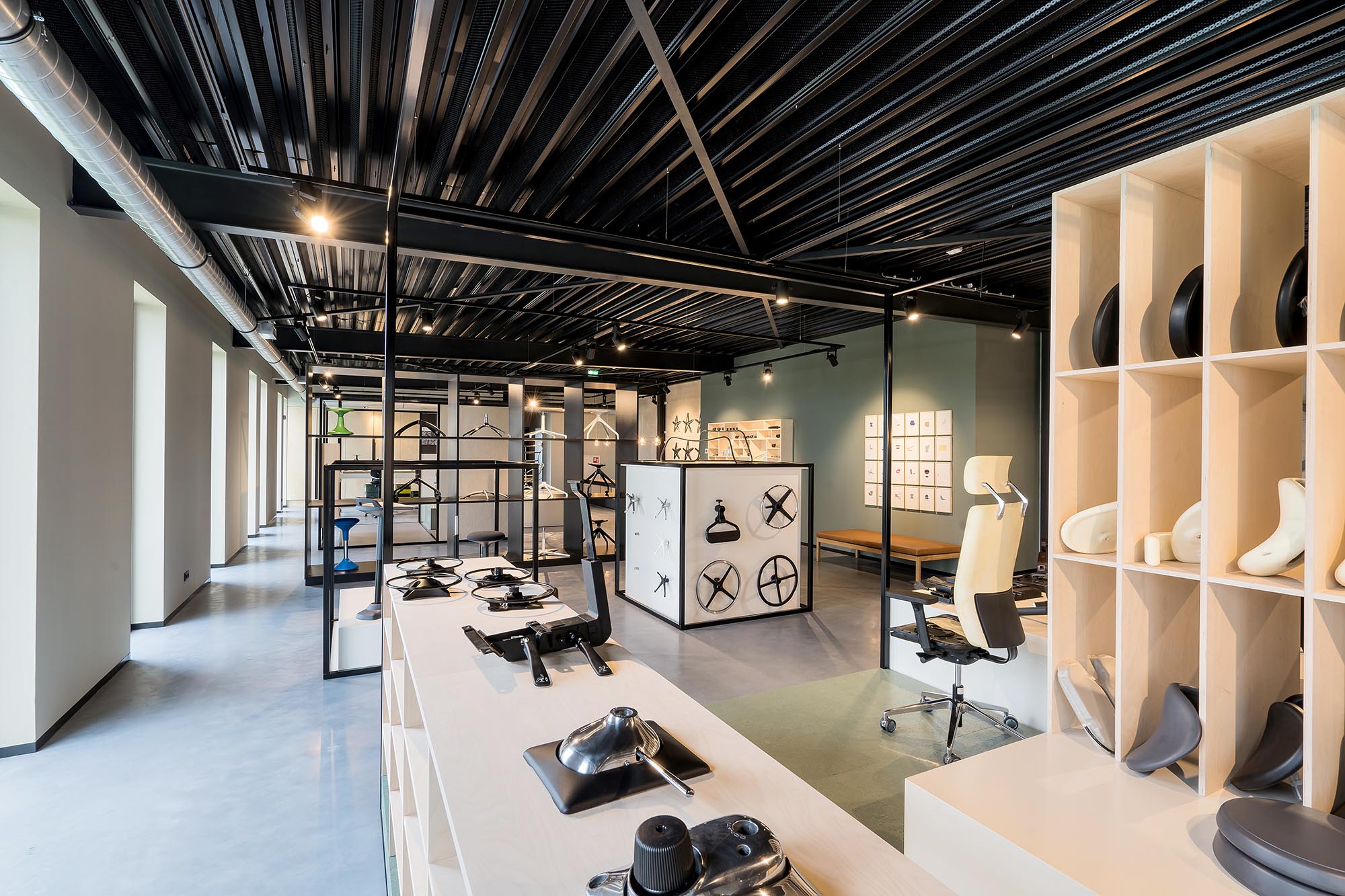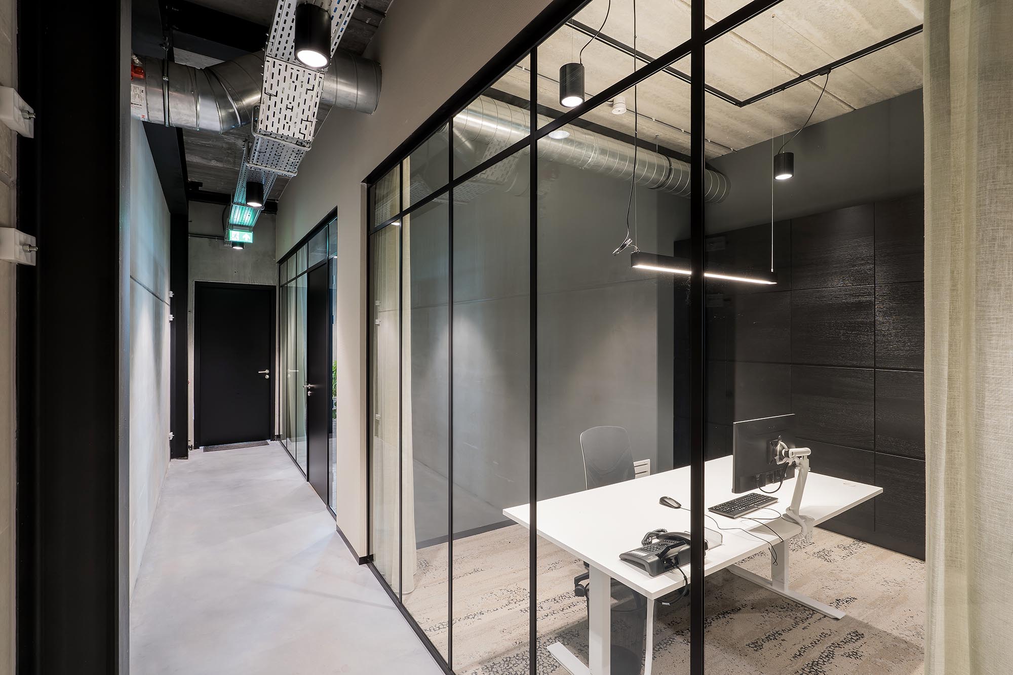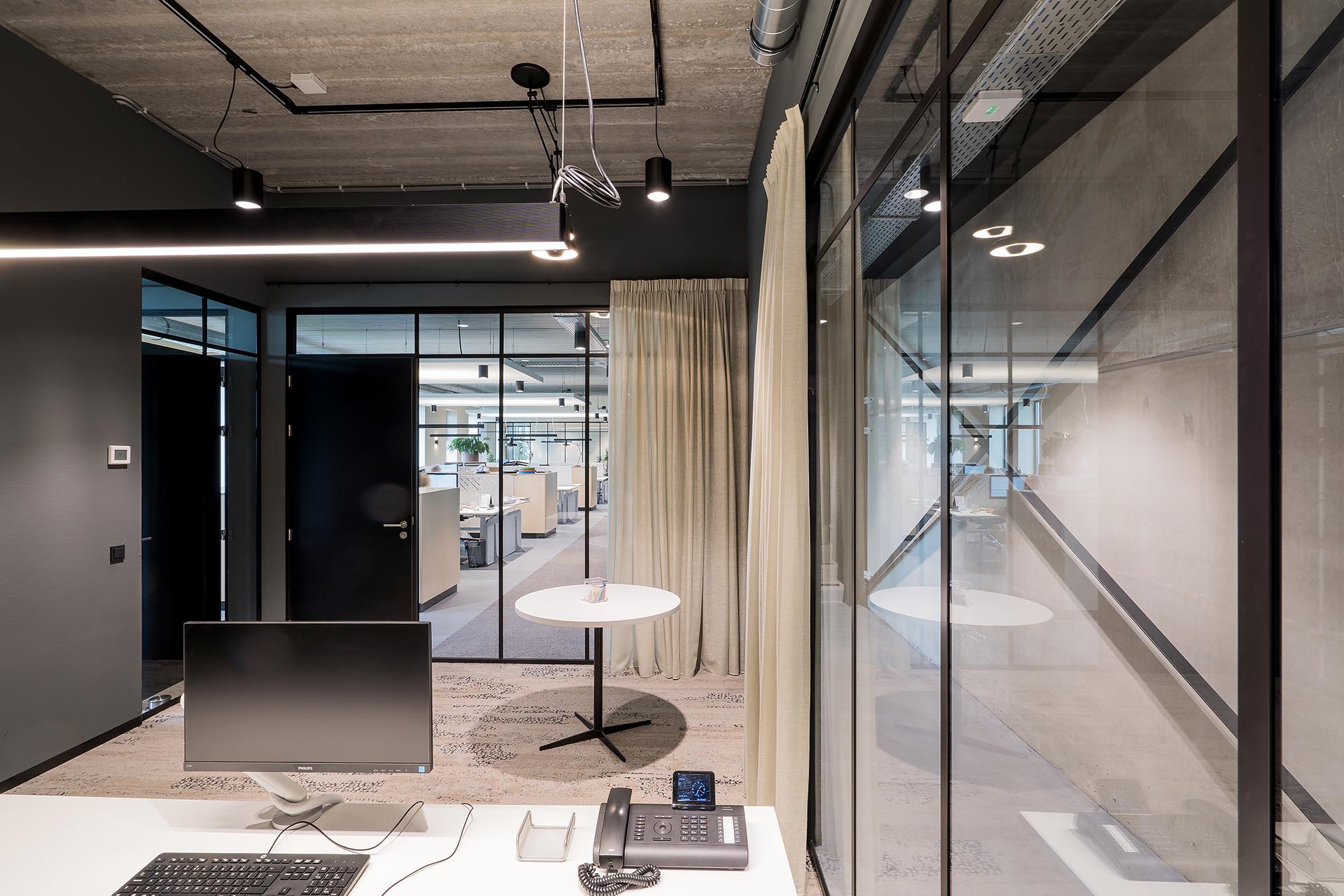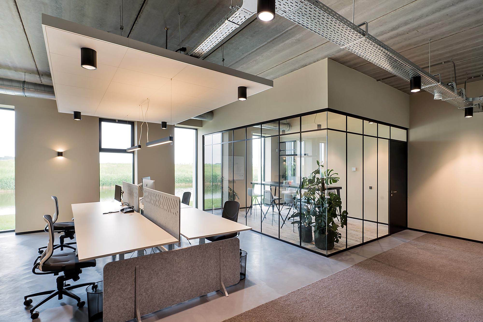 Gietvloer, beton, metaal, glas, allemaal harde materialen die geen geluid absorberen. Het toepassen van akoestische voorzieningen is een belangrijk aspect bij een kantoor met een industriële look. Ter verbetering van de akoestiek in het kantoor zijn plafondeilanden opgehangen boven de werkplekken. Er zijn tapijttegels gelegd in de kantoren en er hangen gordijnen voor de glazen systeemwanden. Zo wordt het aanwezige geluid beter geabsorbeerd.