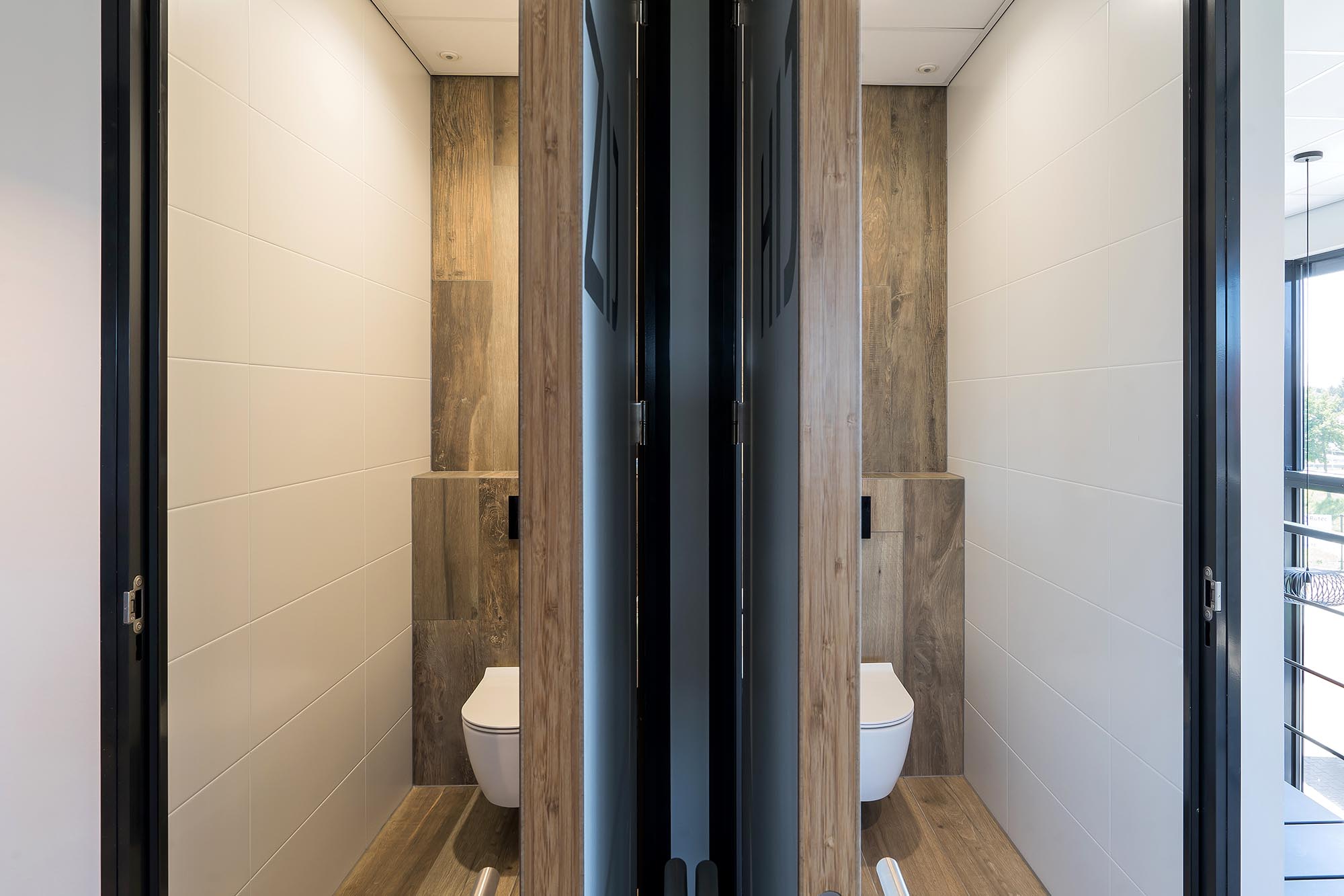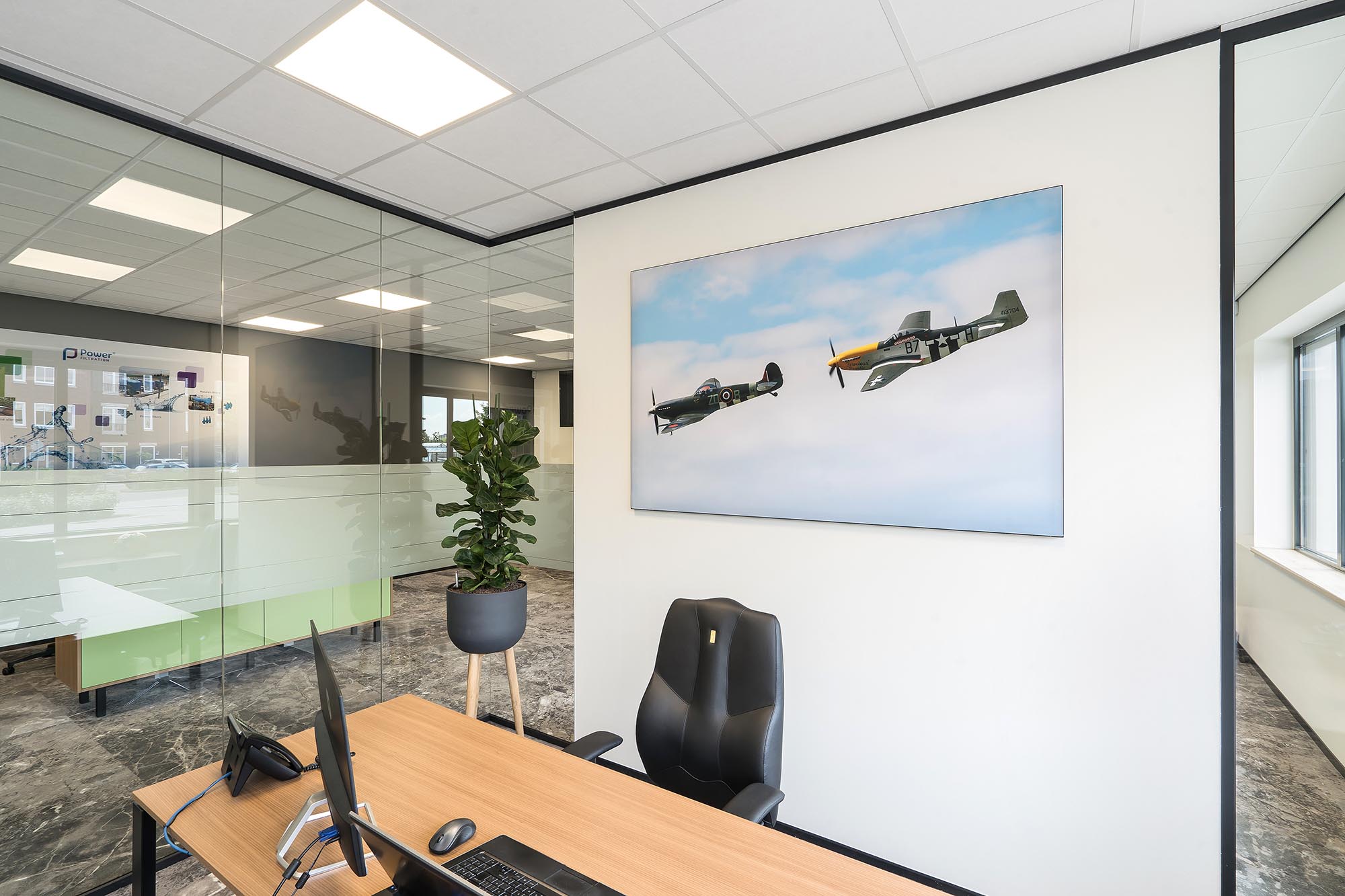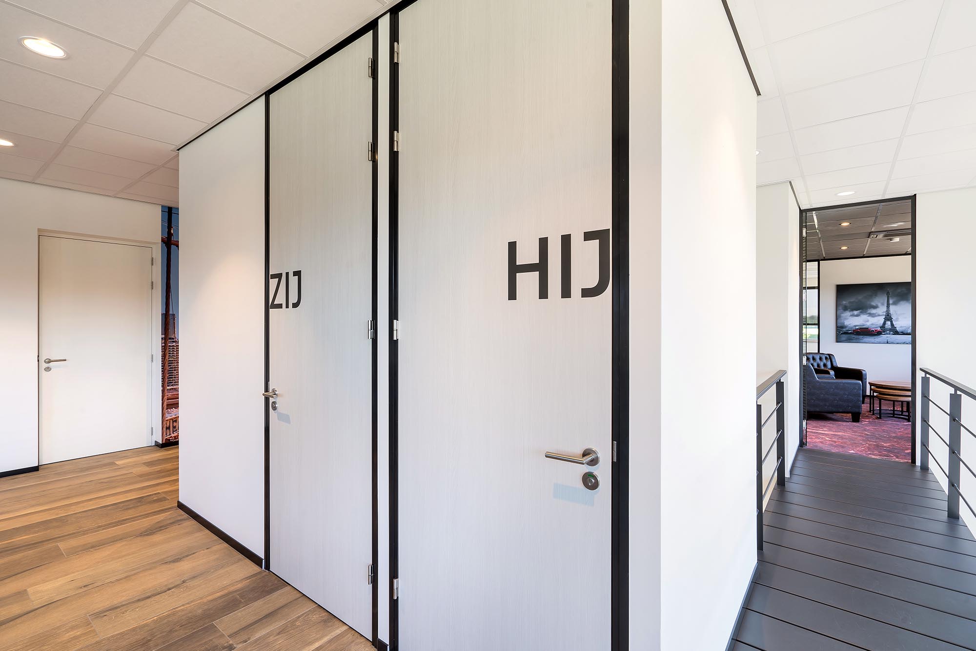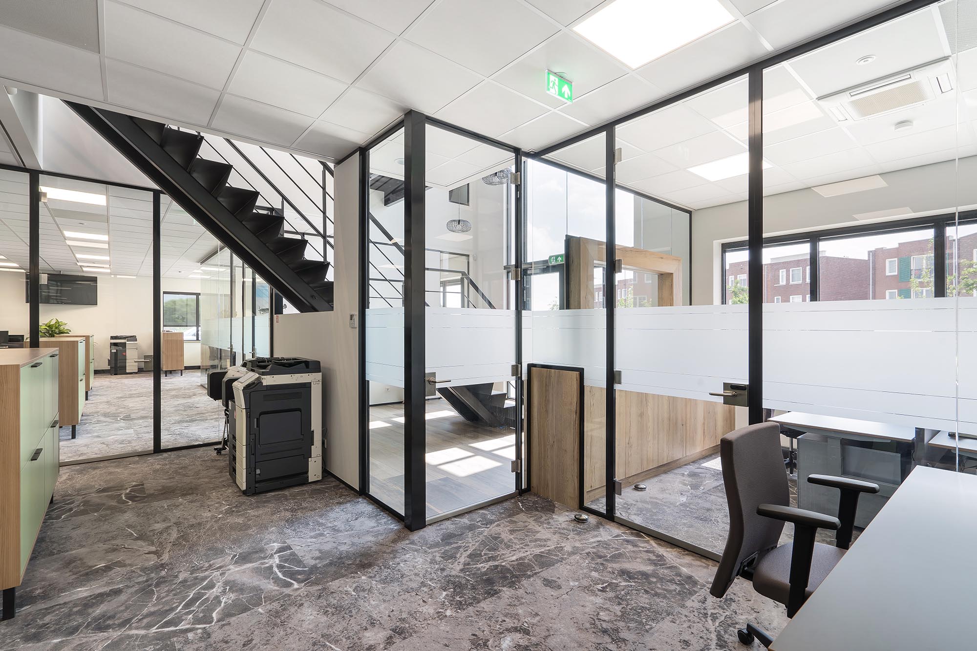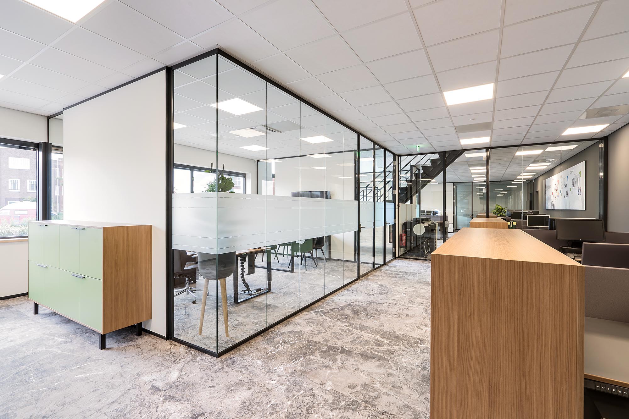 De indeling van het kantoorgedeelte is een mix van gesloten en transparante wanden. Onze Metalstud de Luxe zorgt als gesloten wand voor extra privacy met een geluidsisolatiewaarde van Rw=50dB. Dit wordt vooral toegepast als tussenwand tussen kantoren. Om toch een doorkijk te behouden is ook onze TWIN, een dubbele glazen systeemwand toegepast met dezelfde geluidsisolatiewaarde: Rw=50dB.