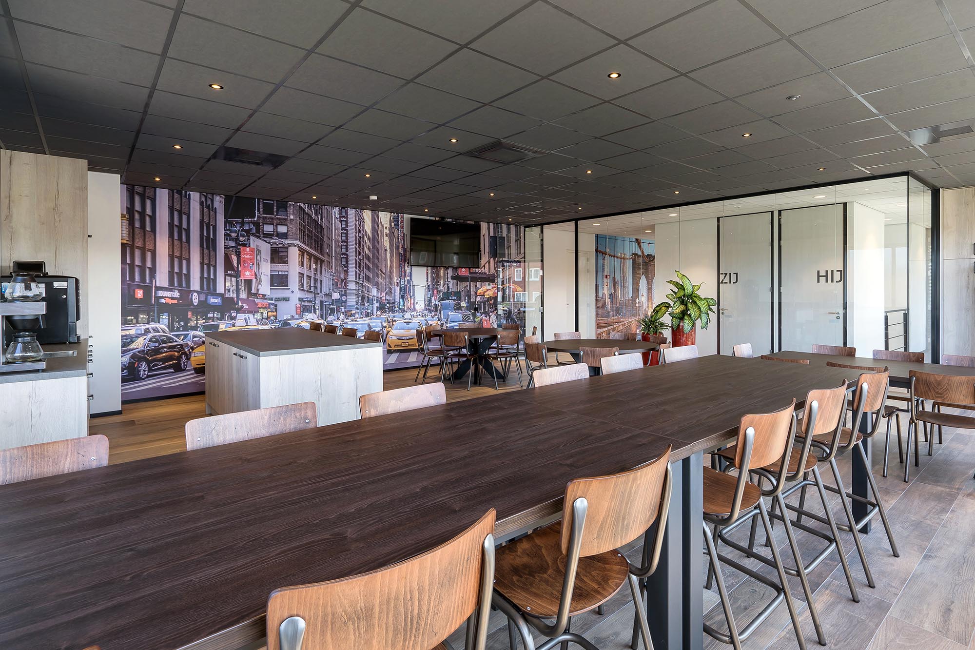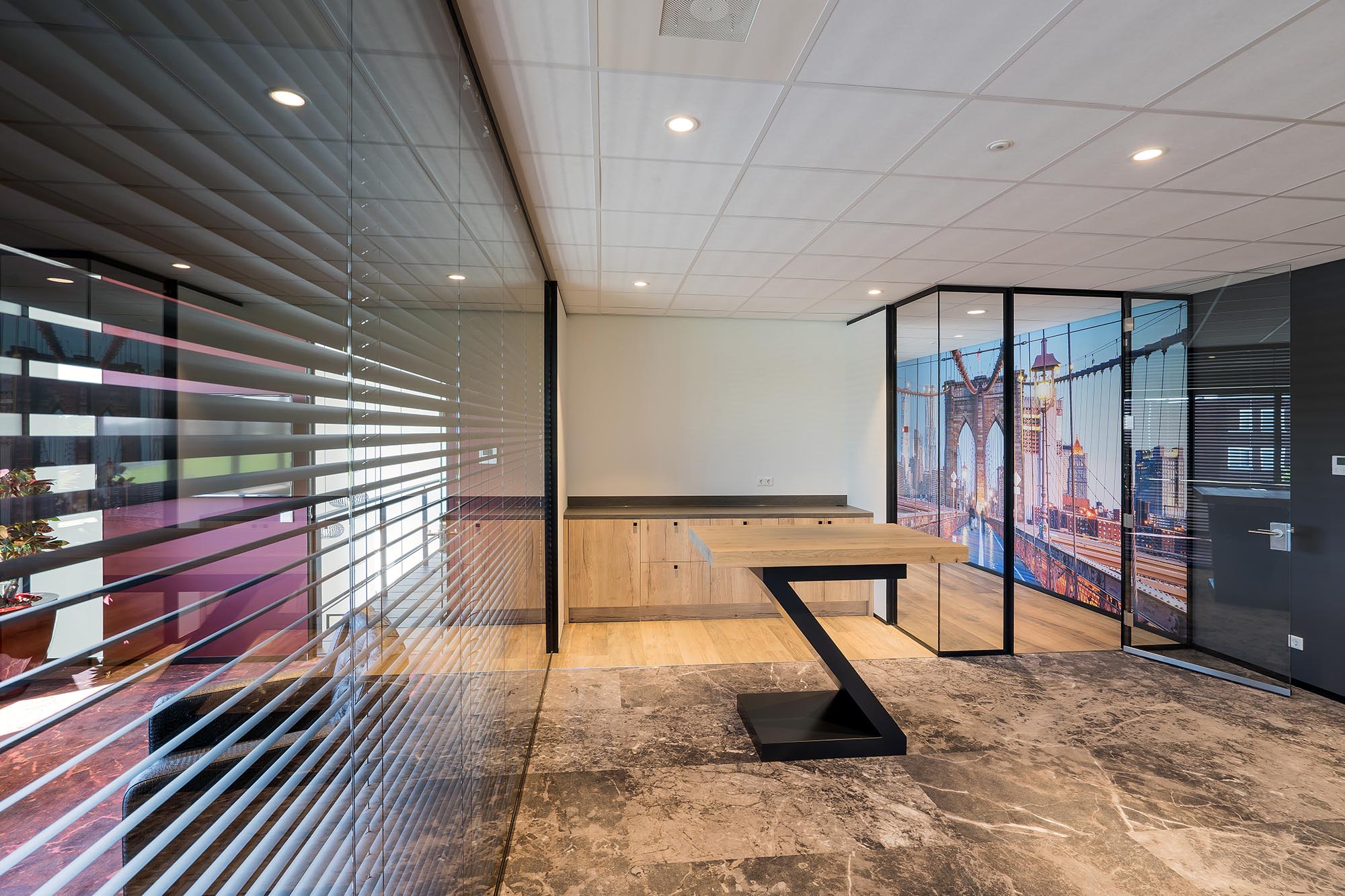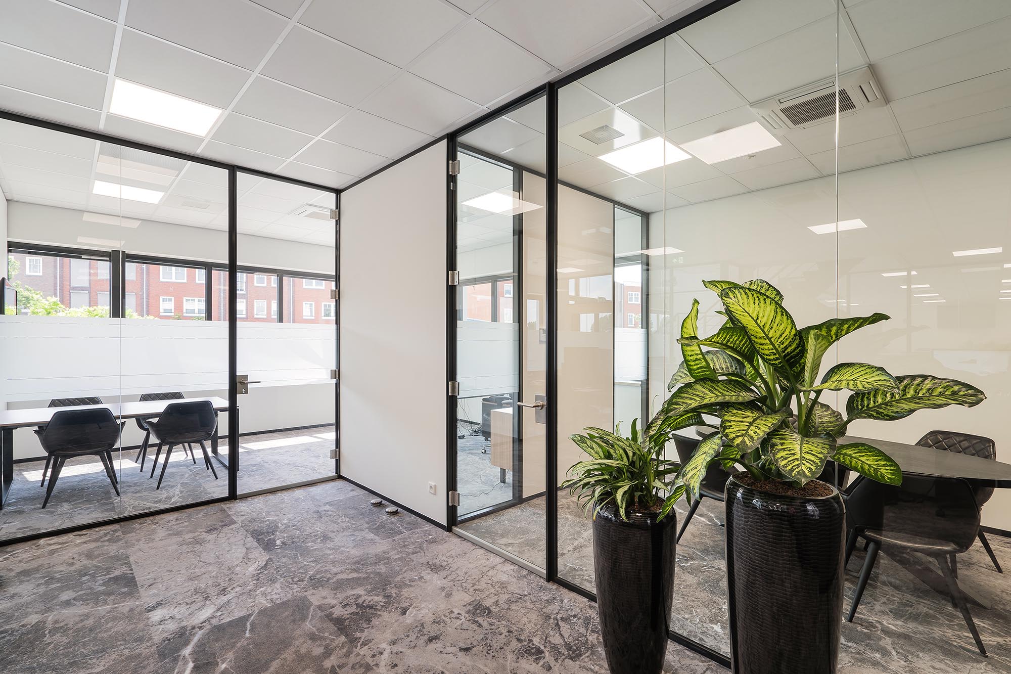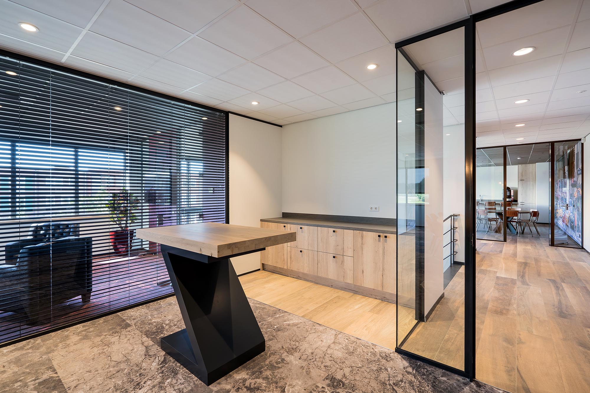 De indeling van het kantoorgedeelte is een mix van gesloten en transparante wanden. Onze Metalstud de Luxe zorgt als gesloten wand voor extra privacy met een geluidsisolatiewaarde van Rw=50dB. Dit wordt vooral toegepast als tussenwand tussen kantoren. Om toch een doorkijk te behouden is ook onze TWIN, een dubbele glazen systeemwand toegepast met dezelfde geluidsisolatiewaarde: Rw=50dB.