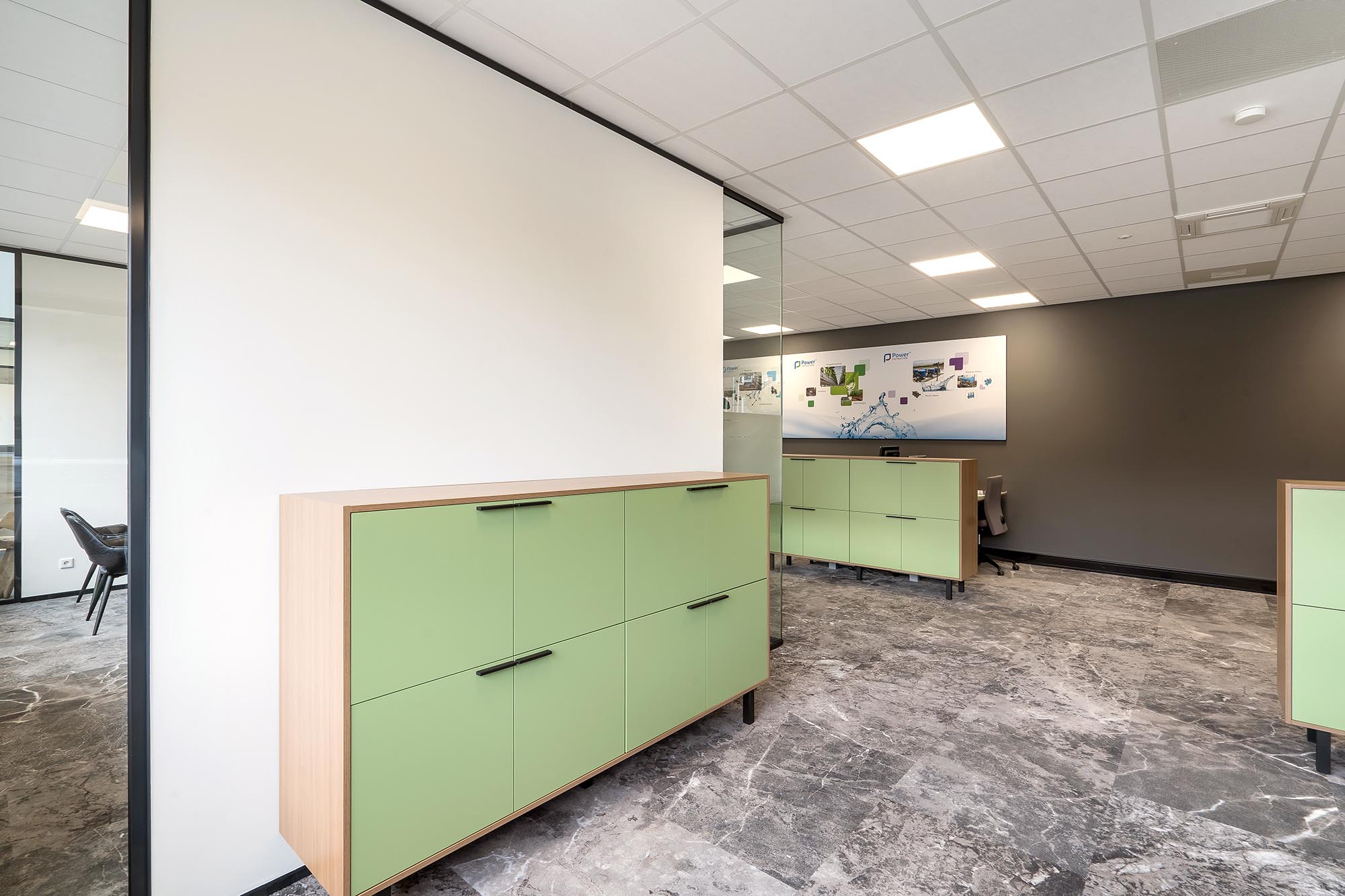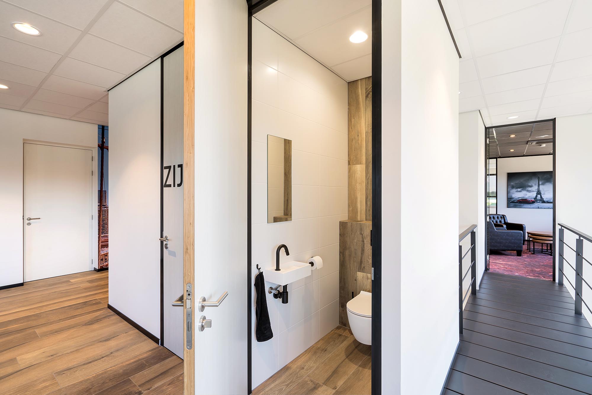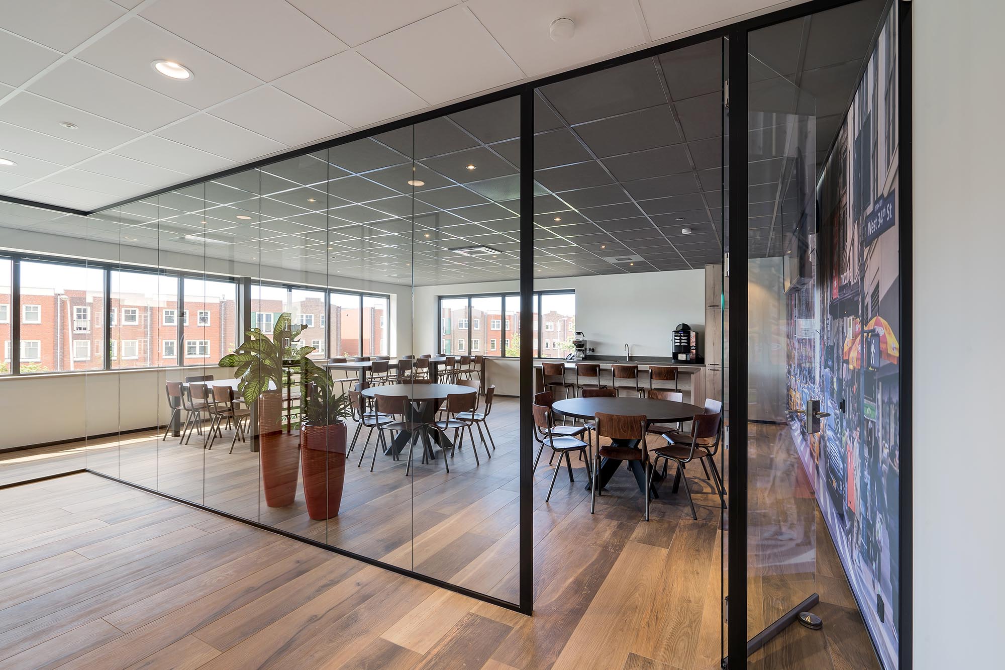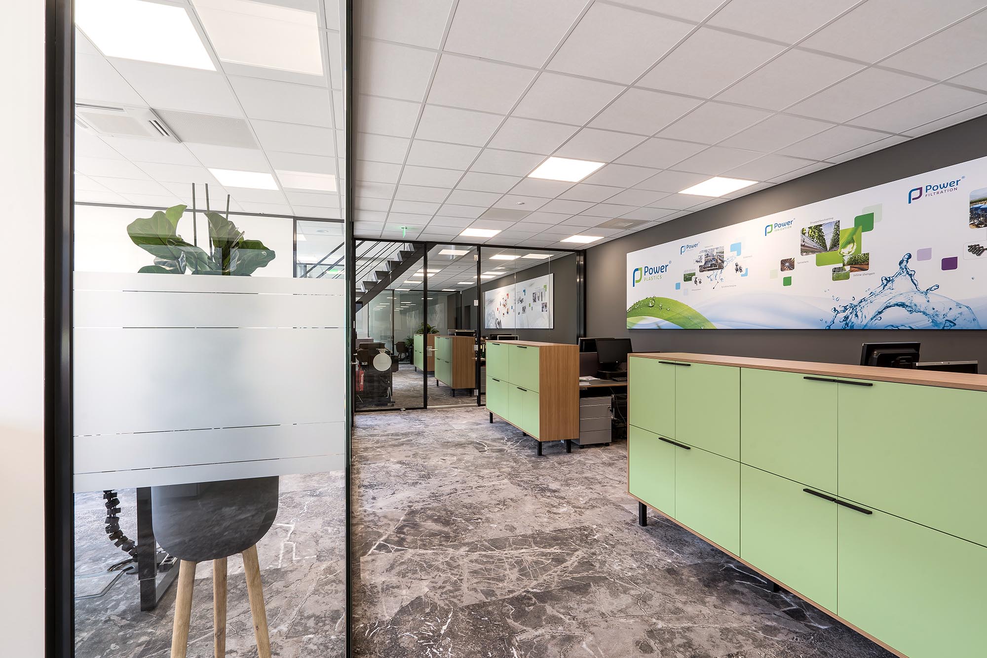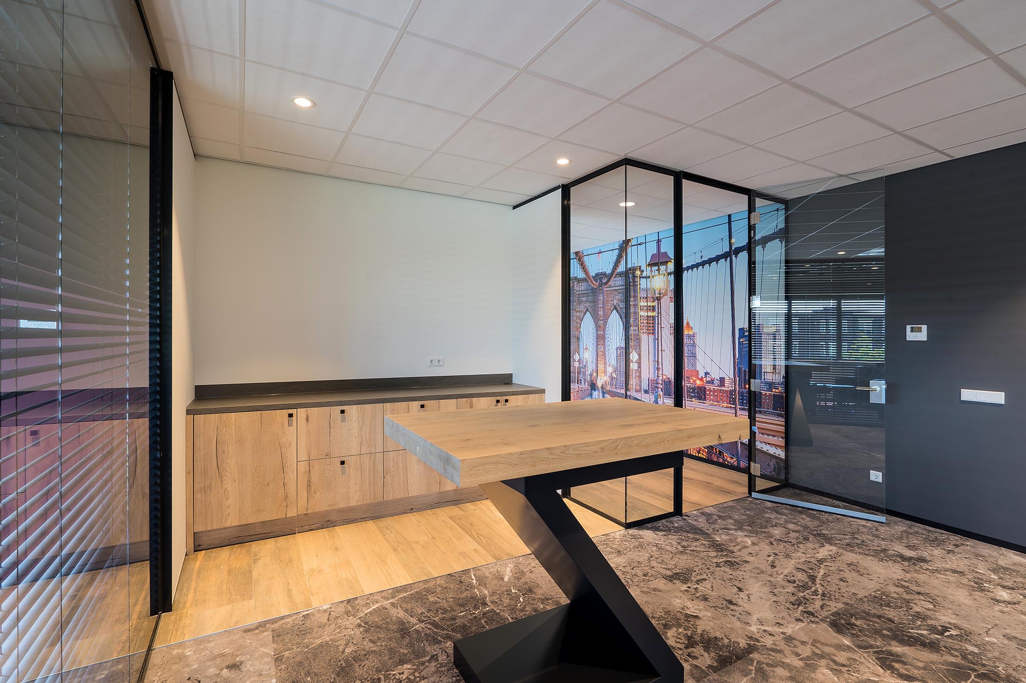 De indeling van het kantoorgedeelte is een mix van gesloten en transparante wanden. Onze Metalstud de Luxe zorgt als gesloten wand voor extra privacy met een geluidsisolatiewaarde van Rw=50dB. Dit wordt vooral toegepast als tussenwand tussen kantoren. Om toch een doorkijk te behouden is ook onze TWIN, een dubbele glazen systeemwand toegepast met dezelfde geluidsisolatiewaarde: Rw=50dB.