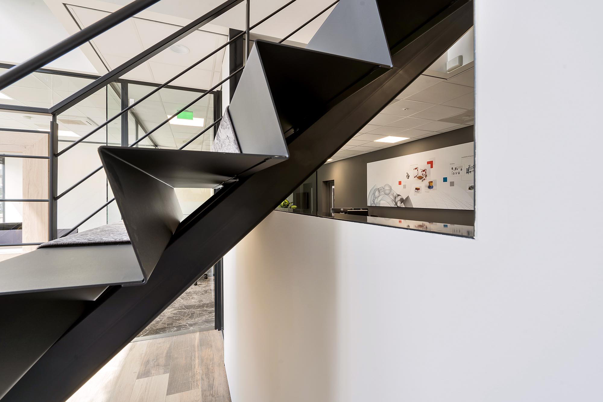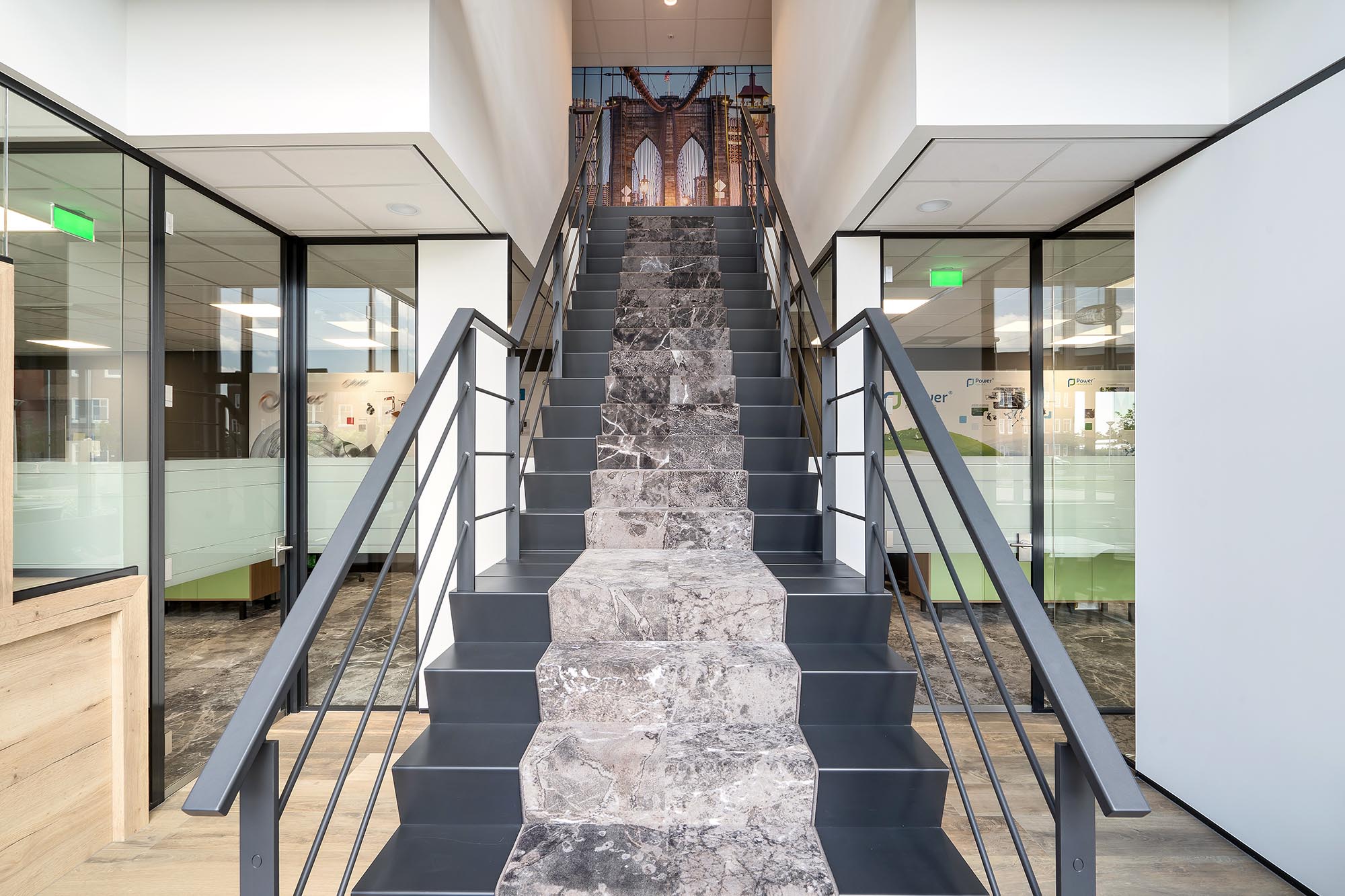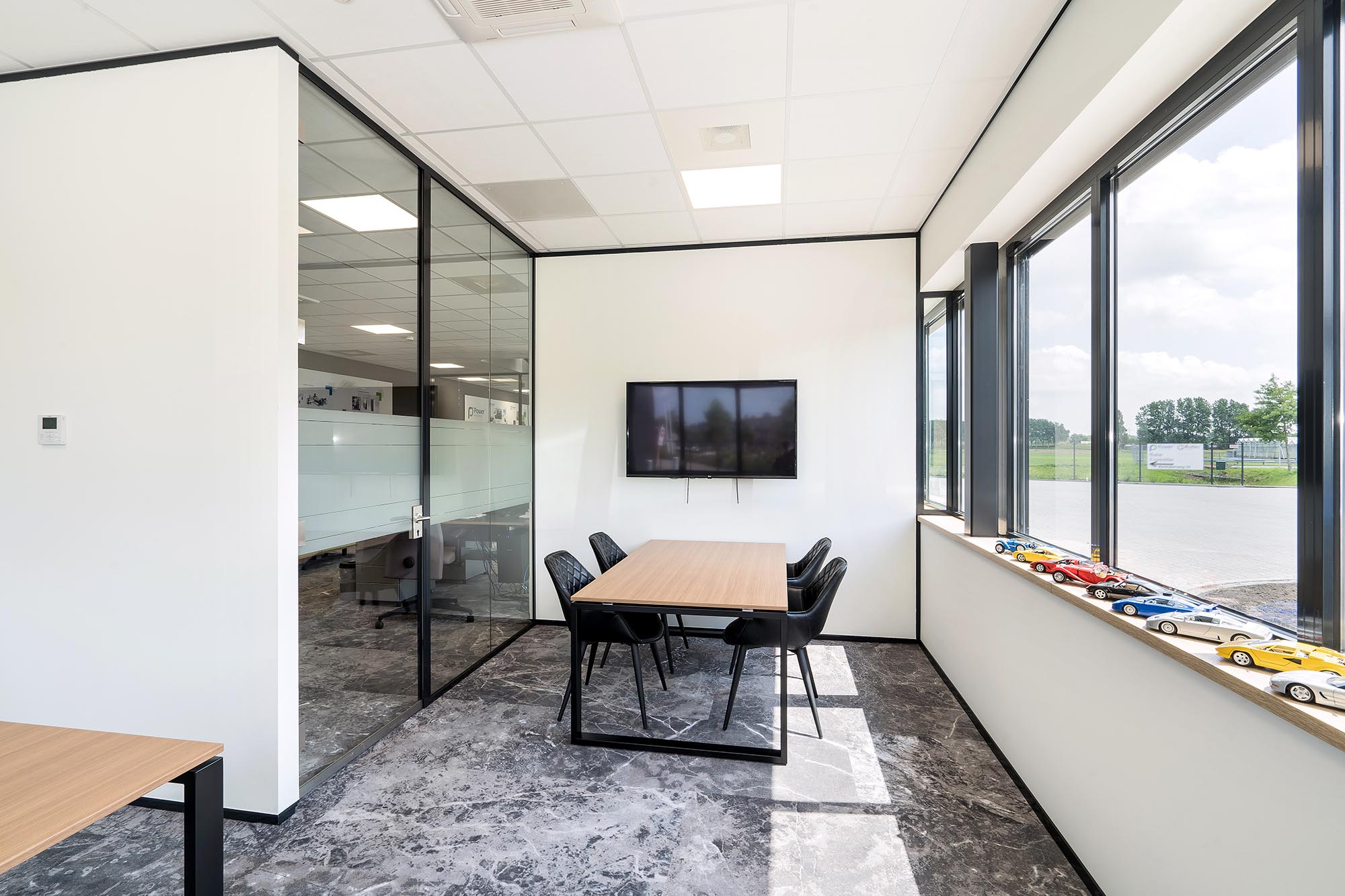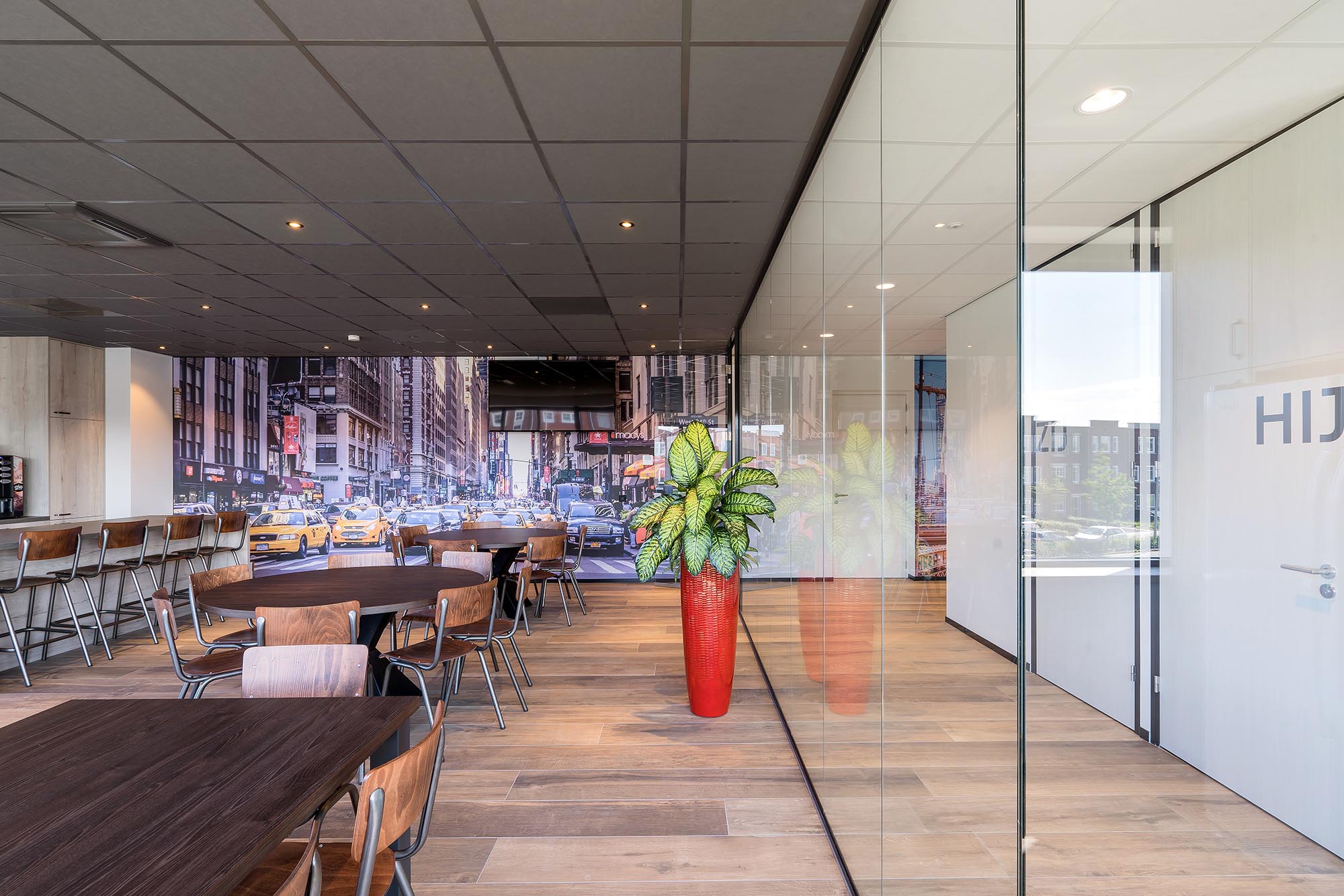 De indeling van het kantoorgedeelte is een mix van gesloten en transparante wanden. Onze Metalstud de Luxe zorgt als gesloten wand voor extra privacy met een geluidsisolatiewaarde van Rw=50dB. Dit wordt vooral toegepast als tussenwand tussen kantoren. Om toch een doorkijk te behouden is ook onze TWIN, een dubbele glazen systeemwand toegepast met dezelfde geluidsisolatiewaarde: Rw=50dB.