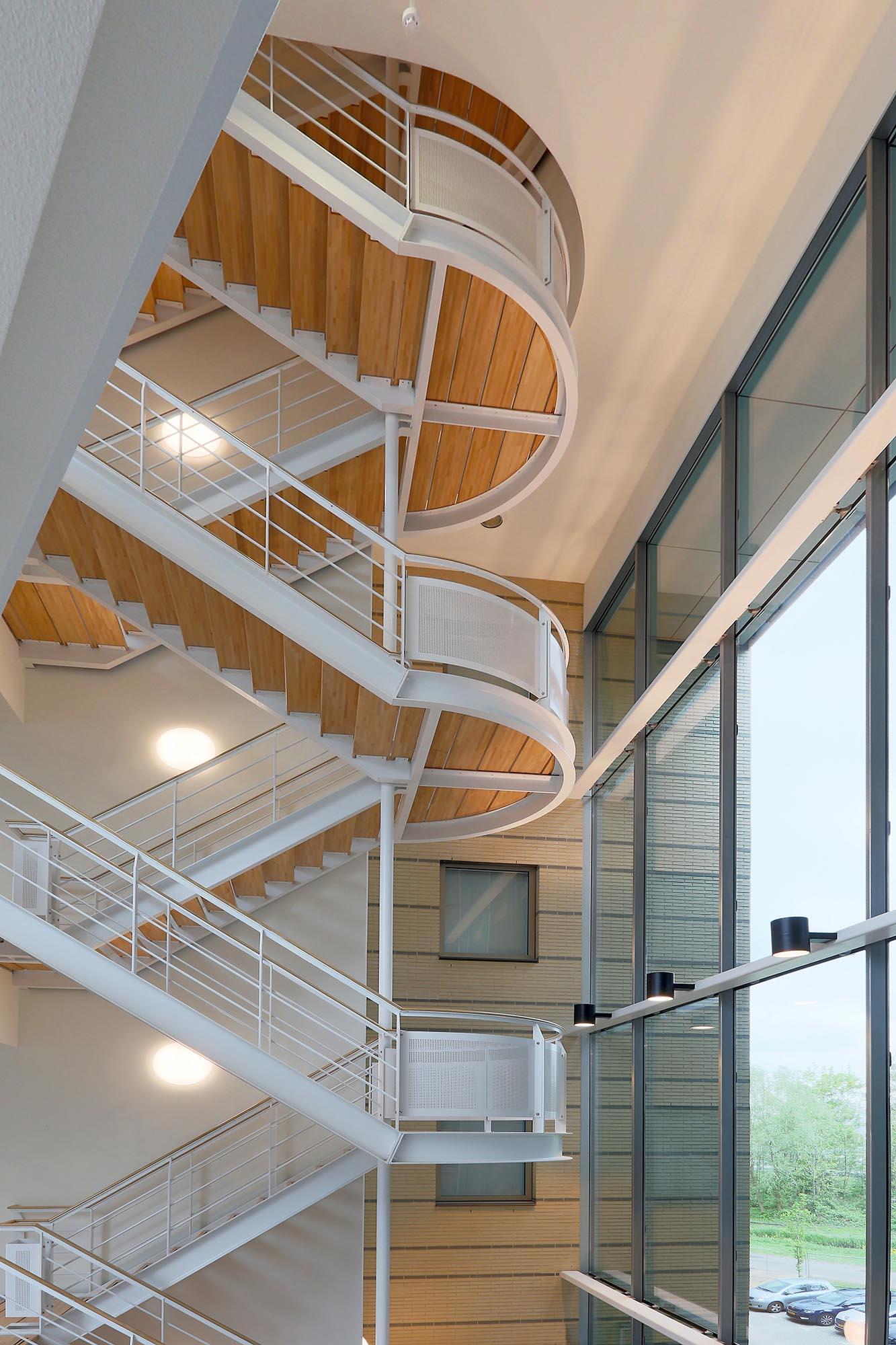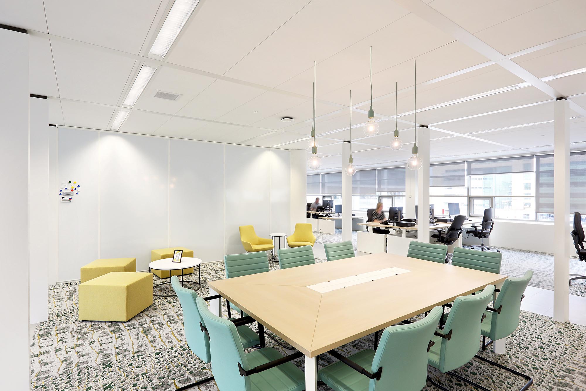 De plafonds met reeds aanwezige API bandrasters in de kantoorvleugels zijn aangepast en voorzien van akoestische plafondpanelen type OWA Sinfonia 600×1800. Dit plafondsysteem met egaal witte panelen, heeft een hoge geluidsabsorptie en goede lichtreflectie. Het royale tegelformaat zorgt voor een rustig beeld.