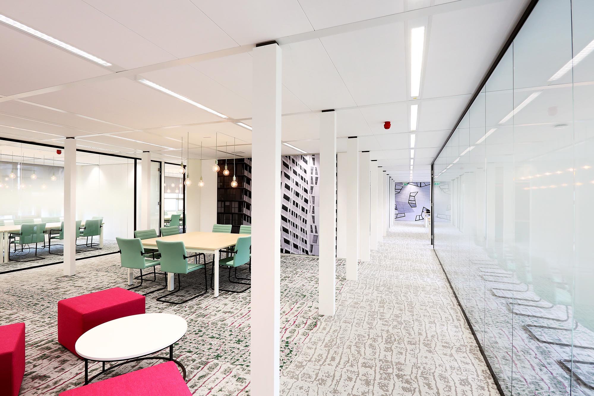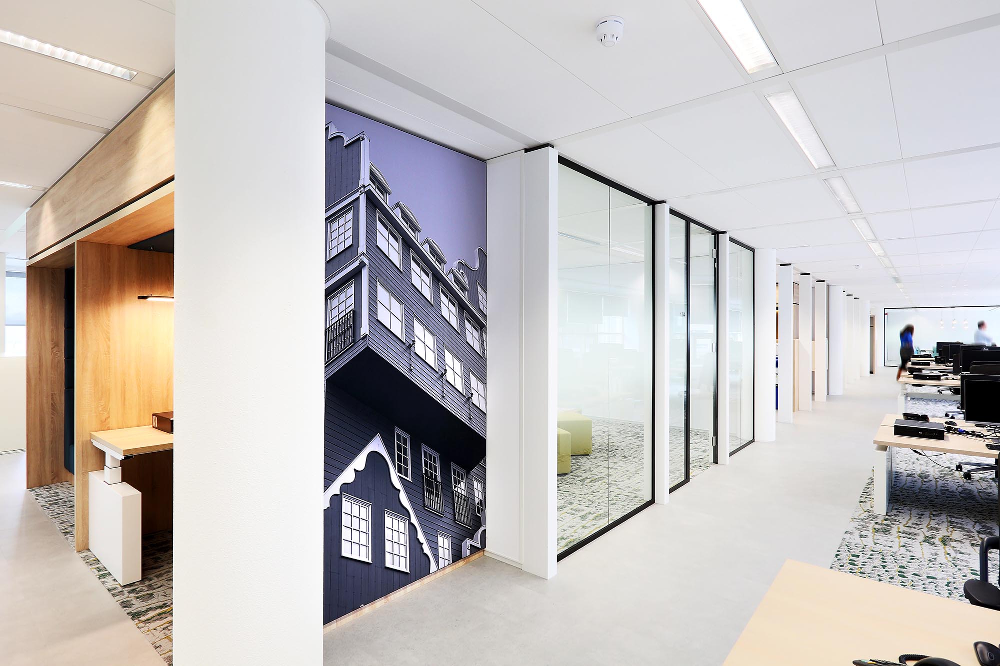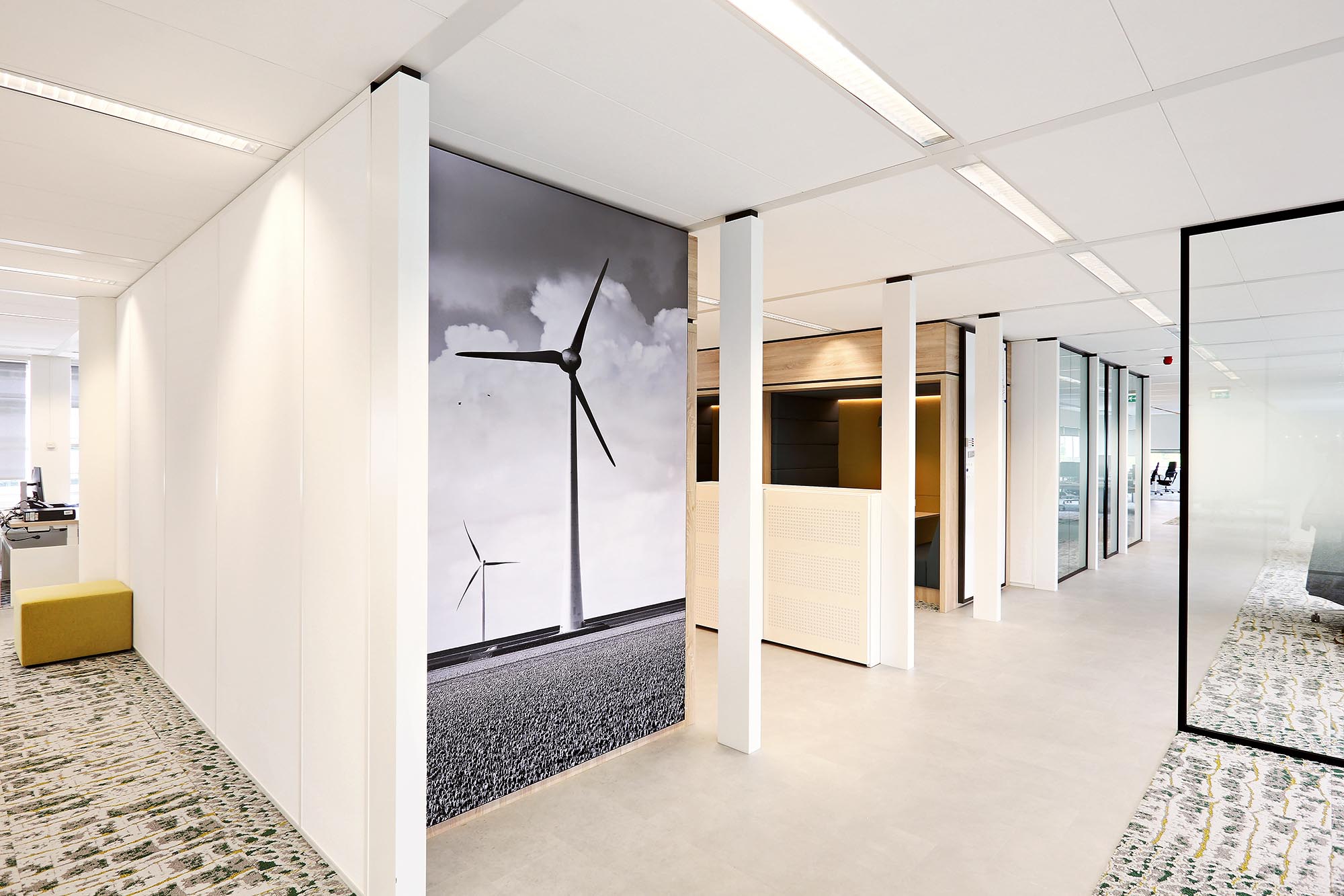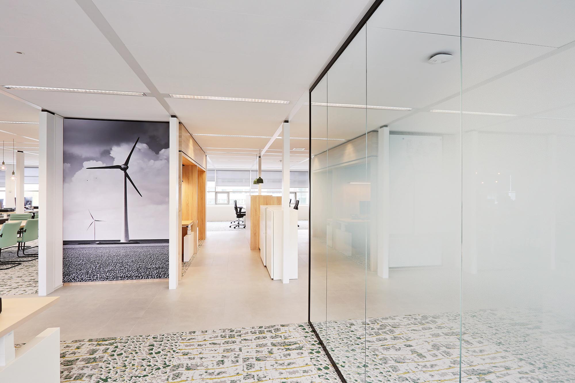 De kantoor-scheidende wanden zijn uitgevoerd als TC, grotendeels afgewerkt met whiteboard elementen. In het oog springend zijn de ruimtehoge visuals, die zorgen voor een warm accent. De vergaderruimten op de begane grond zijn eenvoudig flexibel in te delen door toepassing van Nüsing NewEco mobiele paneelwanden. Een optimaal gebruik van de beschikbare m².