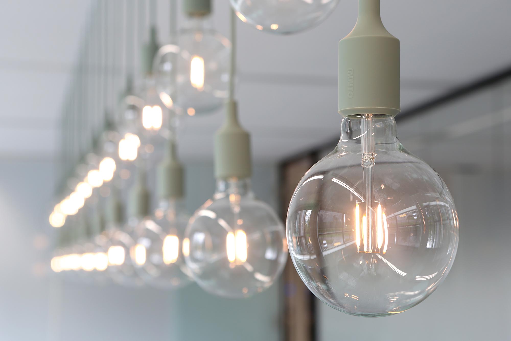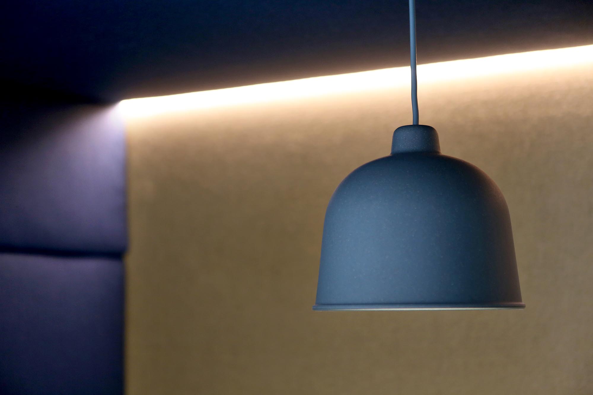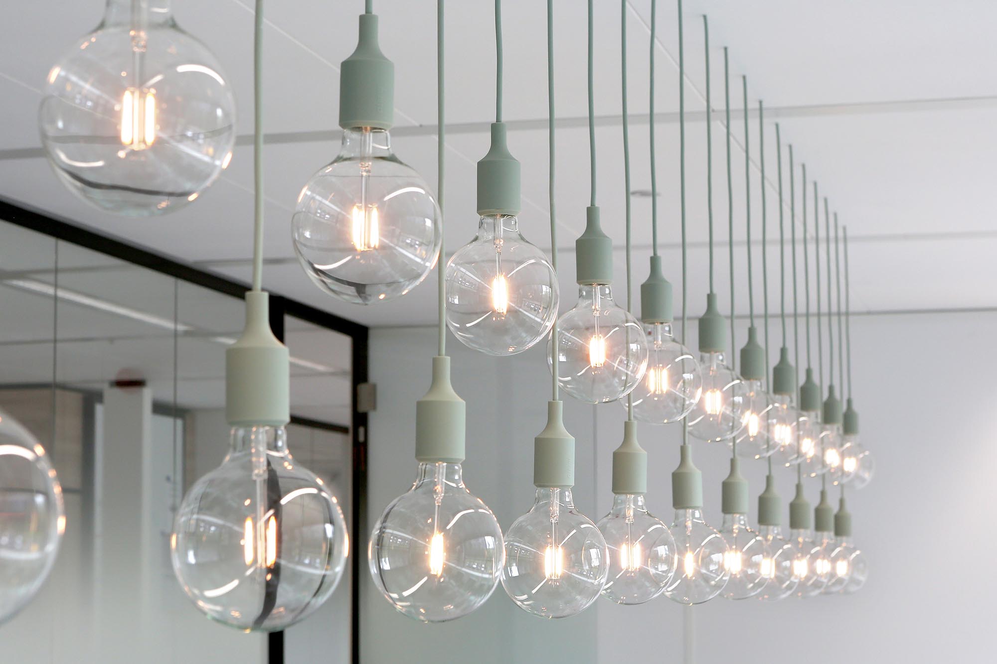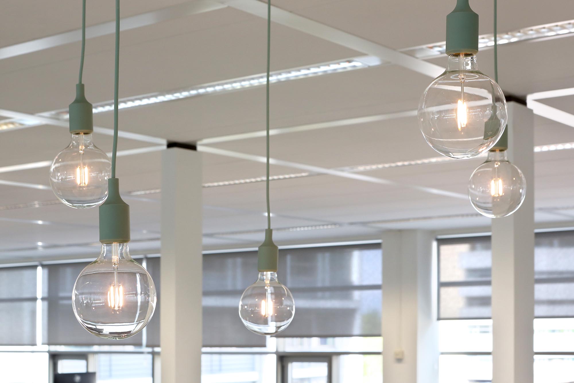 De verlichting is aangepast aan de activiteiten welke in de betreffende ruimte plaatsvinden. Boven bartafels en in treincoupe’s/treinzits is Muuto pendantverlichting type Grain (met kap) toegepast, terwijl boven de vergadertafels Muuto pendantarmaturen type E27 (bol) zijn gebruikt. Voor de concentratiewerkplekken is gekozen voor SLV type Glenos pendelarmaturen. Zo is in iedere ruimte een prettig klimaat gegarandeerd, dat bijdraagt aan de productiviteit.