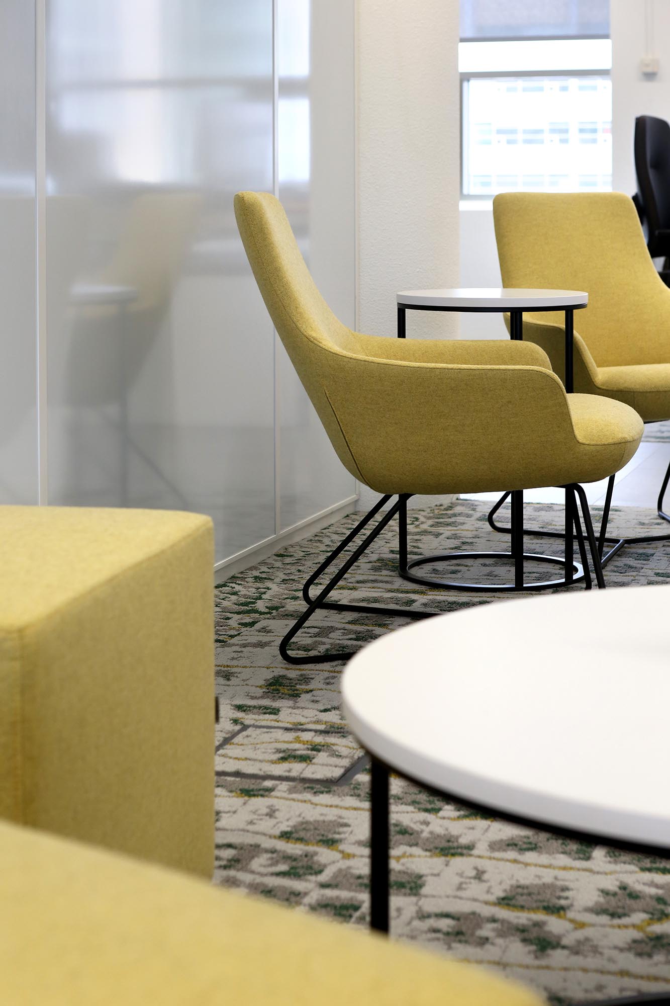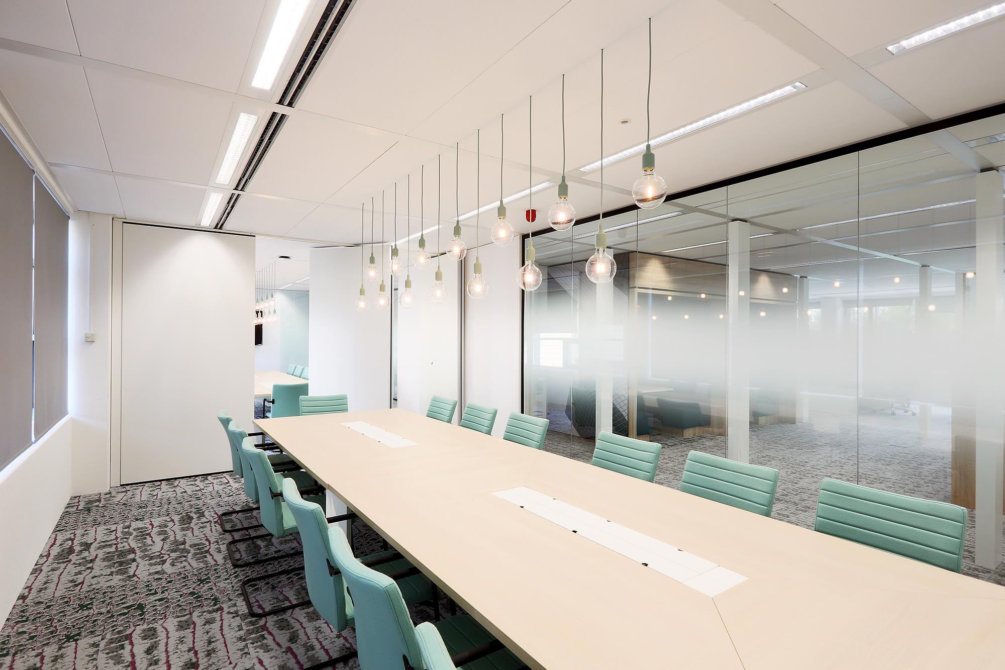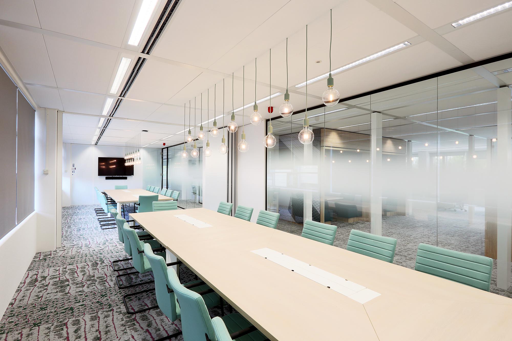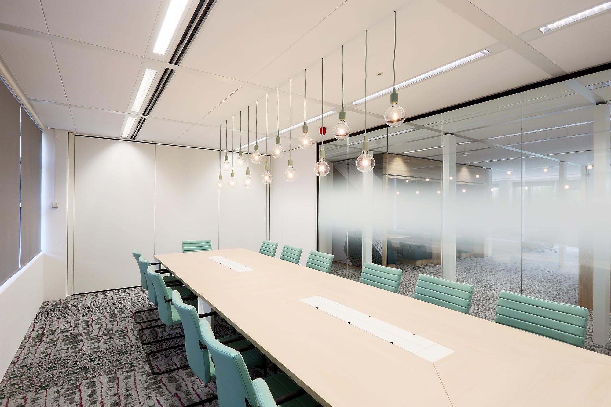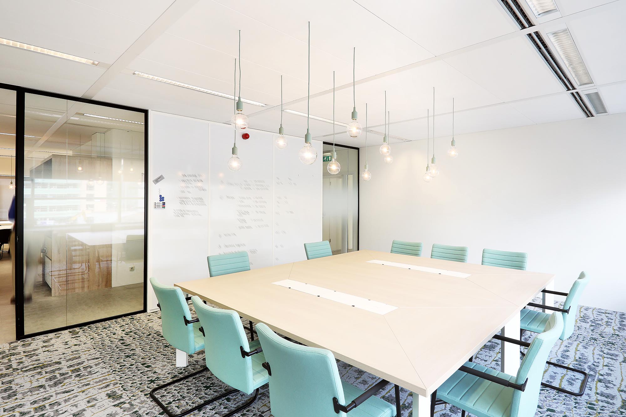 De verlichting is aangepast aan de activiteiten welke in de betreffende ruimte plaatsvinden. Boven bartafels en in treincoupe’s/treinzits is Muuto pendantverlichting type Grain (met kap) toegepast, terwijl boven de vergadertafels Muuto pendantarmaturen type E27 (bol) zijn gebruikt. Voor de concentratiewerkplekken is gekozen voor SLV type Glenos pendelarmaturen. Zo is in iedere ruimte een prettig klimaat gegarandeerd, dat bijdraagt aan de productiviteit.