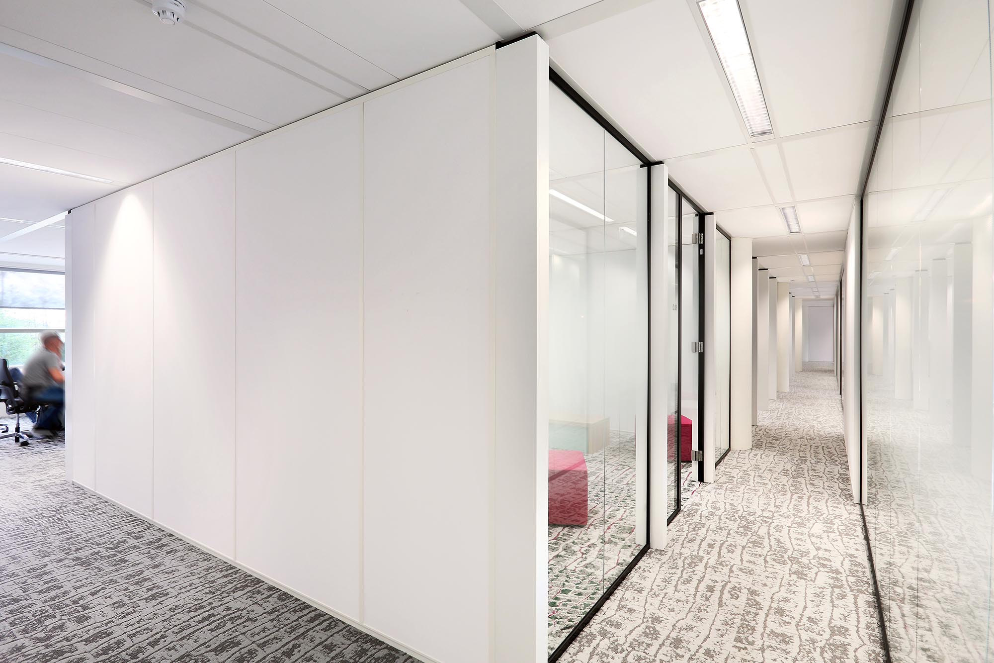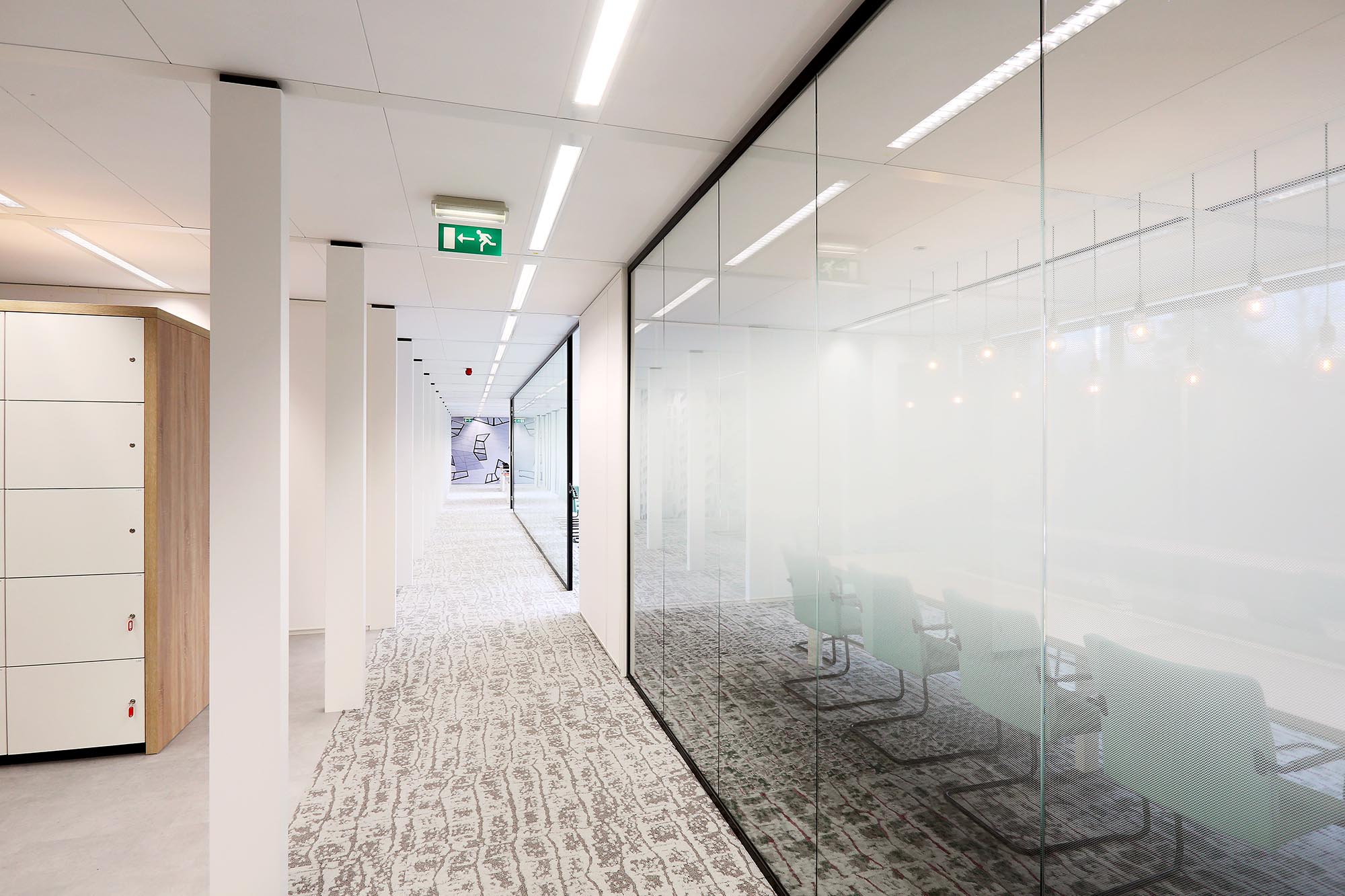 Voor de gangwanden is gekozen voor onze minimalistische HGS glaswanden, waardoor een grote transparantie is verkregen zonder concessies te doen aan geluidsisolatie. De deuren zijn uitgevoerd als volglazen, wandhoge deuren, die bijdragen aan de openheid van het ontwerp. Om visuele privacy te garanderen is een matte folie in patroon toegepast.