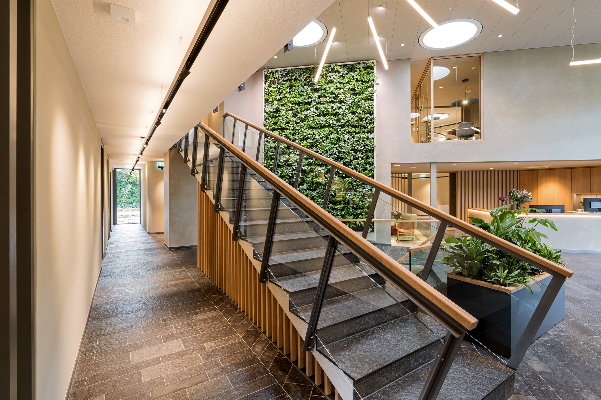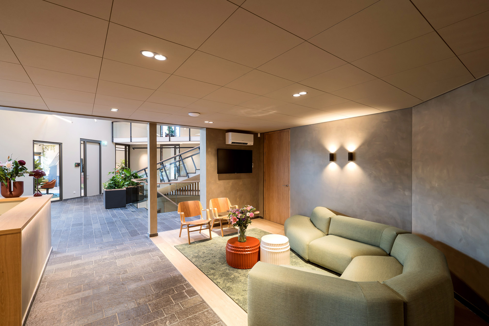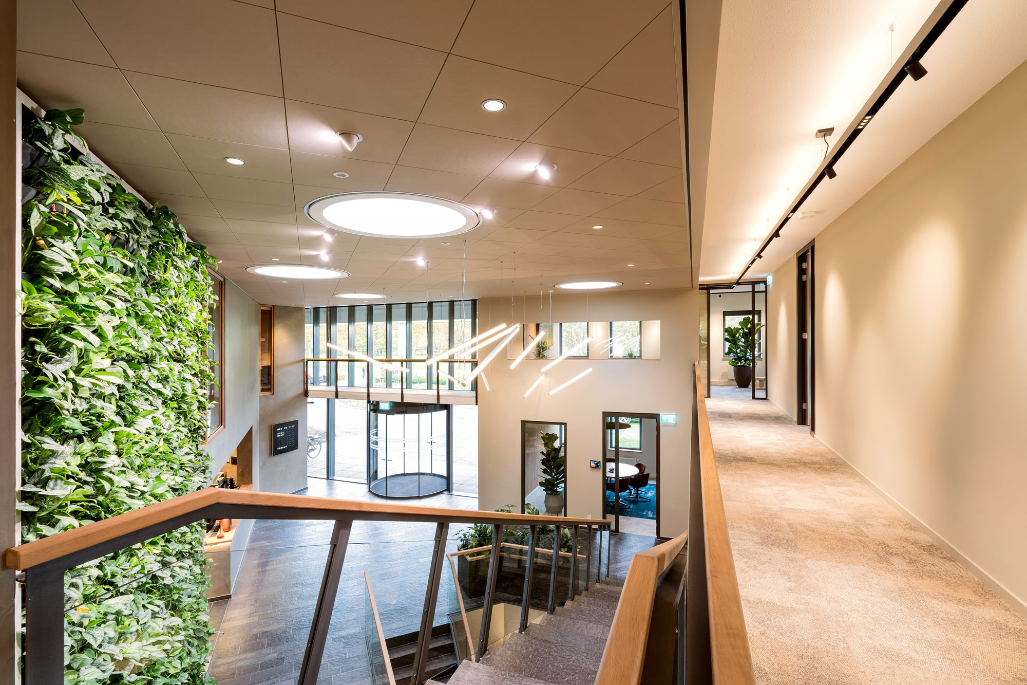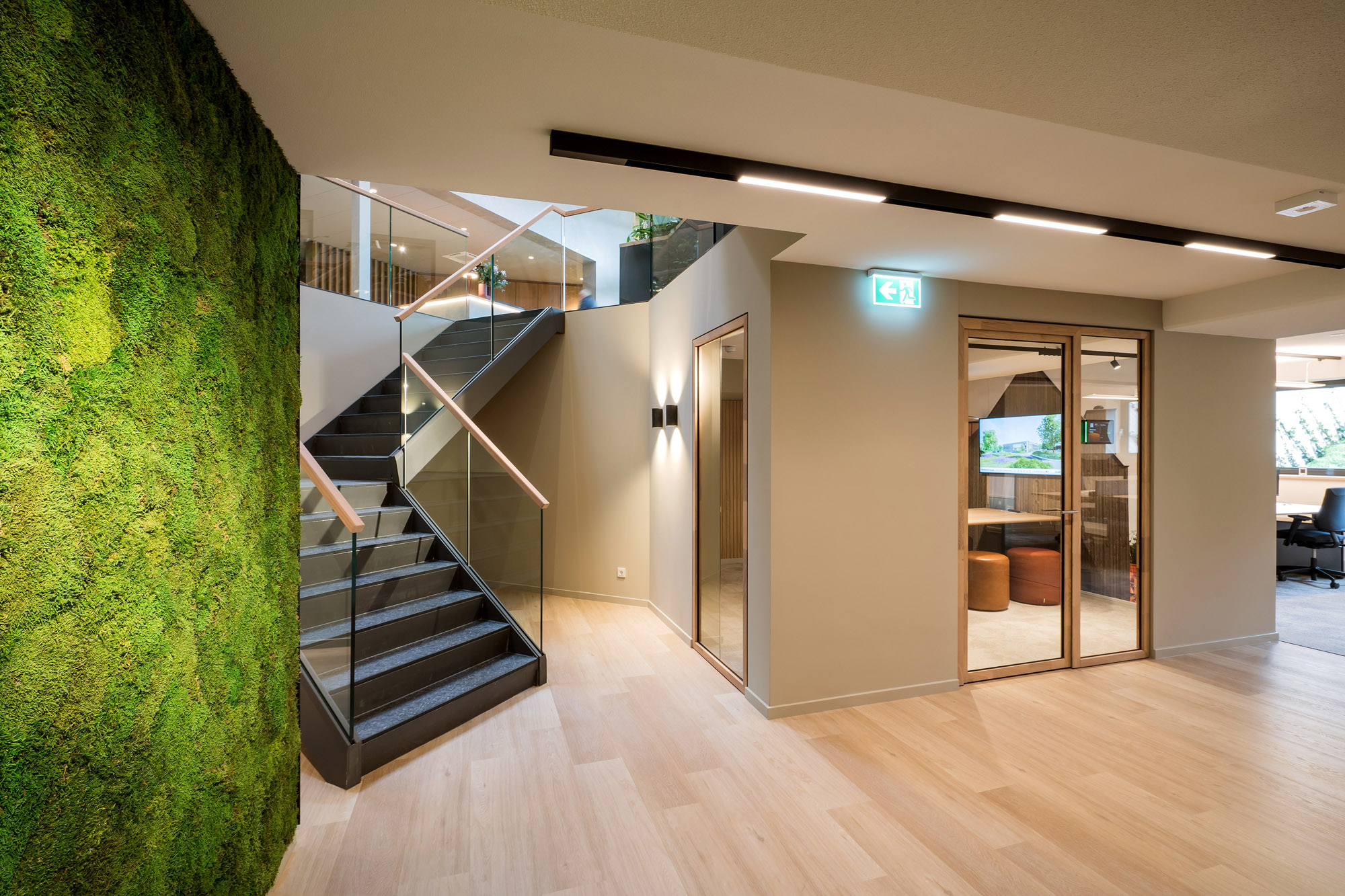 Het bestaande kantoor is, geheel volgens de duurzaamheidsambities, volledig gerenoveerd. In het pand zijn planten- en moswanden aangelegd die zorgen voor een akoestische demping, natuurlijke uitstraling én ze optimaliseren het binnenklimaat. Daarnaast is ook de tuin opnieuw aangeplant met diverse soorten groen. Deze vernieuwde, groene omgeving draagt bij aan een gezonde en inspirerende werkomgeving voor het hele team. Het vernieuwde kantoor is nu goed geïsoleerd, voorzien van moderne installaties en heeft een meer natuurlijke uitstraling.
