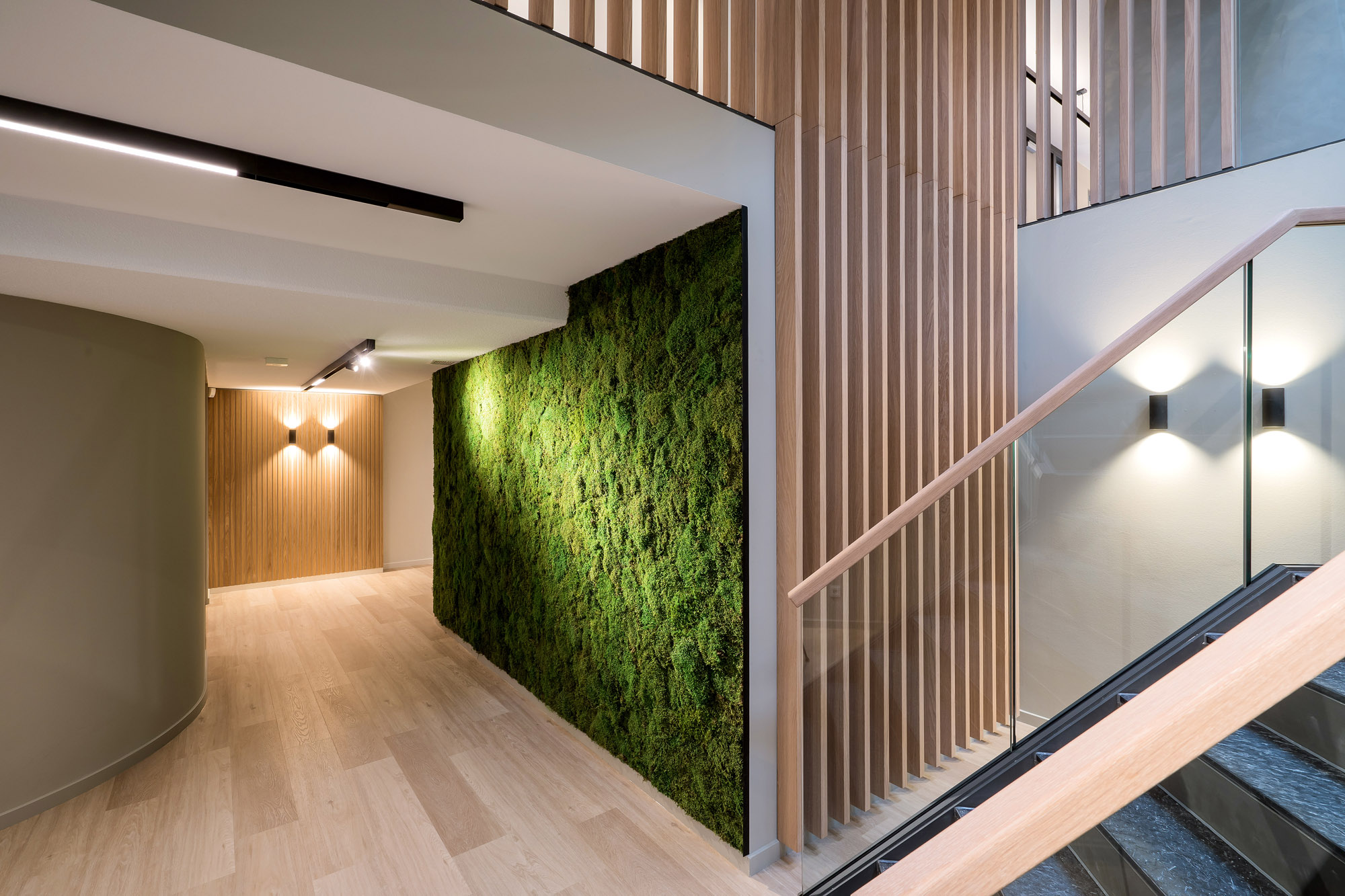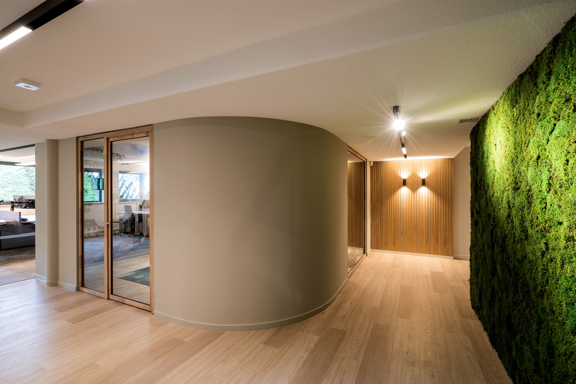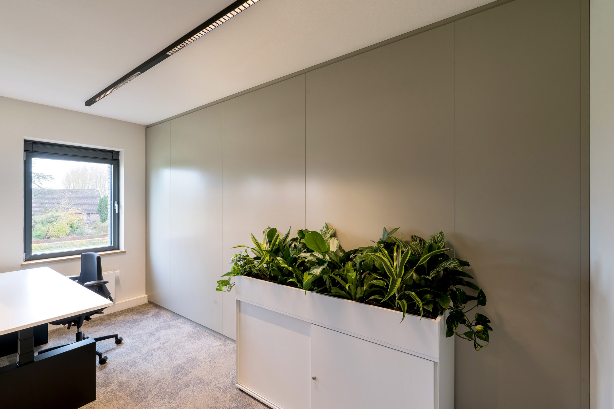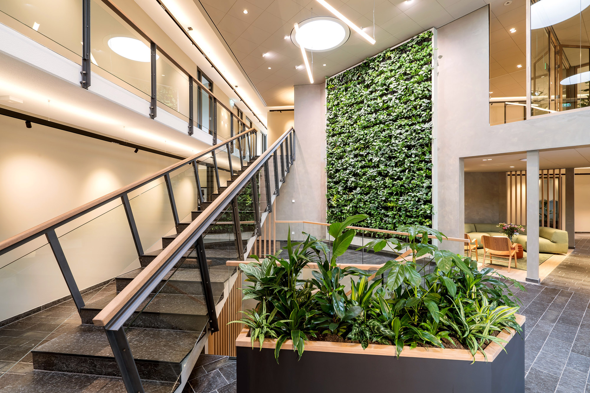 Het bestaande kantoor is, geheel volgens de duurzaamheidsambities, volledig gerenoveerd. In het pand zijn planten- en moswanden aangelegd die zorgen voor een akoestische demping, natuurlijke uitstraling én ze optimaliseren het binnenklimaat. Daarnaast is ook de tuin opnieuw aangeplant met diverse soorten groen. Deze vernieuwde, groene omgeving draagt bij aan een gezonde en inspirerende werkomgeving voor het hele team. Het vernieuwde kantoor is nu goed geïsoleerd, voorzien van moderne installaties en heeft een meer natuurlijke uitstraling.