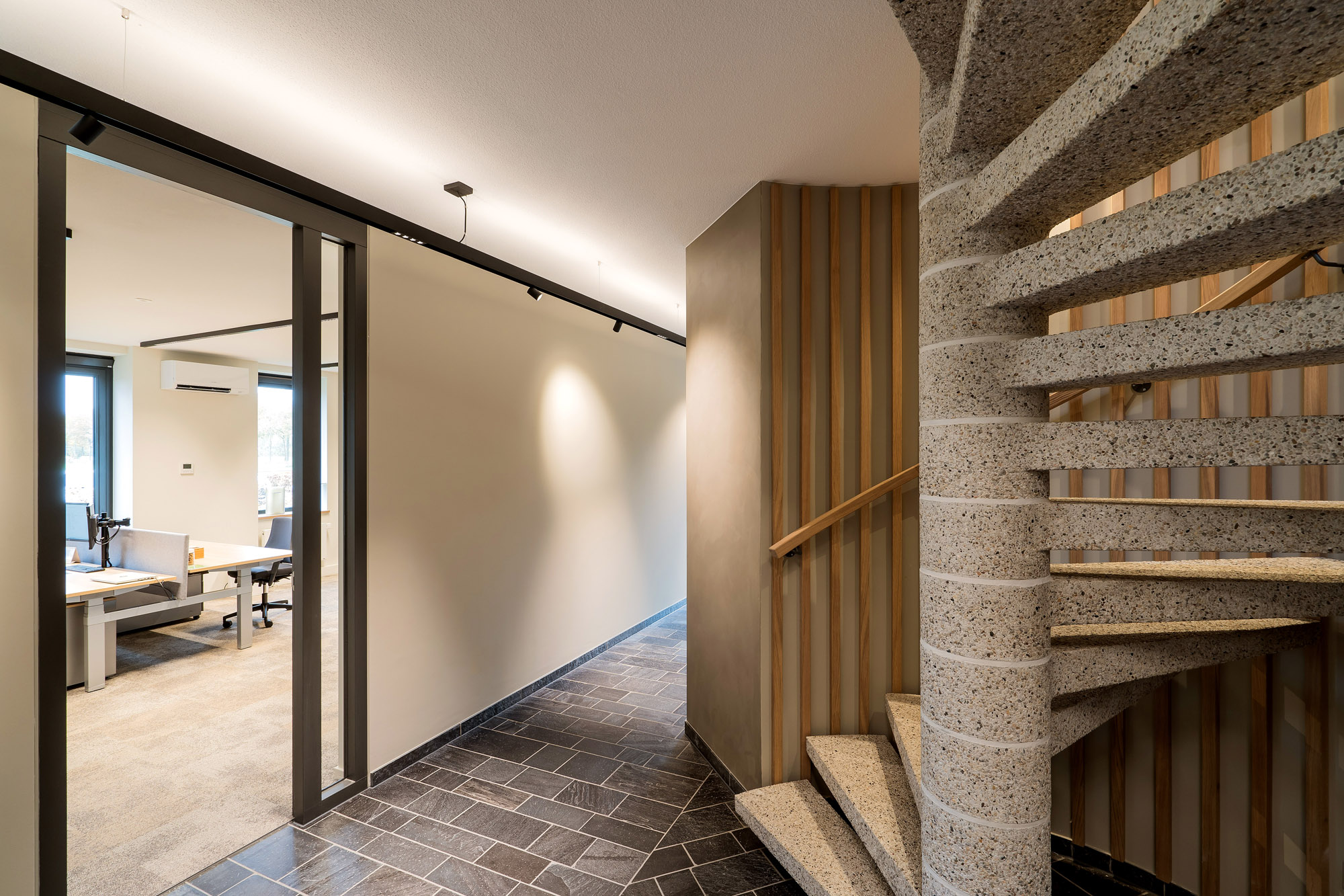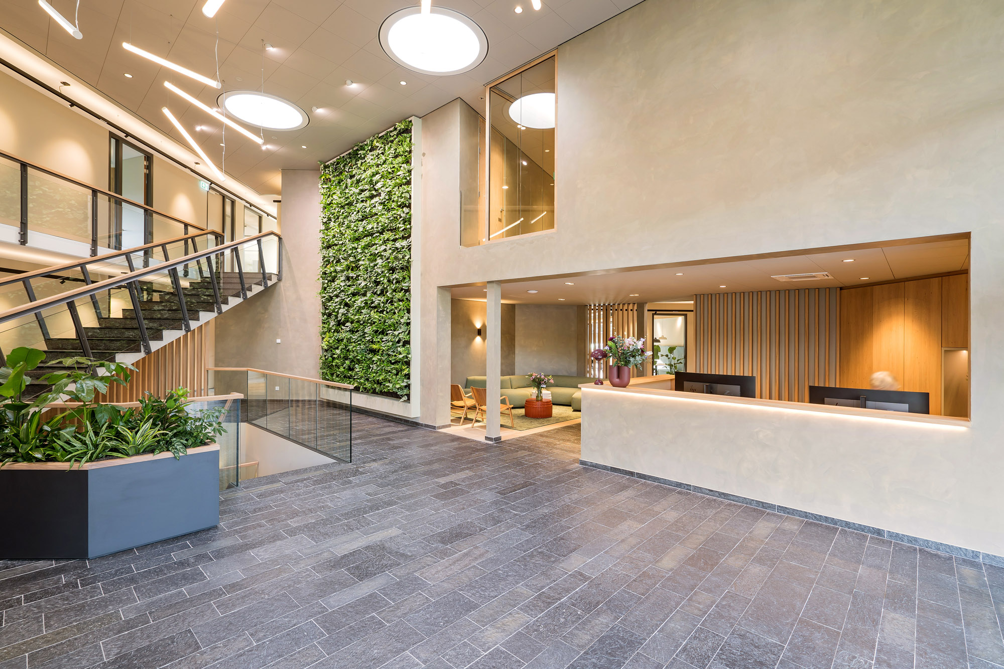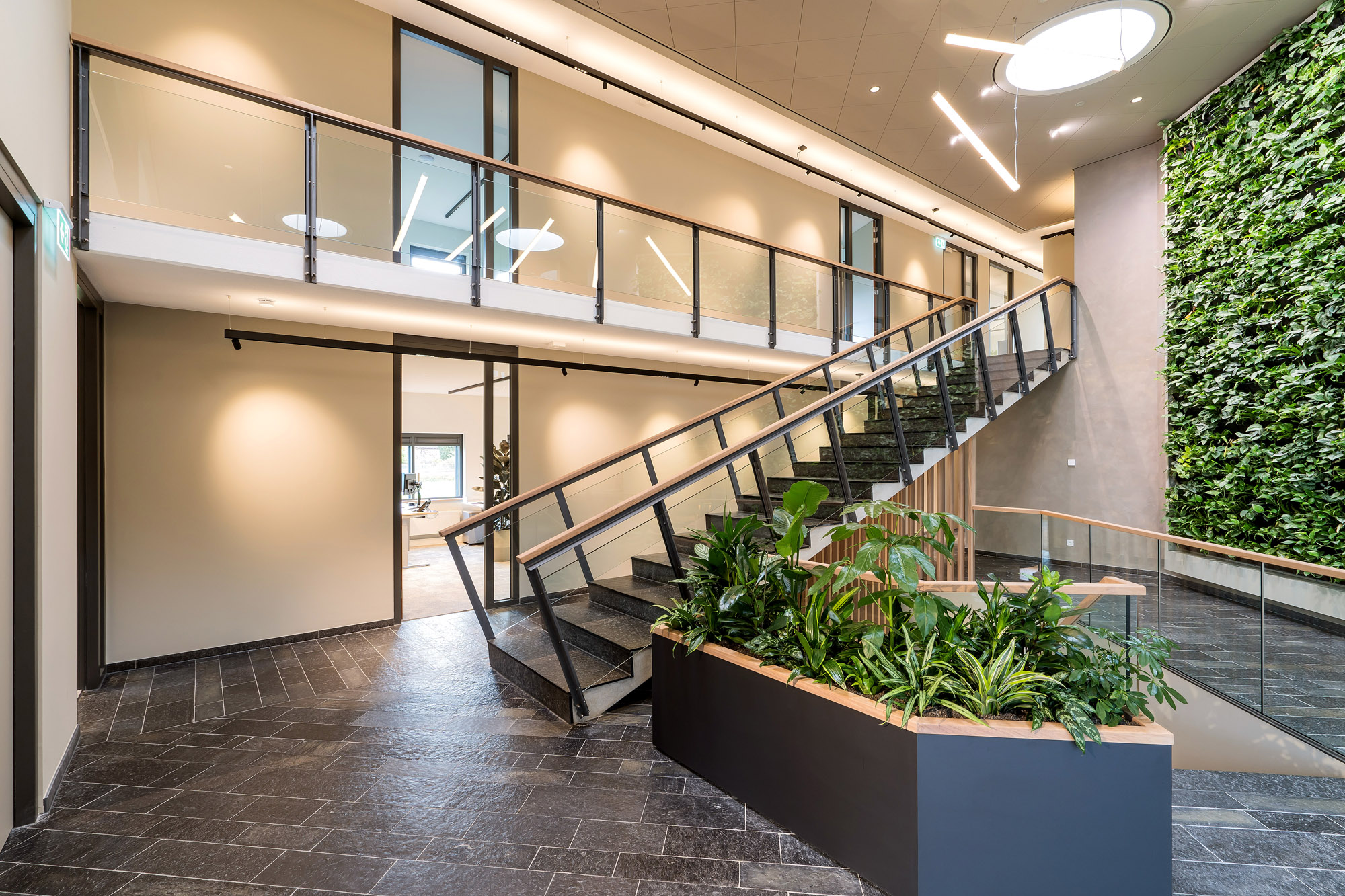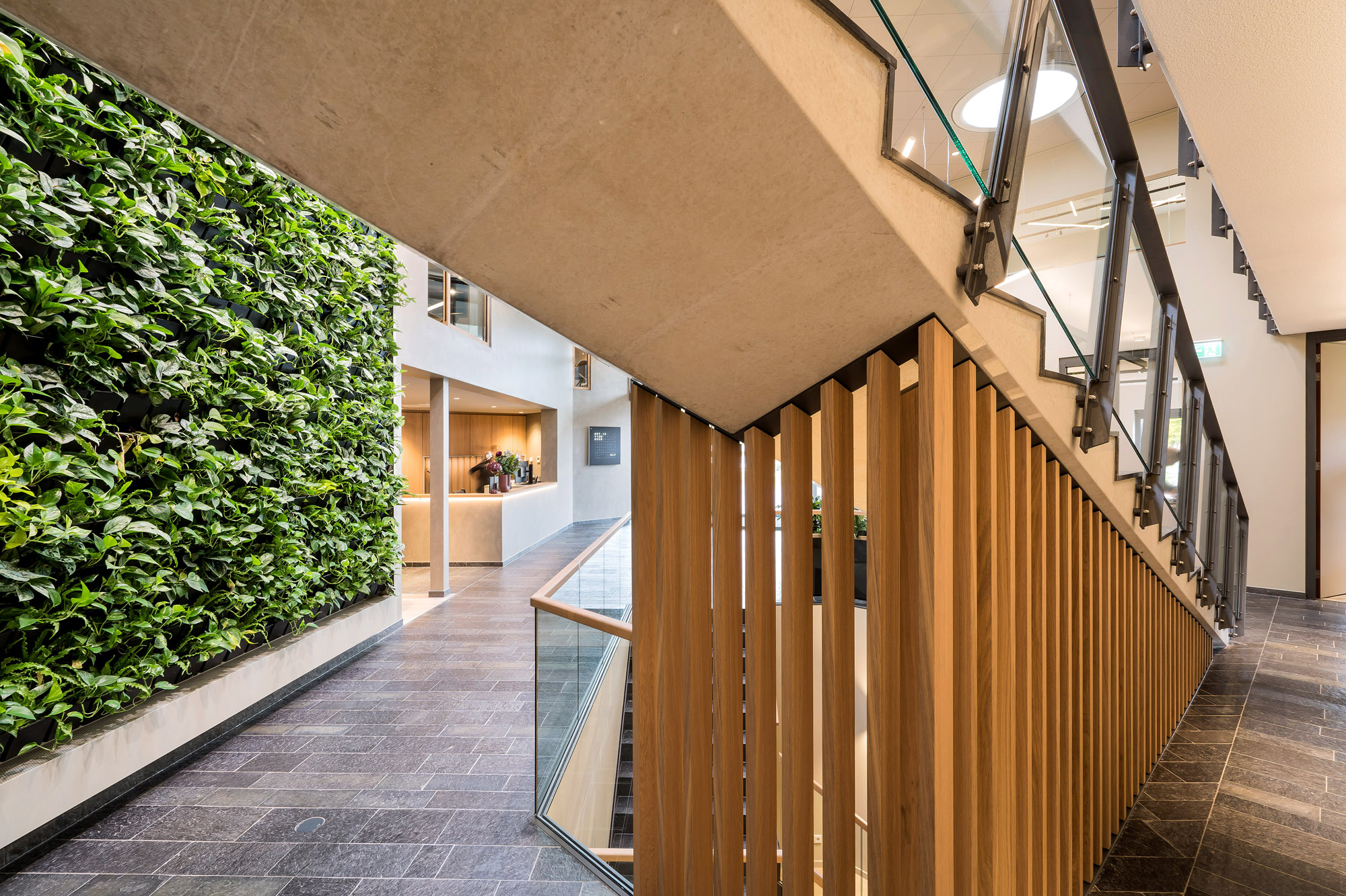 Het bestaande kantoor is, geheel volgens de duurzaamheidsambities, volledig gerenoveerd. In het pand zijn planten- en moswanden aangelegd die zorgen voor een akoestische demping, natuurlijke uitstraling én ze optimaliseren het binnenklimaat. Daarnaast is ook de tuin opnieuw aangeplant met diverse soorten groen. Deze vernieuwde, groene omgeving draagt bij aan een gezonde en inspirerende werkomgeving voor het hele team. Het vernieuwde kantoor is nu goed geïsoleerd, voorzien van moderne installaties en heeft een meer natuurlijke uitstraling.