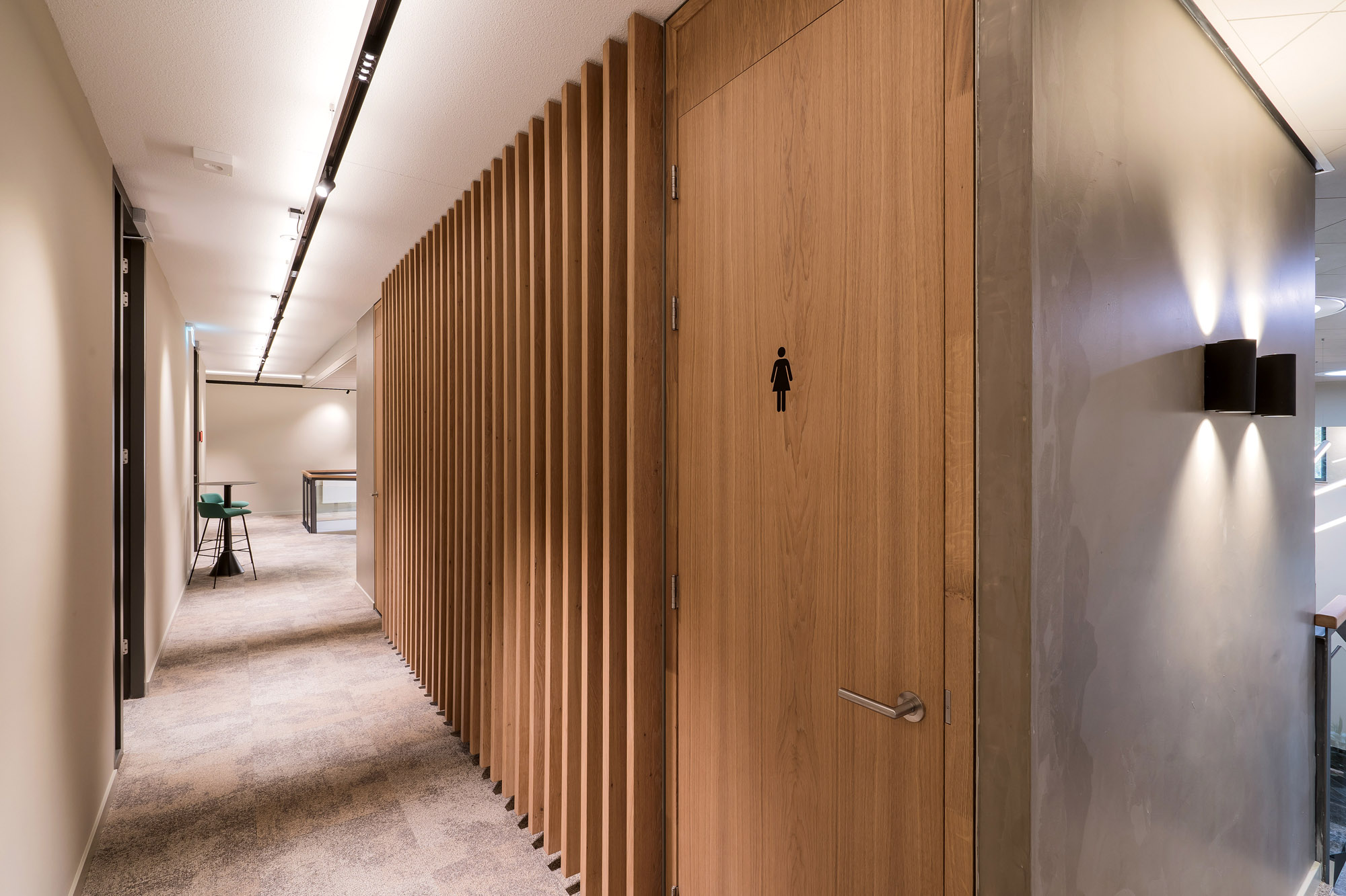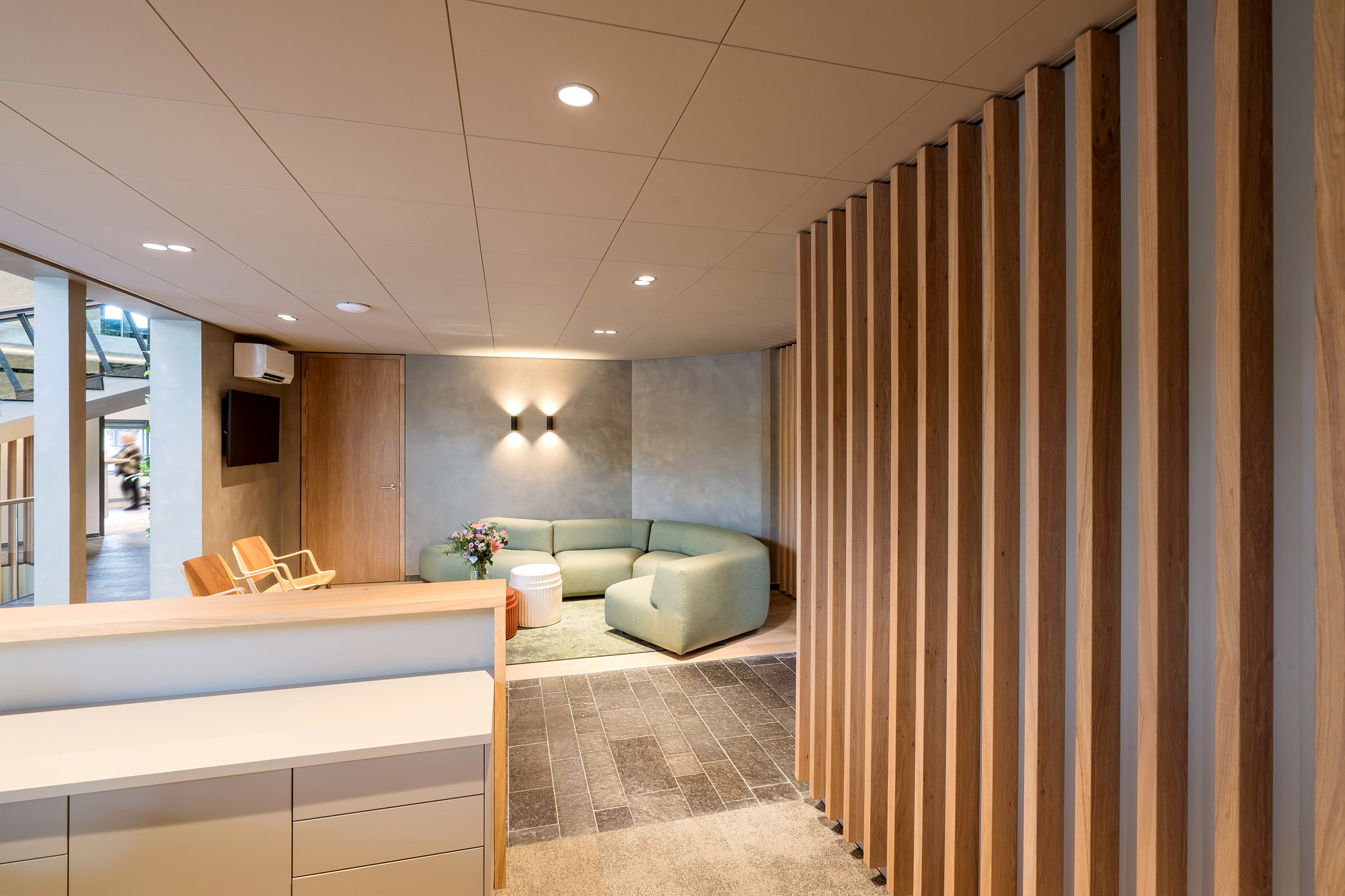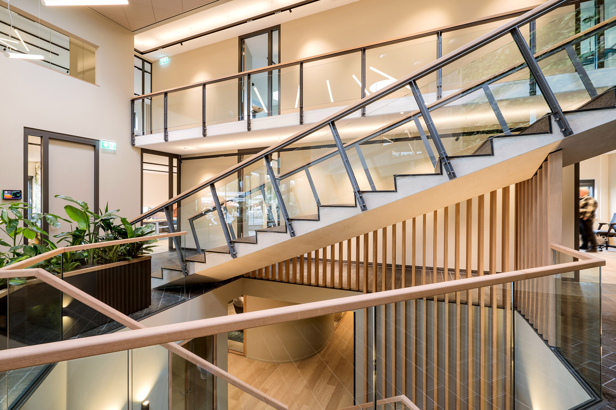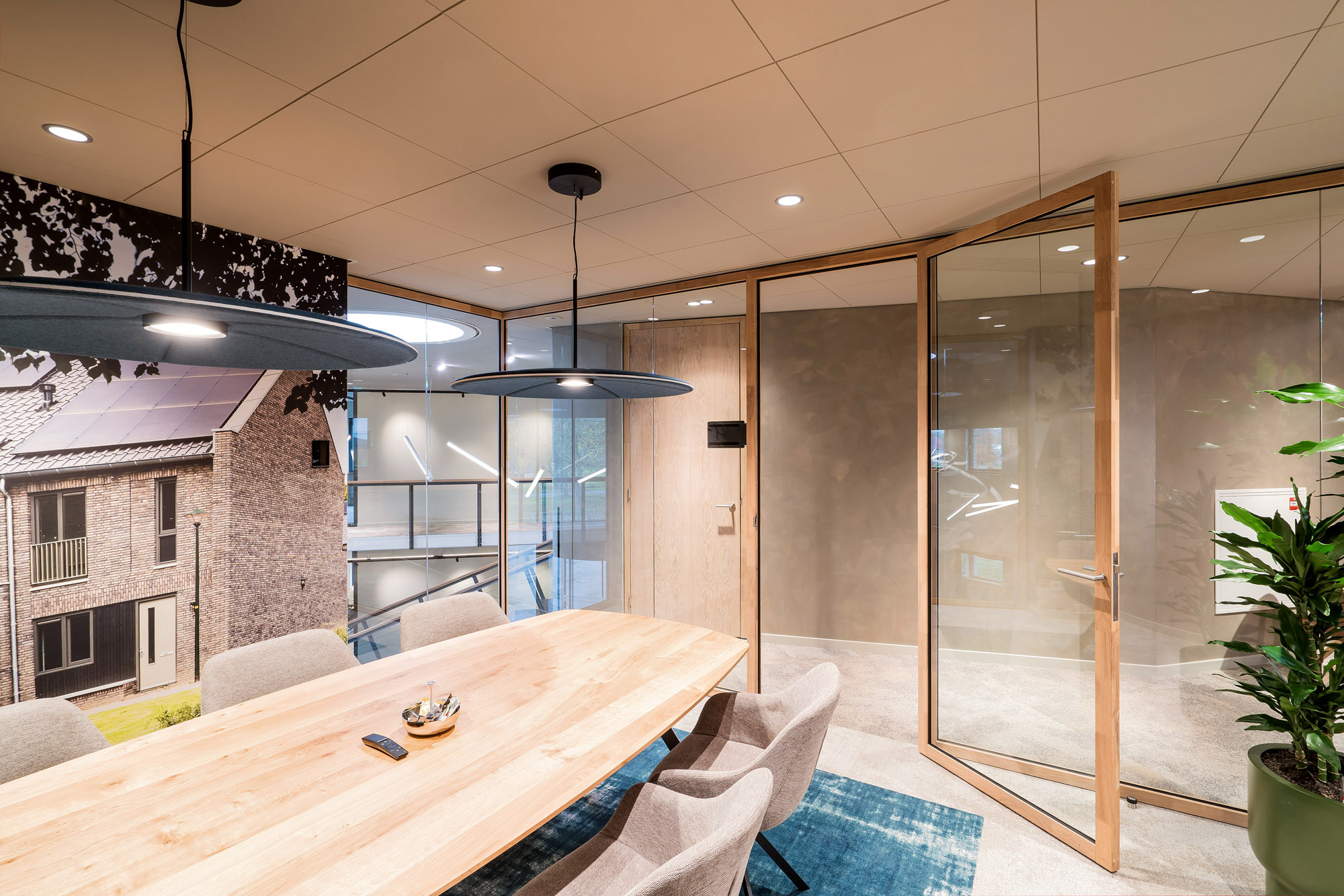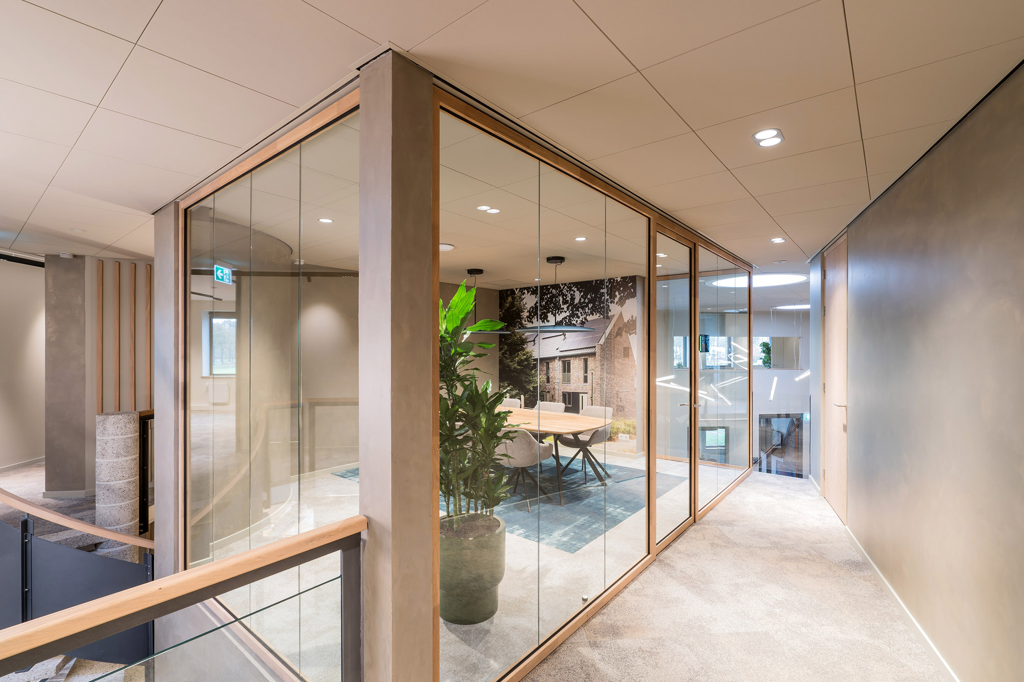 Het bestaande kantoorgebouw was voor ons geen onbekend pand. Met eerdere verbouwingen zijn systeemwanden en akoestische plafonds toegepast die in de huidige renovatie opnieuw gebruikt en uitgebreid zijn. Het gebruikte OWAplan is een naadloos akoestische plafond dat echo en galm reduceert, zorgt voor betere verstaanbaarheid en de rust en het comfort in de ruimte verhoogt. De bestaande stalen systeemwanden uit onze VNS-serie zijn gedemonteerd en opnieuw toegepast als binnenwanden. Onze duurzame WoodFrame Slim glaswanden zorgen voor transparantie en zijn, samen met de kleur van het verdekte systeemplafond en alle VNS wanden afgestemd op de rest van het interieur. Diverse houten interieuraccenten maken het project compleet, zoals de massief eiken leuningen langs de balustrade en trappen.