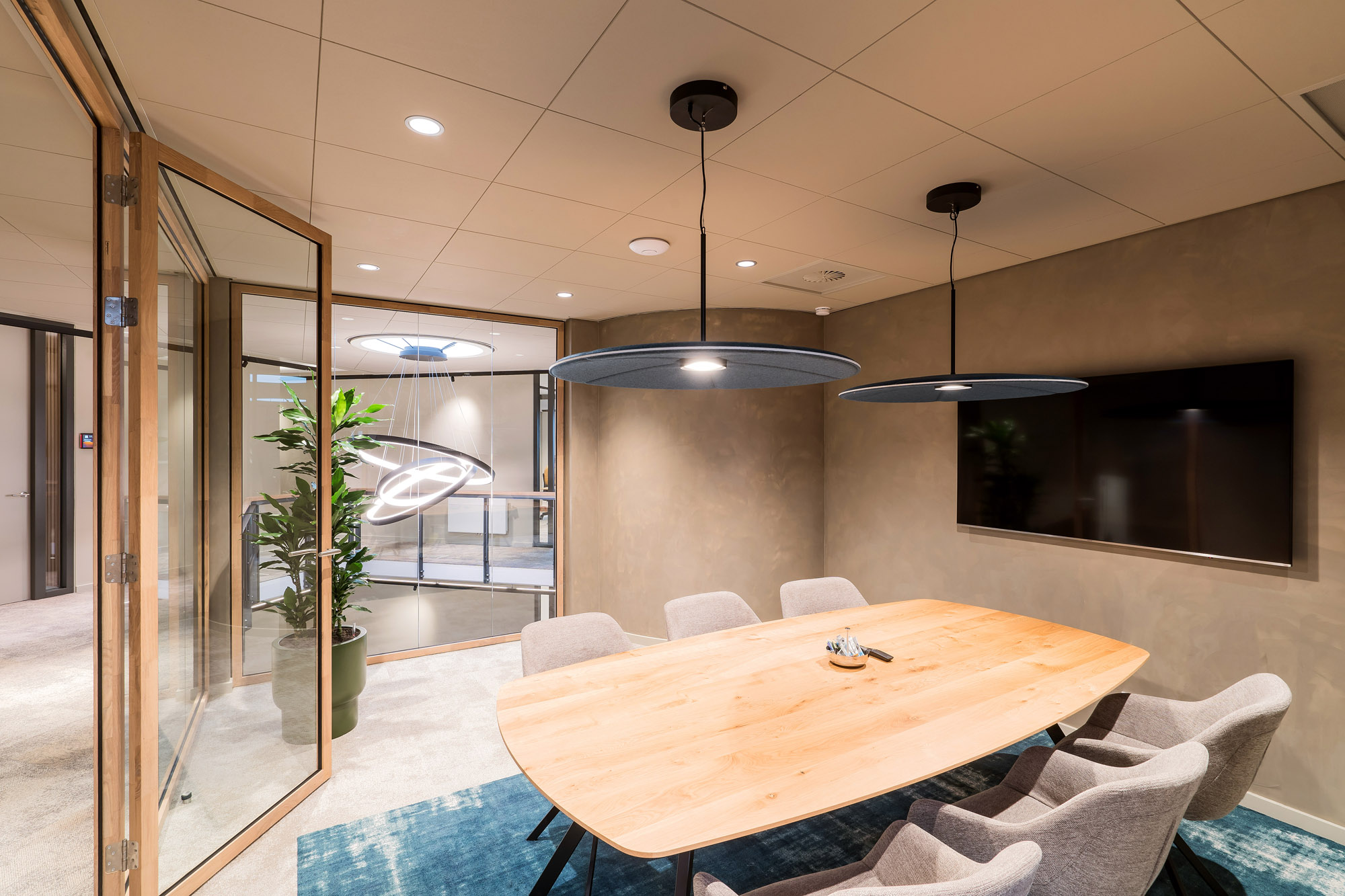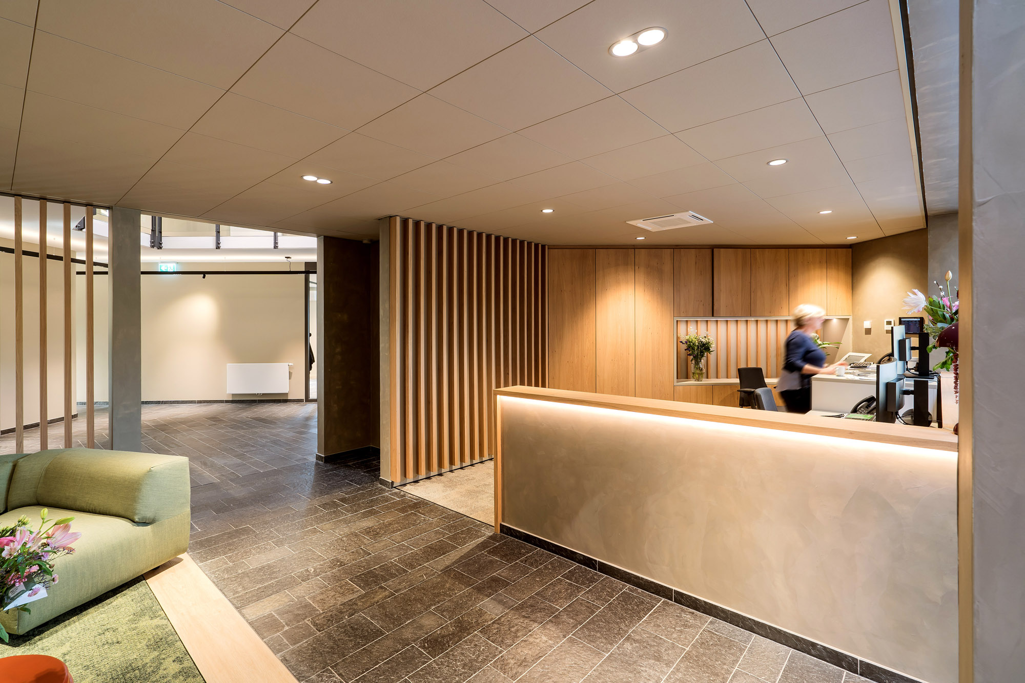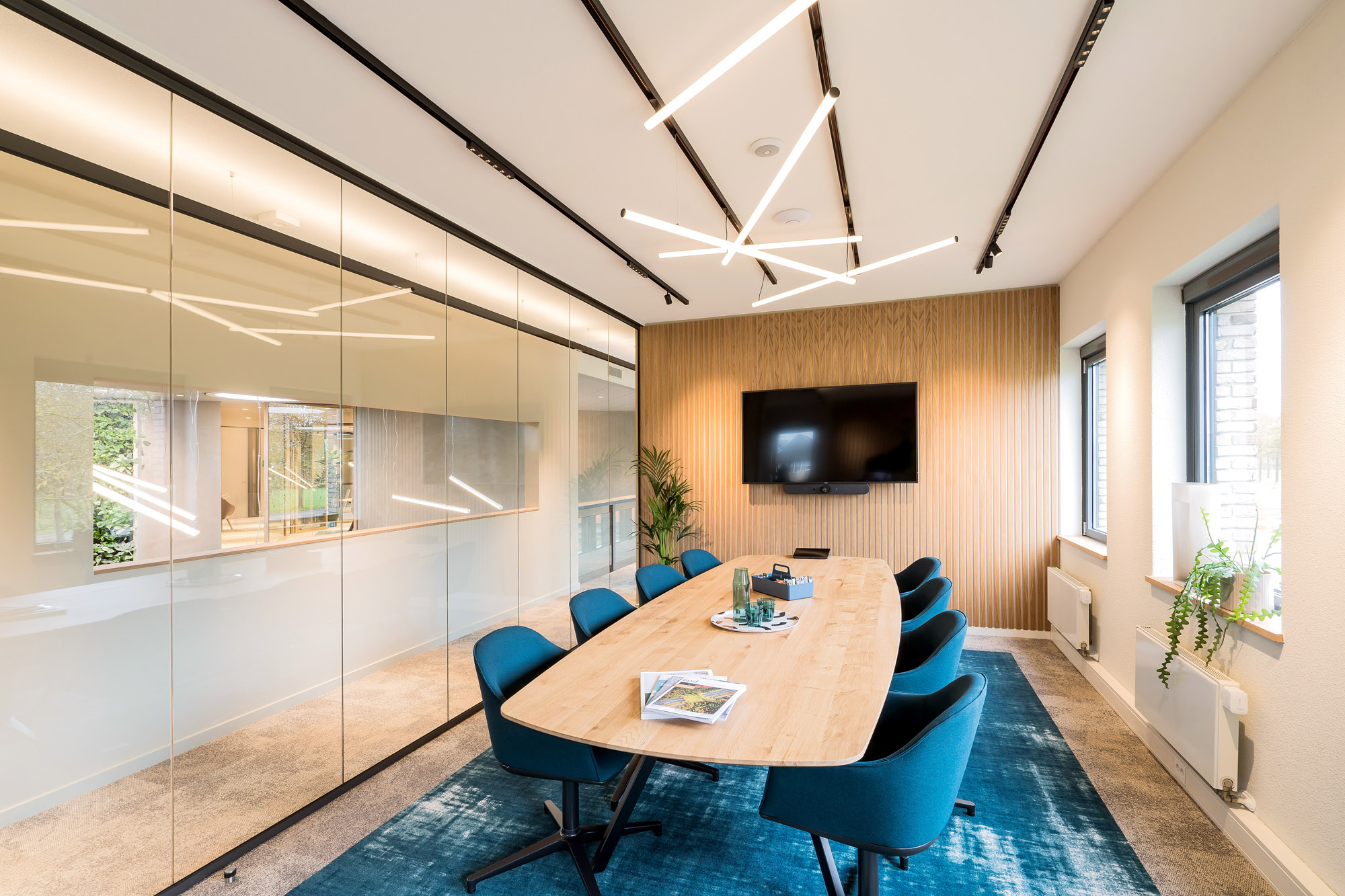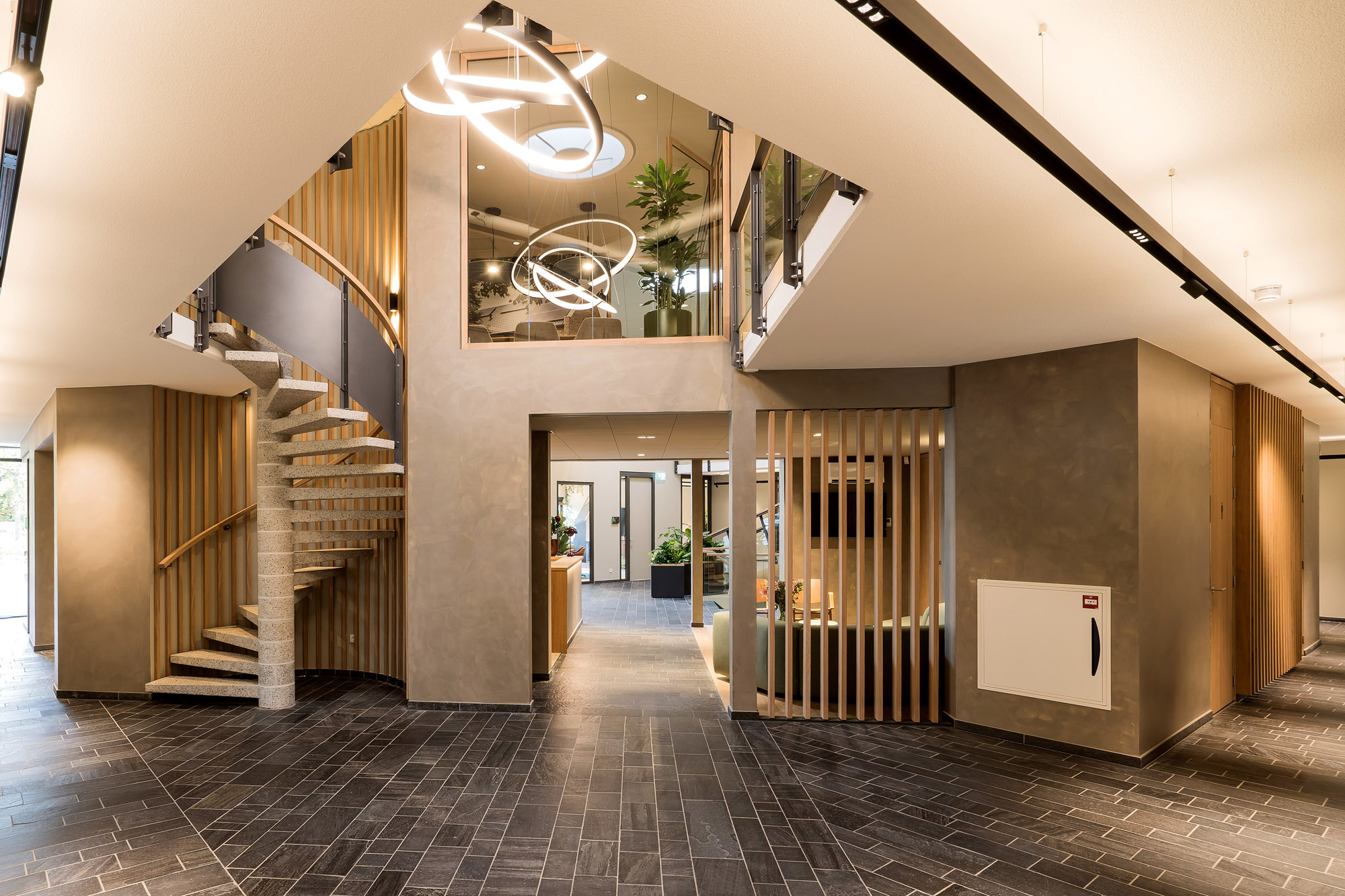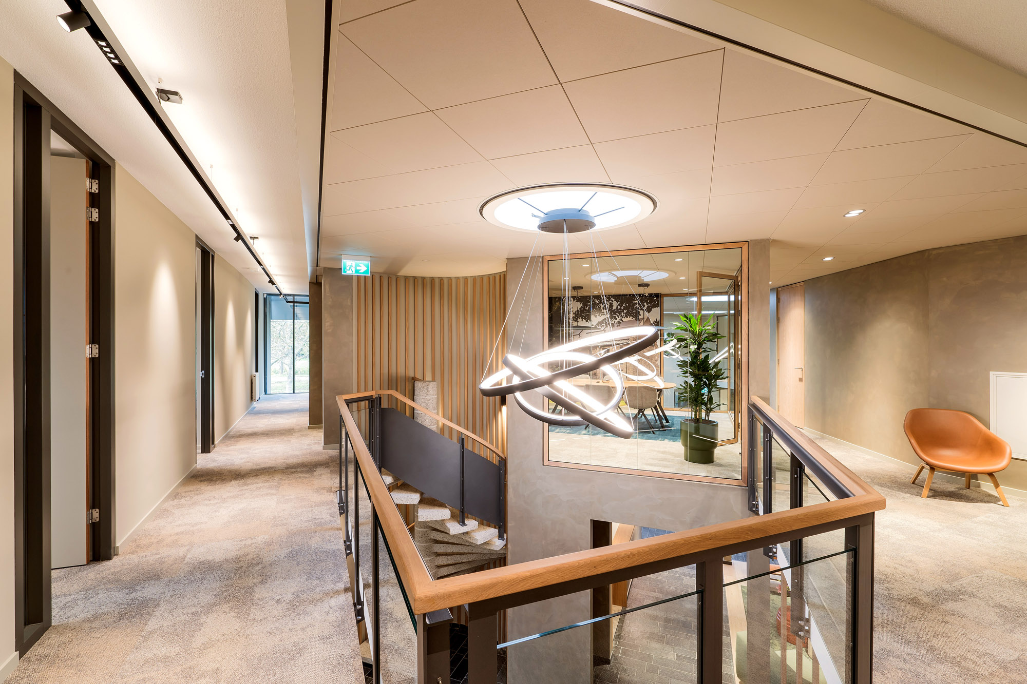 Het bestaande kantoorgebouw was voor ons geen onbekend pand. Met eerdere verbouwingen zijn systeemwanden en akoestische plafonds toegepast die in de huidige renovatie opnieuw gebruikt en uitgebreid zijn. Het gebruikte OWAplan is een naadloos akoestische plafond dat echo en galm reduceert, zorgt voor betere verstaanbaarheid en de rust en het comfort in de ruimte verhoogt. De bestaande stalen systeemwanden uit onze VNS-serie zijn gedemonteerd en opnieuw toegepast als binnenwanden. Onze duurzame WoodFrame Slim glaswanden zorgen voor transparantie en zijn, samen met de kleur van het verdekte systeemplafond en alle VNS wanden afgestemd op de rest van het interieur. Diverse houten interieuraccenten maken het project compleet, zoals de massief eiken leuningen langs de balustrade en trappen.