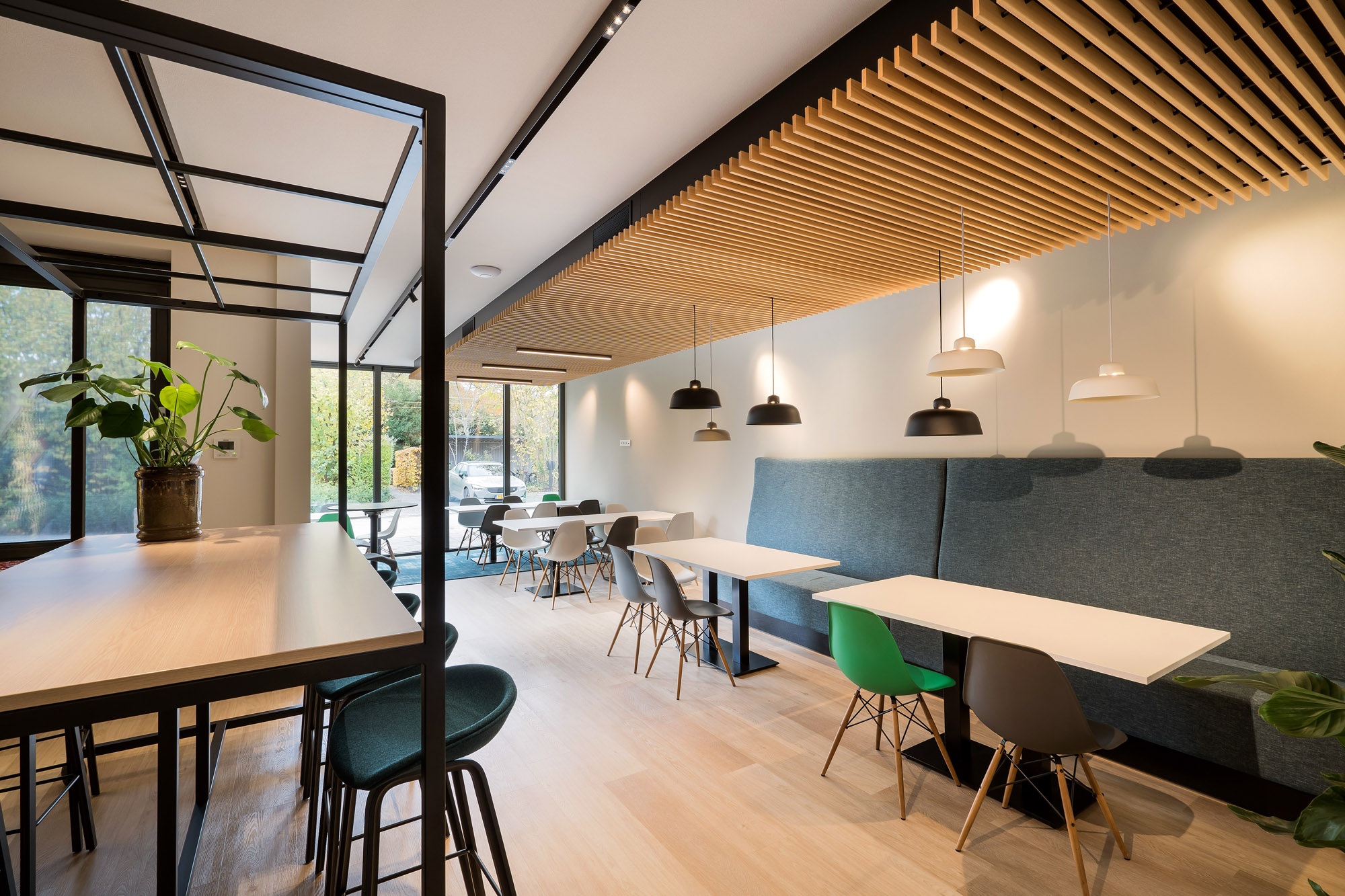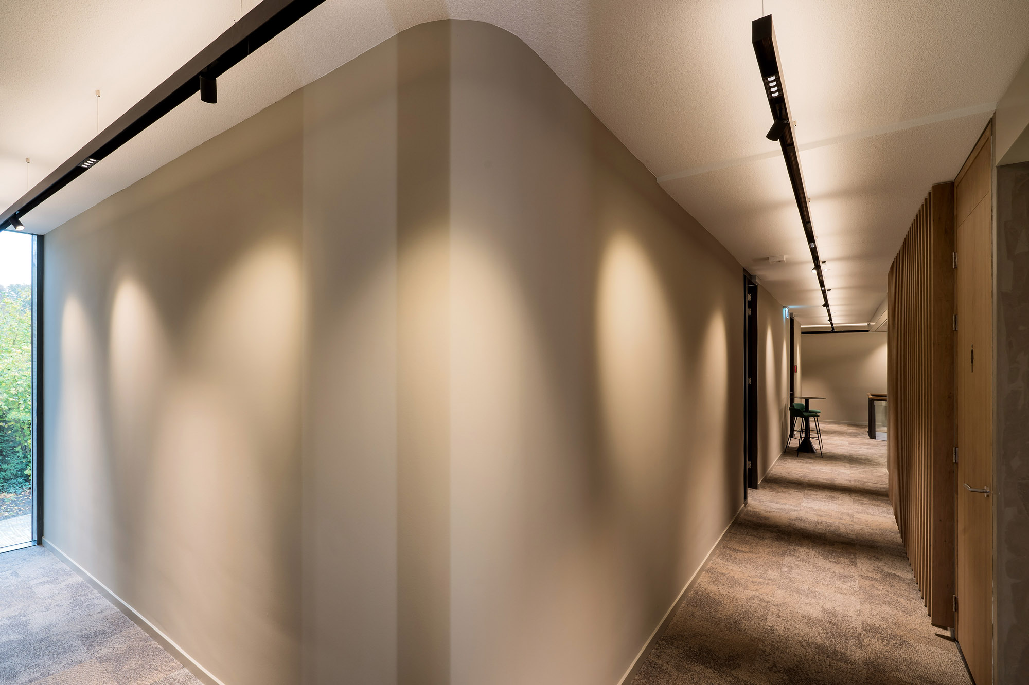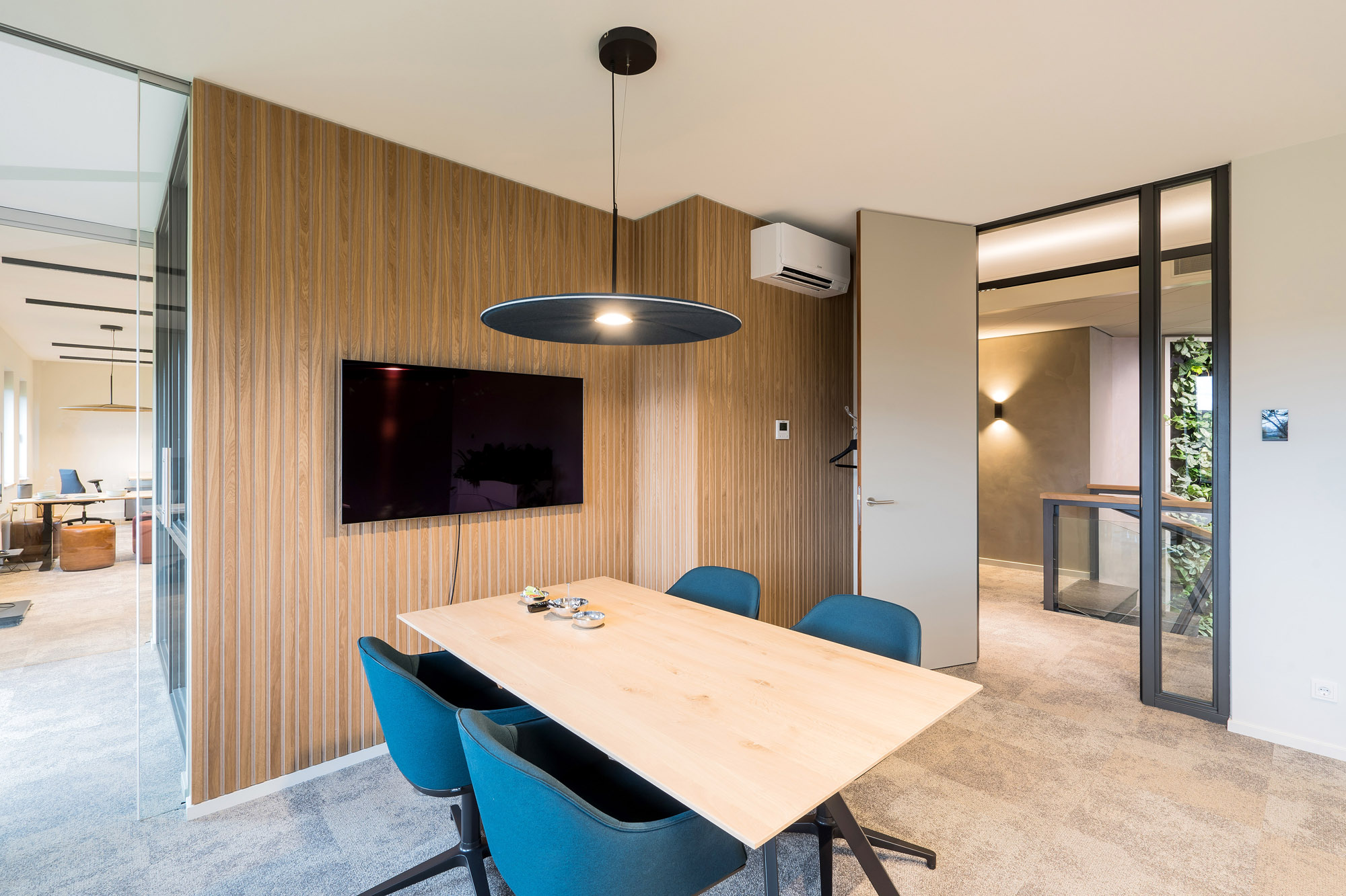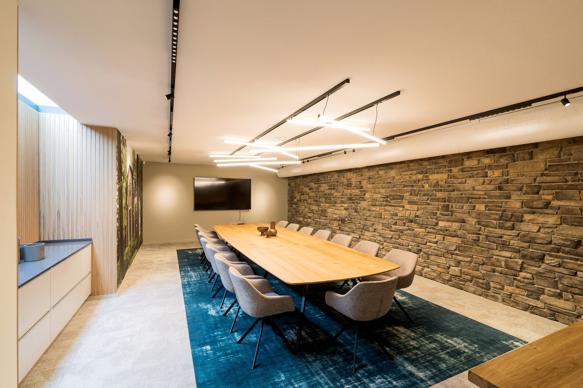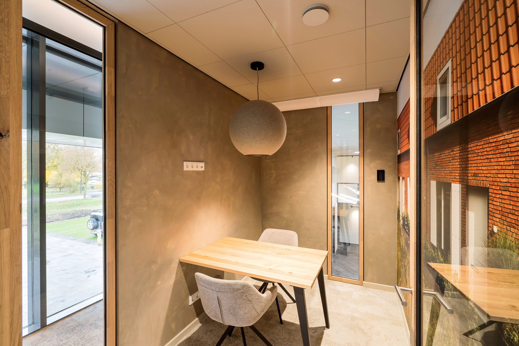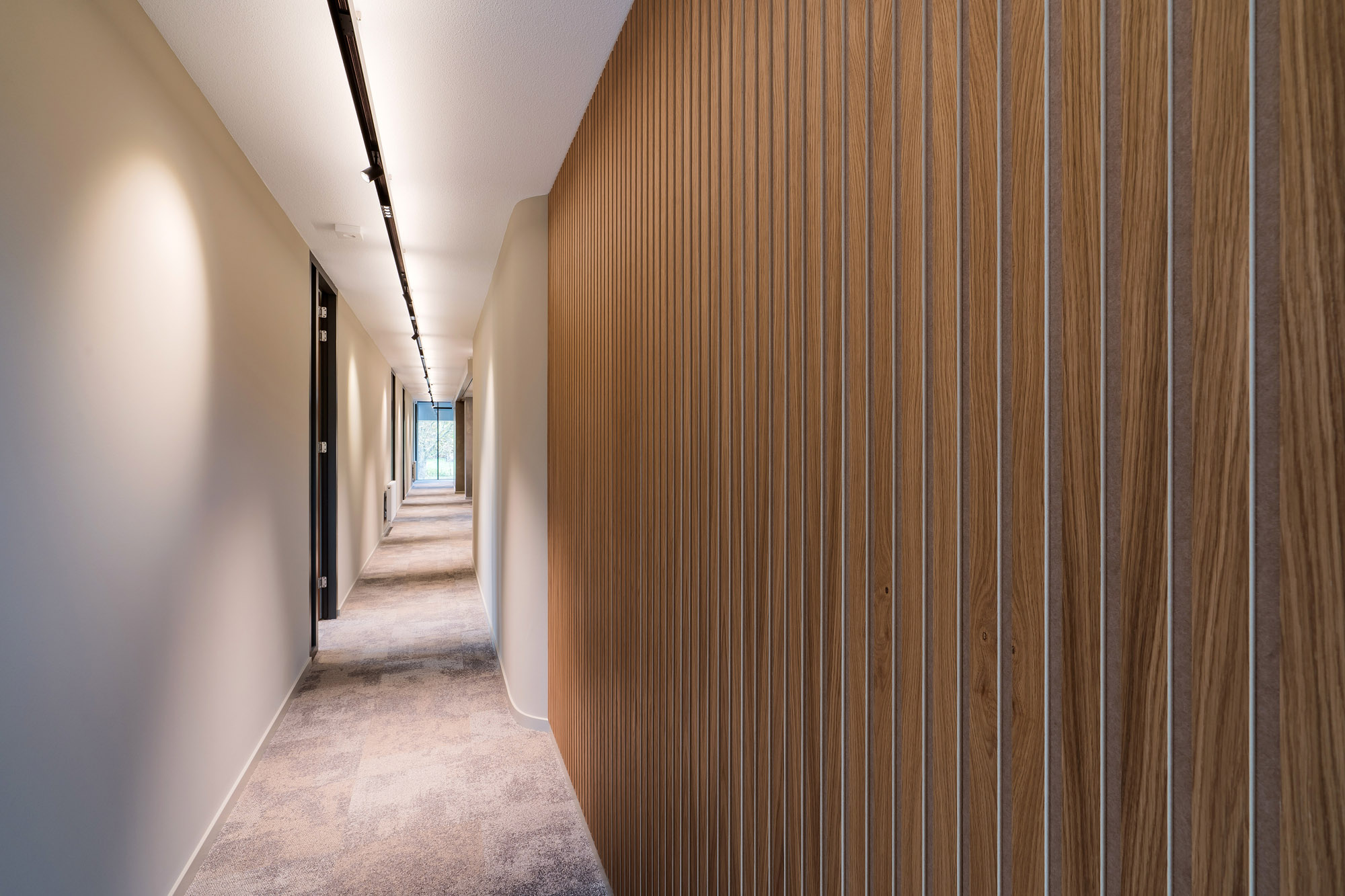 Het bestaande kantoorgebouw was voor ons geen onbekend pand. Met eerdere verbouwingen zijn systeemwanden en akoestische plafonds toegepast die in de huidige renovatie opnieuw gebruikt en uitgebreid zijn. Het gebruikte OWAplan is een naadloos akoestische plafond dat echo en galm reduceert, zorgt voor betere verstaanbaarheid en de rust en het comfort in de ruimte verhoogt. De bestaande stalen systeemwanden uit onze VNS-serie zijn gedemonteerd en opnieuw toegepast als binnenwanden. Onze duurzame WoodFrame Slim glaswanden zorgen voor transparantie en zijn, samen met de kleur van het verdekte systeemplafond en alle VNS wanden afgestemd op de rest van het interieur. Diverse houten interieuraccenten maken het project compleet, zoals de massief eiken leuningen langs de balustrade en trappen.
