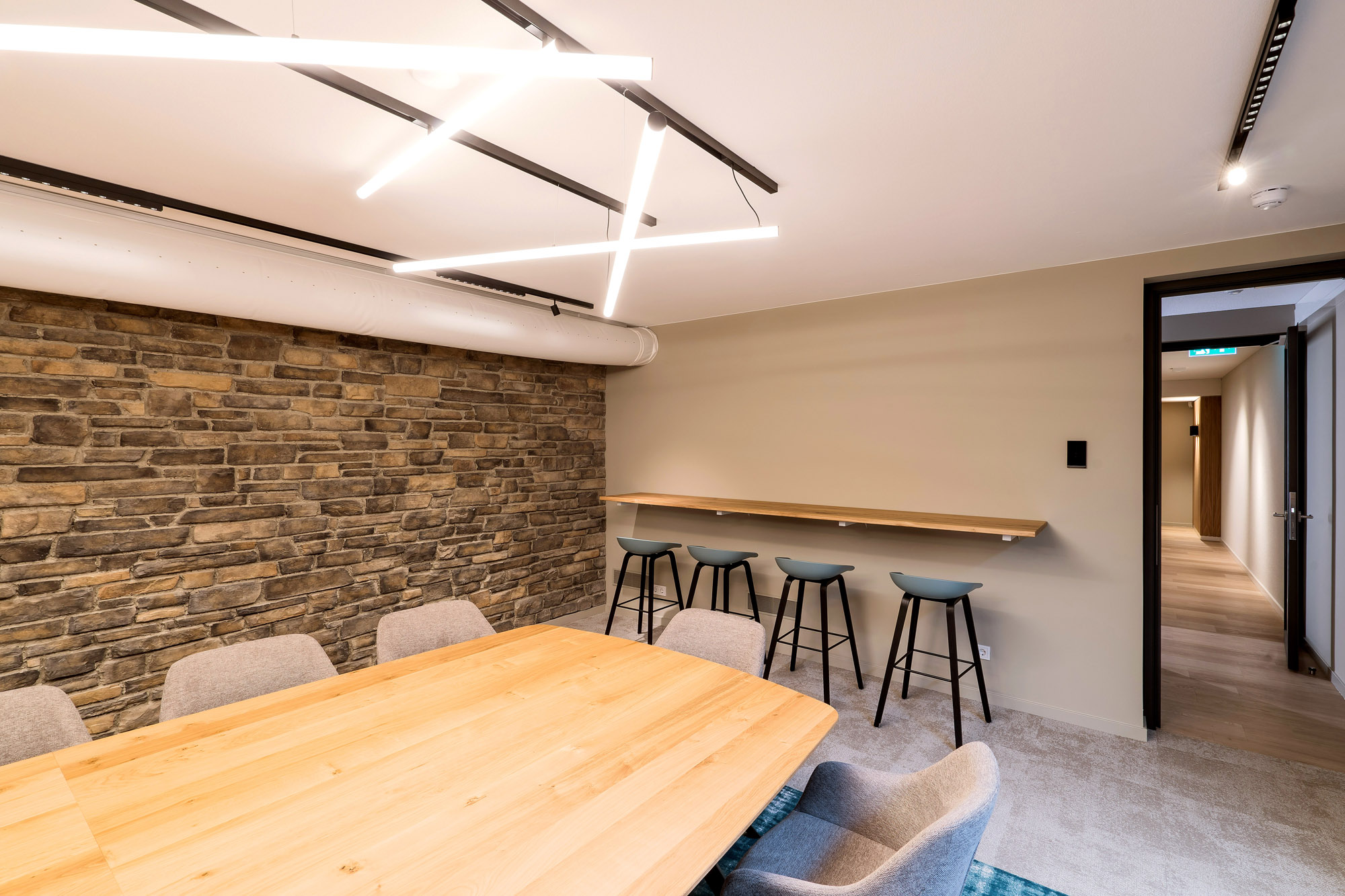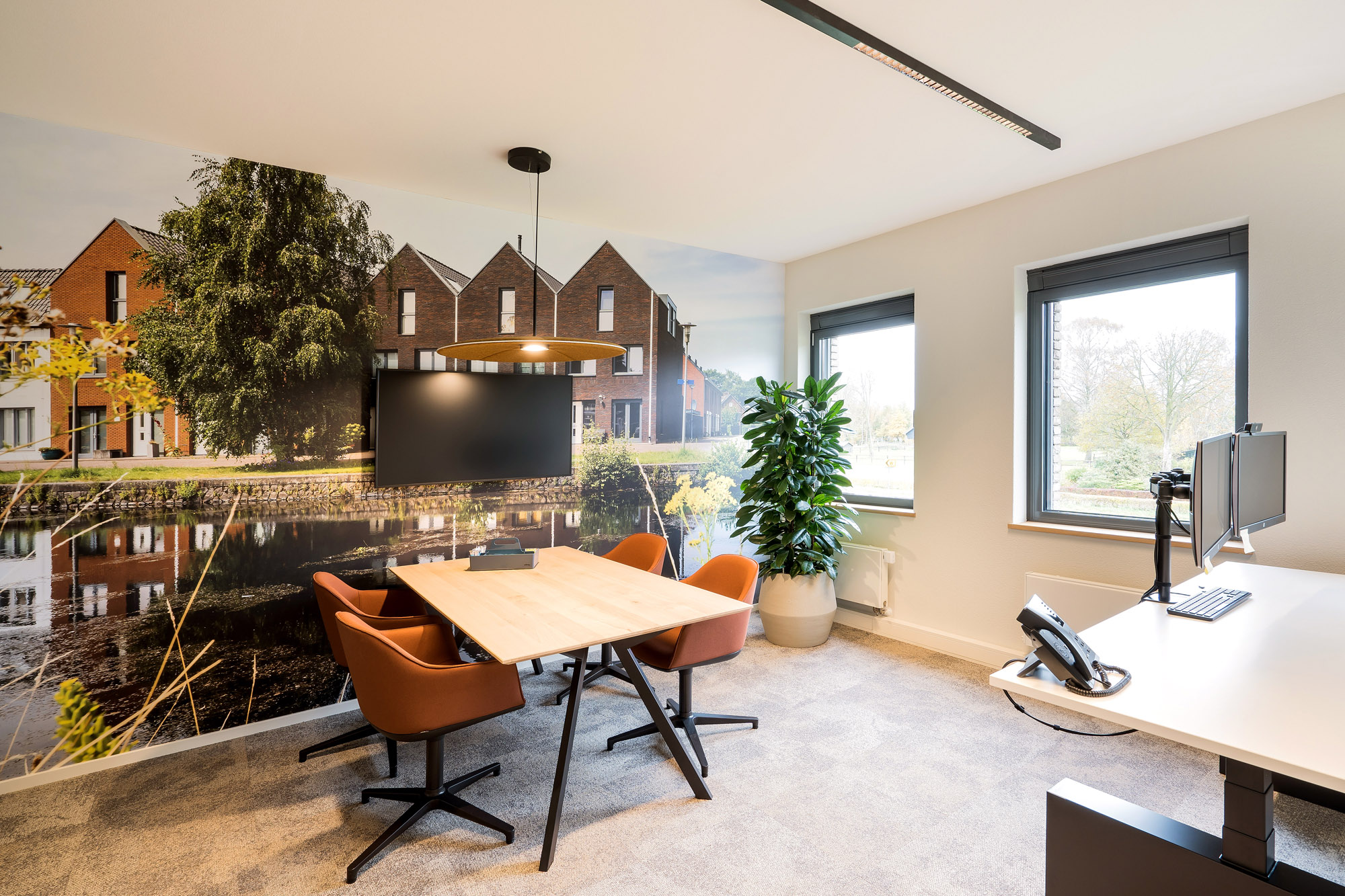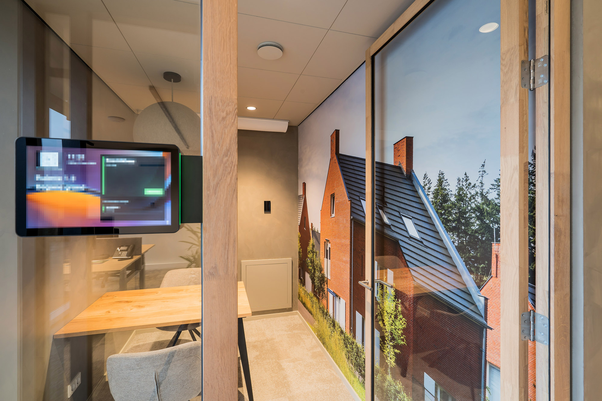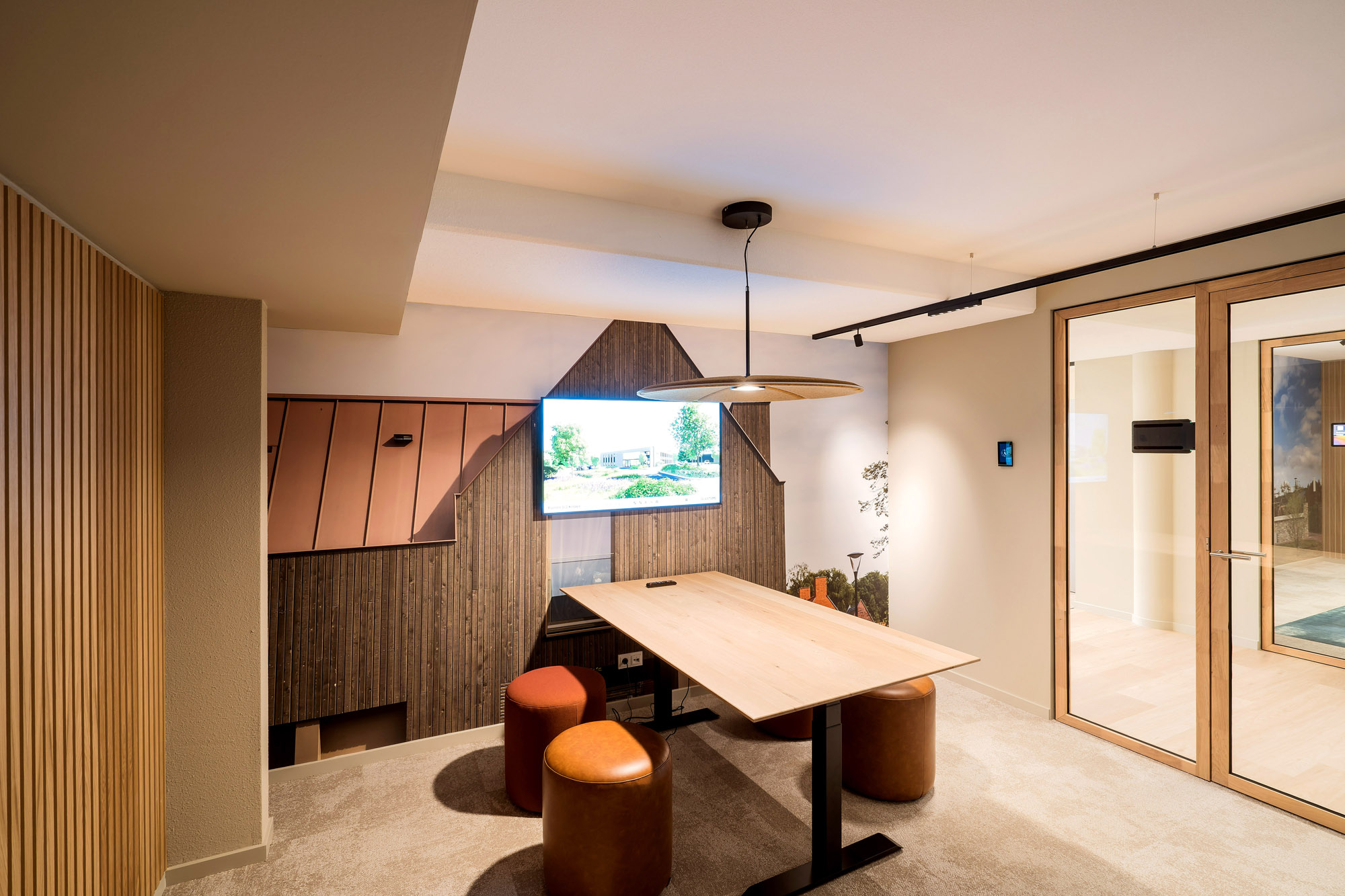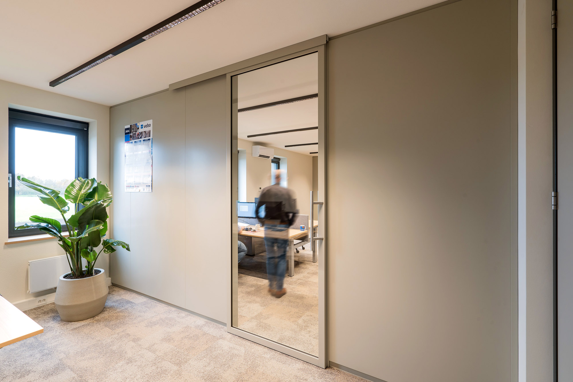Het bestaande kantoorgebouw was voor ons geen onbekend pand. Met eerdere verbouwingen zijn systeemwanden en akoestische plafonds toegepast die in de huidige renovatie opnieuw gebruikt en uitgebreid zijn. Het gebruikte OWAplan is een naadloos akoestische plafond dat echo en galm reduceert, zorgt voor betere verstaanbaarheid en de rust en het comfort in de ruimte verhoogt. De bestaande stalen systeemwanden uit onze VNS-serie zijn gedemonteerd en opnieuw toegepast als binnenwanden. Onze duurzame WoodFrame Slim glaswanden zorgen voor transparantie en zijn, samen met de kleur van het verdekte systeemplafond en alle VNS wanden afgestemd op de rest van het interieur. Diverse houten interieuraccenten maken het project compleet, zoals de massief eiken leuningen langs de balustrade en trappen.