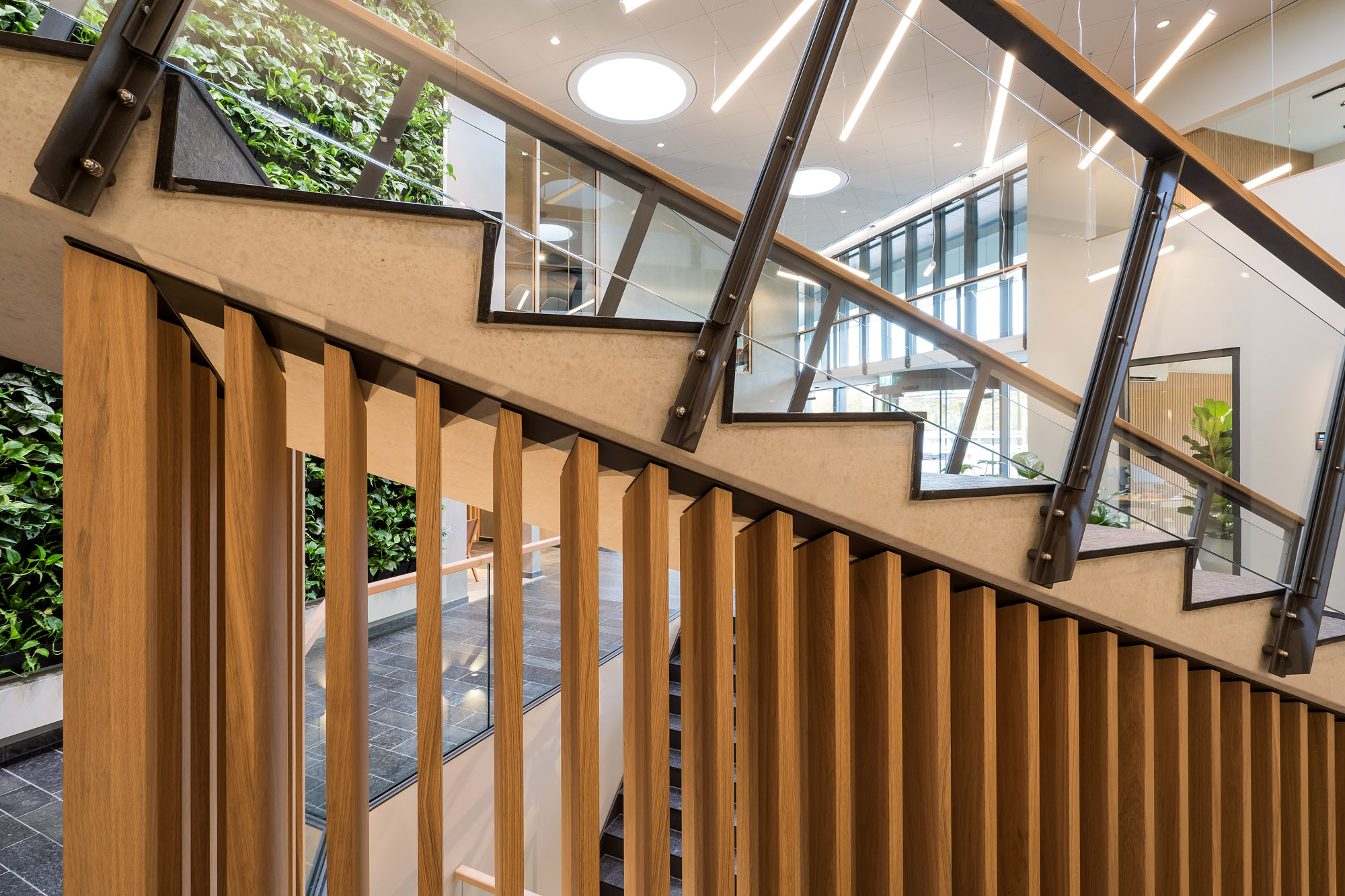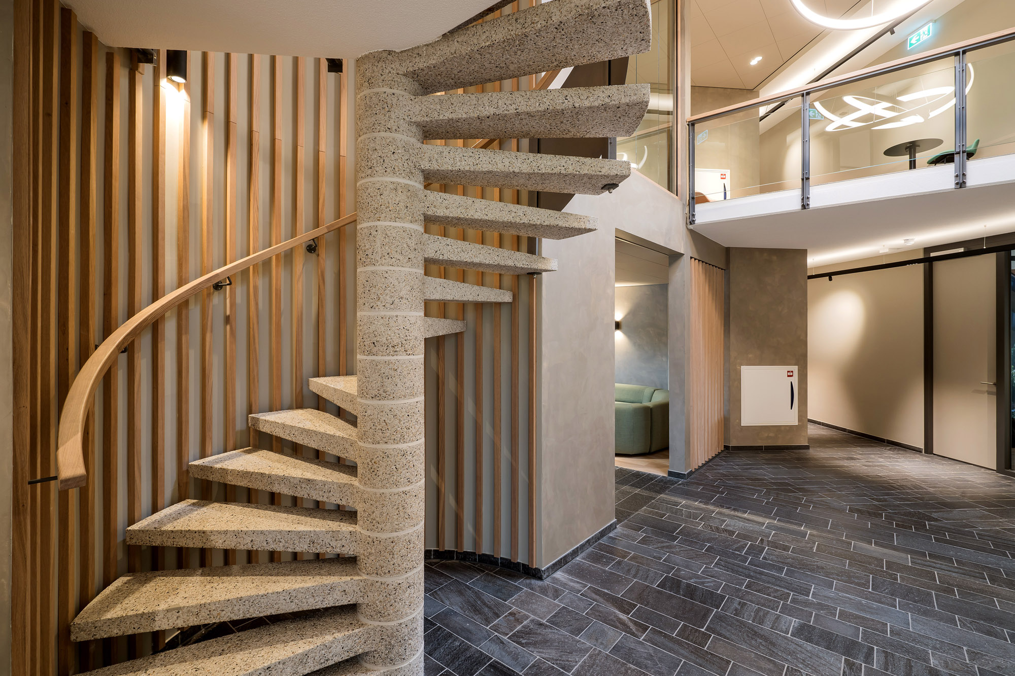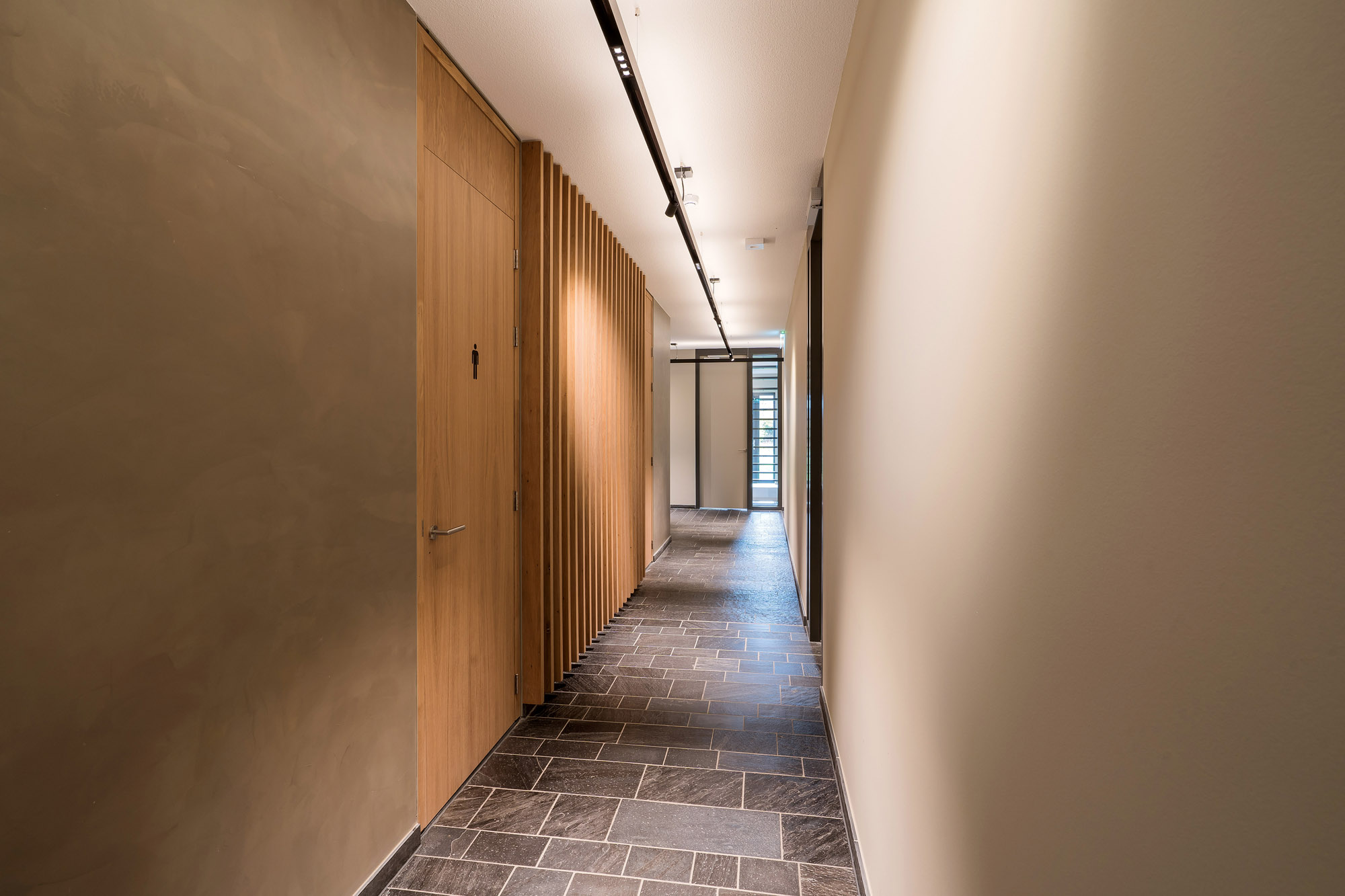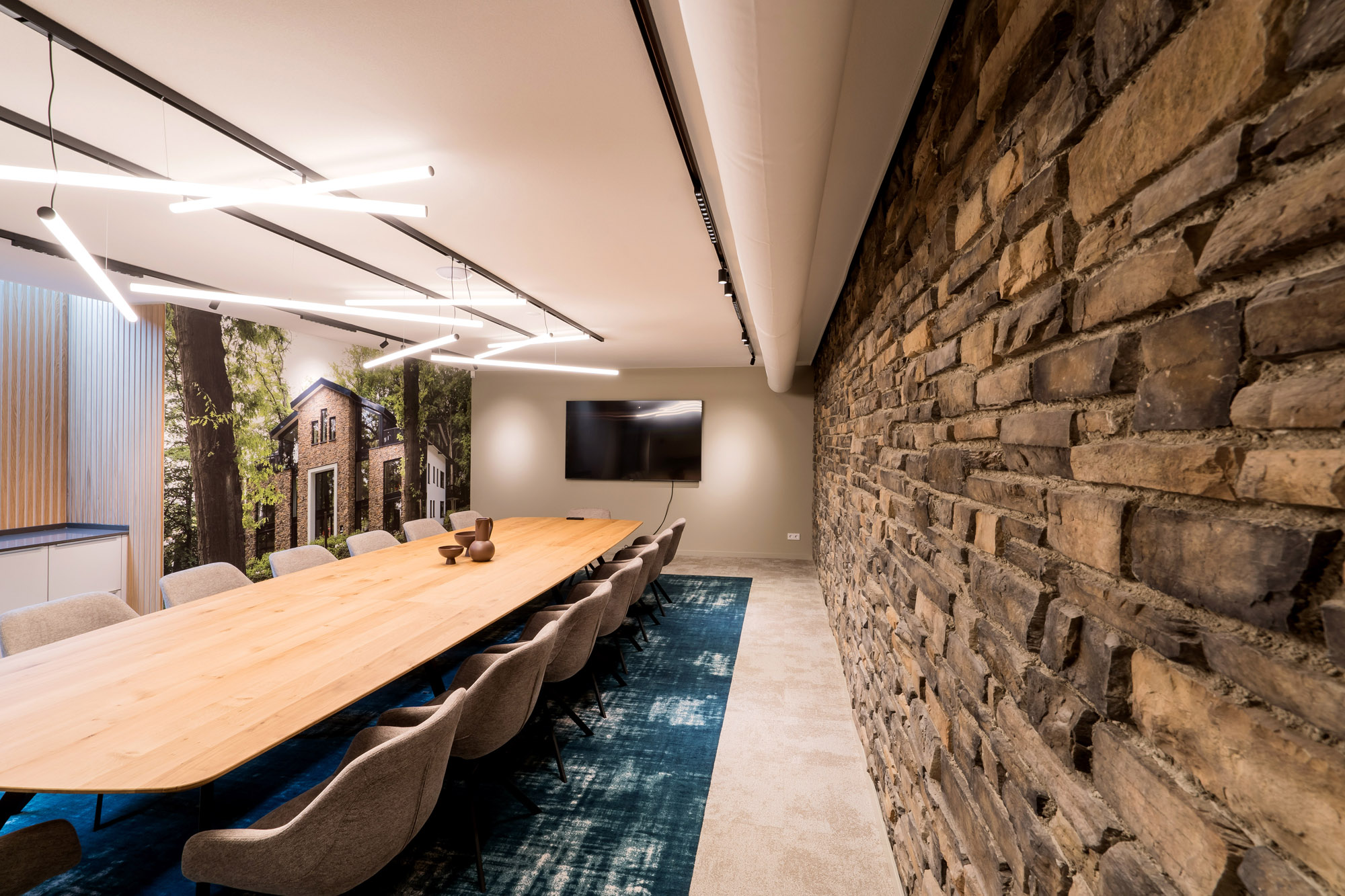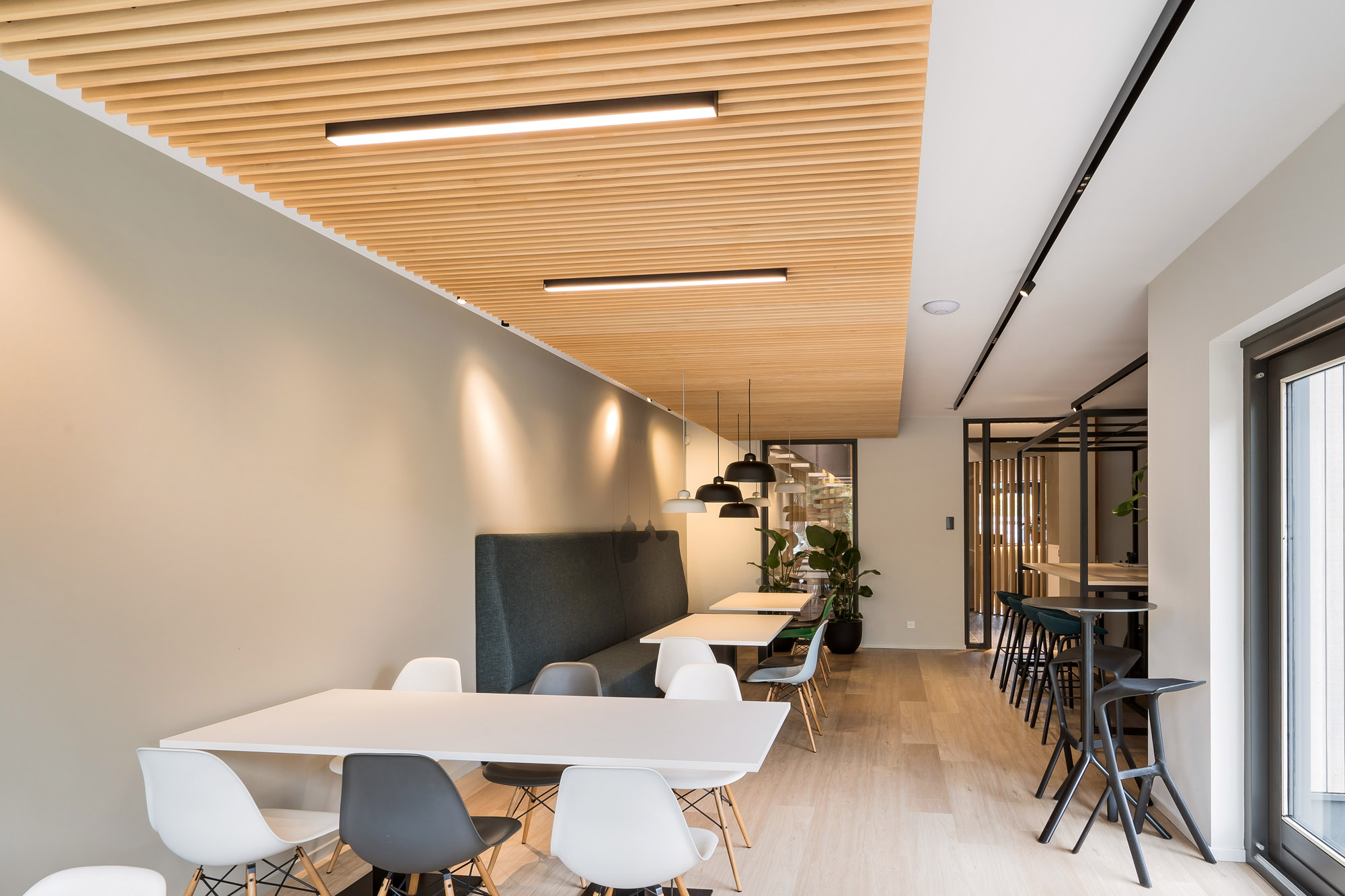 Het bestaande kantoorgebouw was voor ons geen onbekend pand. Met eerdere verbouwingen zijn systeemwanden en akoestische plafonds toegepast die in de huidige renovatie opnieuw gebruikt en uitgebreid zijn. Het gebruikte OWAplan is een naadloos akoestische plafond dat echo en galm reduceert, zorgt voor betere verstaanbaarheid en de rust en het comfort in de ruimte verhoogt. De bestaande stalen systeemwanden uit onze VNS-serie zijn gedemonteerd en opnieuw toegepast als binnenwanden. Onze duurzame WoodFrame Slim glaswanden zorgen voor transparantie en zijn, samen met de kleur van het verdekte systeemplafond en alle VNS wanden afgestemd op de rest van het interieur. Diverse houten interieuraccenten maken het project compleet, zoals de massief eiken leuningen langs de balustrade en trappen.