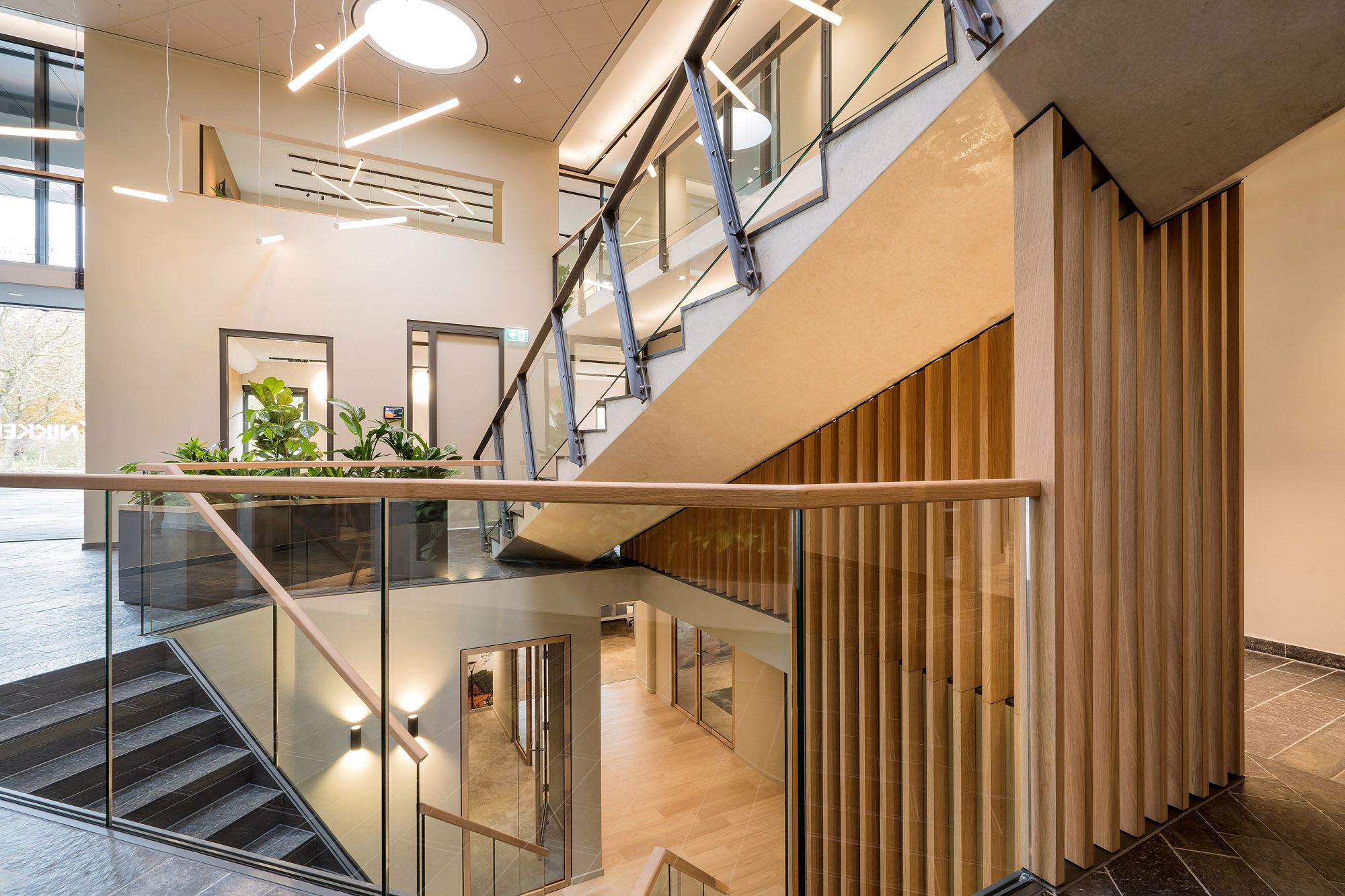 Minstens zo belangrijk zijn natuurlijk de werkplekken voor alle (toekomstige) medewerkers. Een fijn binnenklimaat, daglicht en goede inrichting speelden een belangrijke rol bij het interieurontwerp dat is gemaakt door I’M Architecten uit Deventer. Er is sfeer gecreëerd door juist gebruik van kleuren en materialen. De binnenruimtes voelen ruimtelijker aan doordat de kelder meer betrokken is bij het kantoor door middel van een nieuwe trap in de centrale hal. De wens van Nikkels voor meer spreekkamers en meer huiselijke sfeer is meegenomen in het plan van I’M Architecten met als hoofddoel het creëren van flexibele en inspirerende werkruimtes.