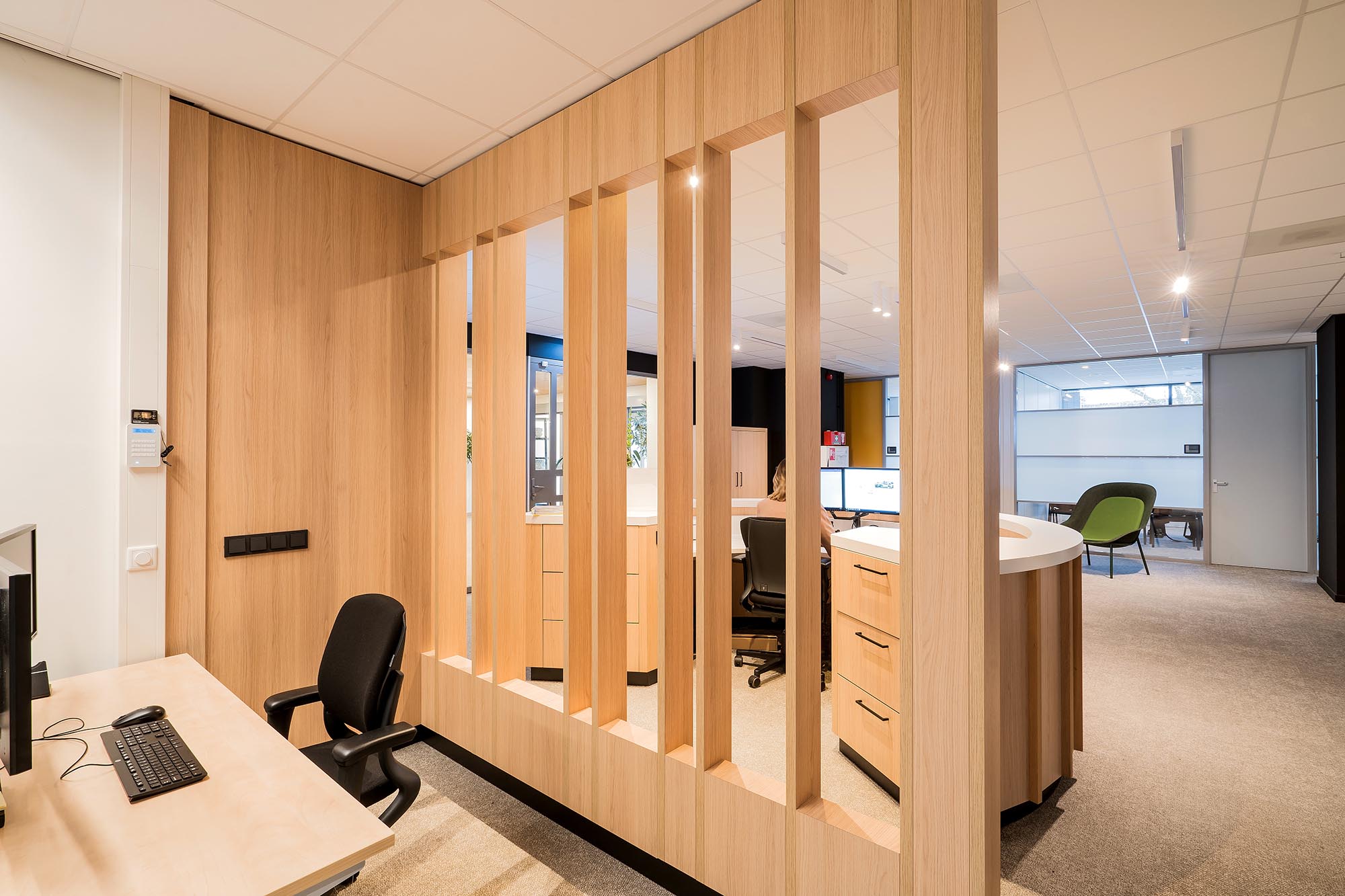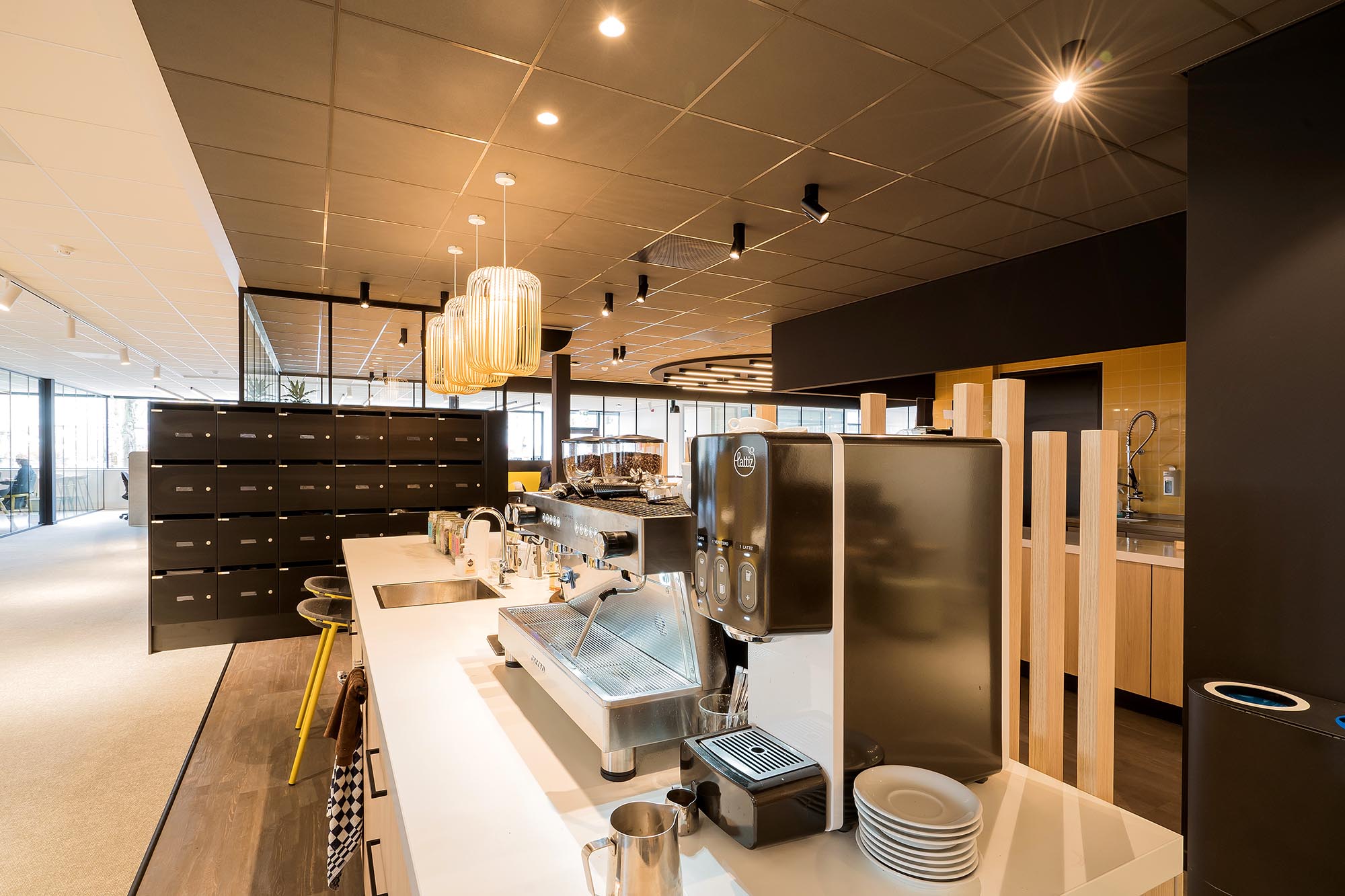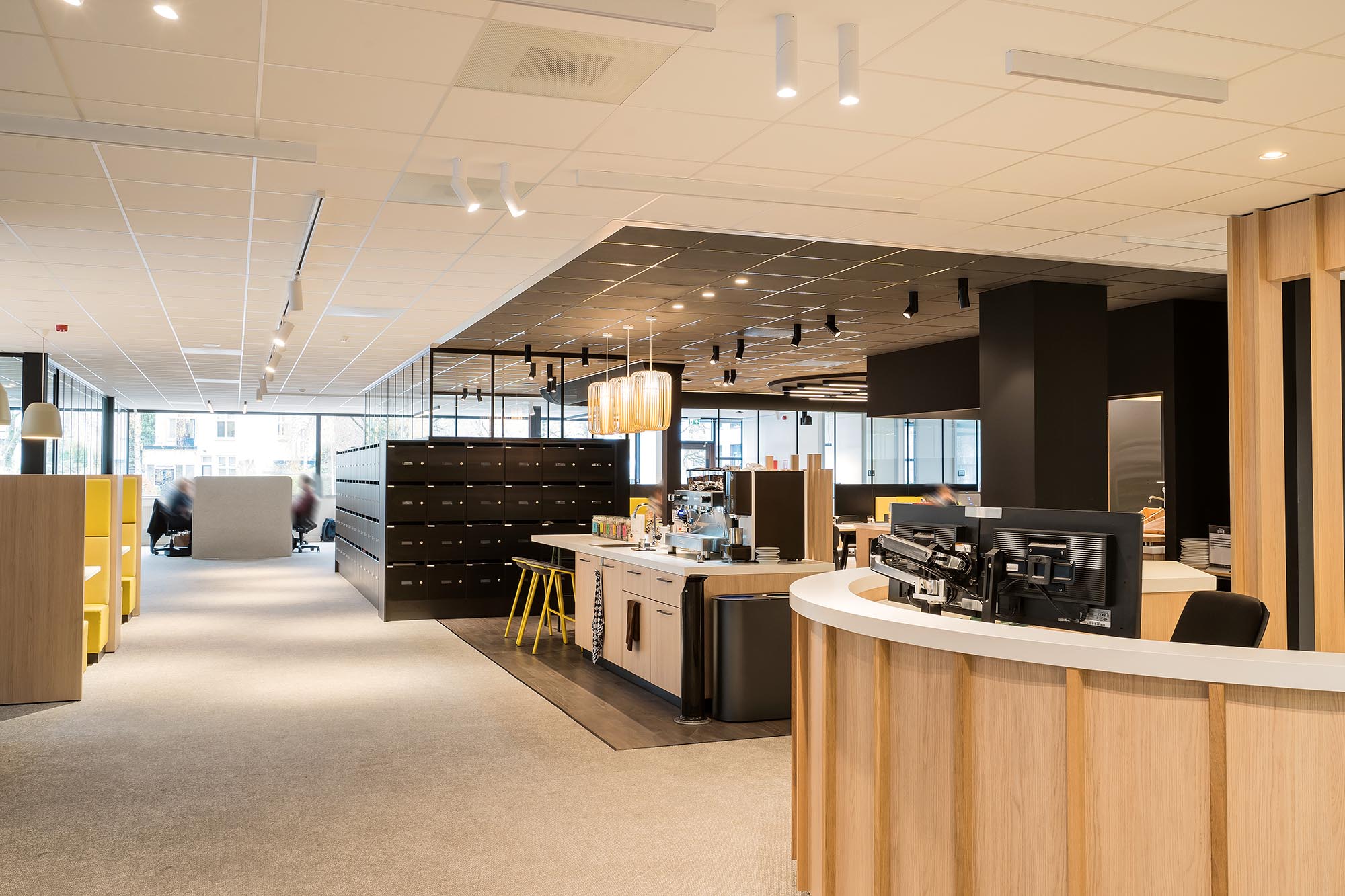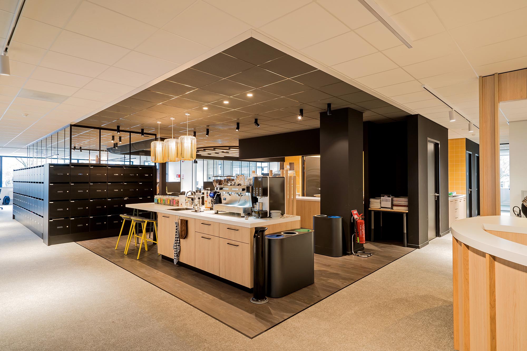 De opvallende ontvangstbalie en maatwerk koffiecorner dragen bij aan de sfeer van de werkvloer. Bij binnenkomst krijgen de gasten gelijk de mogelijkheid om tot rust te komen. De treincoupés en kasten zijn verwerkt tot één maatwerk meubel. De keuken voor de medewerkers sluit perfect aan bij de pantry en vormen de spil van het informele middengedeelte.