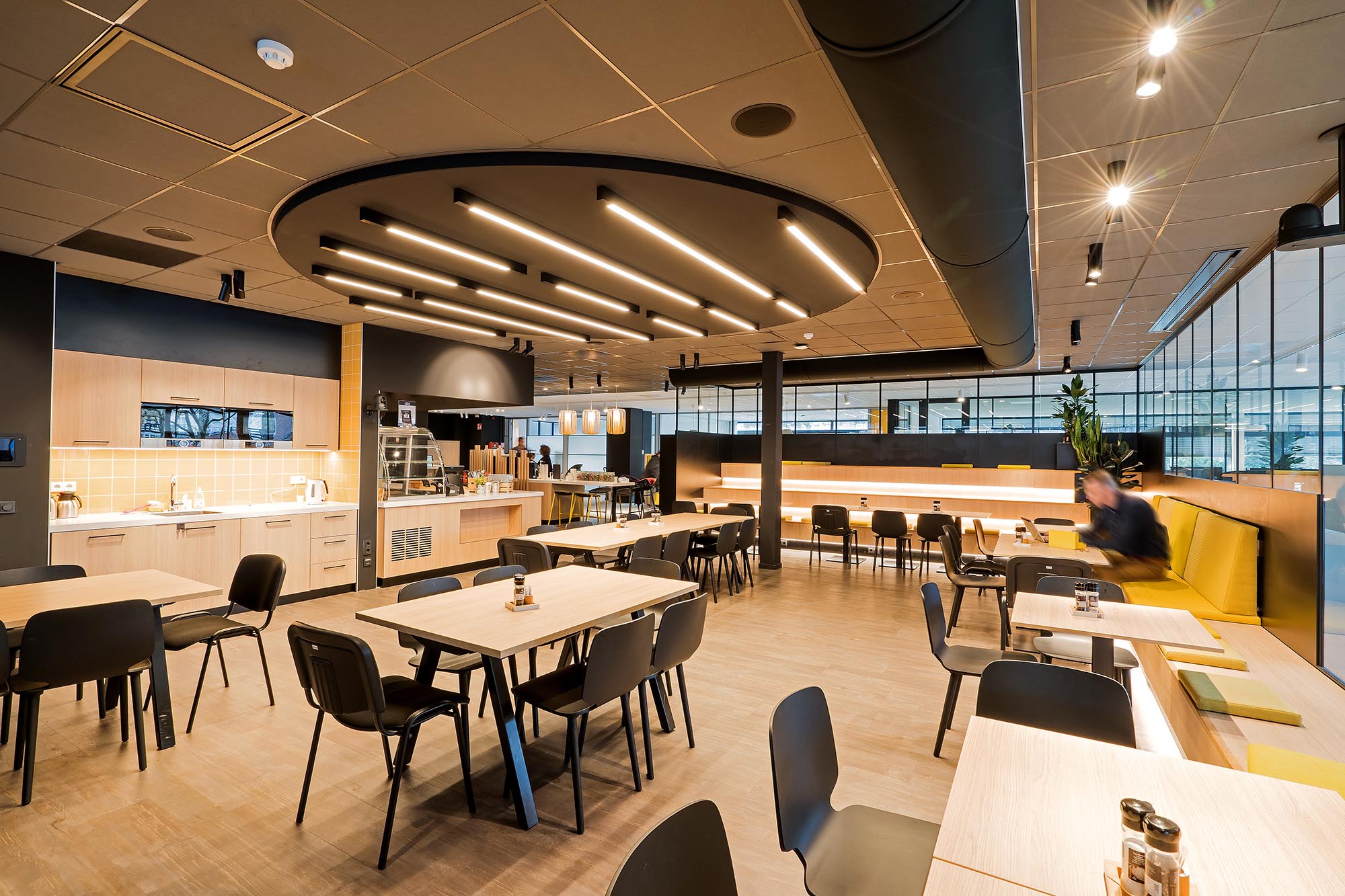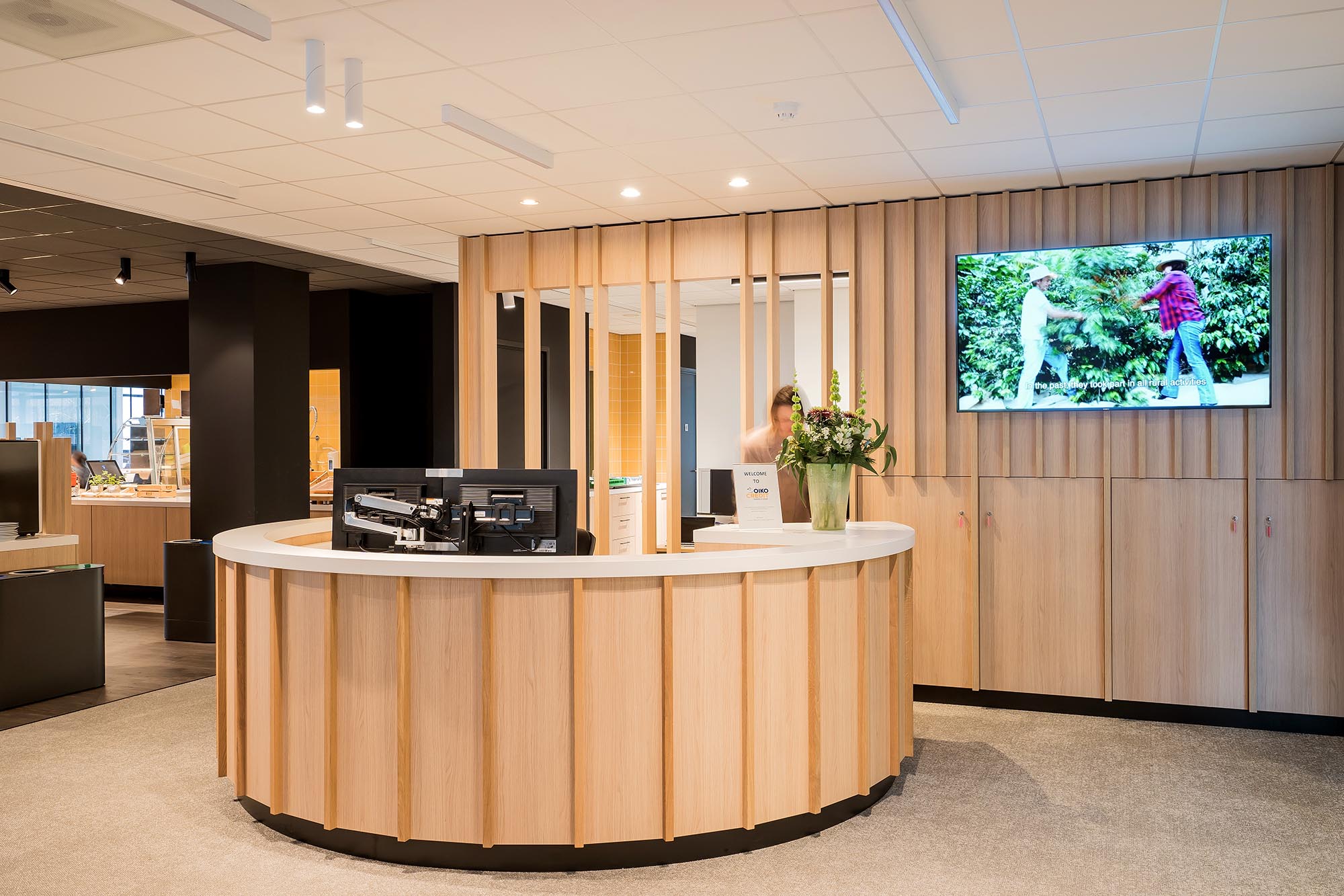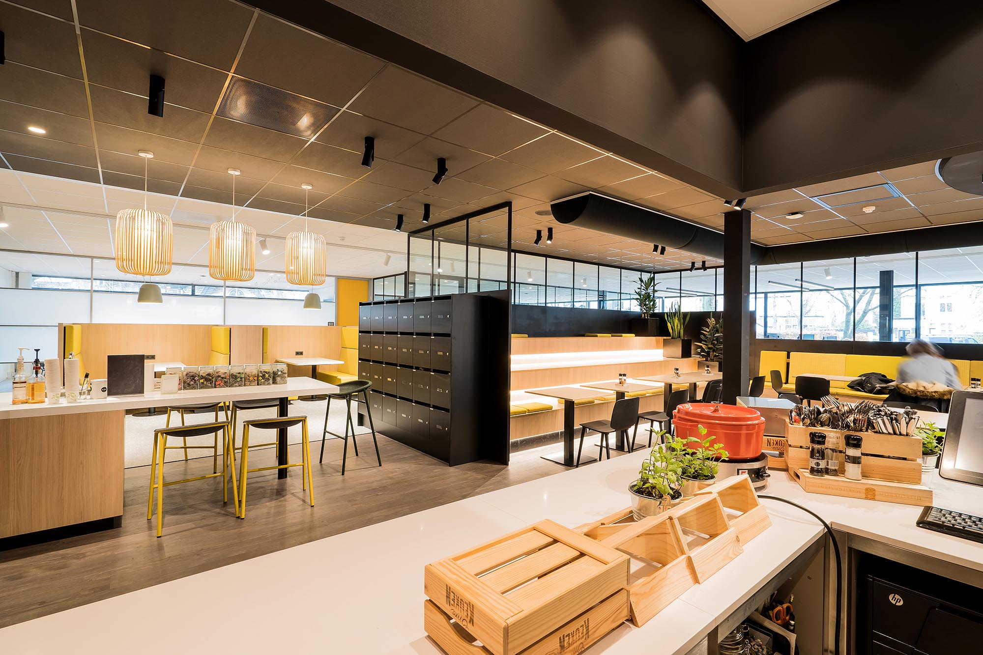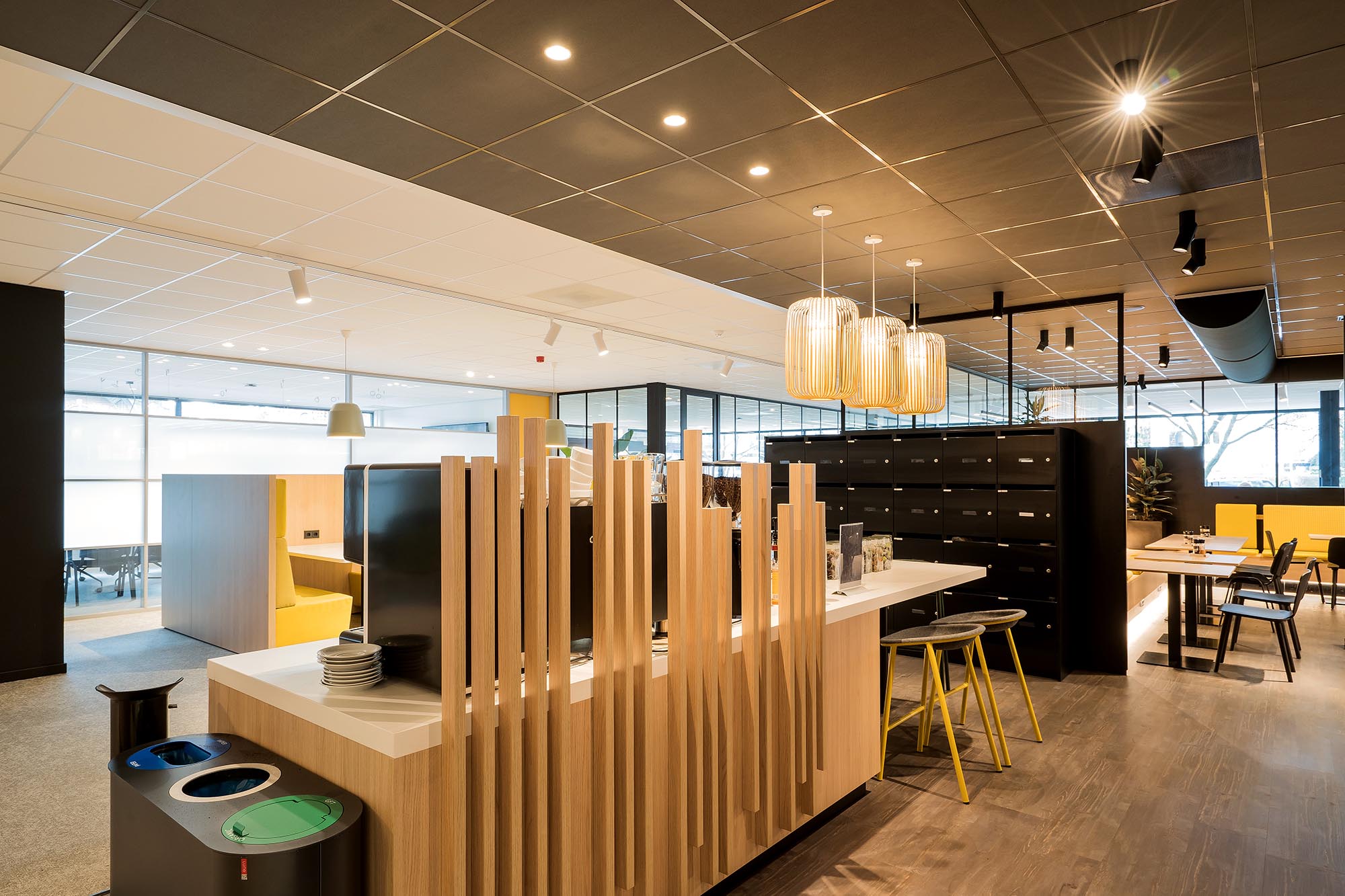 De opvallende ontvangstbalie en maatwerk koffiecorner dragen bij aan de sfeer van de werkvloer. Bij binnenkomst krijgen de gasten gelijk de mogelijkheid om tot rust te komen. De treincoupés en kasten zijn verwerkt tot één maatwerk meubel. De keuken voor de medewerkers sluit perfect aan bij de pantry en vormen de spil van het informele middengedeelte.
