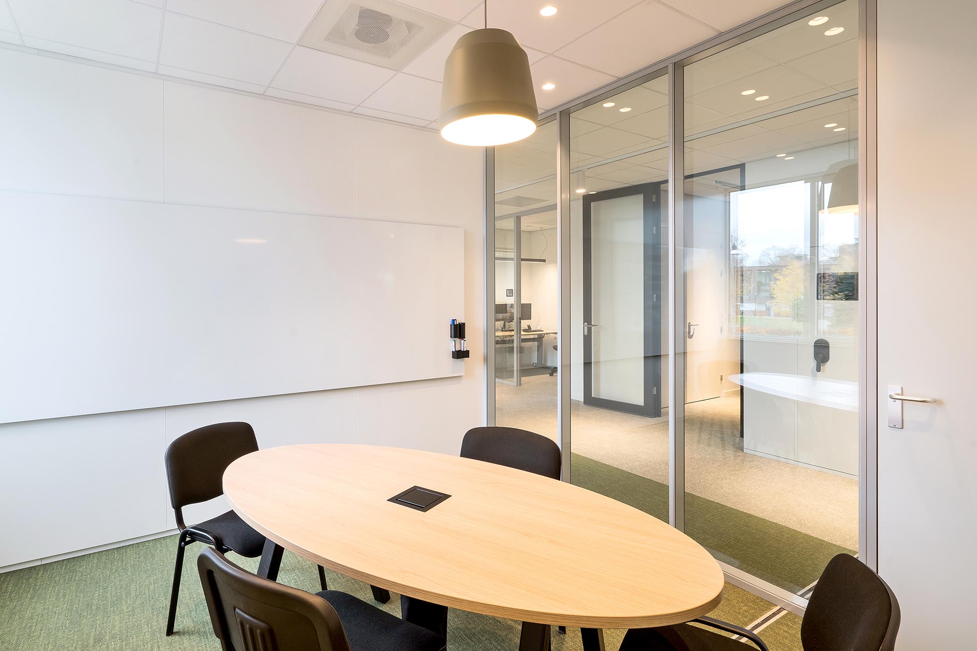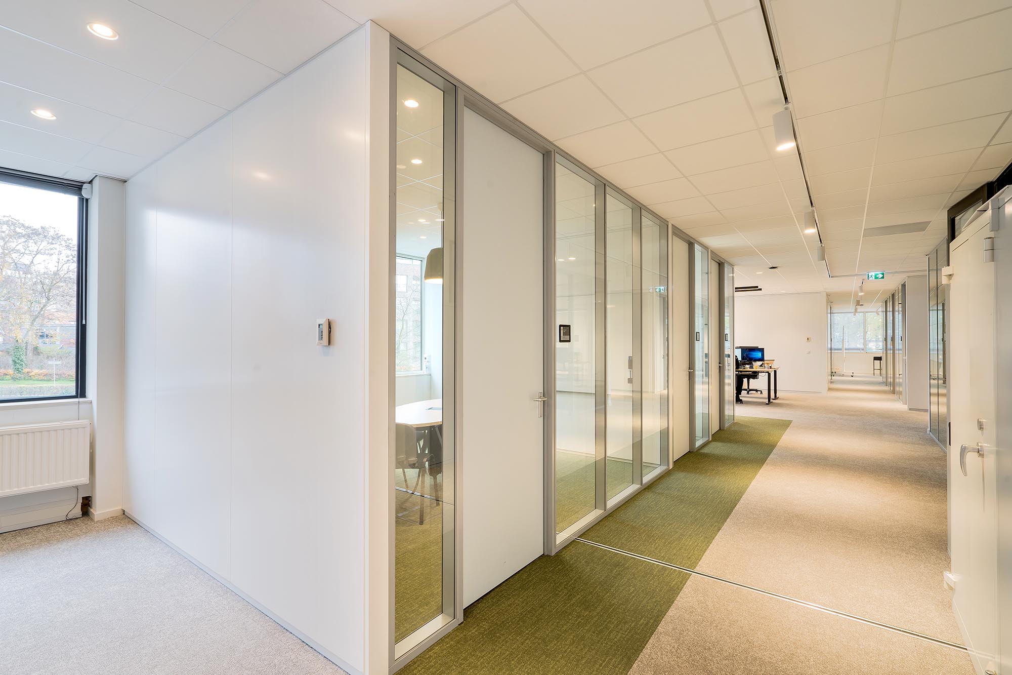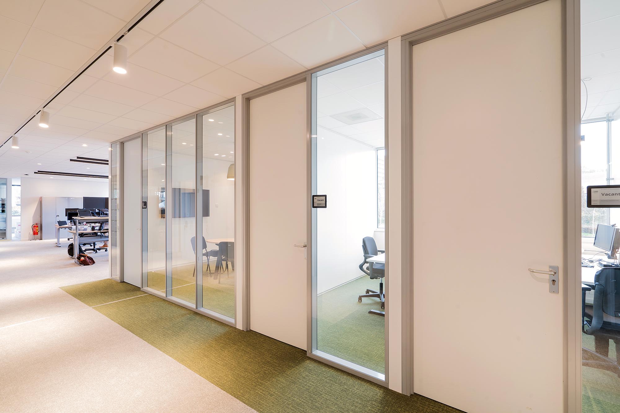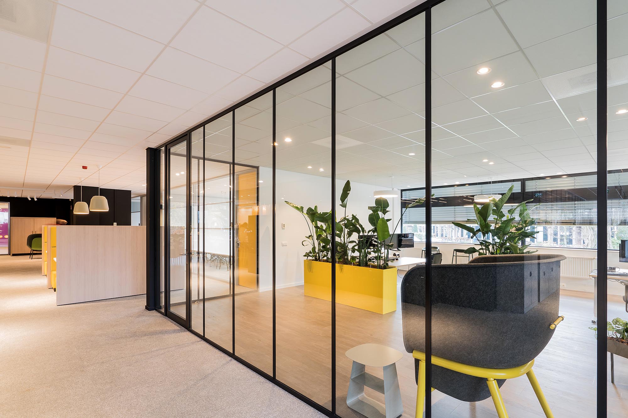 Uiteraard speelt ook privacy en rust een belangrijke rol. Zo is er gekozen voor onze stalen systeemwand met een geluidsisolatie van Rw=54dB als dichte wand tussen de overlegplekken. Om de zichtlijnen en transparantie te waarborgen is onze ClassicFrame ECO toegepast op de gangpaden en als afscheiding tussen de ontmoetingsruimte en de kantoorplekken.