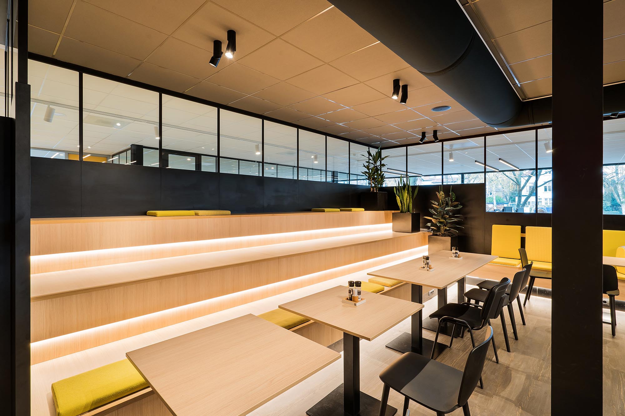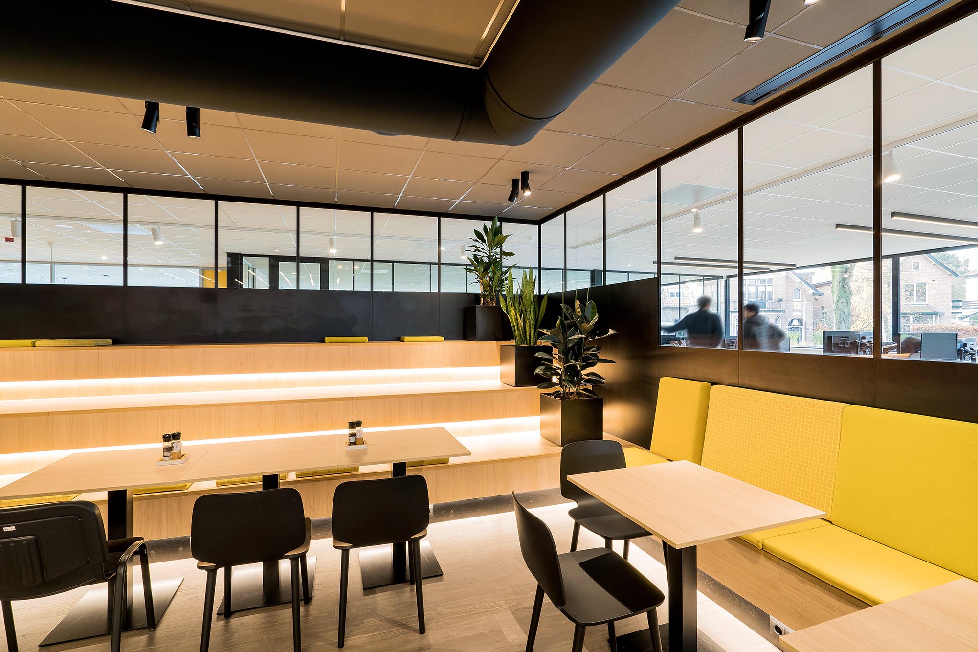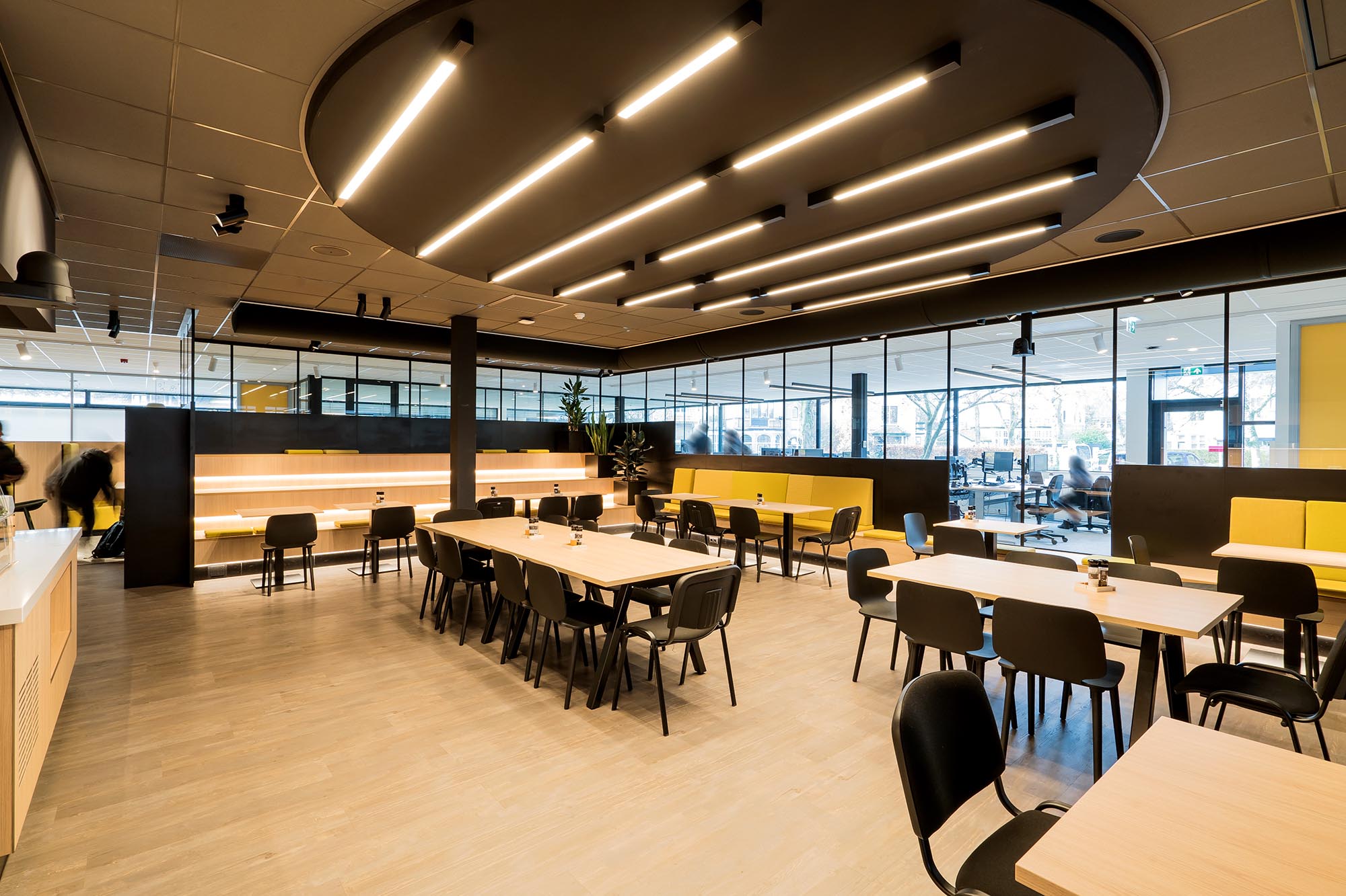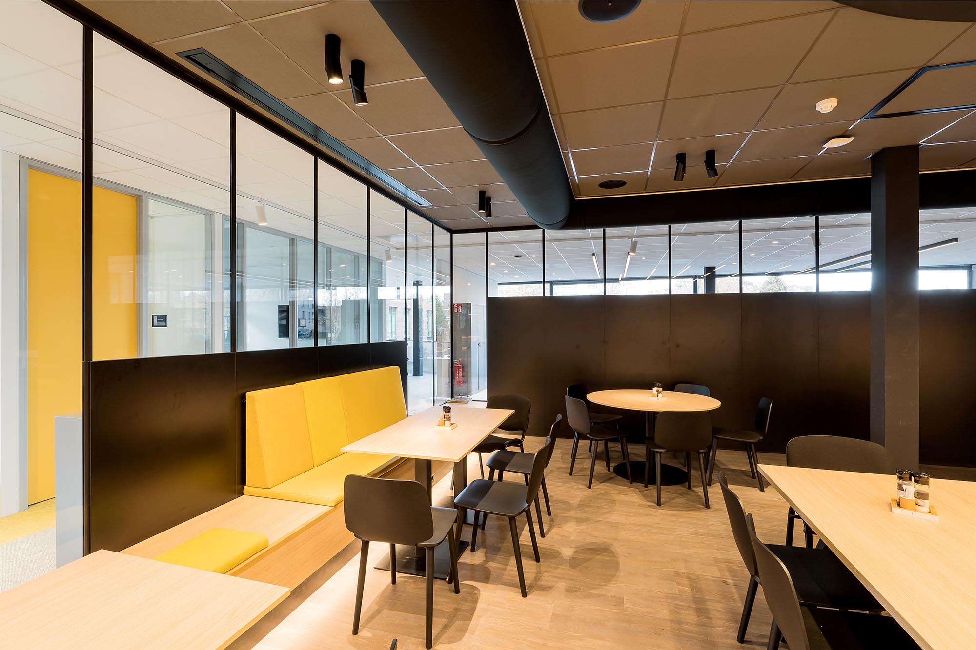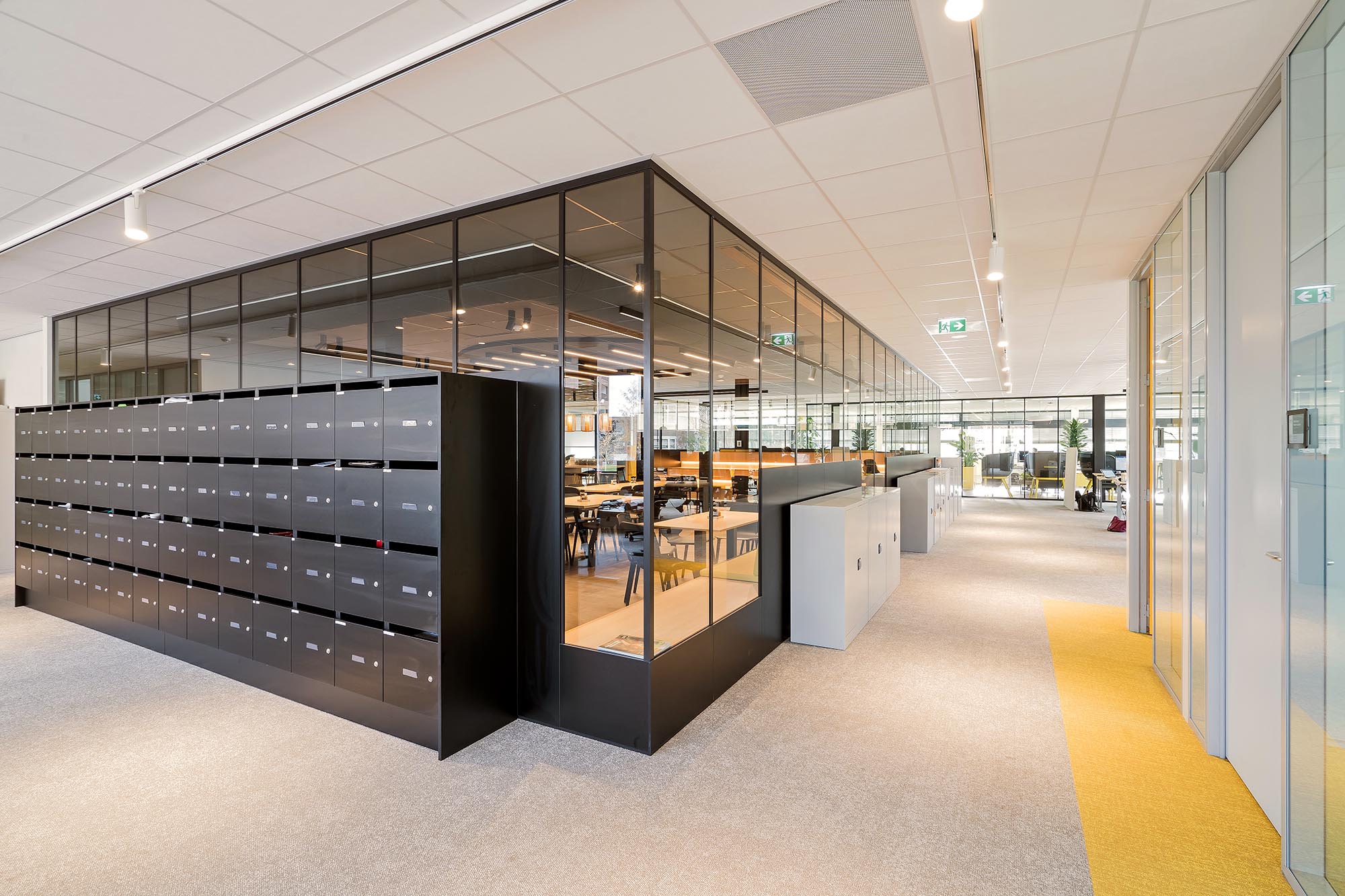 Uiteraard speelt ook privacy en rust een belangrijke rol. Zo is er gekozen voor onze stalen systeemwand met een geluidsisolatie van Rw=54dB als dichte wand tussen de overlegplekken. Om de zichtlijnen en transparantie te waarborgen is onze ClassicFrame ECO toegepast op de gangpaden en als afscheiding tussen de ontmoetingsruimte en de kantoorplekken.