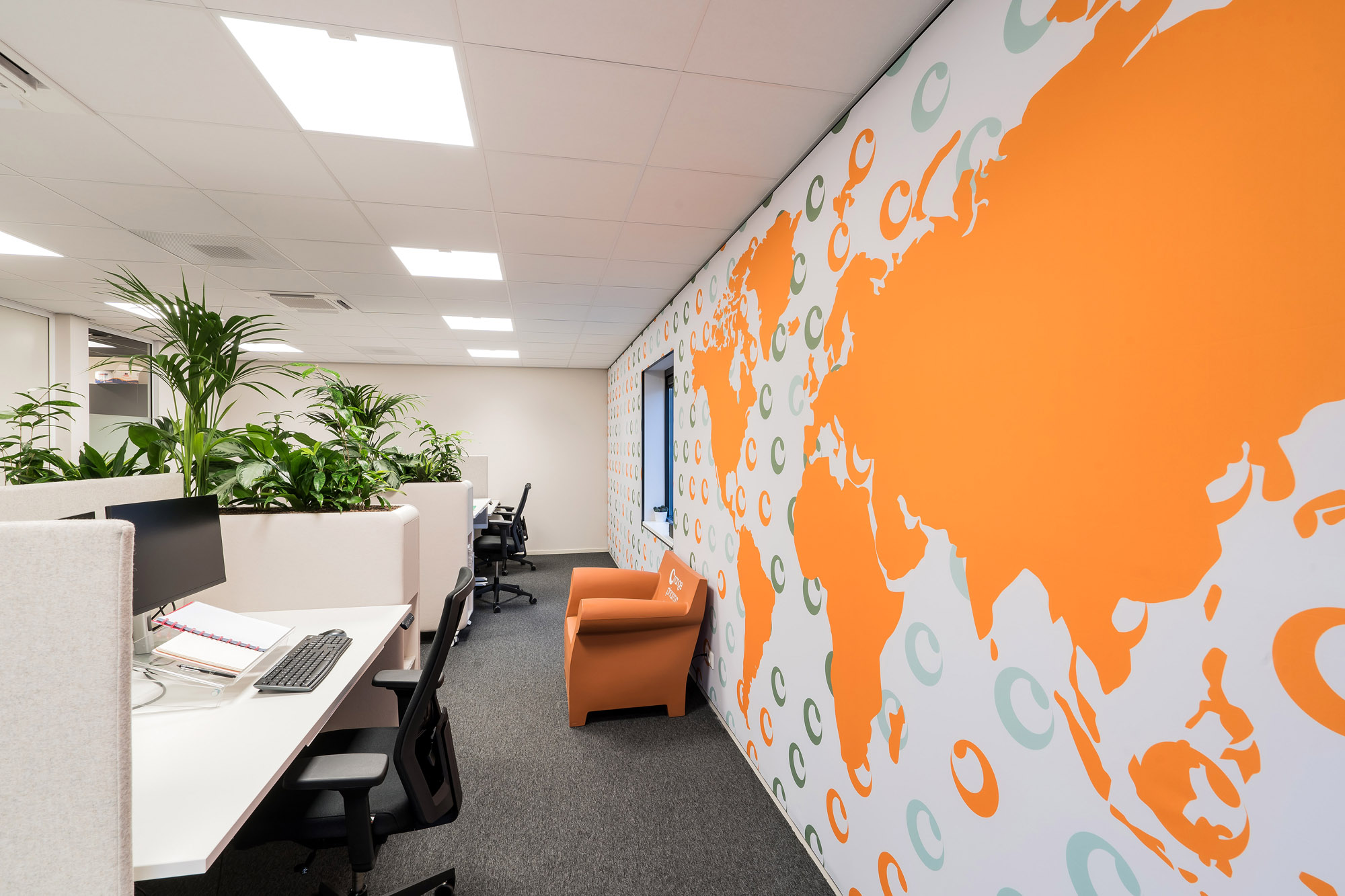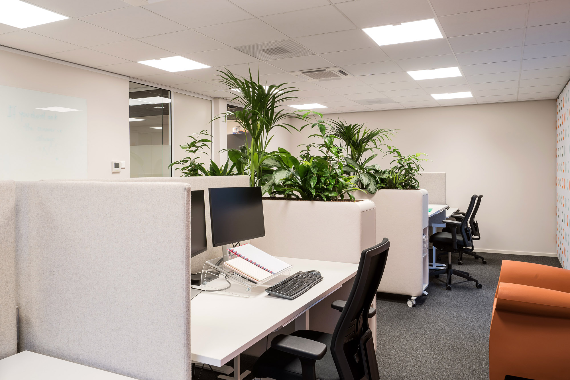 Ook zijn er grote visuals aan de wanden gemonteerd met akoestische vulling om zo de akoestiek positief te beïnvloeden. De werkplekken zijn afgeschermd met akoestische panelen zodat de medewerkers op een comfortabele manier de werkzaamheden kunnen uitvoeren.