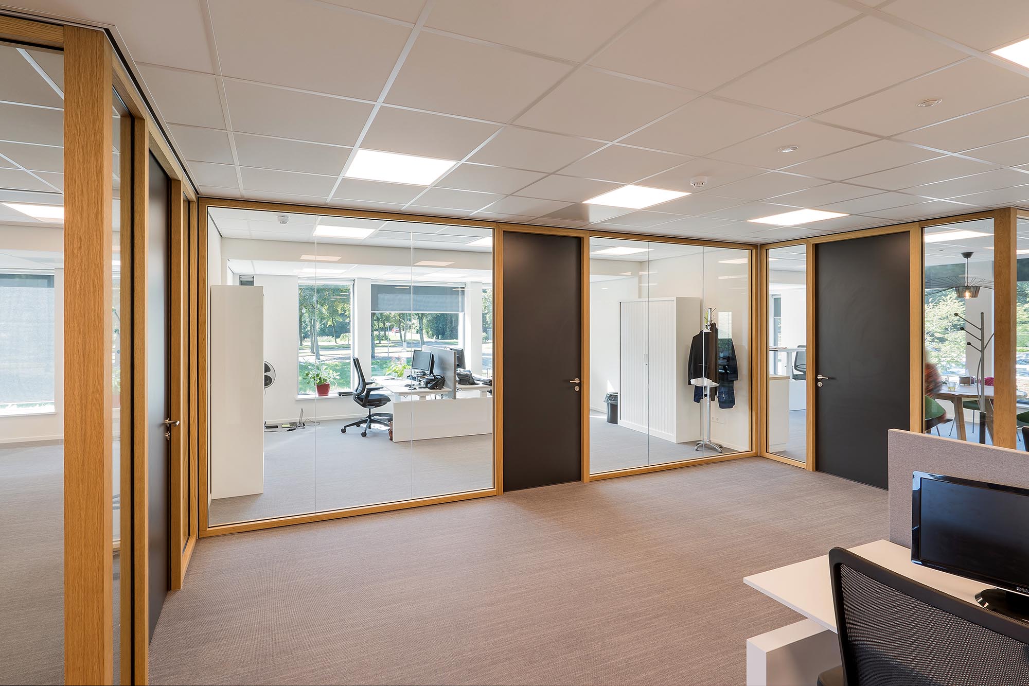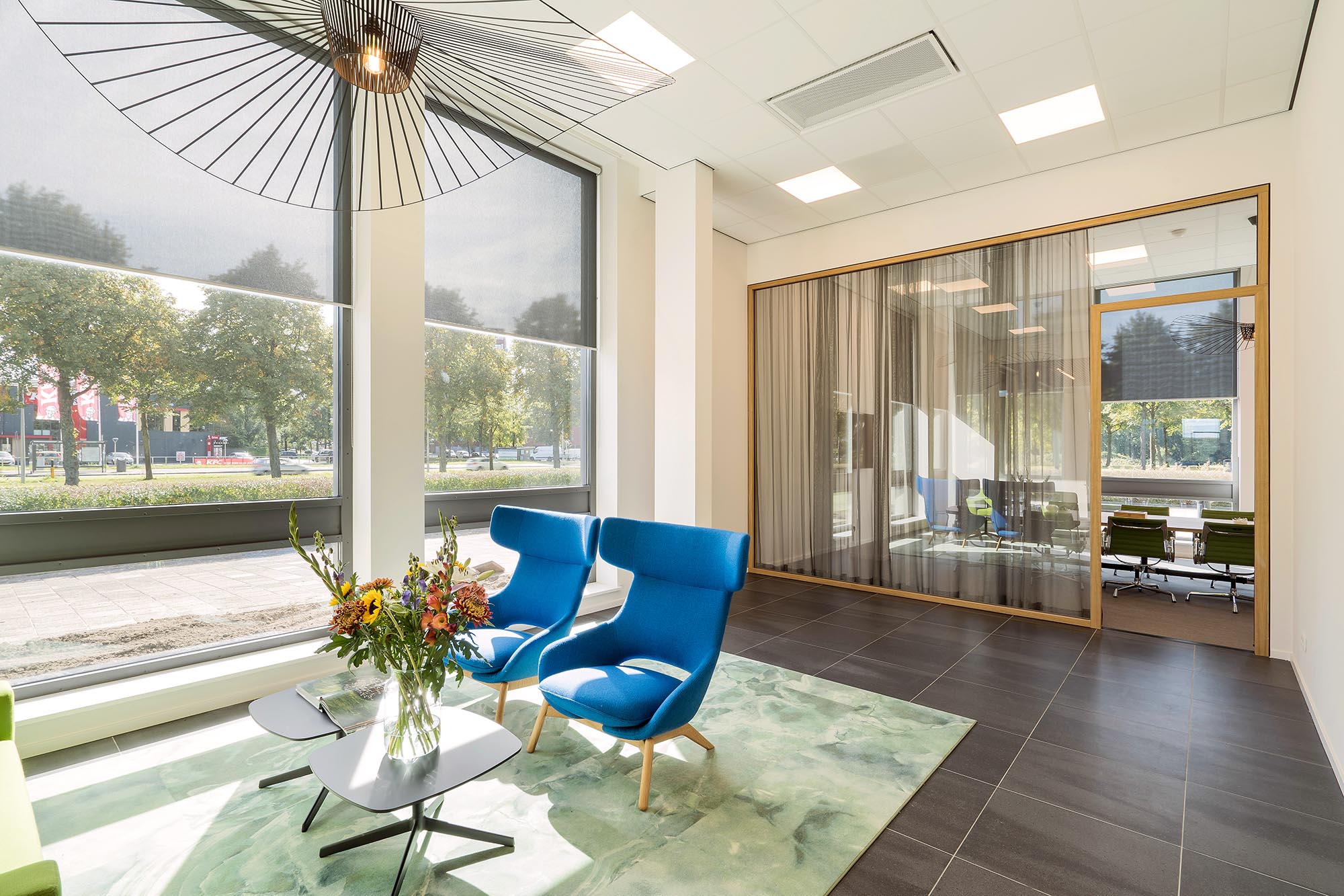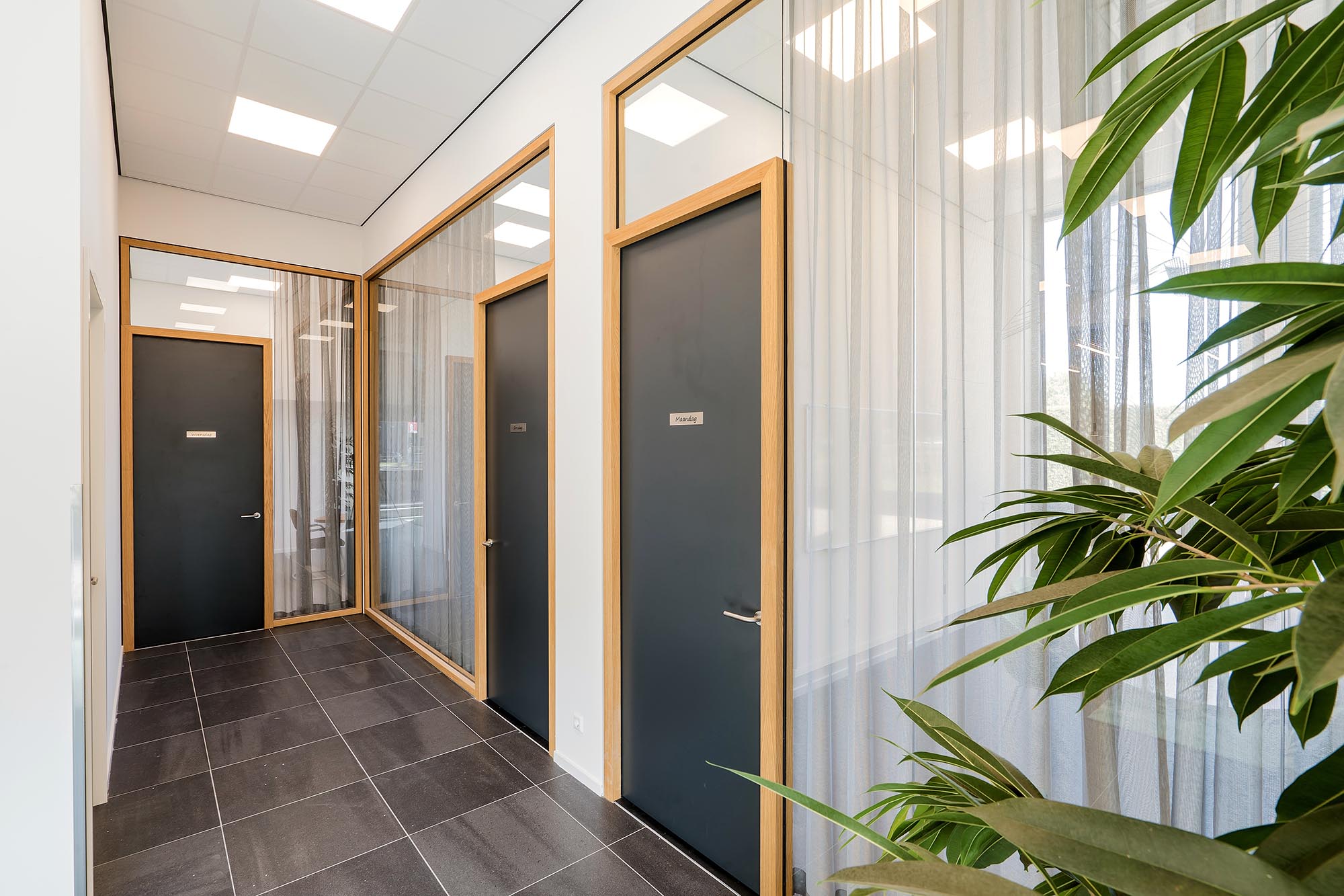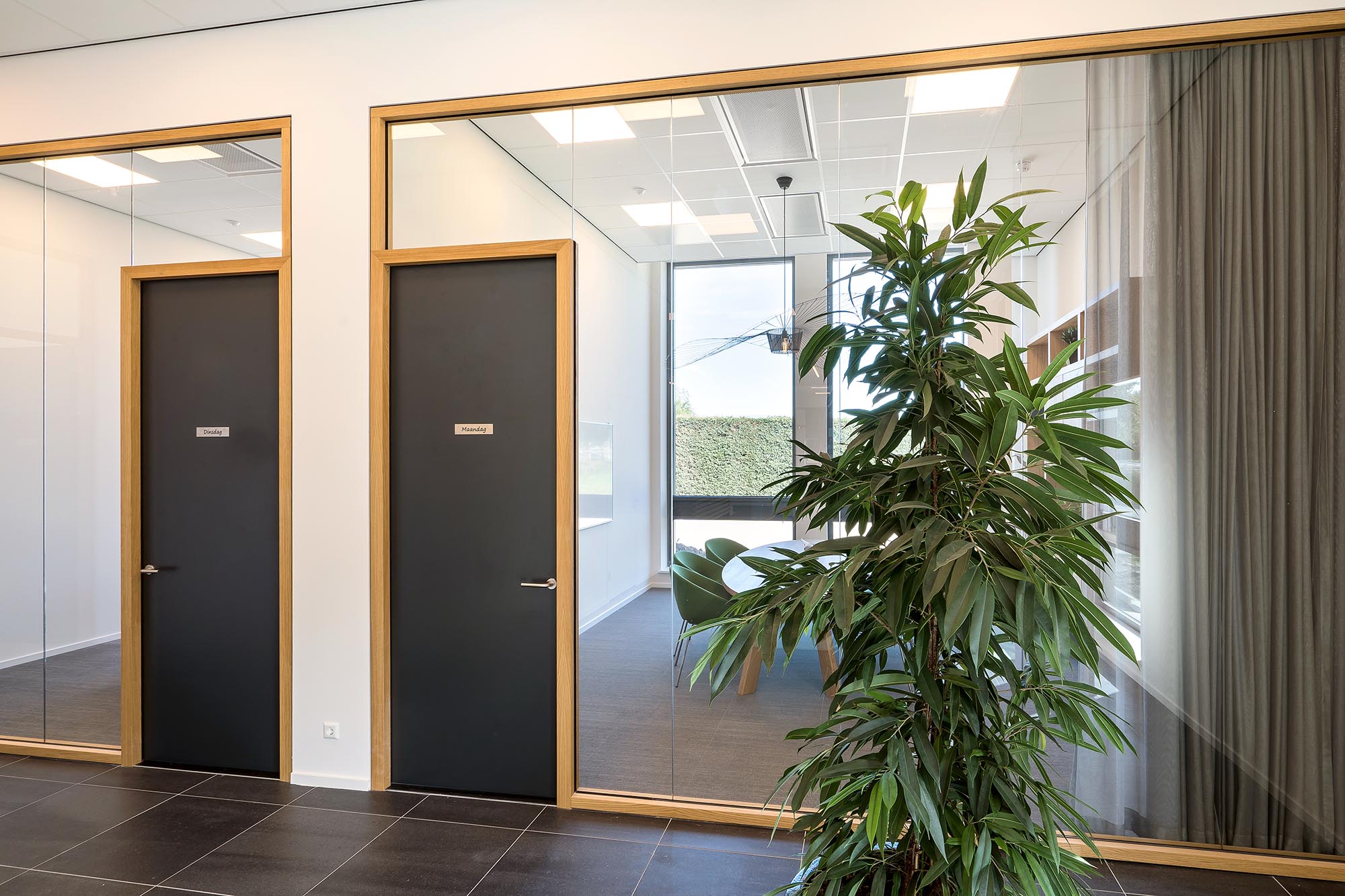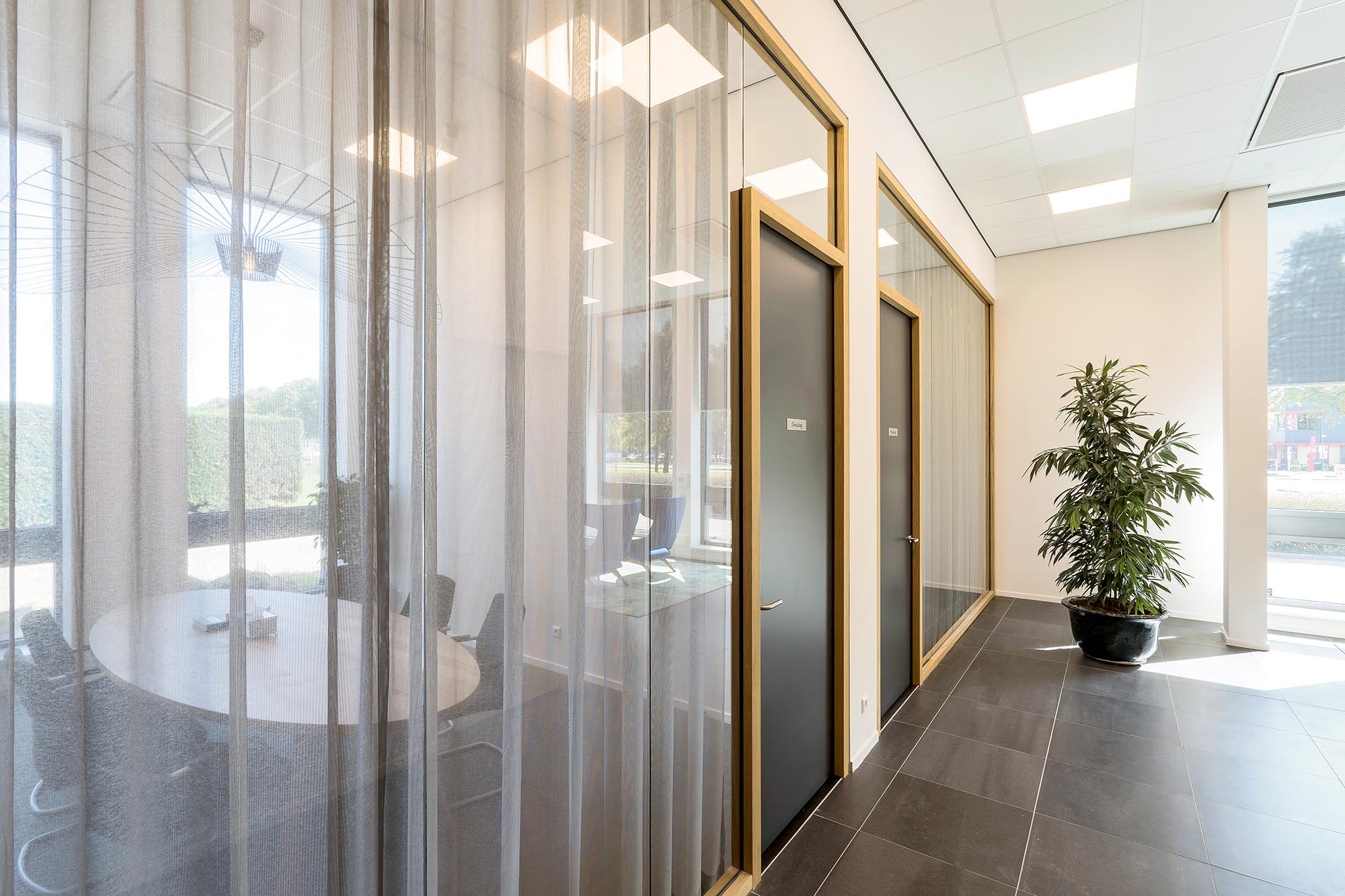 Er is gekozen voor glaswanden met houten profielen voor de ontvangkamer. Dit geeft bij binnenkomst een ruimtelijke en open sfeer. Naast het open uiterlijk en de voordelen van bestaand daglicht bieden de glaswanden voldoende privacy qua geluidsisolatie. De vitrage draagt verder bij aan de privacy.