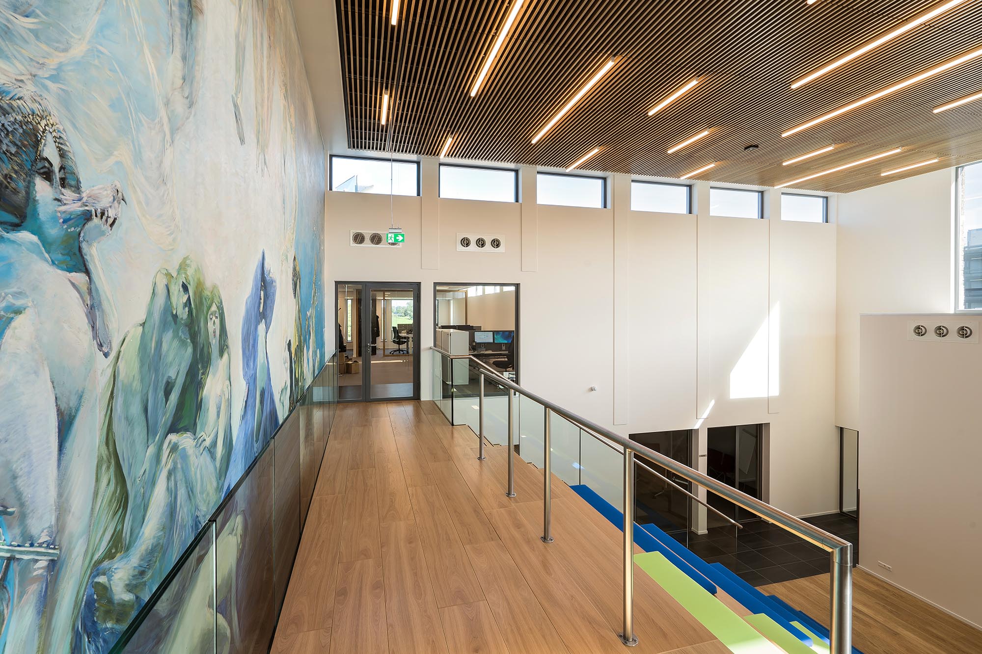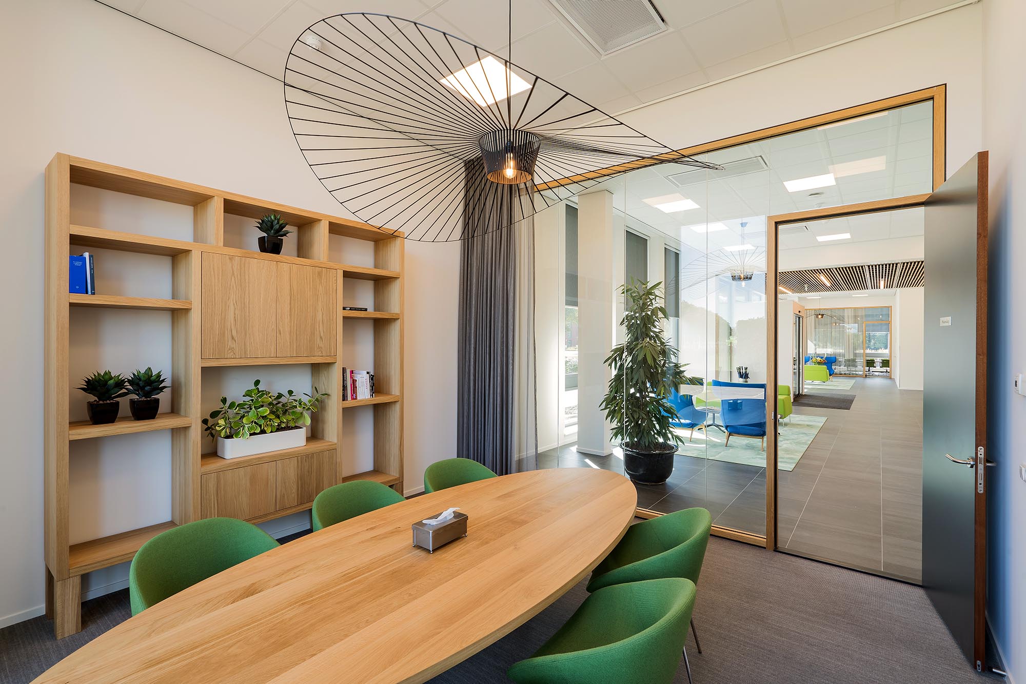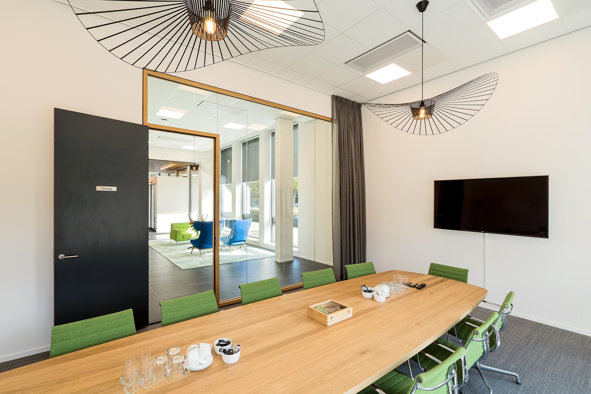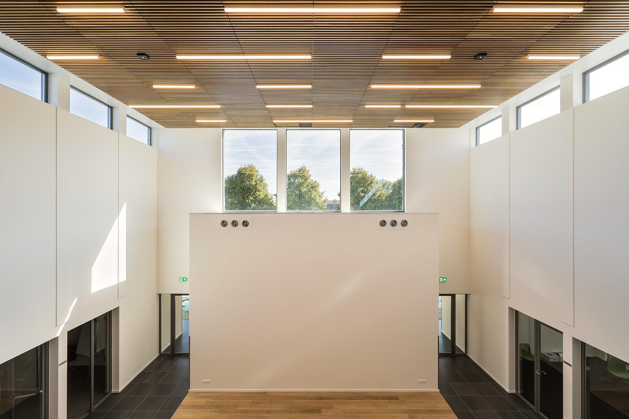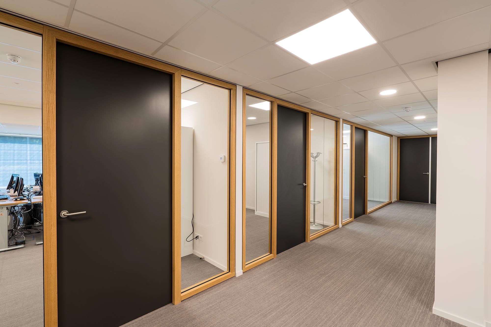 Er is gekozen voor glaswanden met houten profielen voor de ontvangkamer. Dit geeft bij binnenkomst een ruimtelijke en open sfeer. Naast het open uiterlijk en de voordelen van bestaand daglicht bieden de glaswanden voldoende privacy qua geluidsisolatie. De vitrage draagt verder bij aan de privacy.