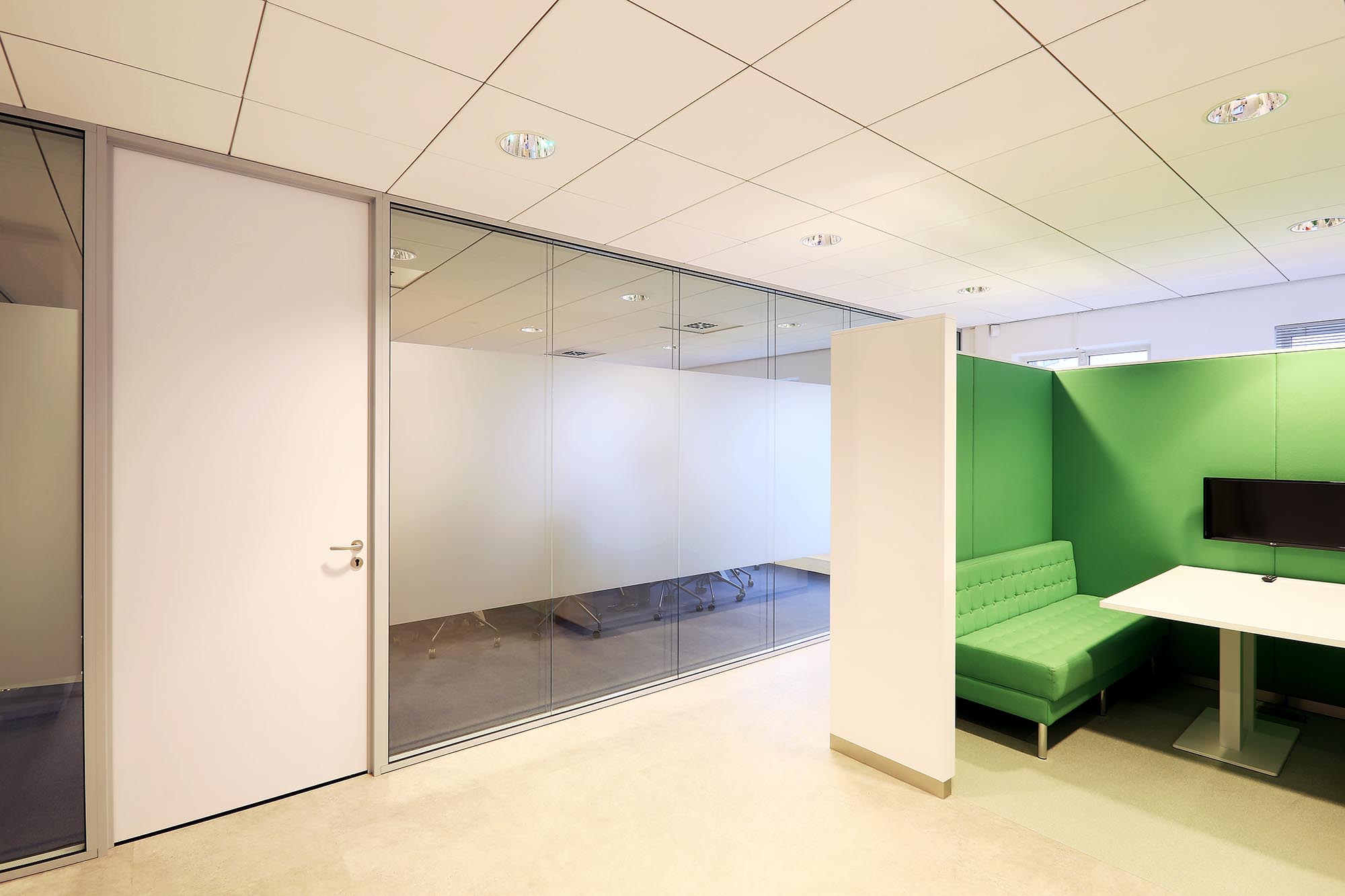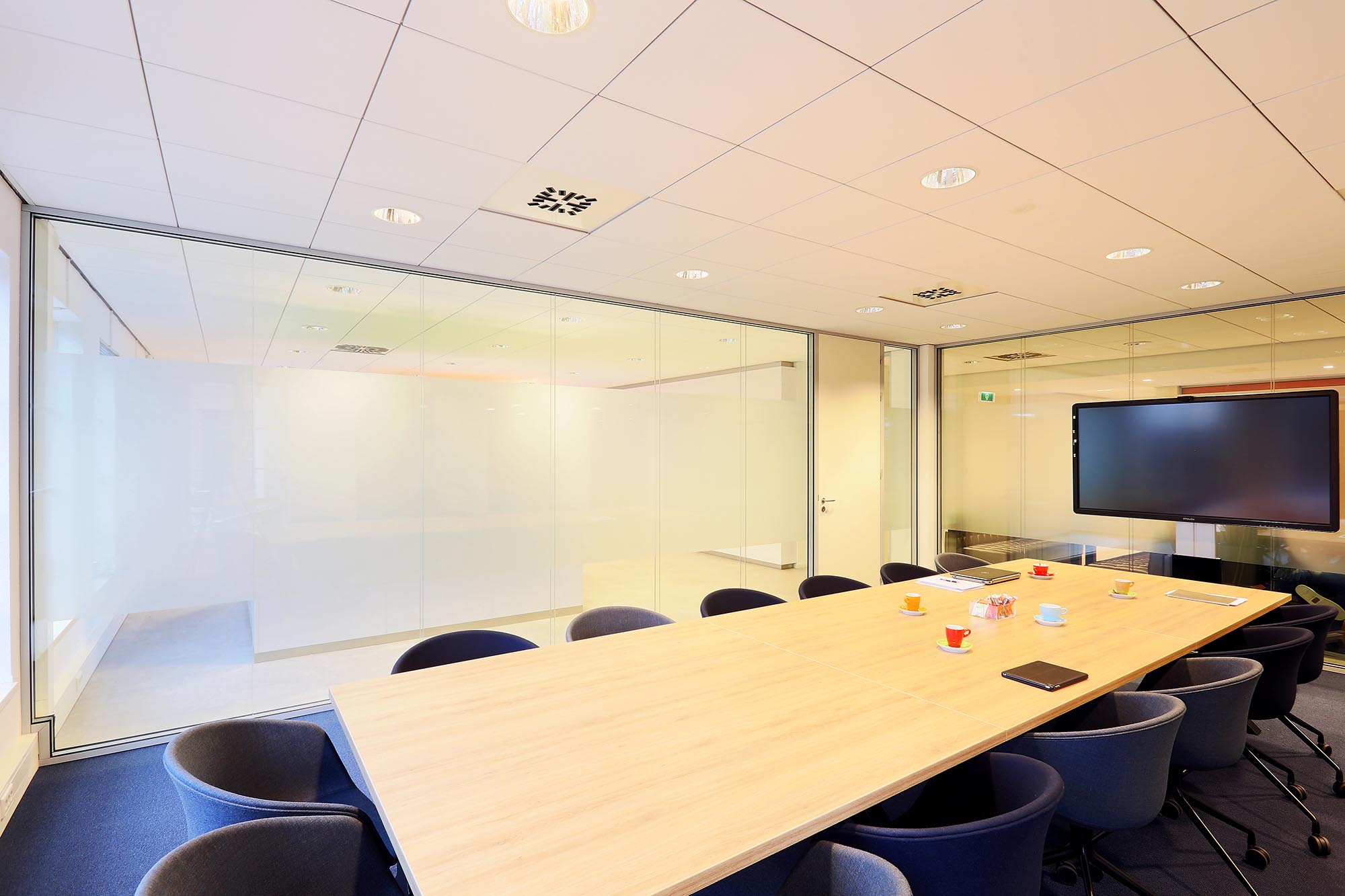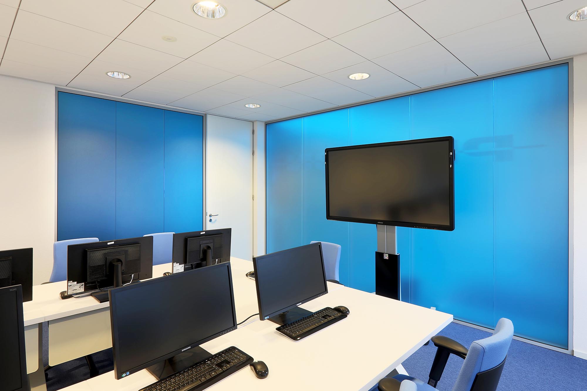 Voor de cursusruimten en boardroom zijn zeer speciale glazen systeemwanden toegepast. Onze TWIN wand heeft met haar dubbele glaspanelen een hoge geluidwerendheid van Rw=50 dB.