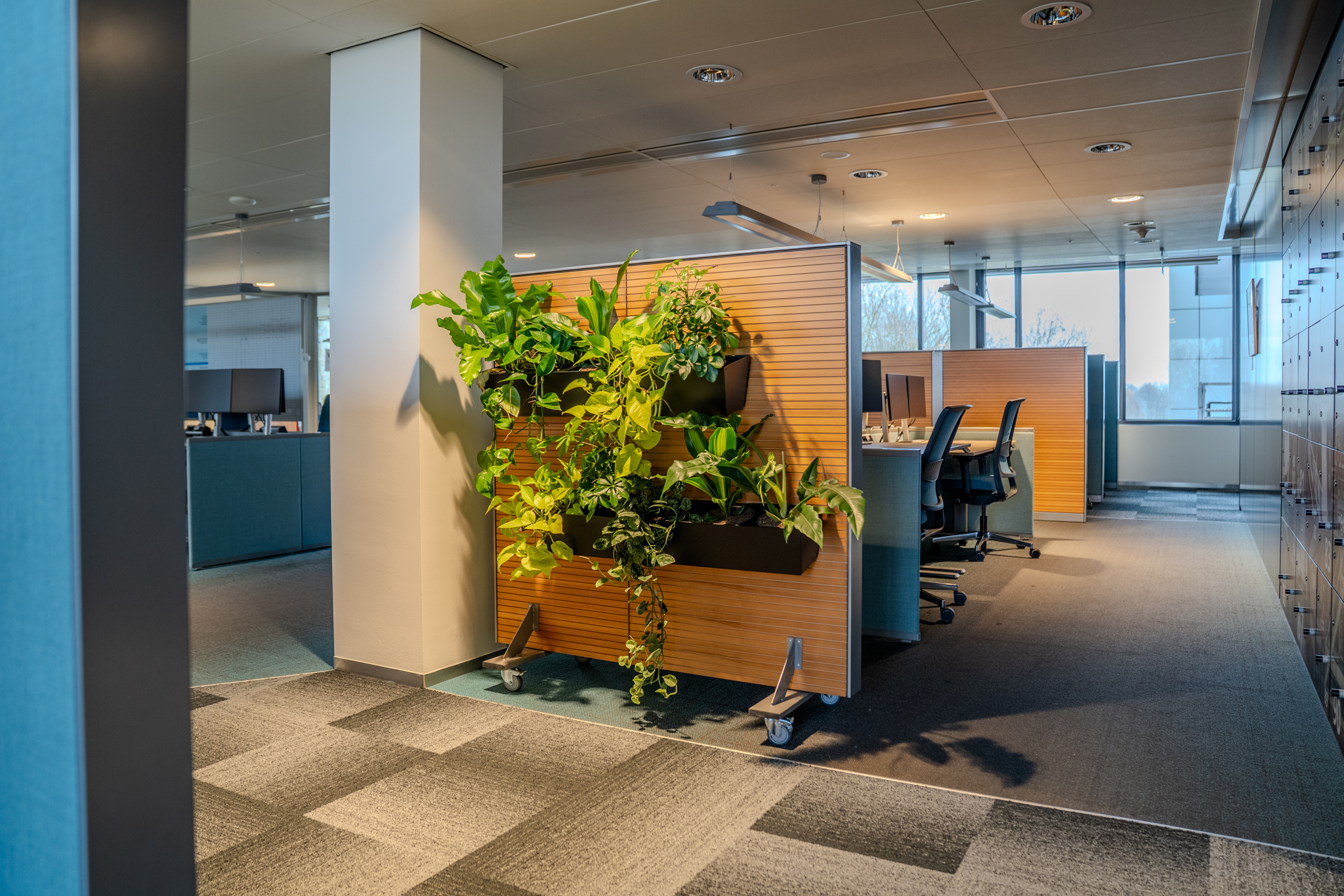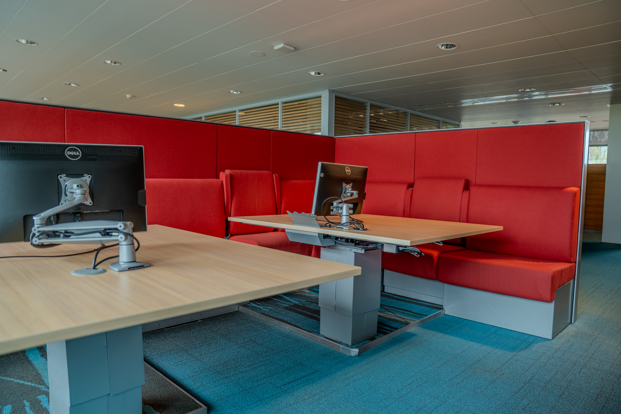 Een belangrijk onderdeel van het project is het hergebruik van bestaande interieuronderdelen. Meubels, wandpanelen en andere elementen worden waar mogelijk gedemonteerd, opgeknapt en opnieuw toegepast. Zo kregen onder meer lockers een nieuw front en slot, zijn houten wandpanelen hergebruikt in combinatie met whiteboards en zijn lounge-elementen getransformeerd tot compacte treinzit werkplekken.