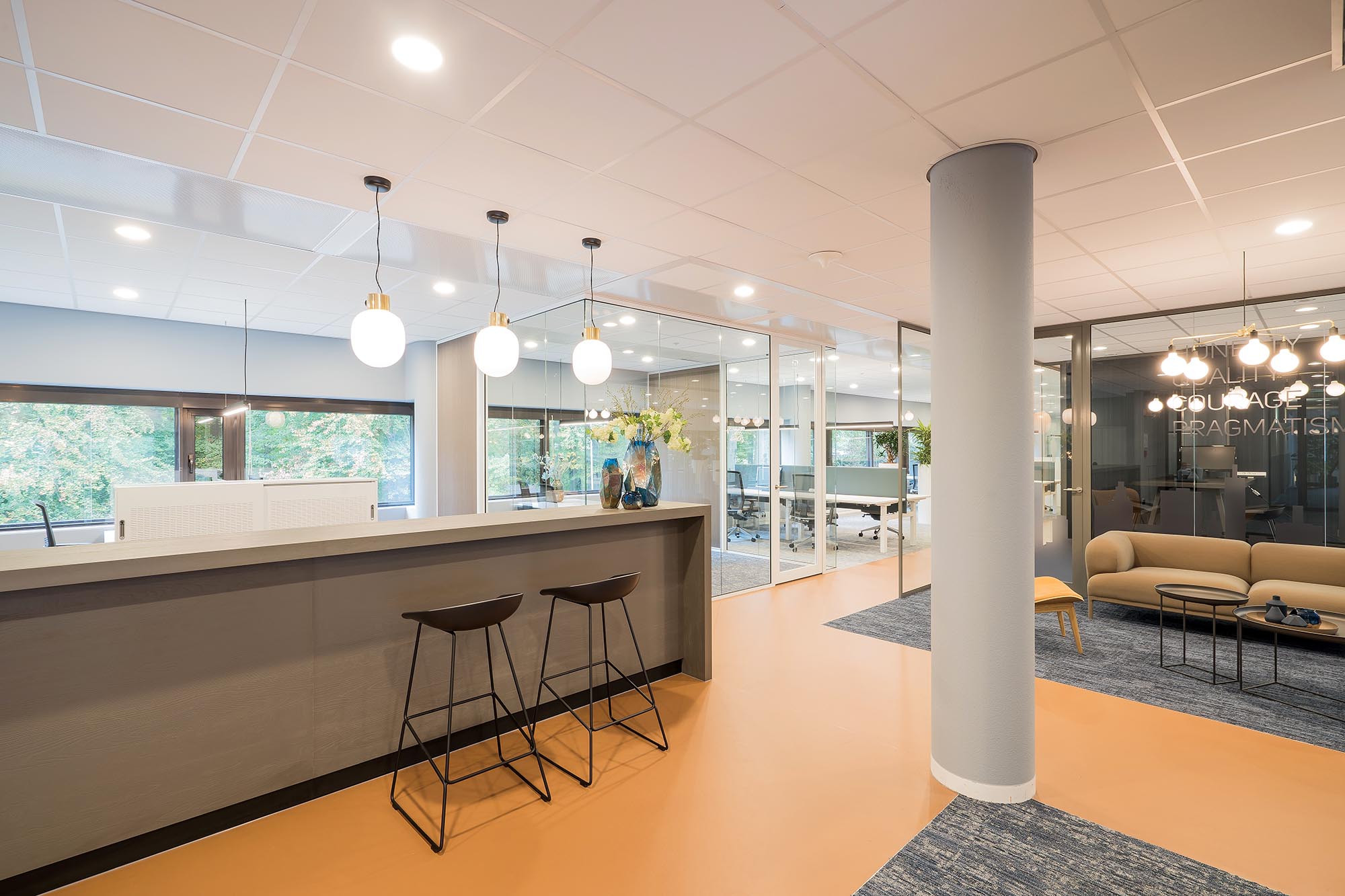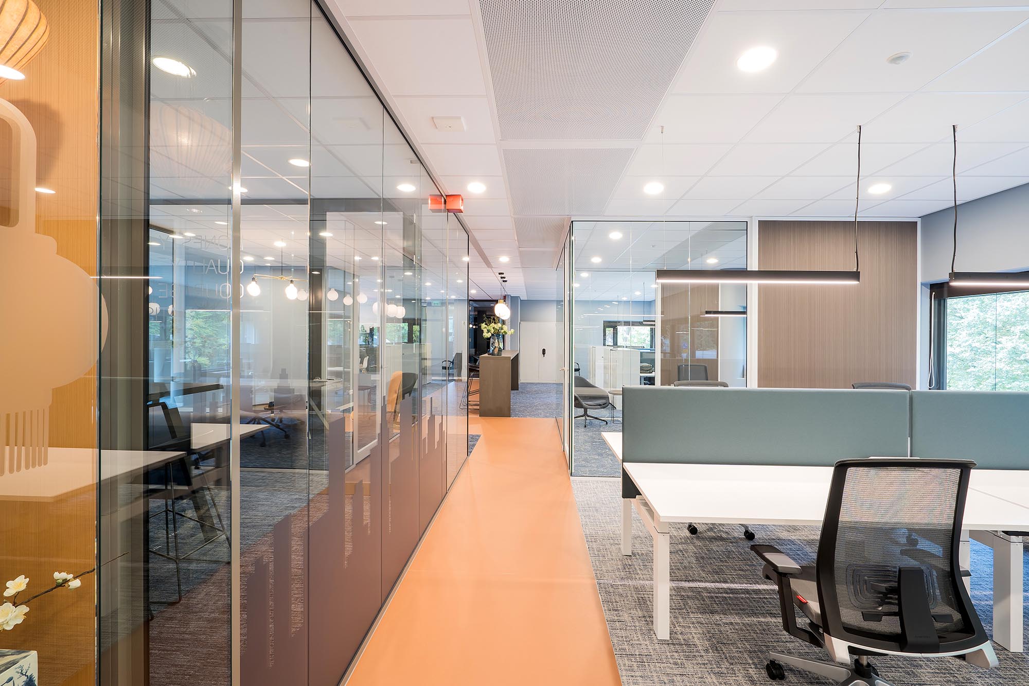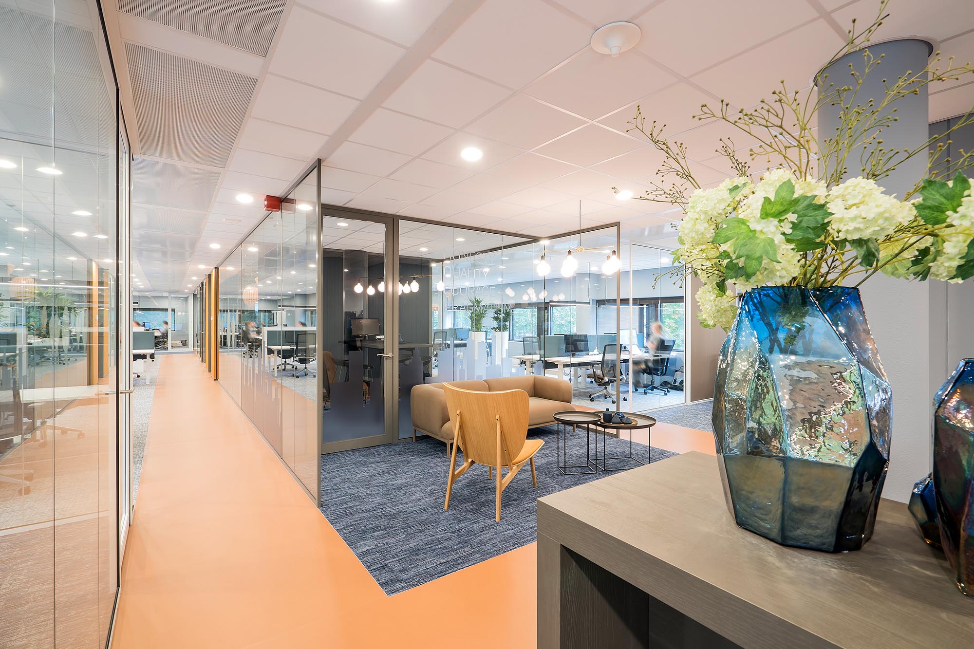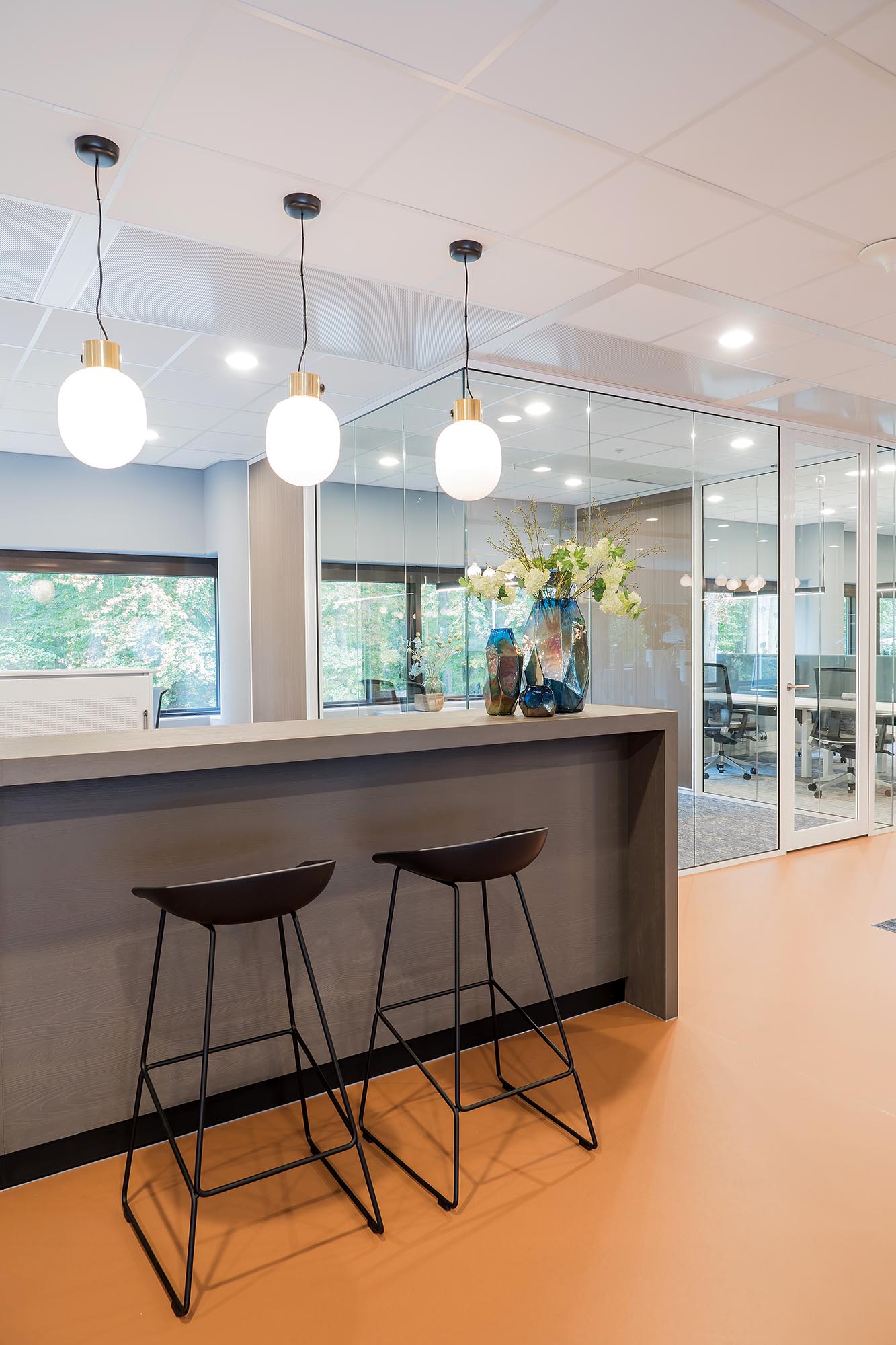 Voor de systeemplafonds is gekozen voor een akoestisch plafond type Ecophon Advantage. De loopzones zijn marmoleum van Forbo Flooring en het tapijt bij de reguliere werkplekken is type Jeans van Desso. De glazen systeemwanden zijn voorzien van folie passend bij het globale werkgebied. De gesloten wanden, type MS de Luxe zijn afgewerkt met Vescom wandbekleding. Intermontage Interieurbouw realiseerde de lange ontvangstbalie en de pantry in het ontmoetingsgedeelte.
