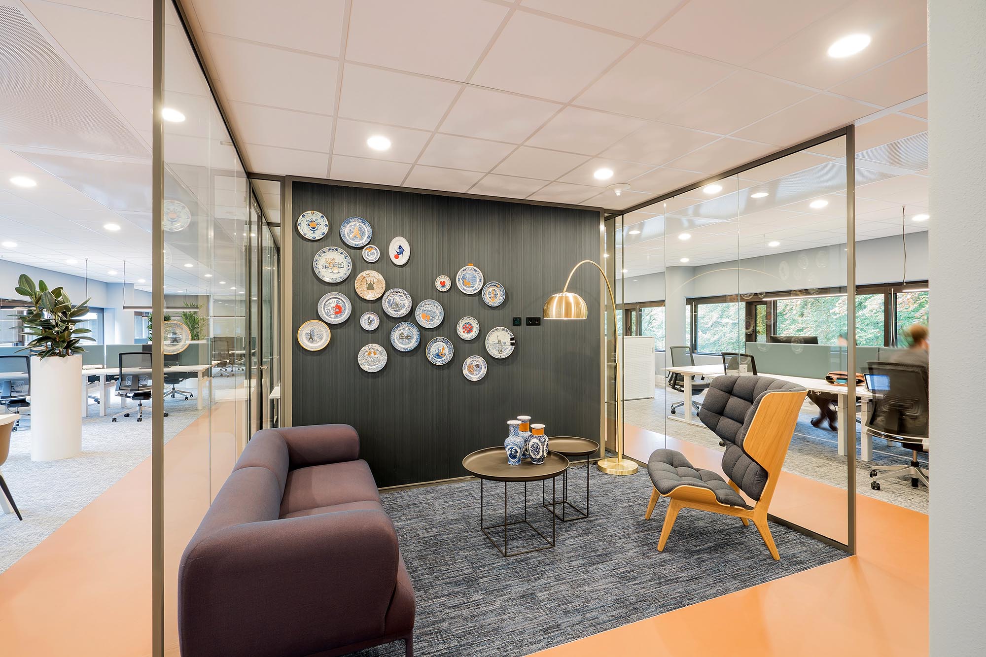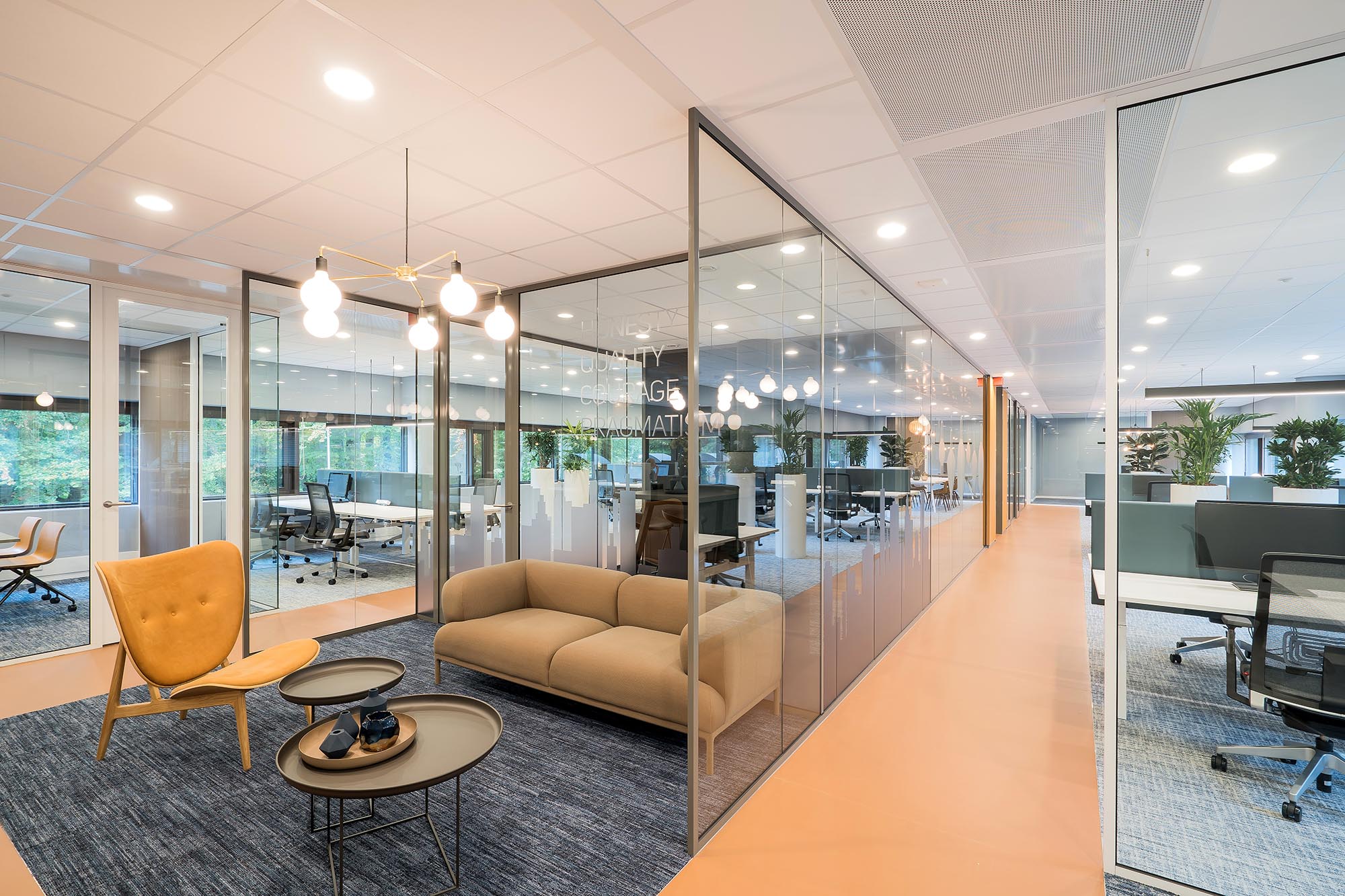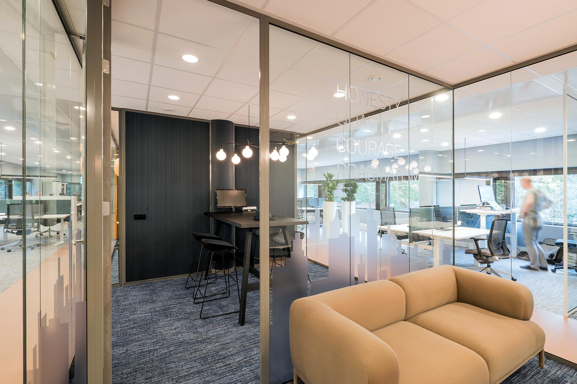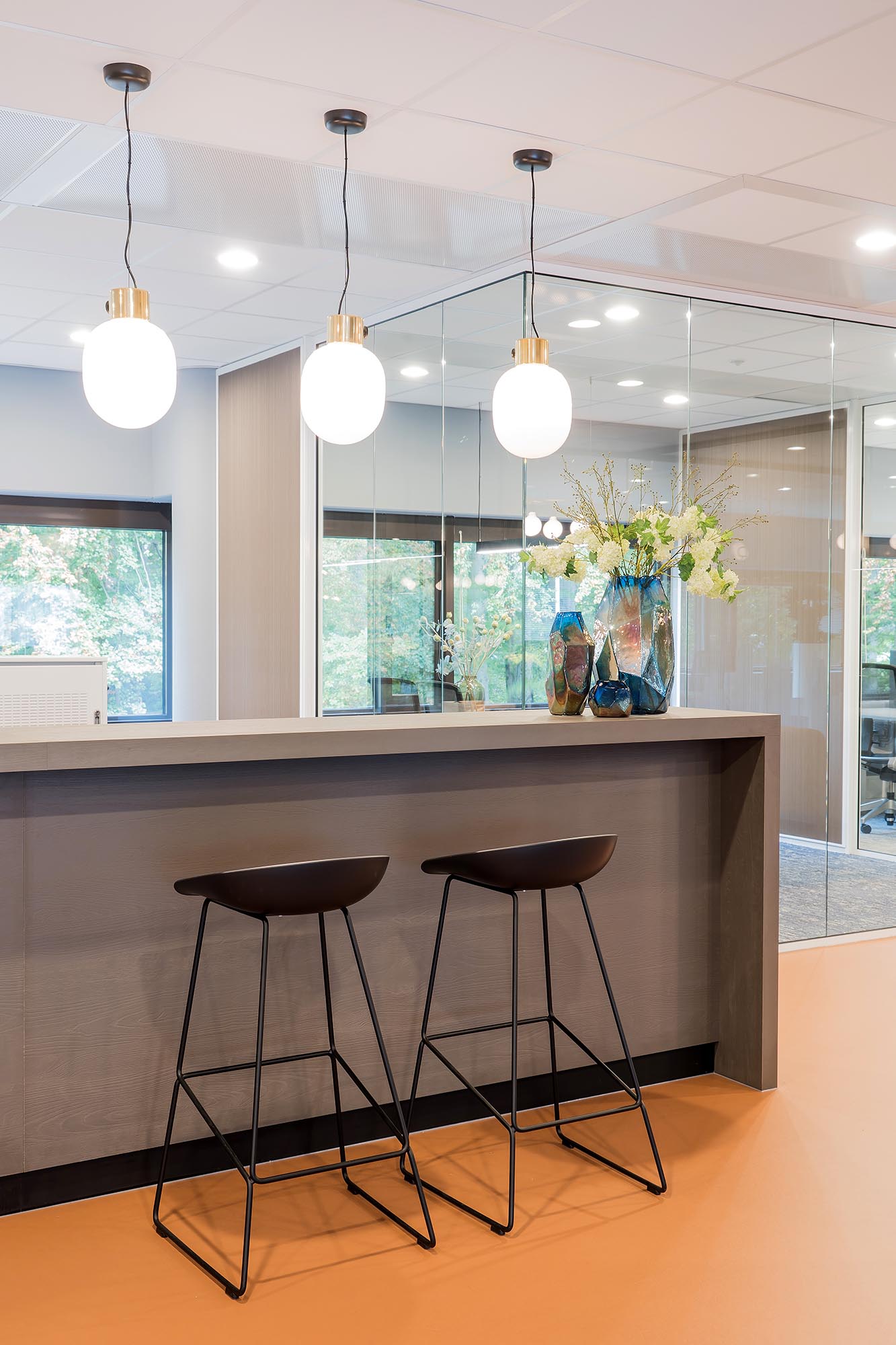 Voor de systeemplafonds is gekozen voor een akoestisch plafond type Ecophon Advantage. De loopzones zijn marmoleum van Forbo Flooring en het tapijt bij de reguliere werkplekken is type Jeans van Desso. De glazen systeemwanden zijn voorzien van folie passend bij het globale werkgebied. De gesloten wanden, type MS de Luxe zijn afgewerkt met Vescom wandbekleding. Intermontage Interieurbouw realiseerde de lange ontvangstbalie en de pantry in het ontmoetingsgedeelte.