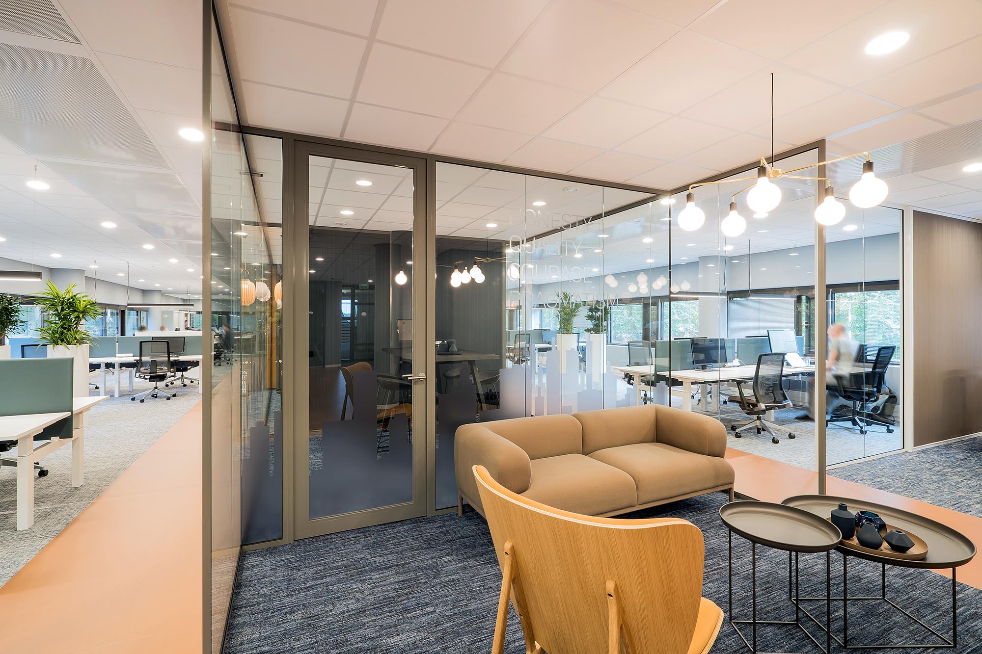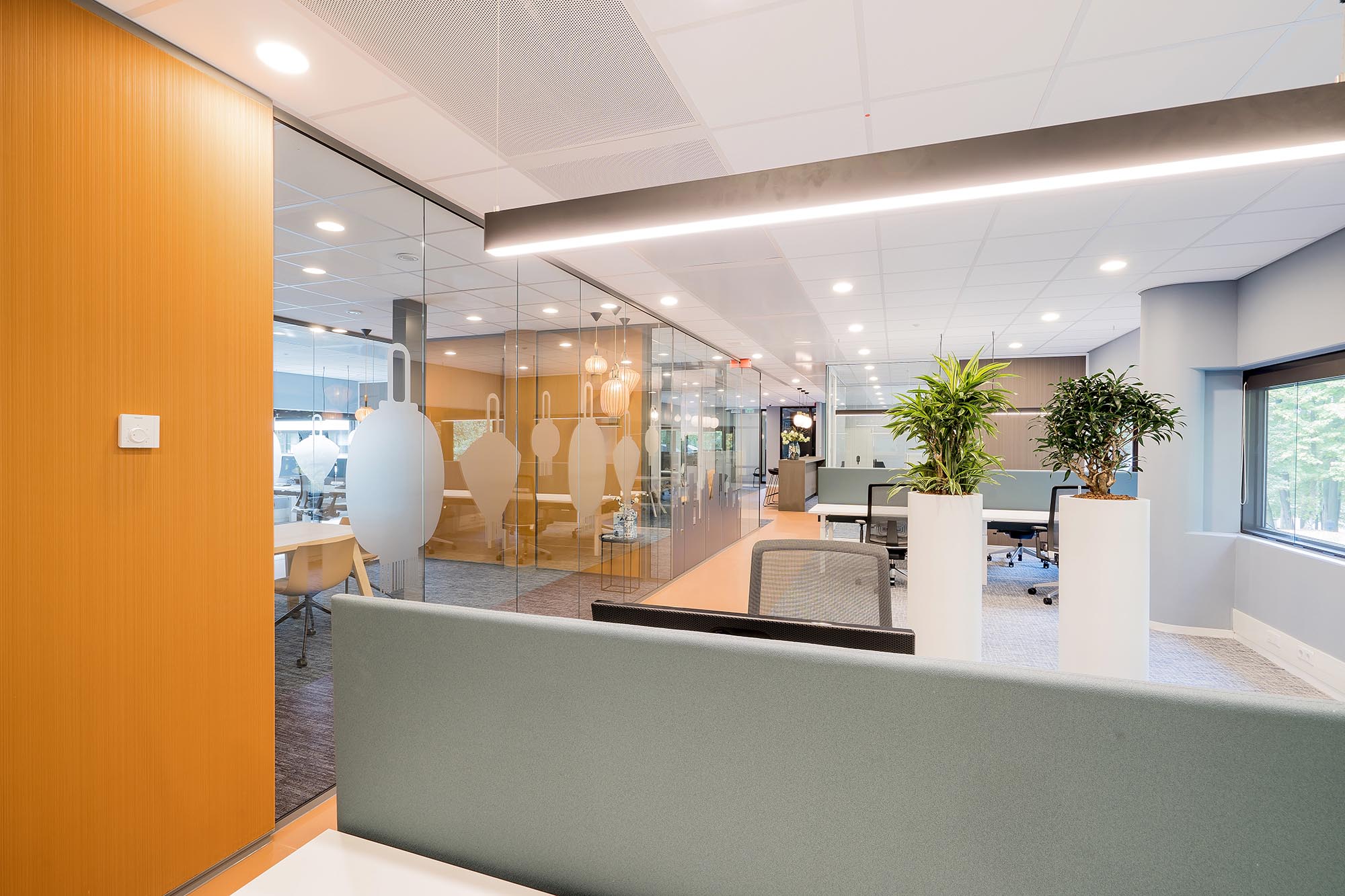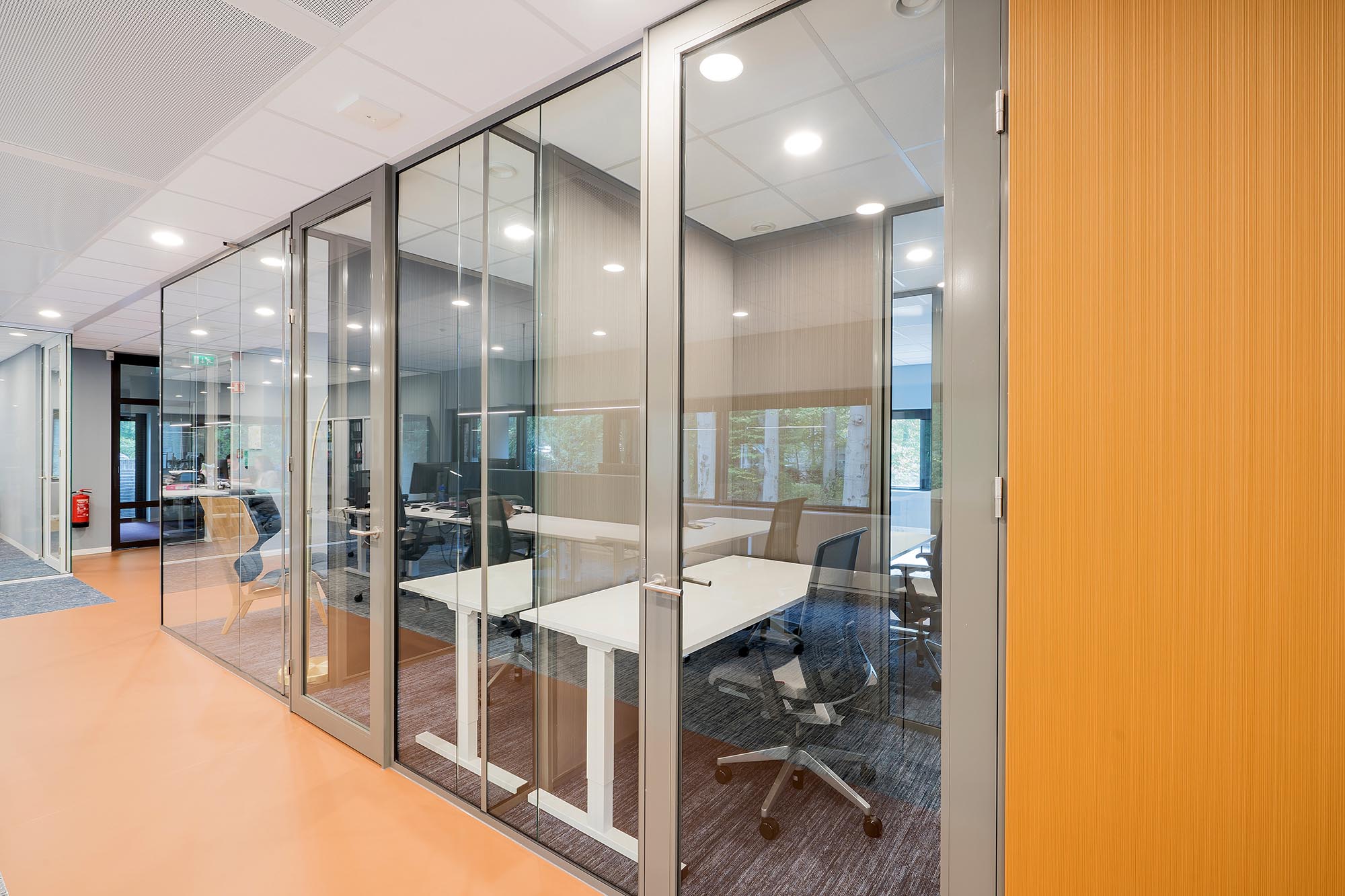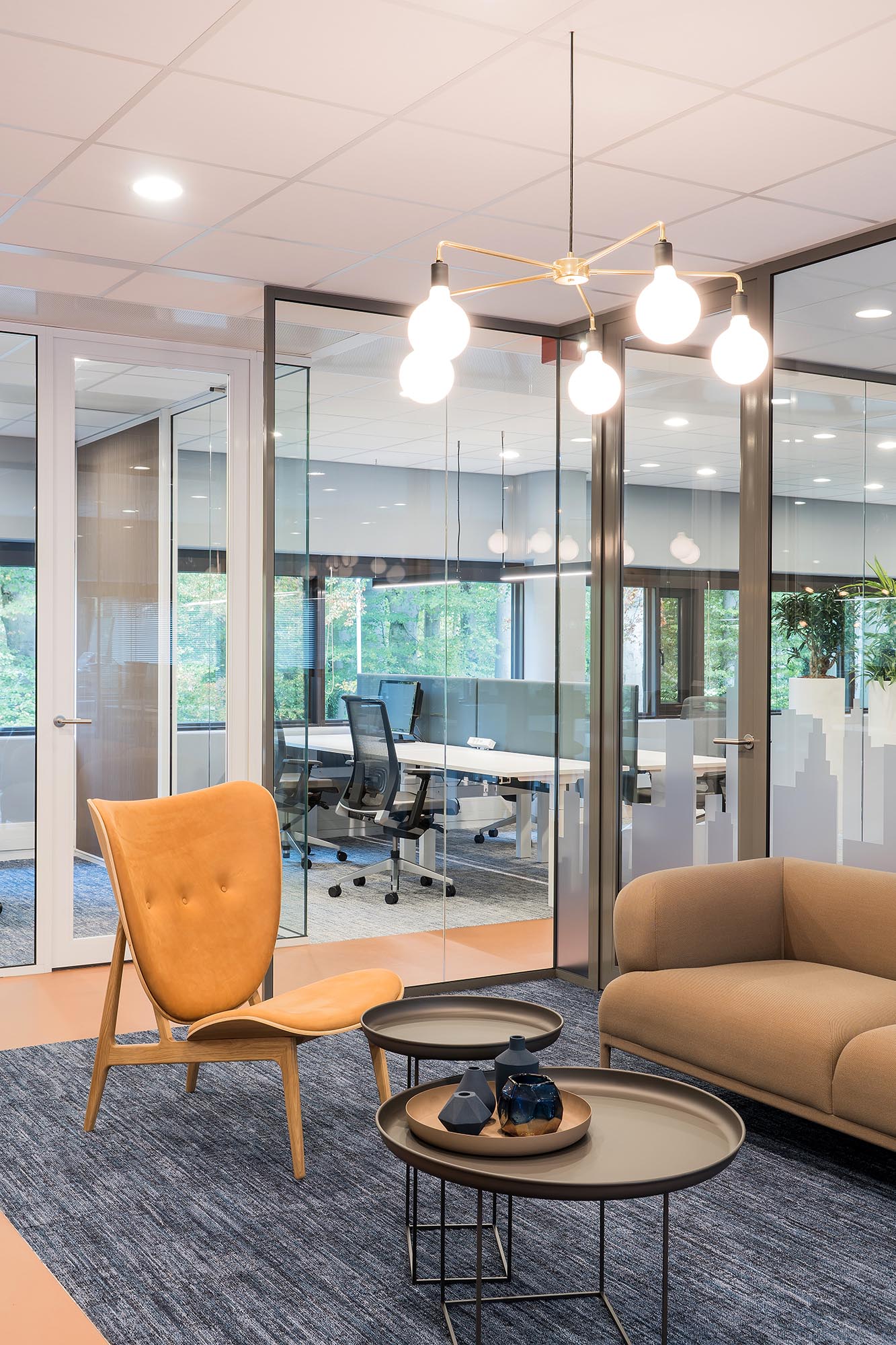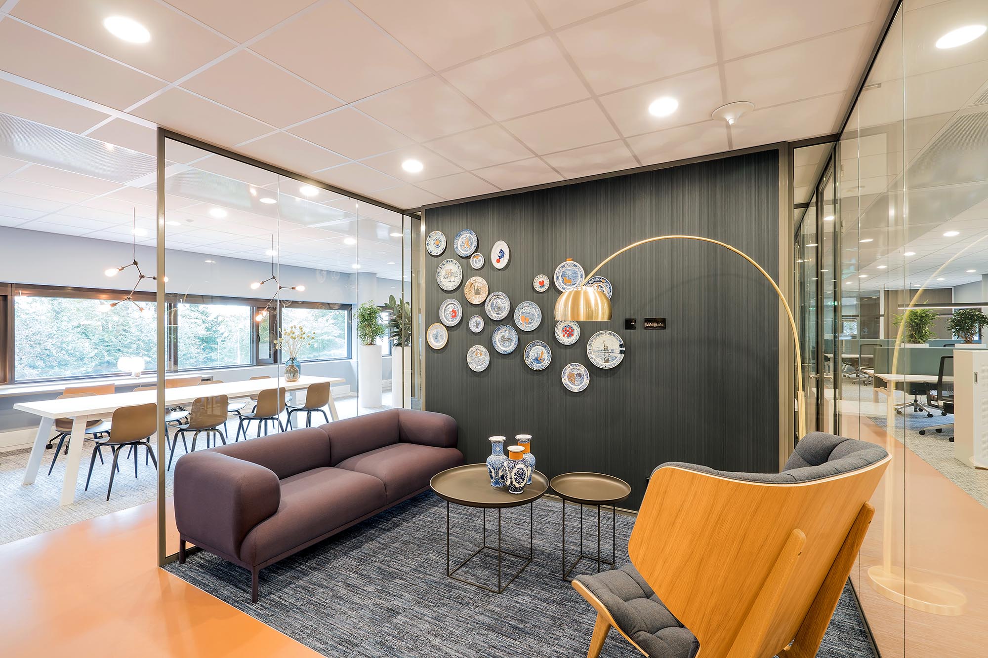 Voor de systeemplafonds is gekozen voor een akoestisch plafond type Ecophon Advantage. De loopzones zijn marmoleum van Forbo Flooring en het tapijt bij de reguliere werkplekken is type Jeans van Desso. De glazen systeemwanden zijn voorzien van folie passend bij het globale werkgebied. De gesloten wanden, type MS de Luxe zijn afgewerkt met Vescom wandbekleding. Intermontage Interieurbouw realiseerde de lange ontvangstbalie en de pantry in het ontmoetingsgedeelte.