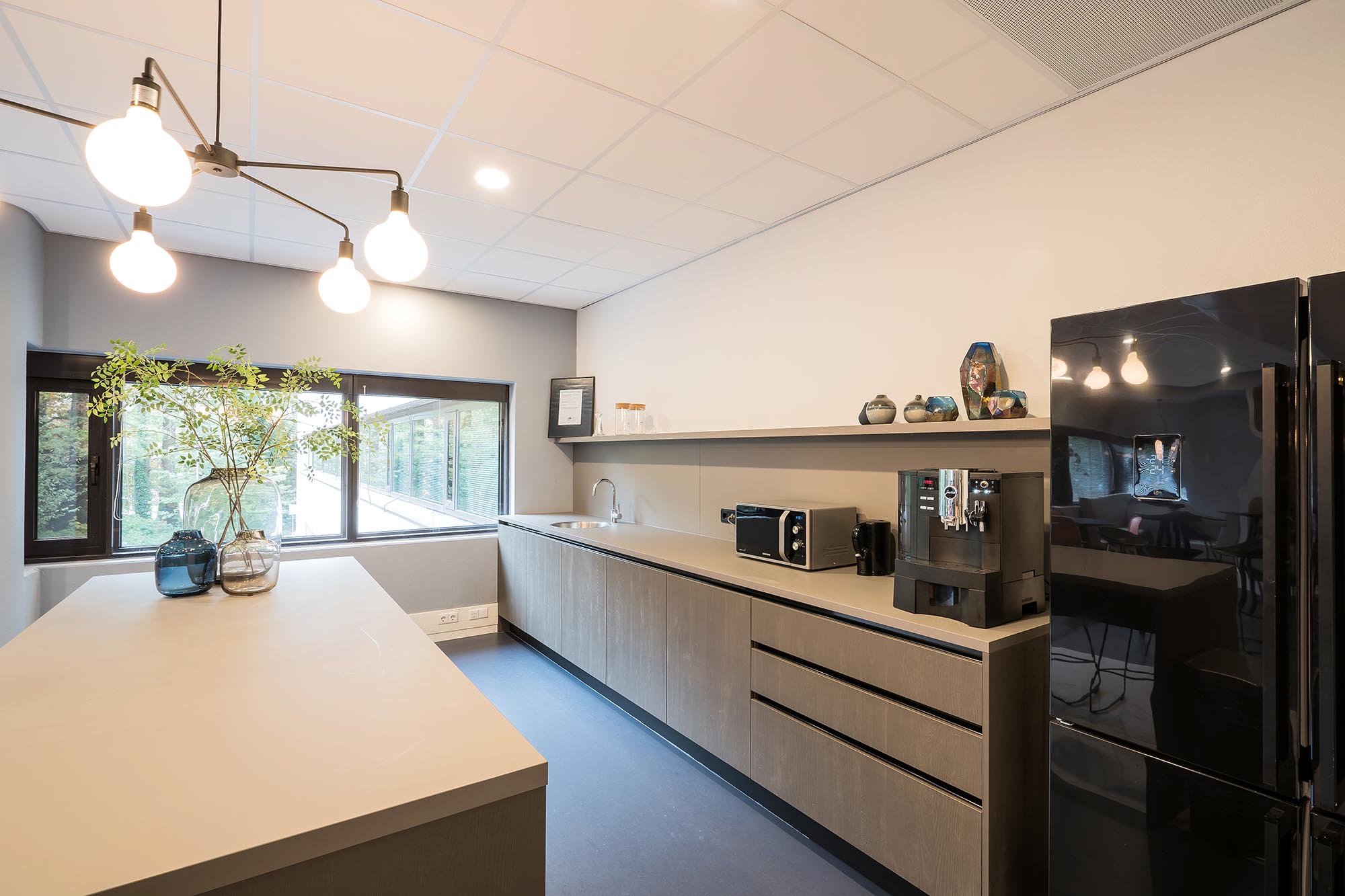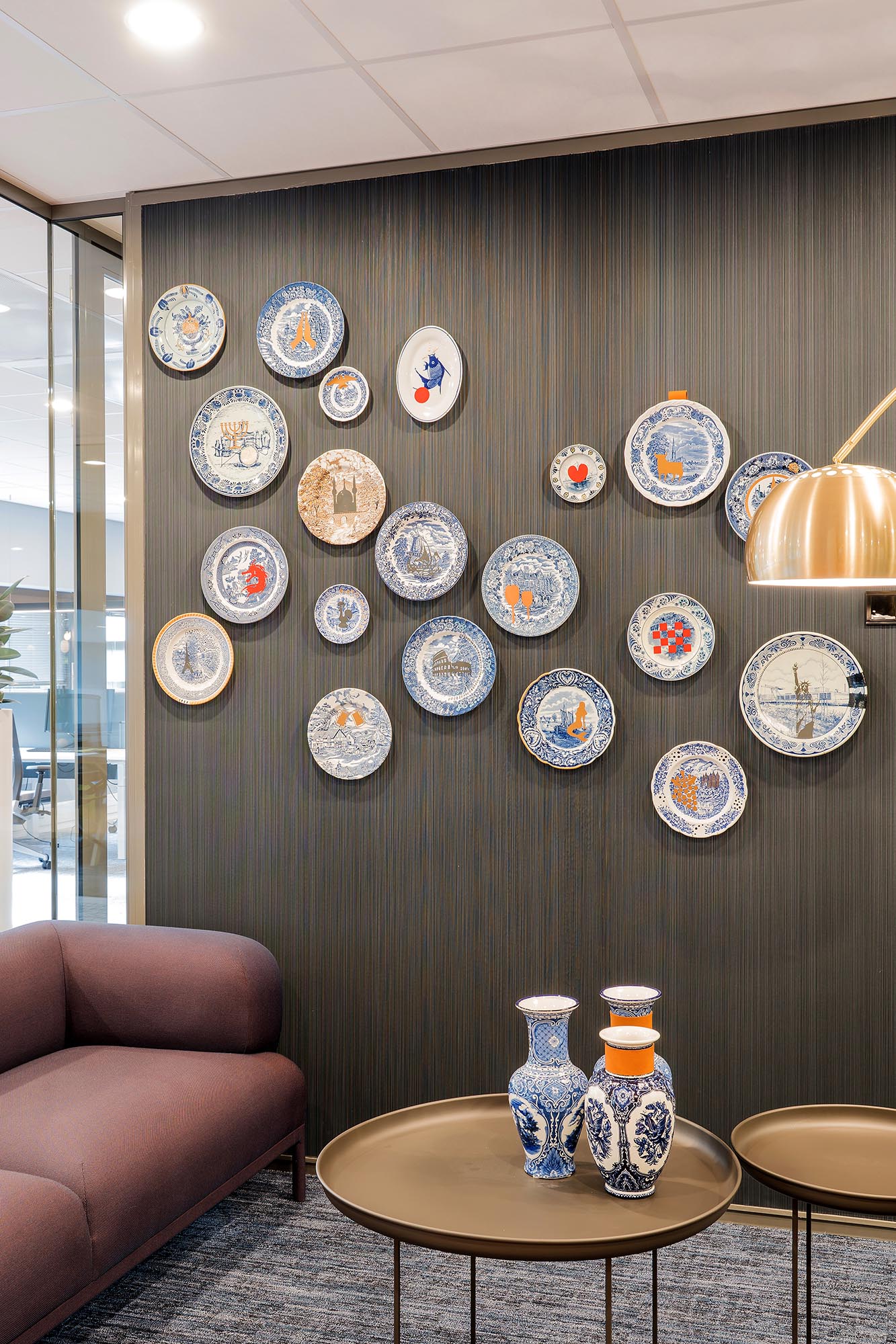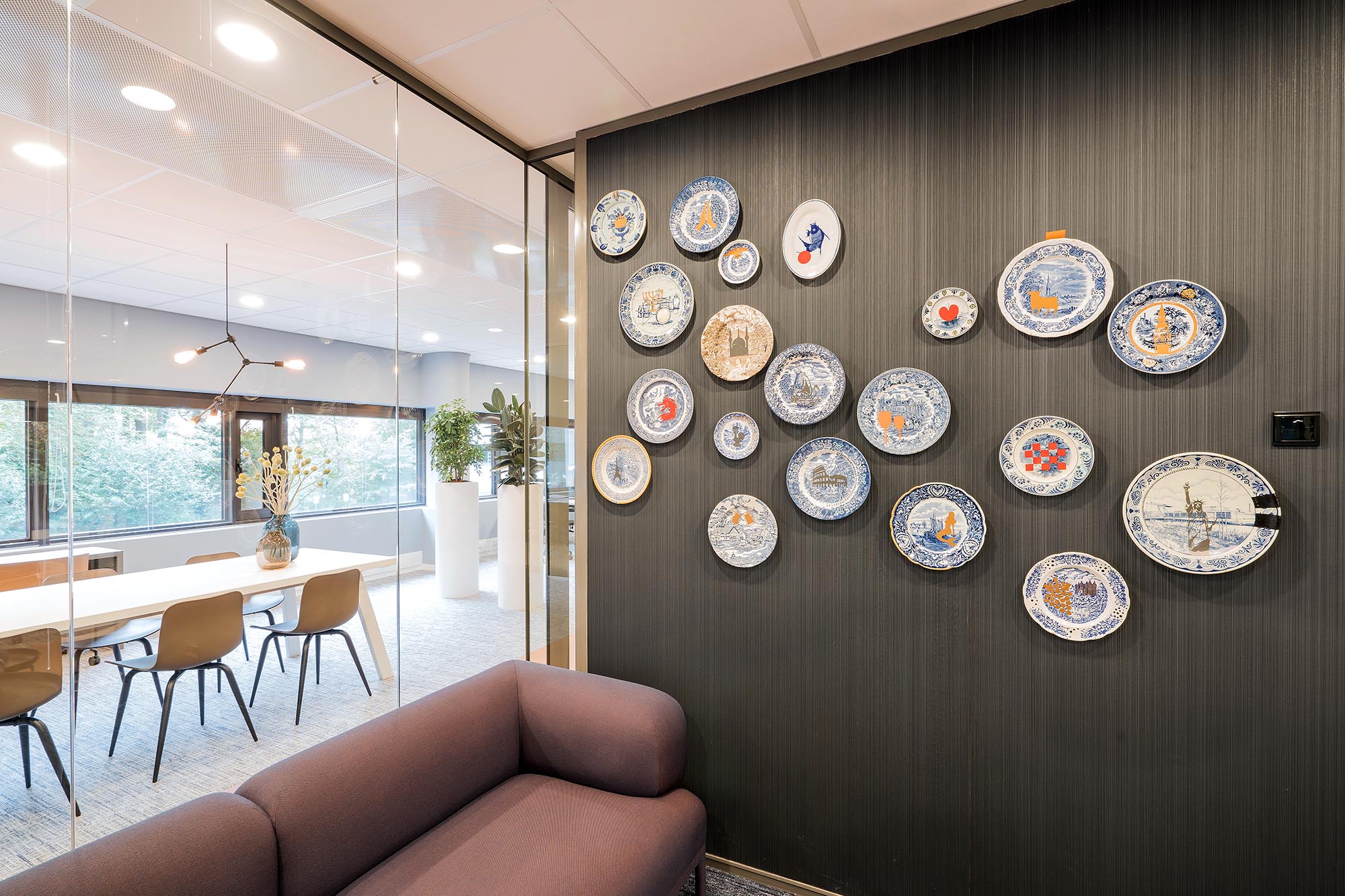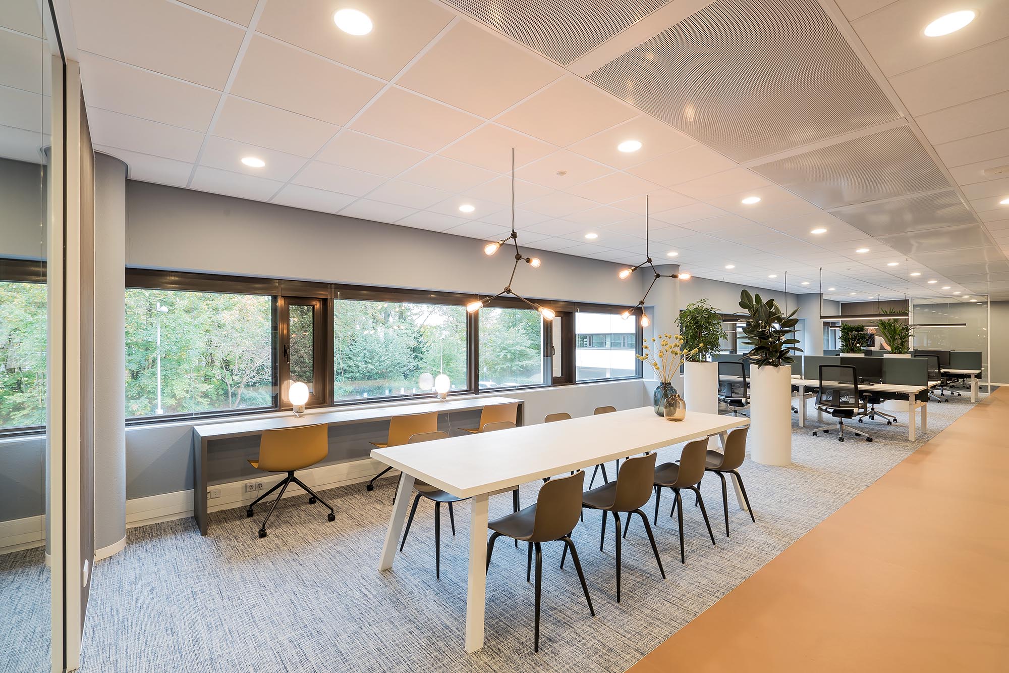 Voor de systeemplafonds is gekozen voor een akoestisch plafond type Ecophon Advantage. De loopzones zijn marmoleum van Forbo Flooring en het tapijt bij de reguliere werkplekken is type Jeans van Desso. De glazen systeemwanden zijn voorzien van folie passend bij het globale werkgebied. De gesloten wanden, type MS de Luxe zijn afgewerkt met Vescom wandbekleding. Intermontage Interieurbouw realiseerde de lange ontvangstbalie en de pantry in het ontmoetingsgedeelte.