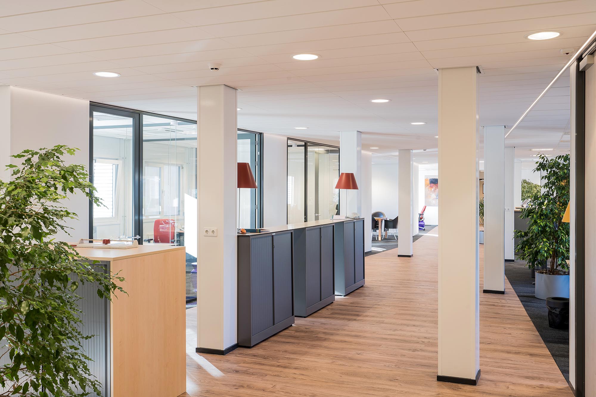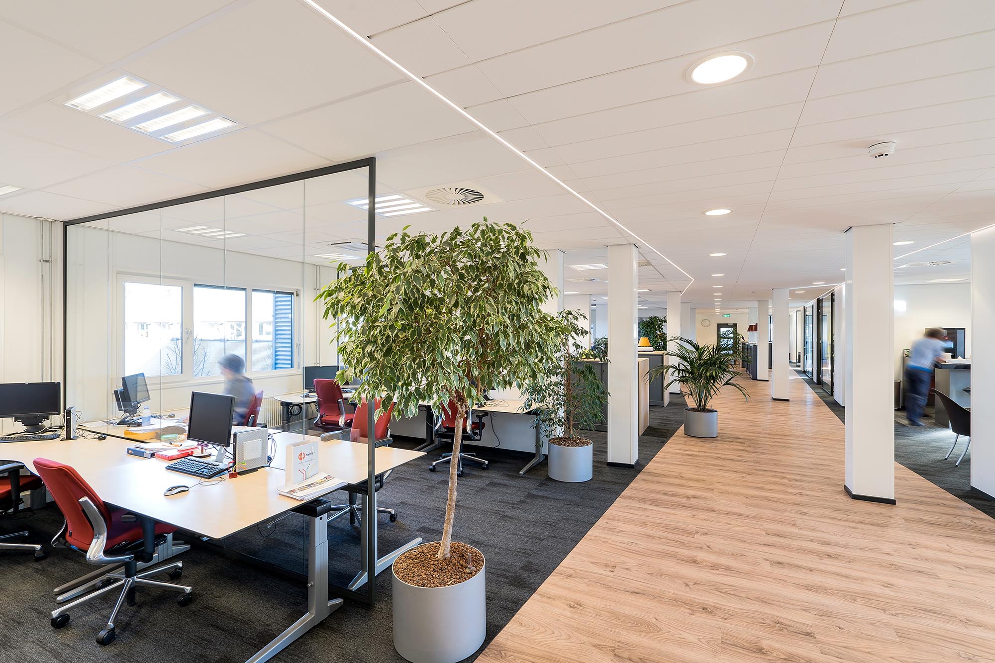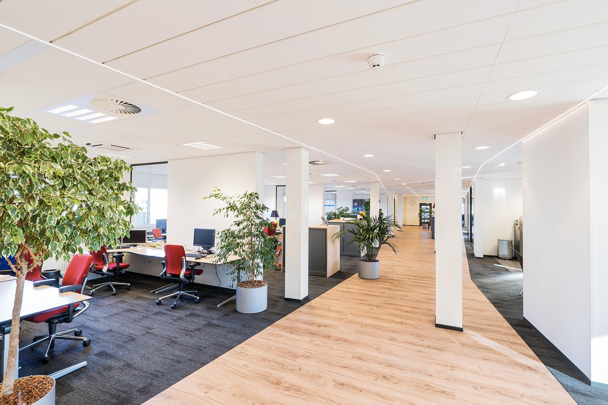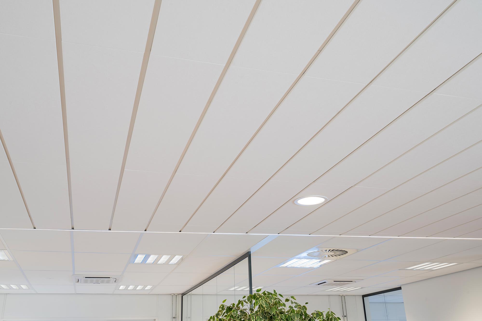 In het gang traject is gekozen voor het systeem Focus™ Lp van Ecophon. Focus™ Lp is een half-verdekt gemonteerd ophangsysteem en wordt toegepast om één richting in een ruimte te benadrukken. Er zit een brede opening tussen de panelen in de ene richting en een smalle opening in de tegenovergestelde richting. De kopse zijden van het plafond sluiten aan op gesegmenteerde LED-lijnen in het plafond. Meer info over dit type plafond vindt u hier.