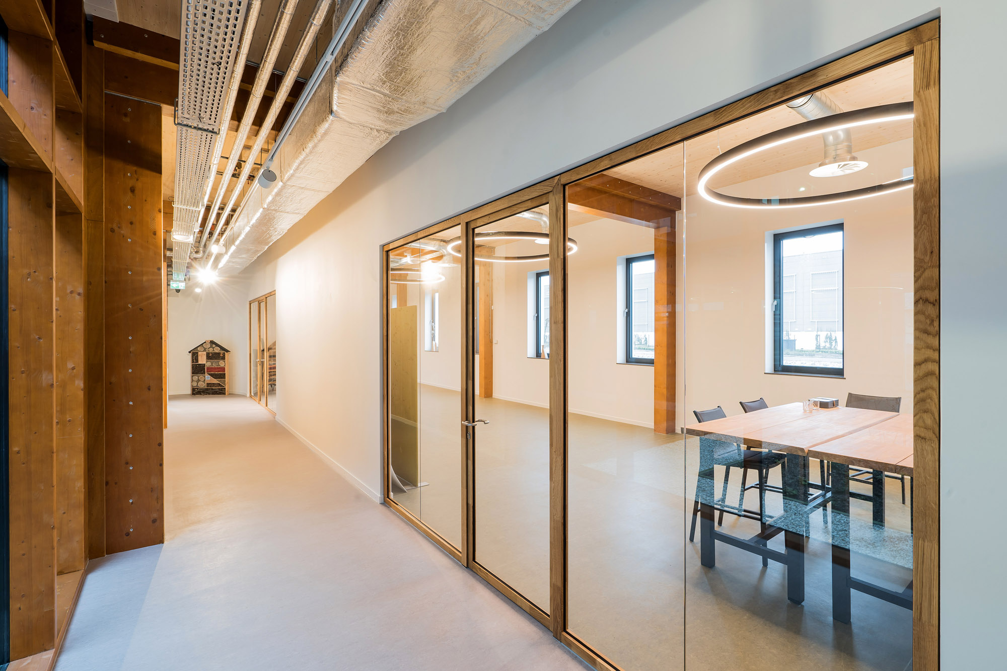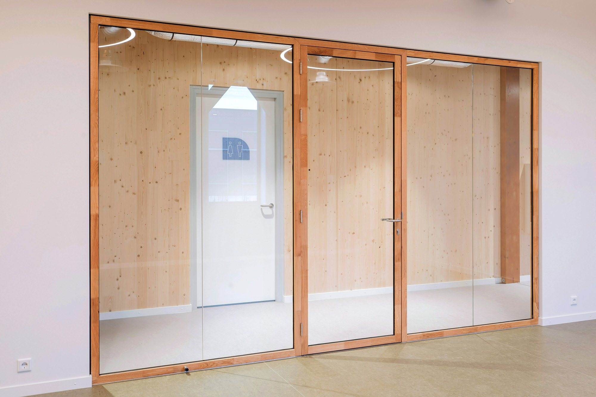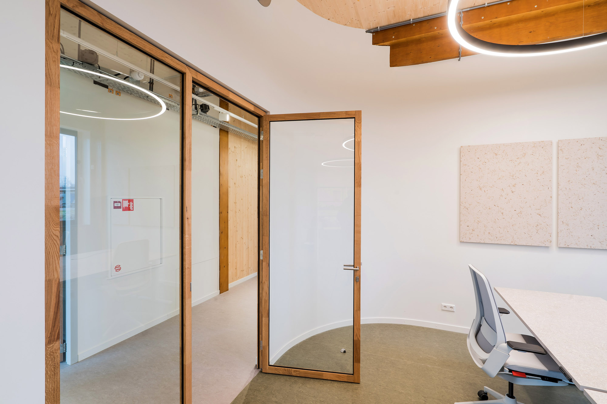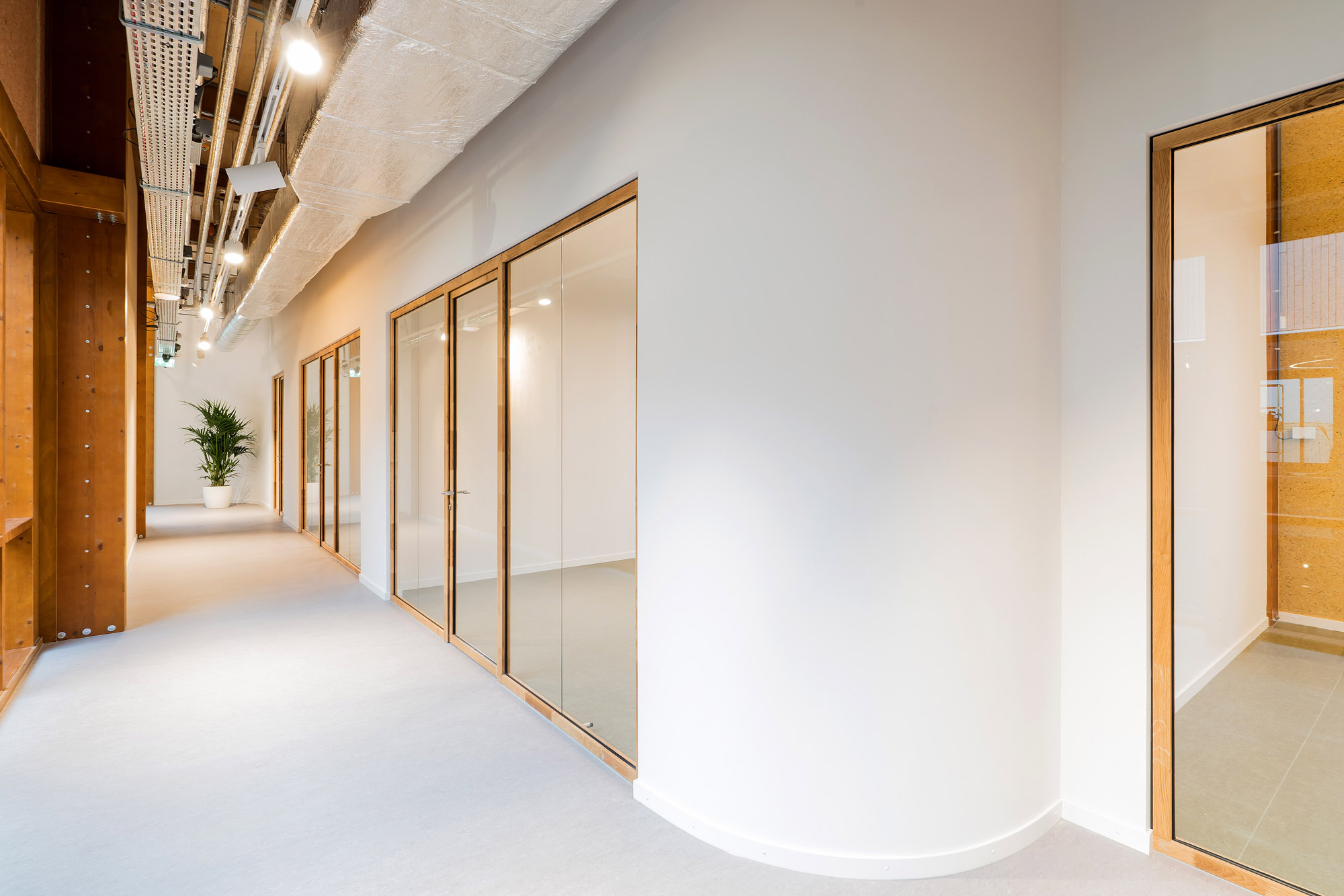 Vanuit Intermontage mochten wij bijdragen aan dit project met de inzet van onze WoodFrame Slim systeemwanden. Deze duurzame oplossing, opgebouwd uit slanke houten profielen van massief Europees eiken uit reststromen van de meubelindustrie, sluit naadloos aan bij het circulaire karakter van Rootz. Door de combinatie van glas en hout ontstaat er transparantie en warmte. Datgene wat een kenniscentrum als dit nodig heeft: helder zicht op samenwerking, zonder in te leveren op akoestisch comfort en uitstraling.